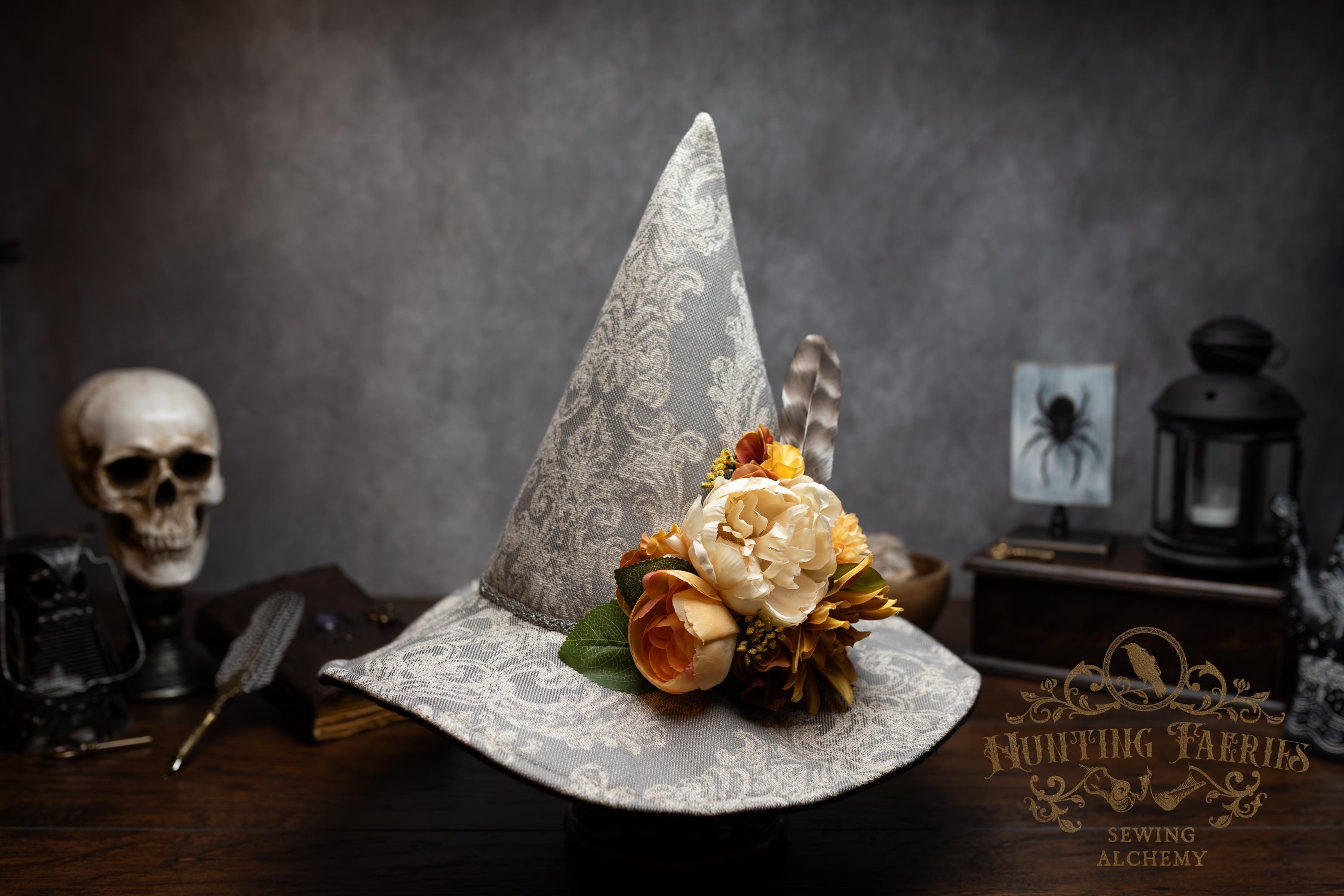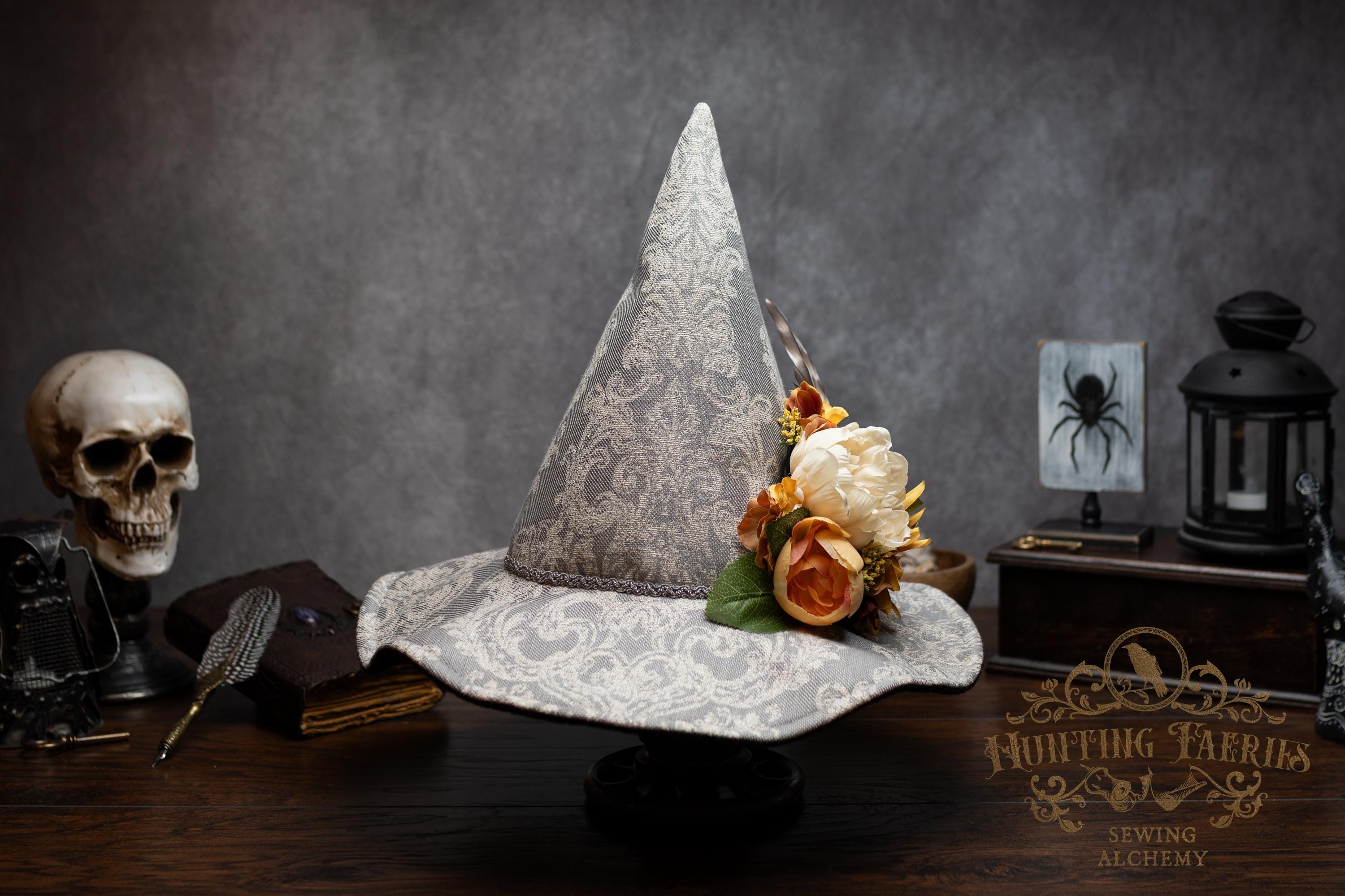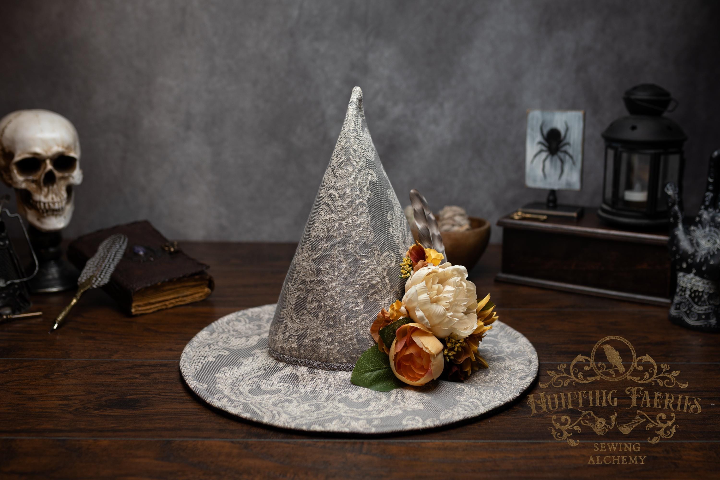 This handcrafted witch hat is made from a damask-pattern, light grey linen. A silver braided band encircles the cone. It features an artificial floral arrangement on its side attached with pins. It is removable, allowing you the option to change up your look.