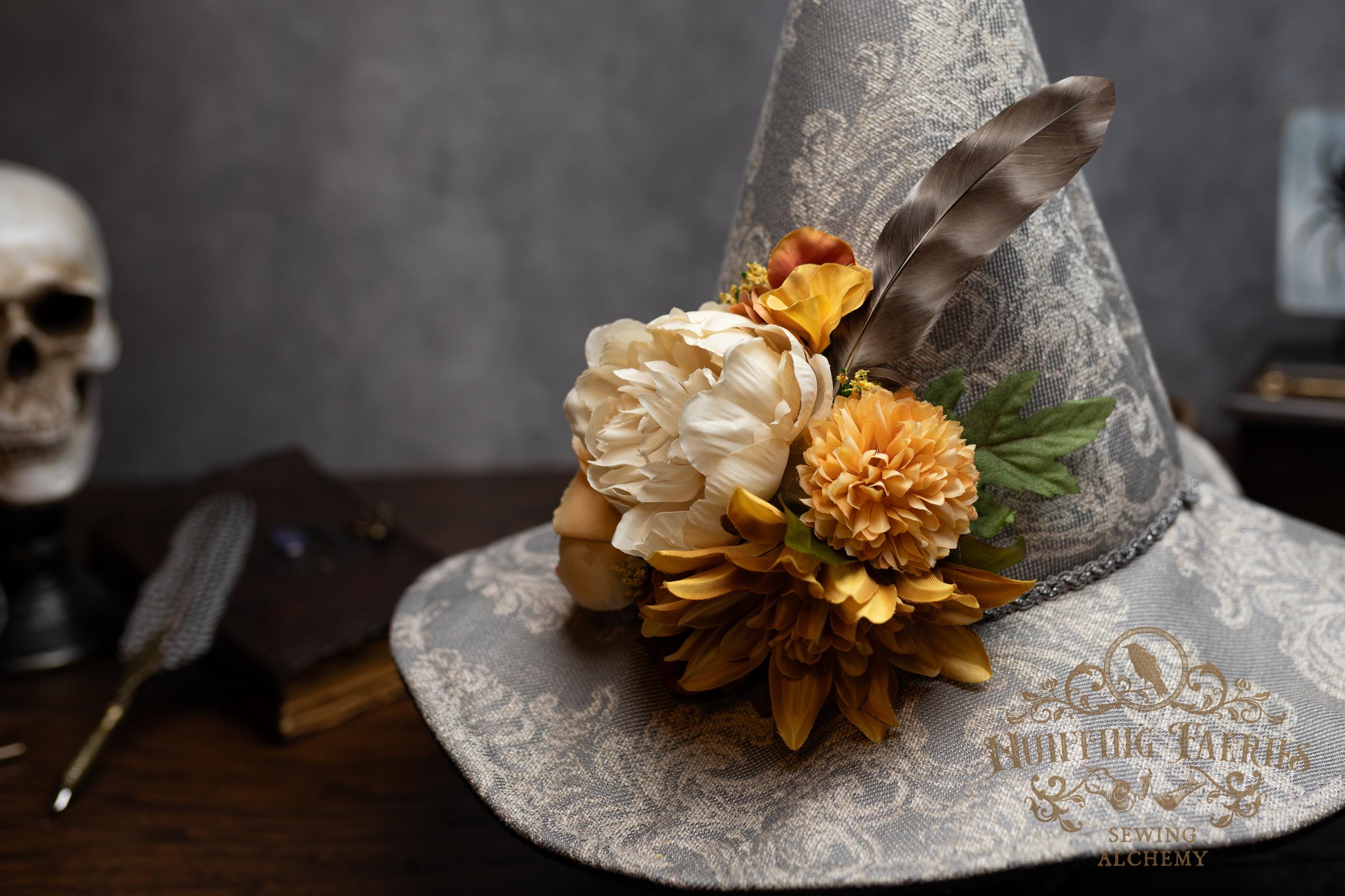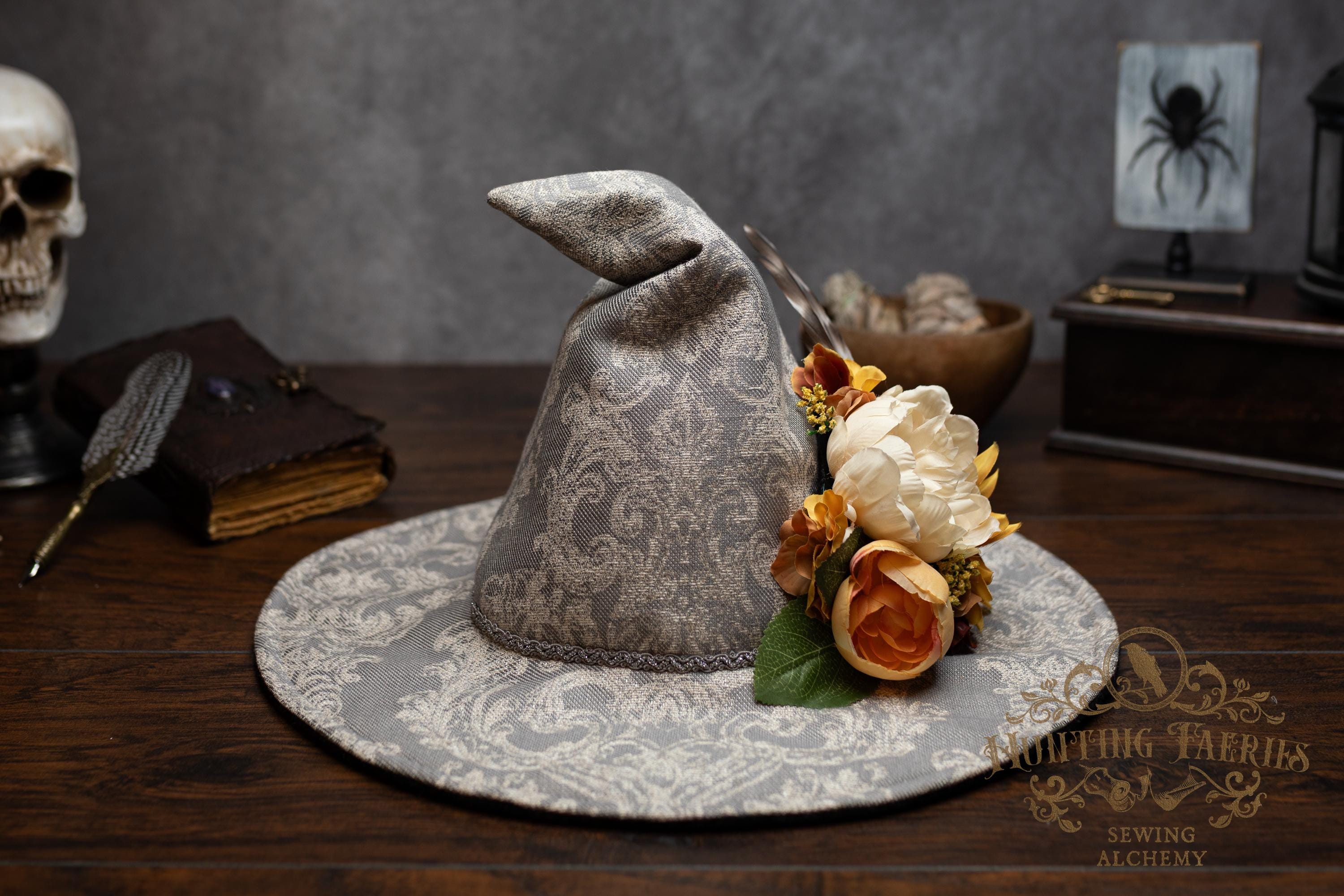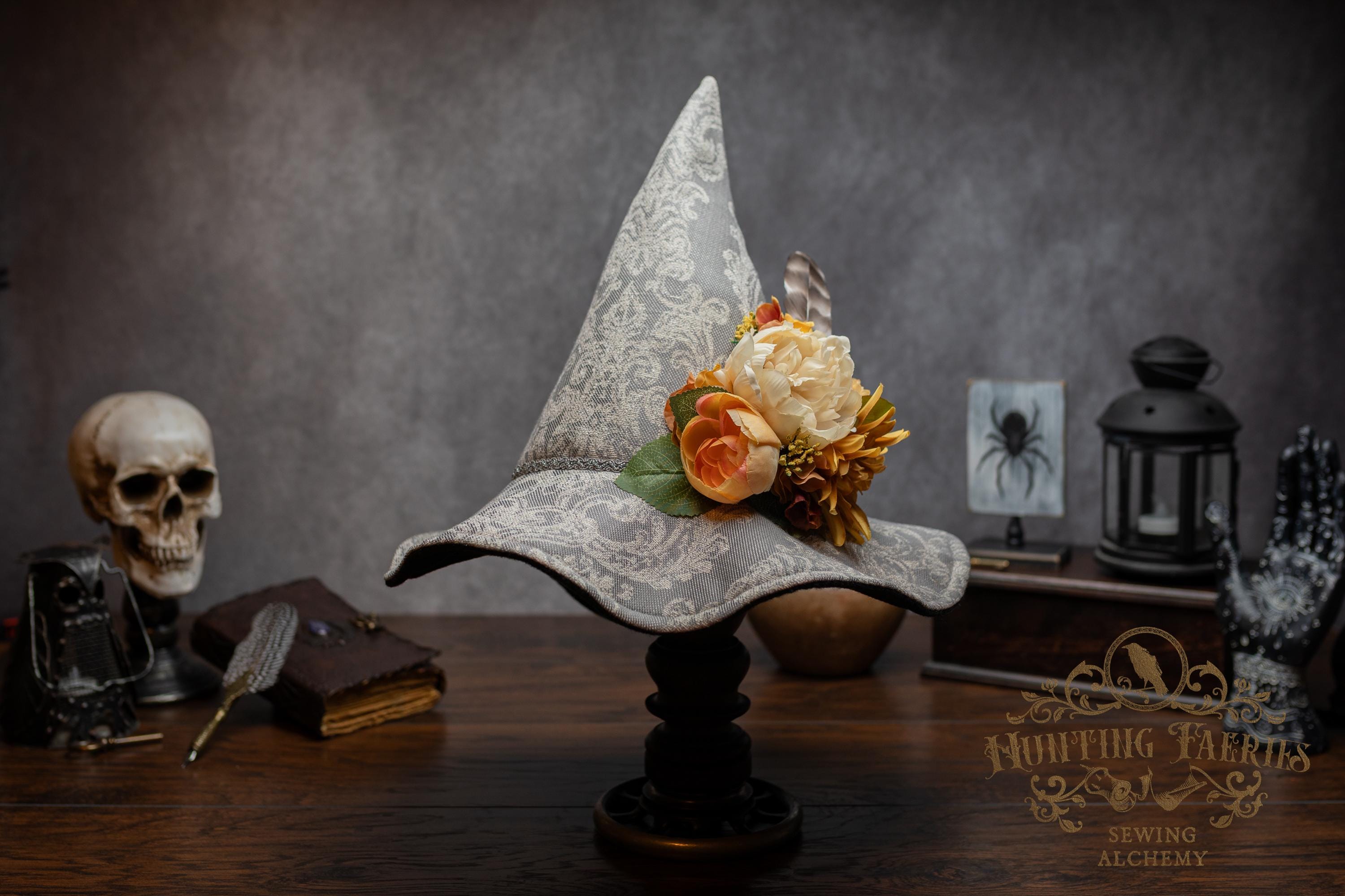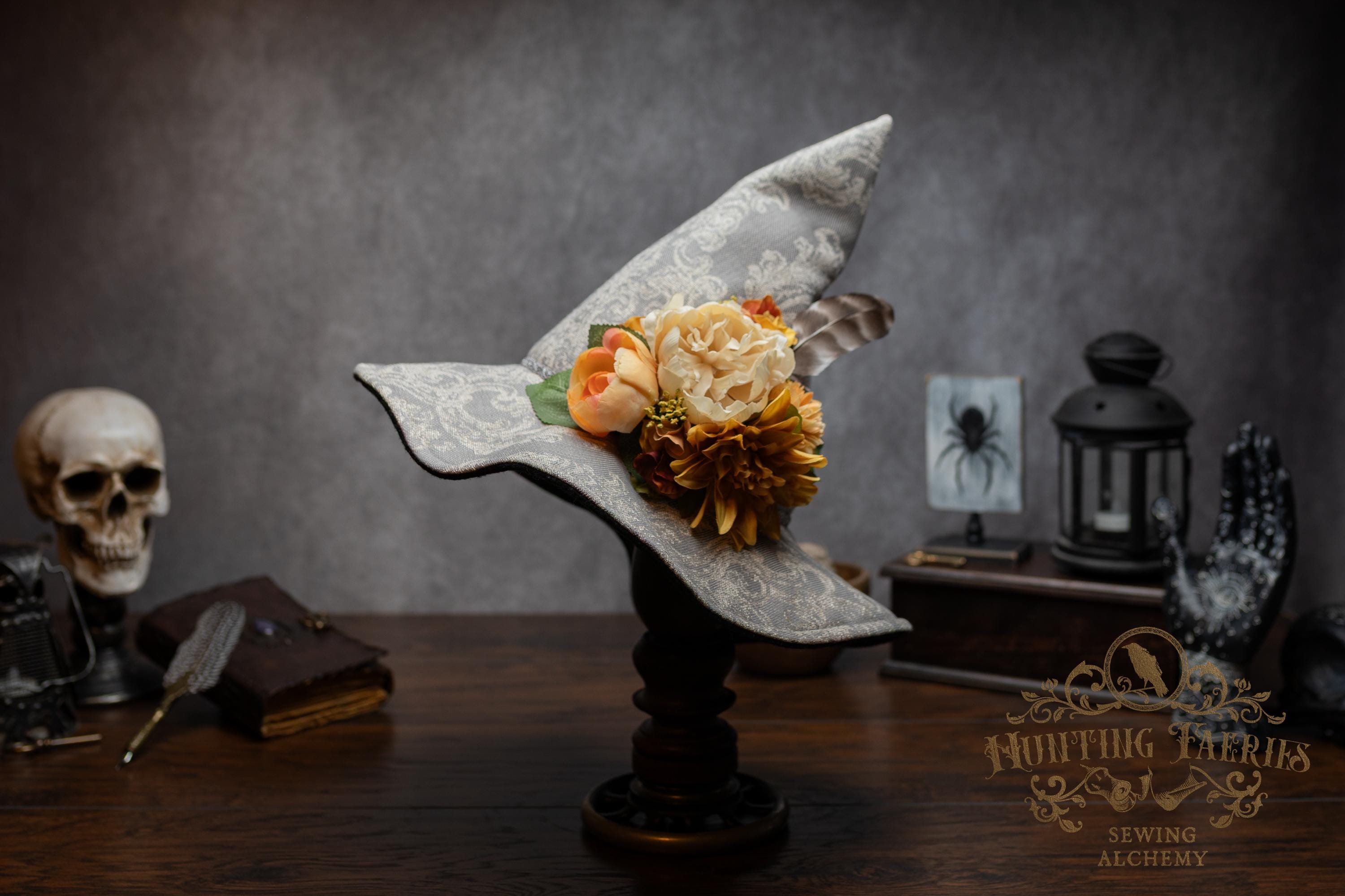 This handcrafted witch hat is made from a damask-pattern, light grey linen. A silver braided band encircles the cone. It features an artificial floral arrangement on its side attached with pins. It is removable, allowing you the option to change up your look.