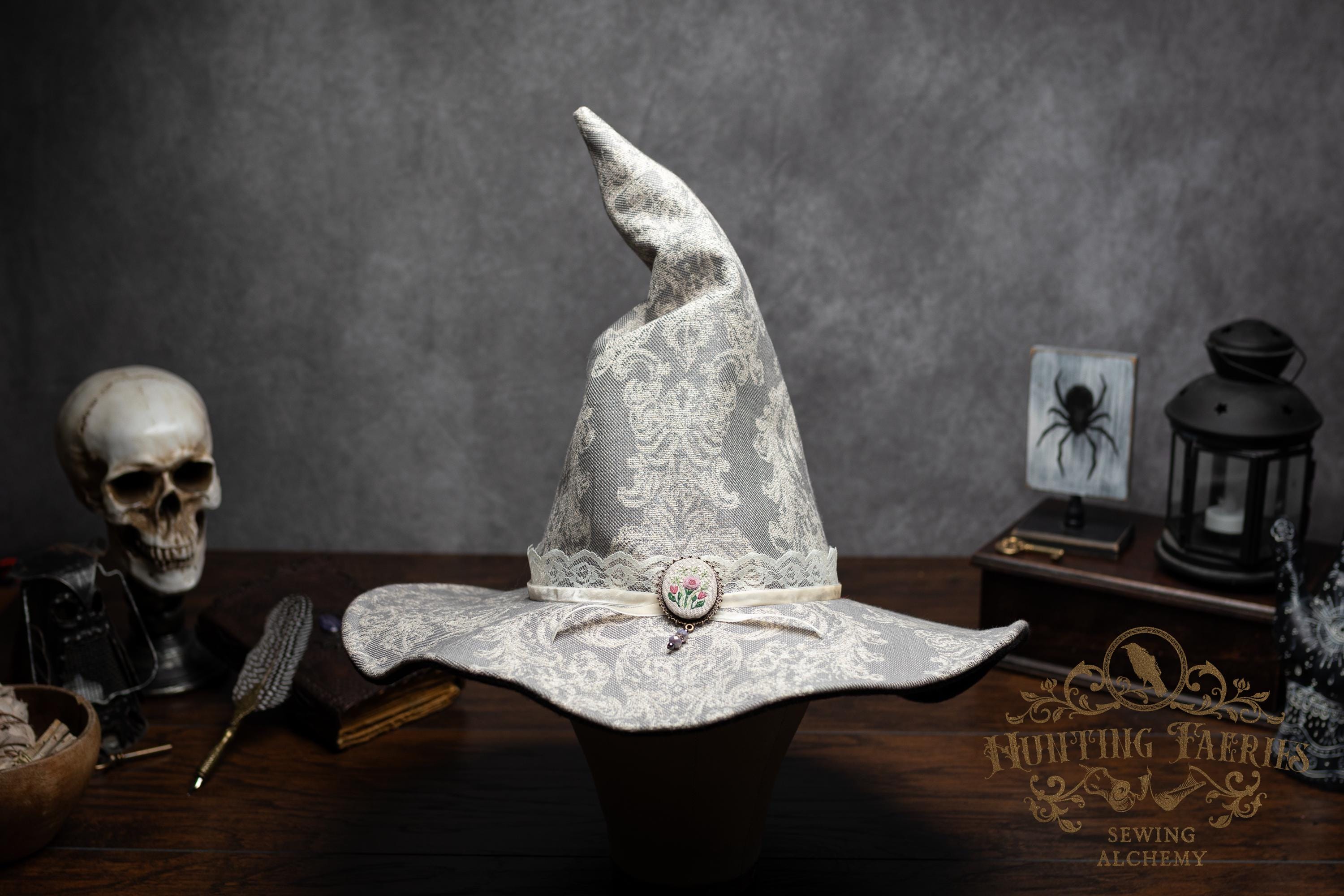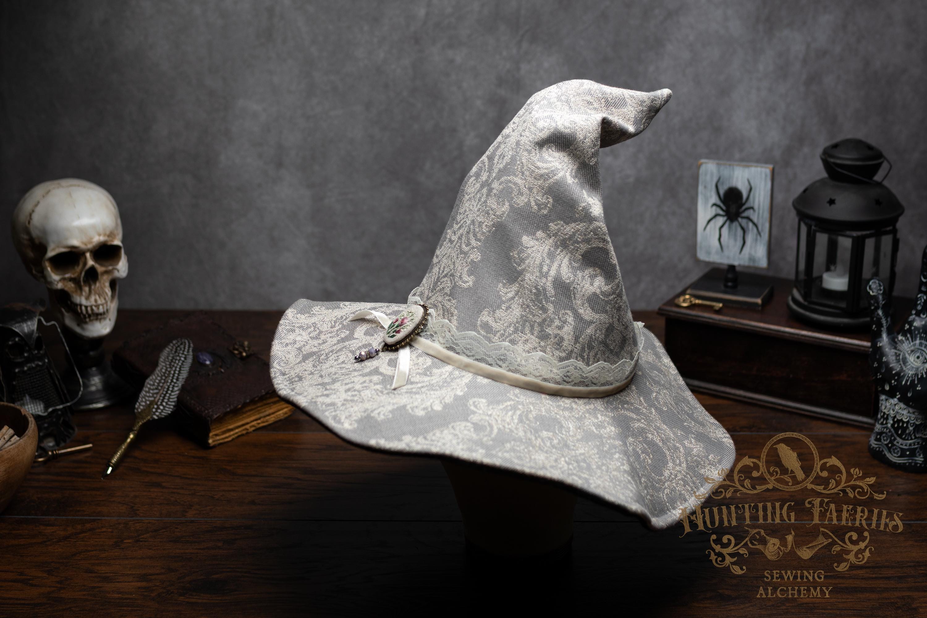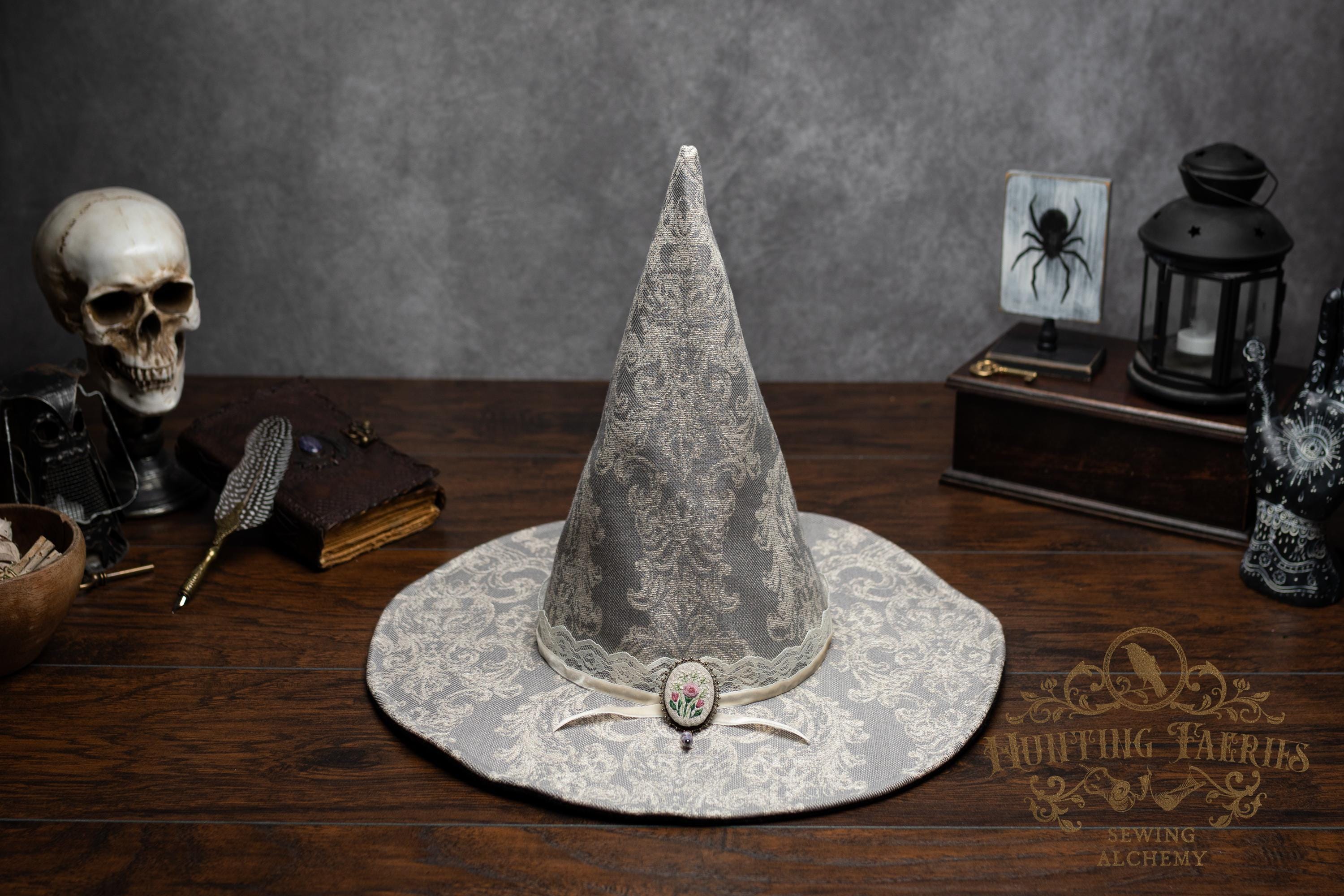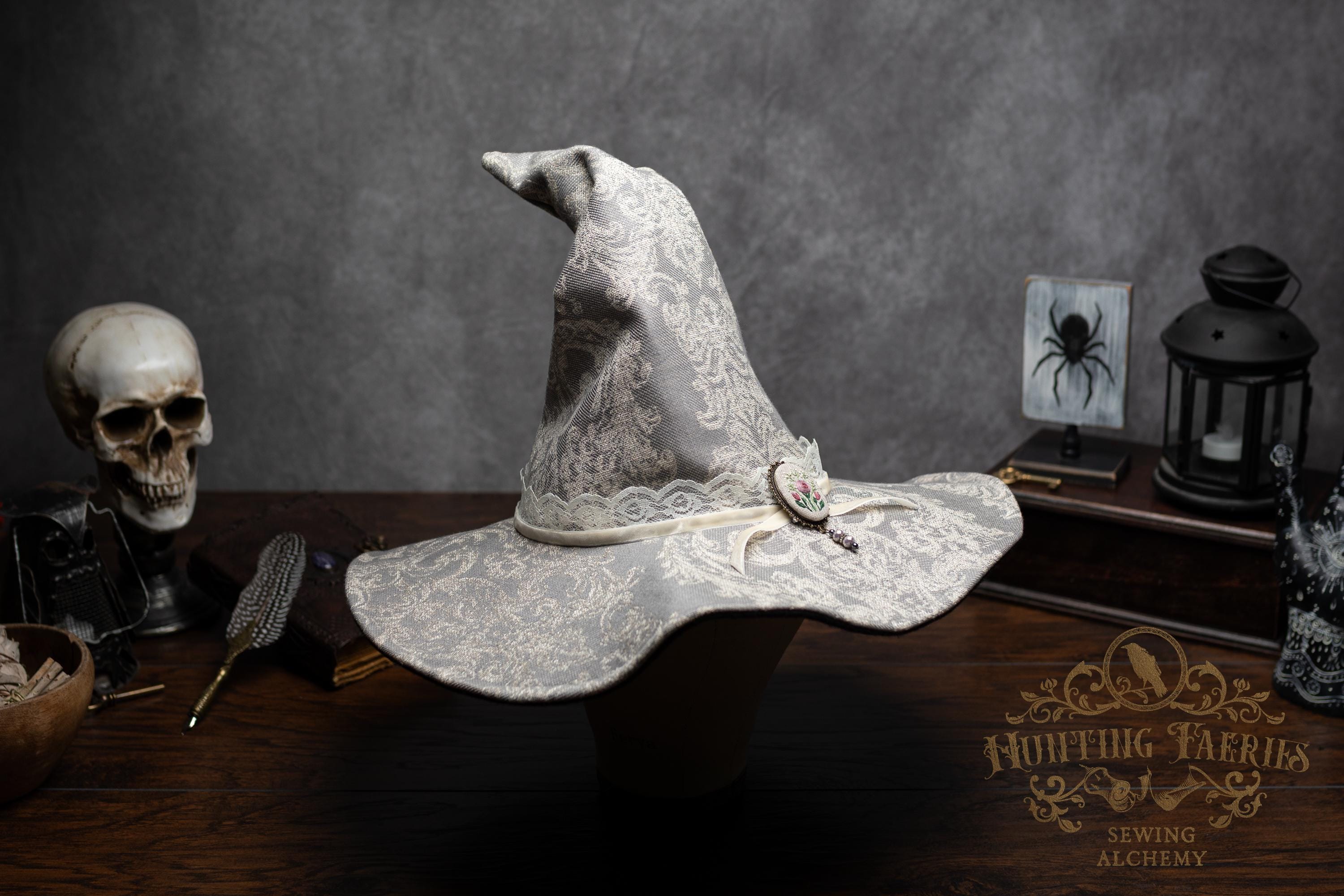 This handcrafted witch hat is made from a damask-pattern, light grey linen. It features a delicate lace and velvet band, around the cone with a hand-embroidered pin front and center.