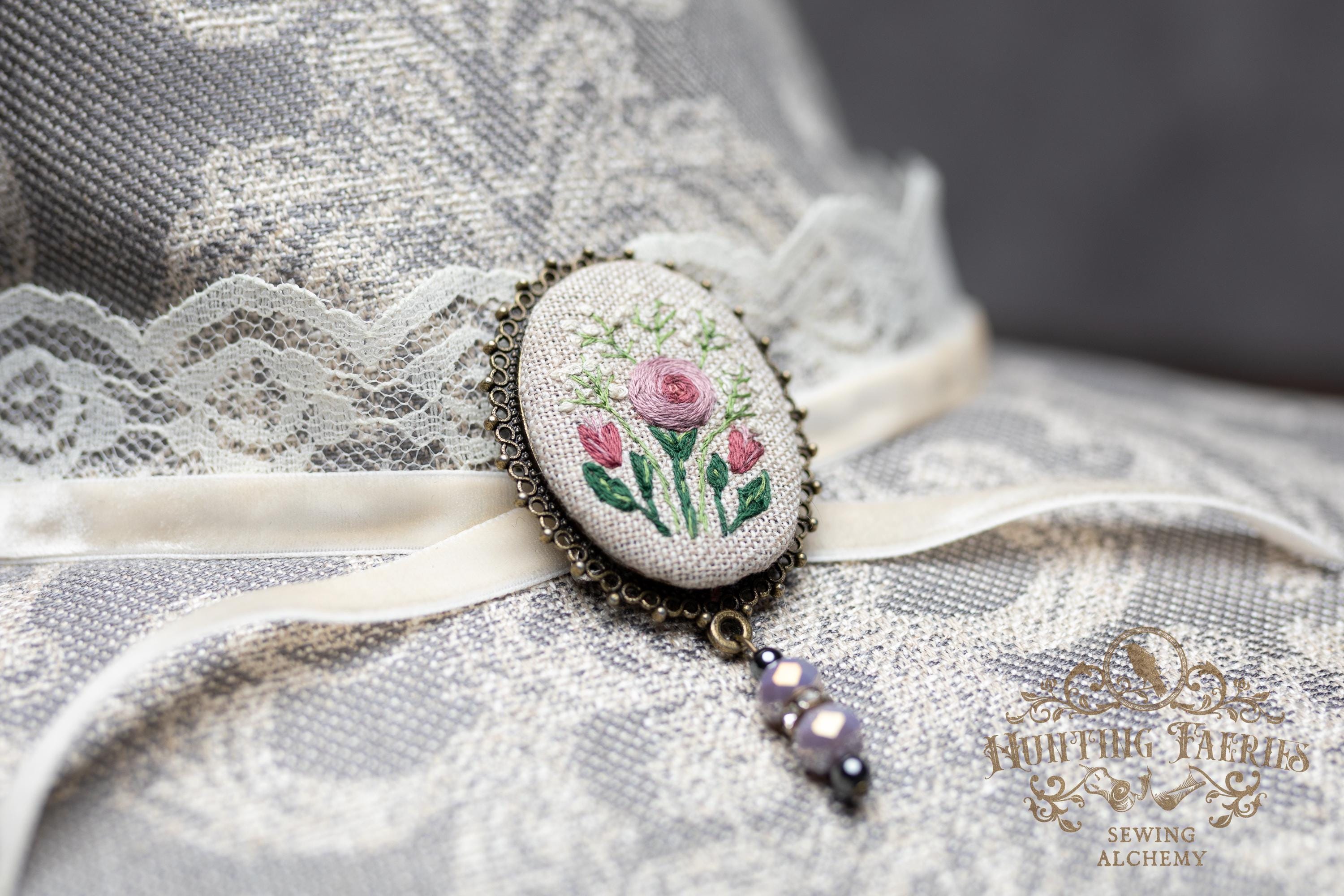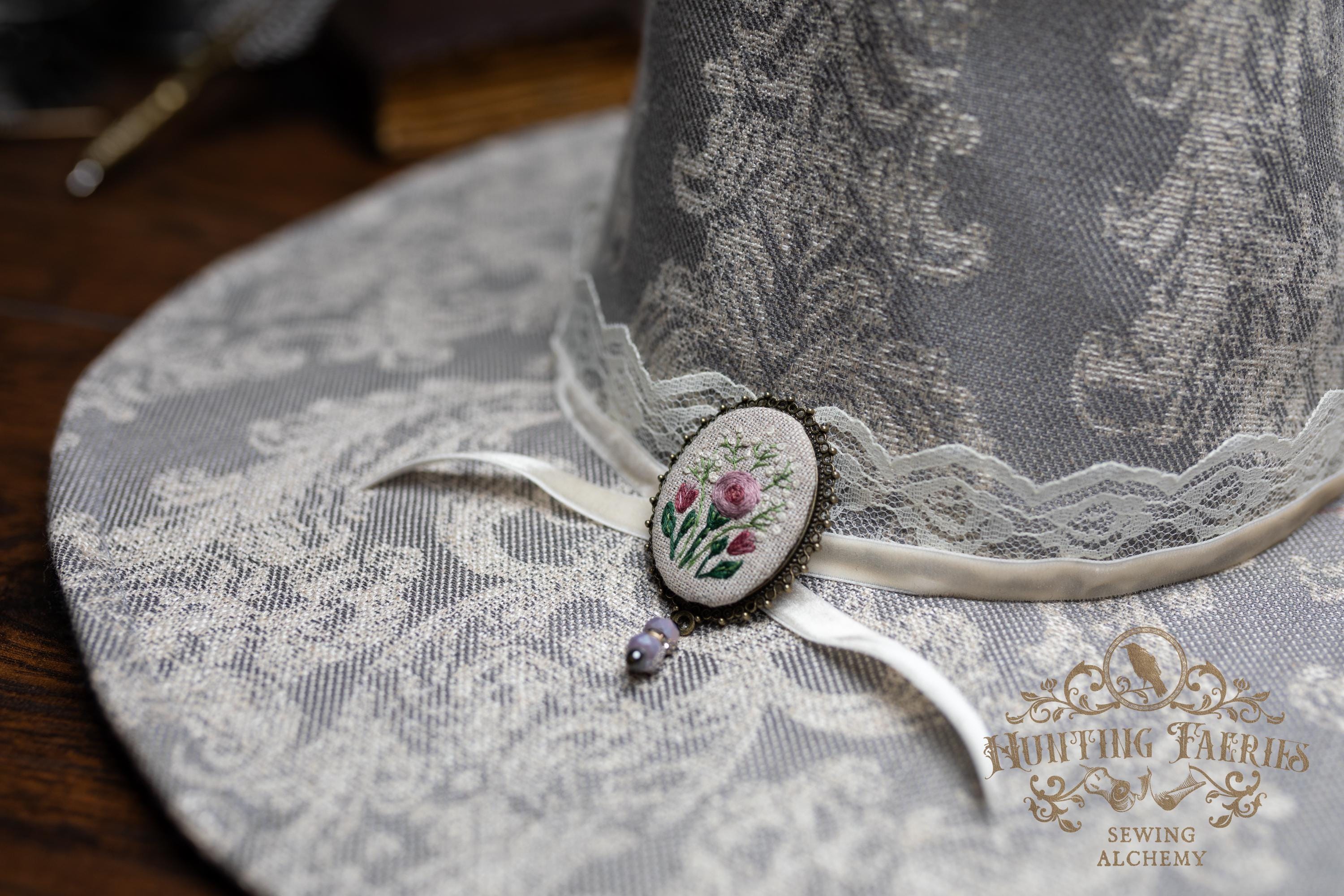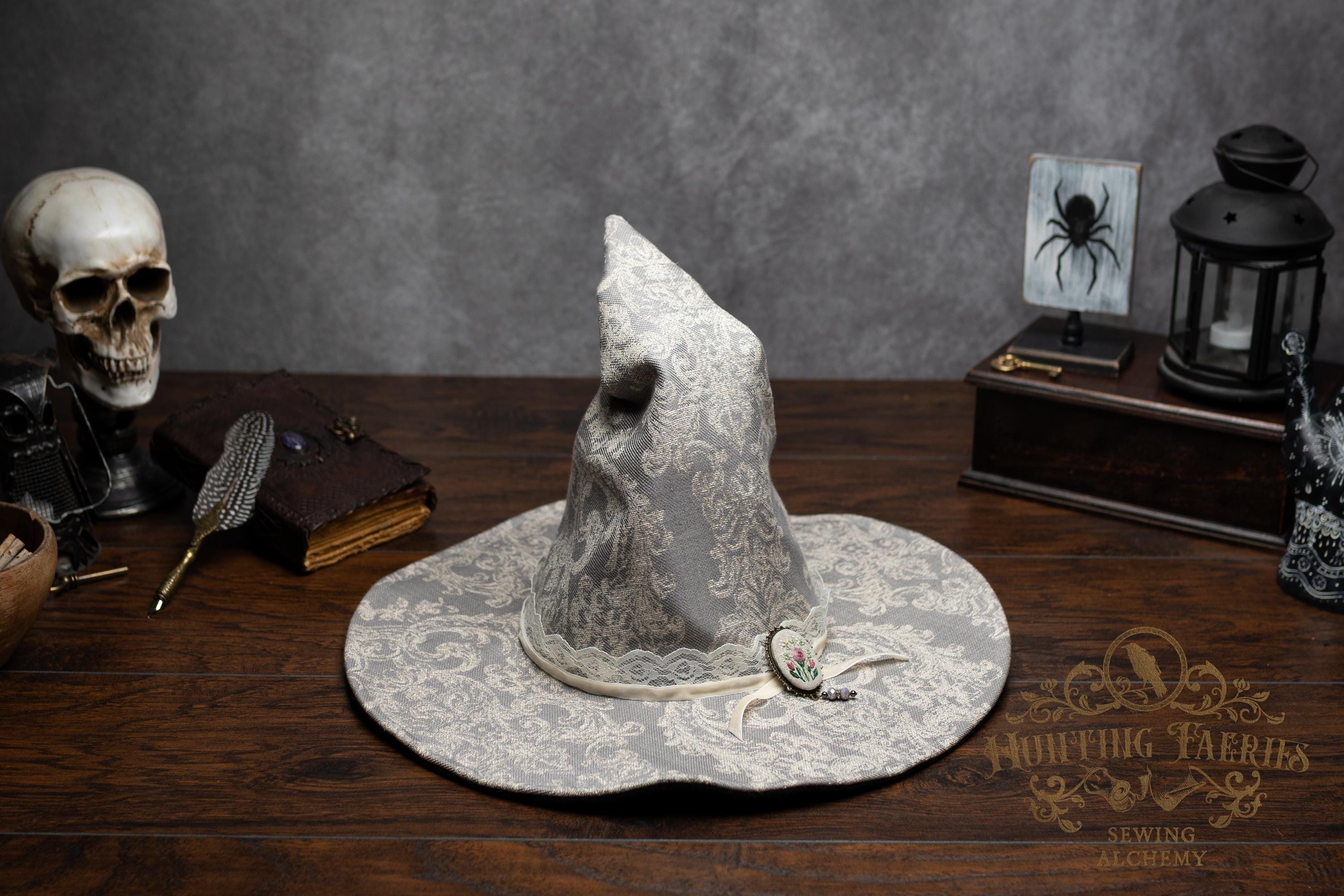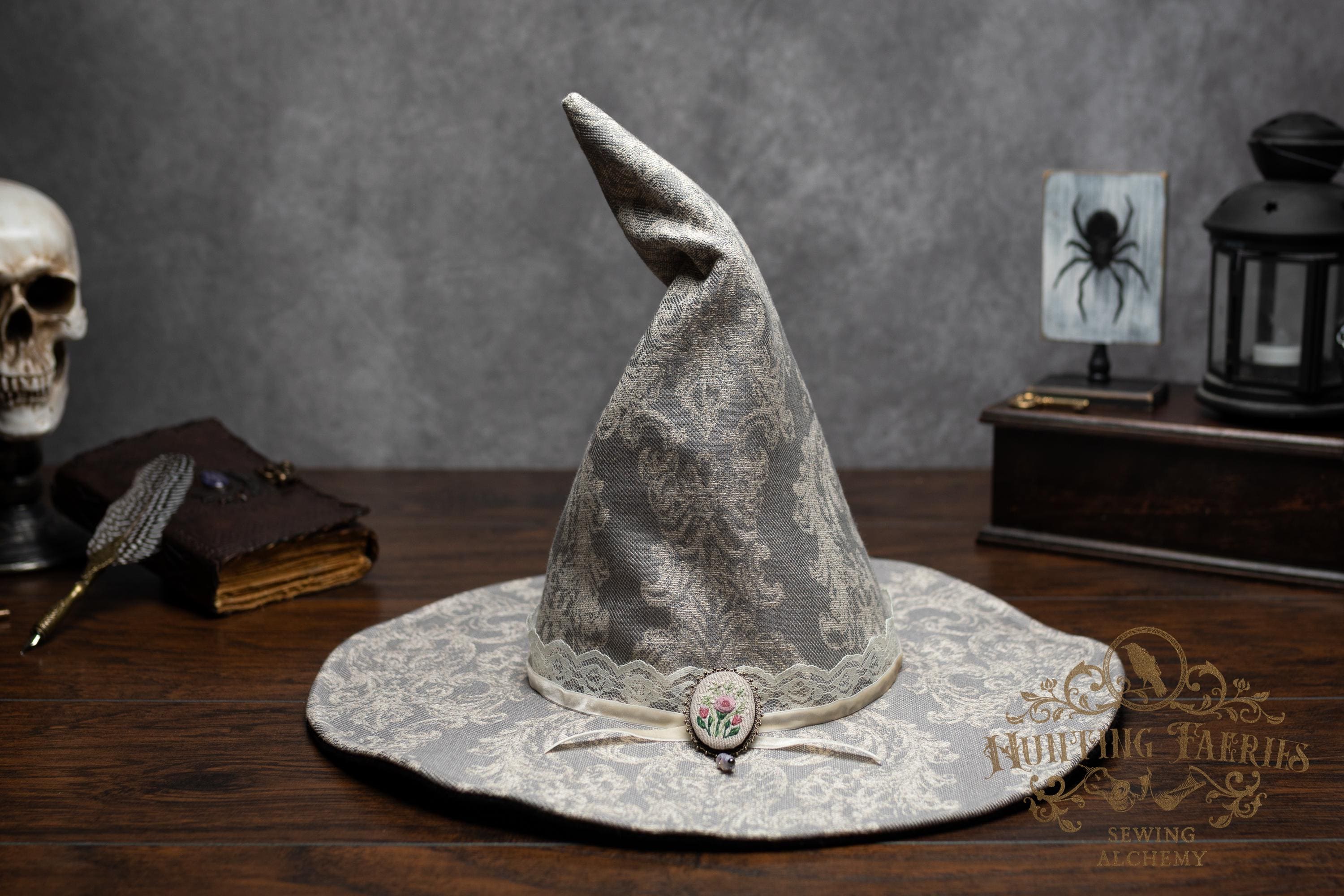 This handcrafted witch hat is made from a damask-pattern, light grey linen. It features a delicate lace and velvet band, around the cone with a hand-embroidered pin front and center.