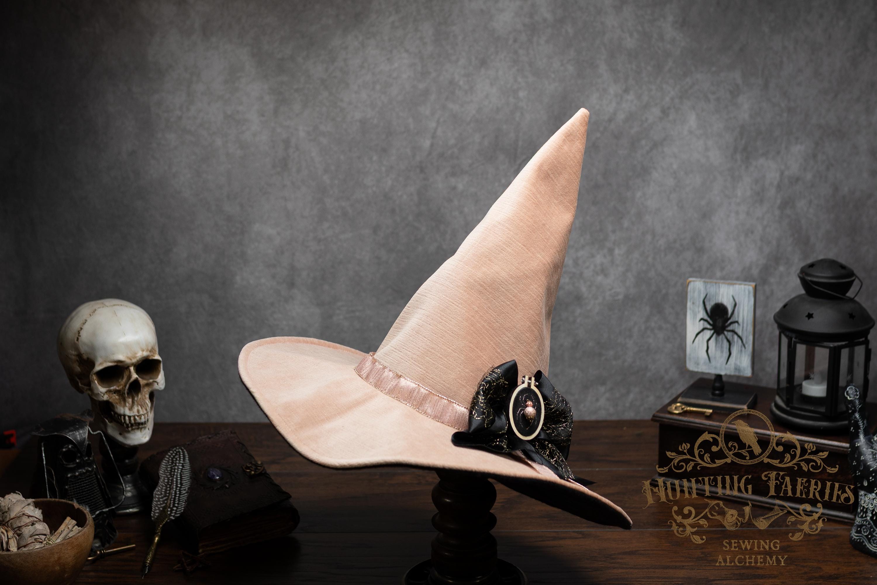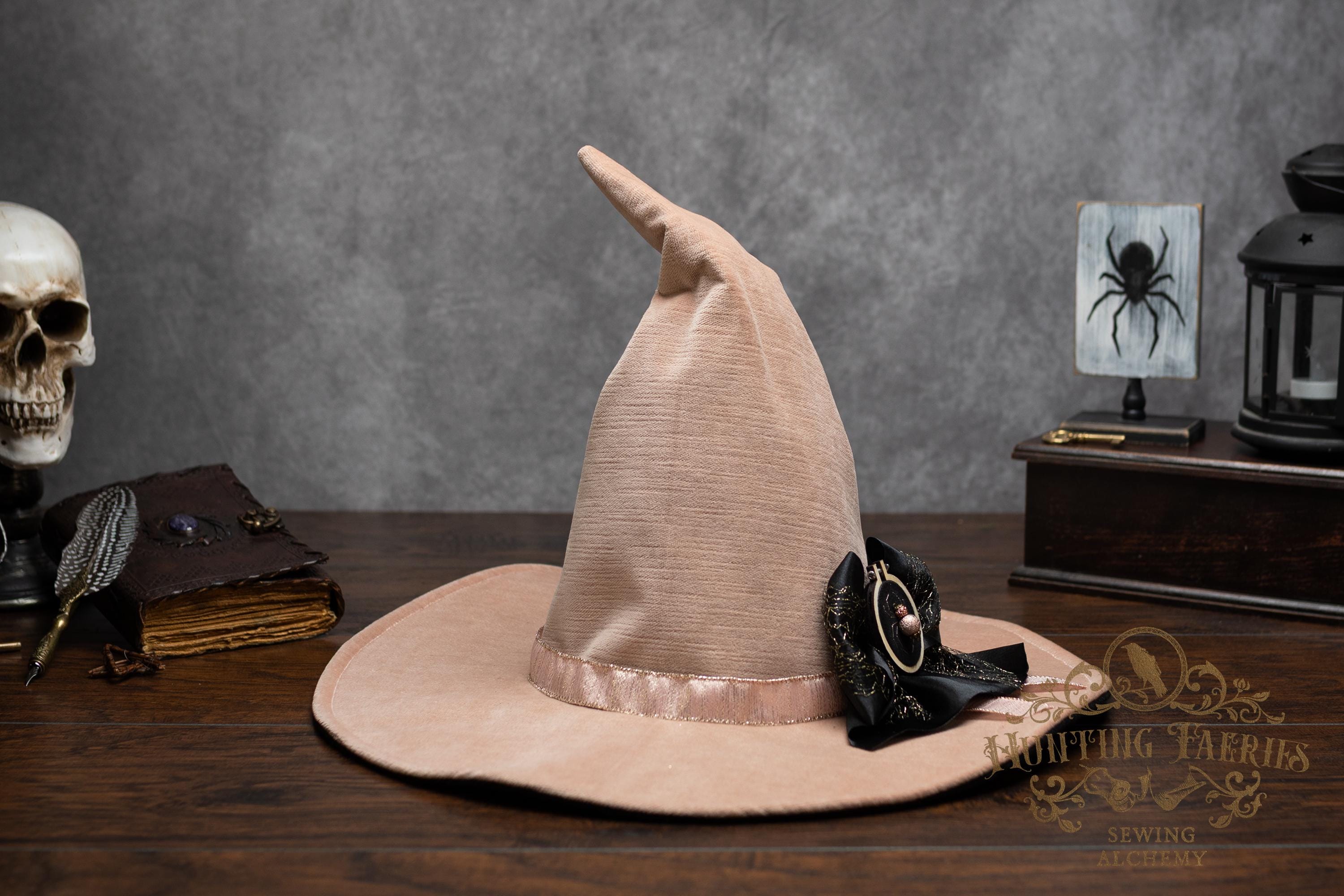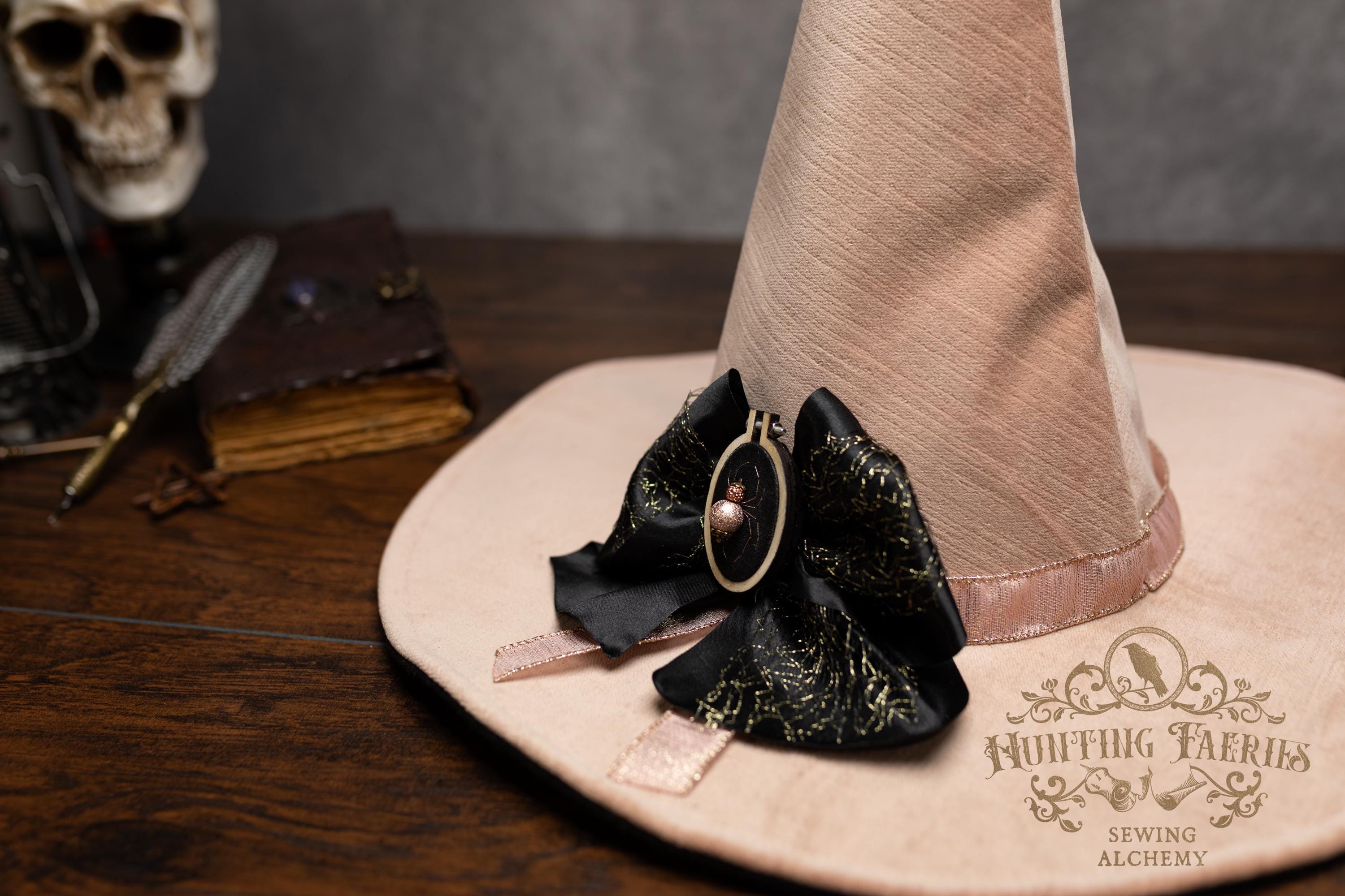 This handcrafted witch hat is made from a blush pink velvety fabric. It features a band in like color accented in gold. At the side is a black satin bow with gold accents and a hand-stitched rose gold spider pin. Each is easily removed if you want to change up your look.