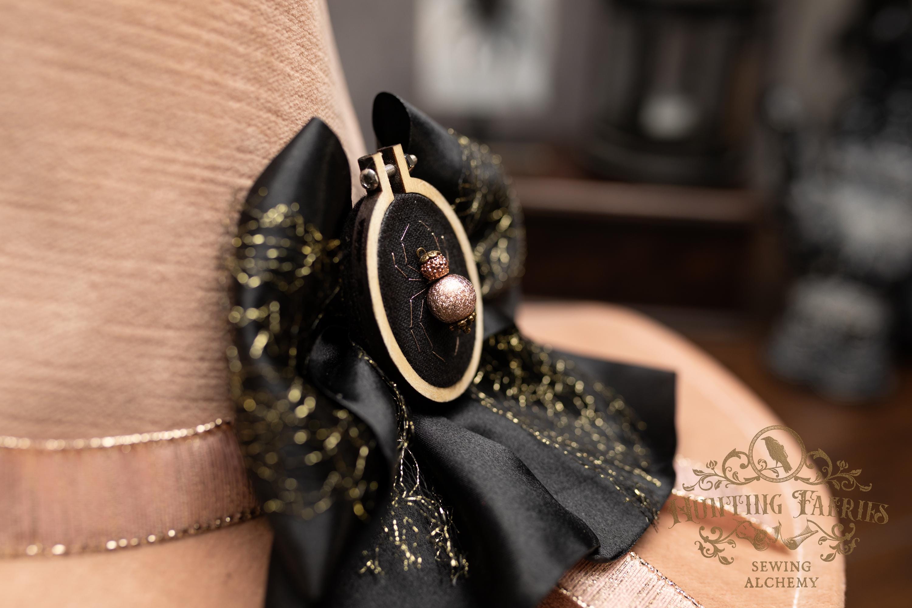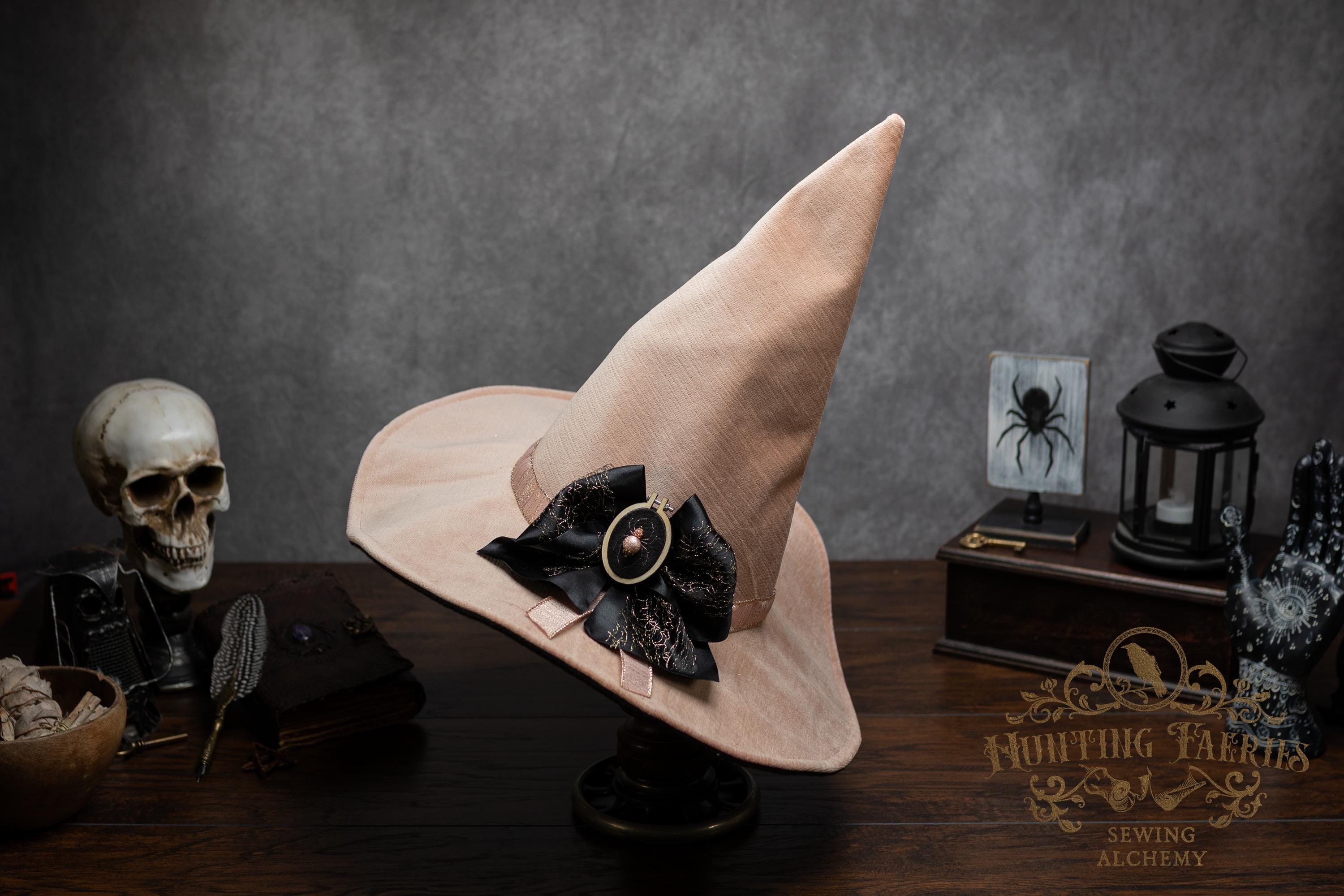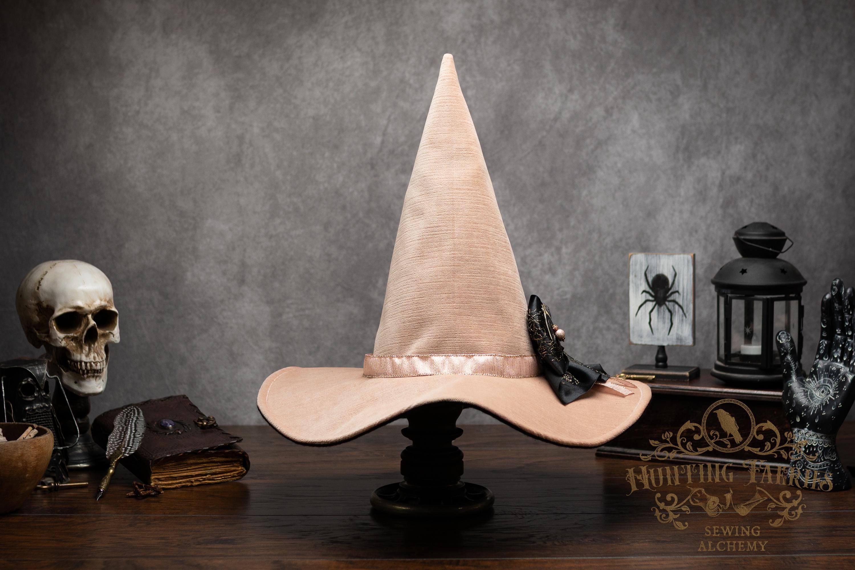 This handcrafted witch hat is made from a blush pink velvety fabric. It features a band in like color accented in gold. At the side is a black satin bow with gold accents and a hand-stitched rose gold spider pin. Each is easily removed if you want to change up your look.