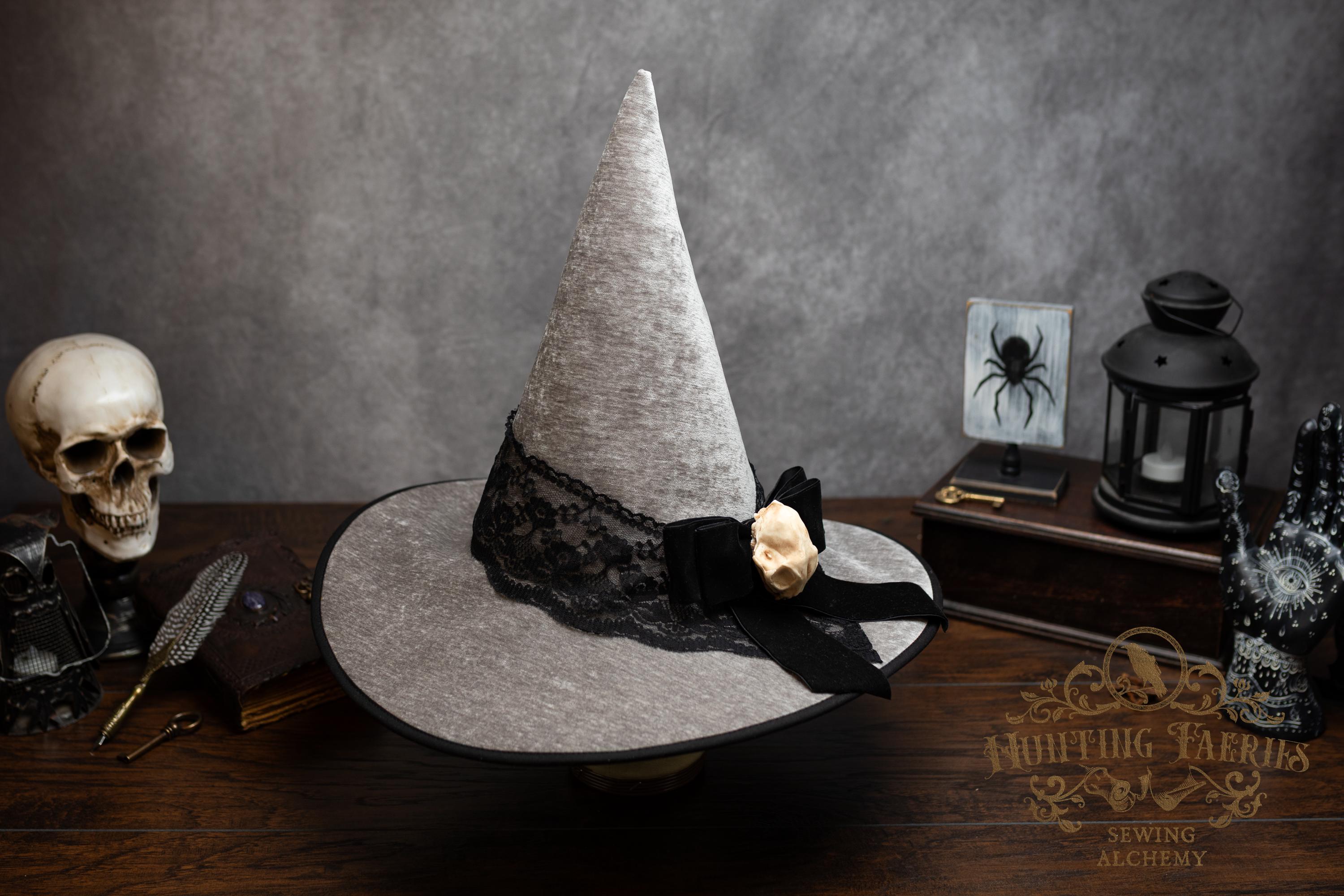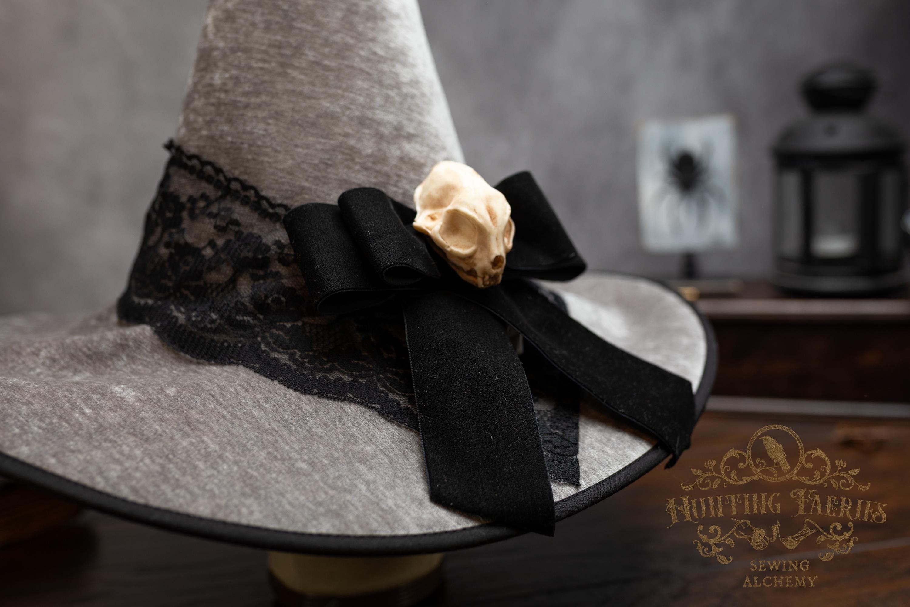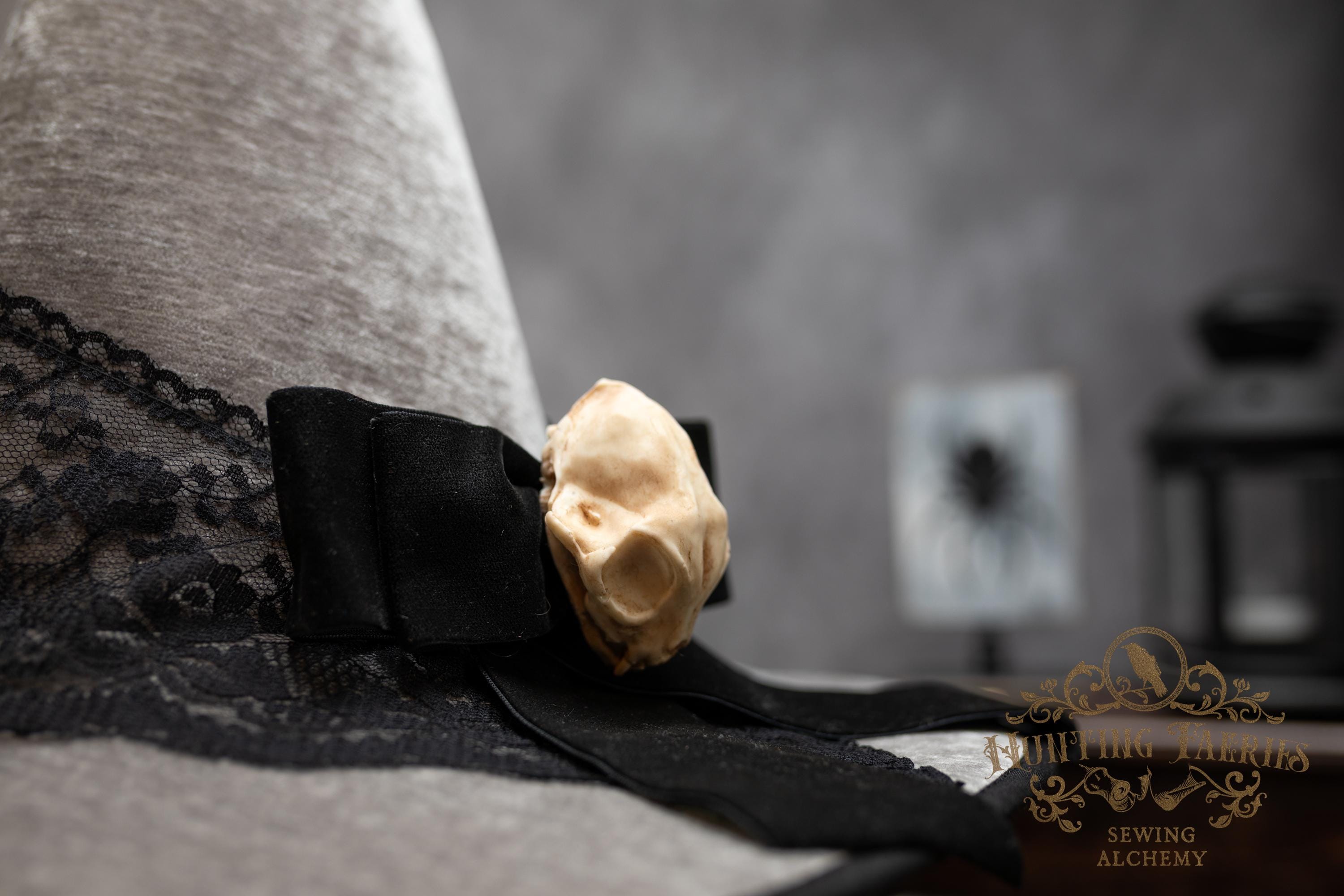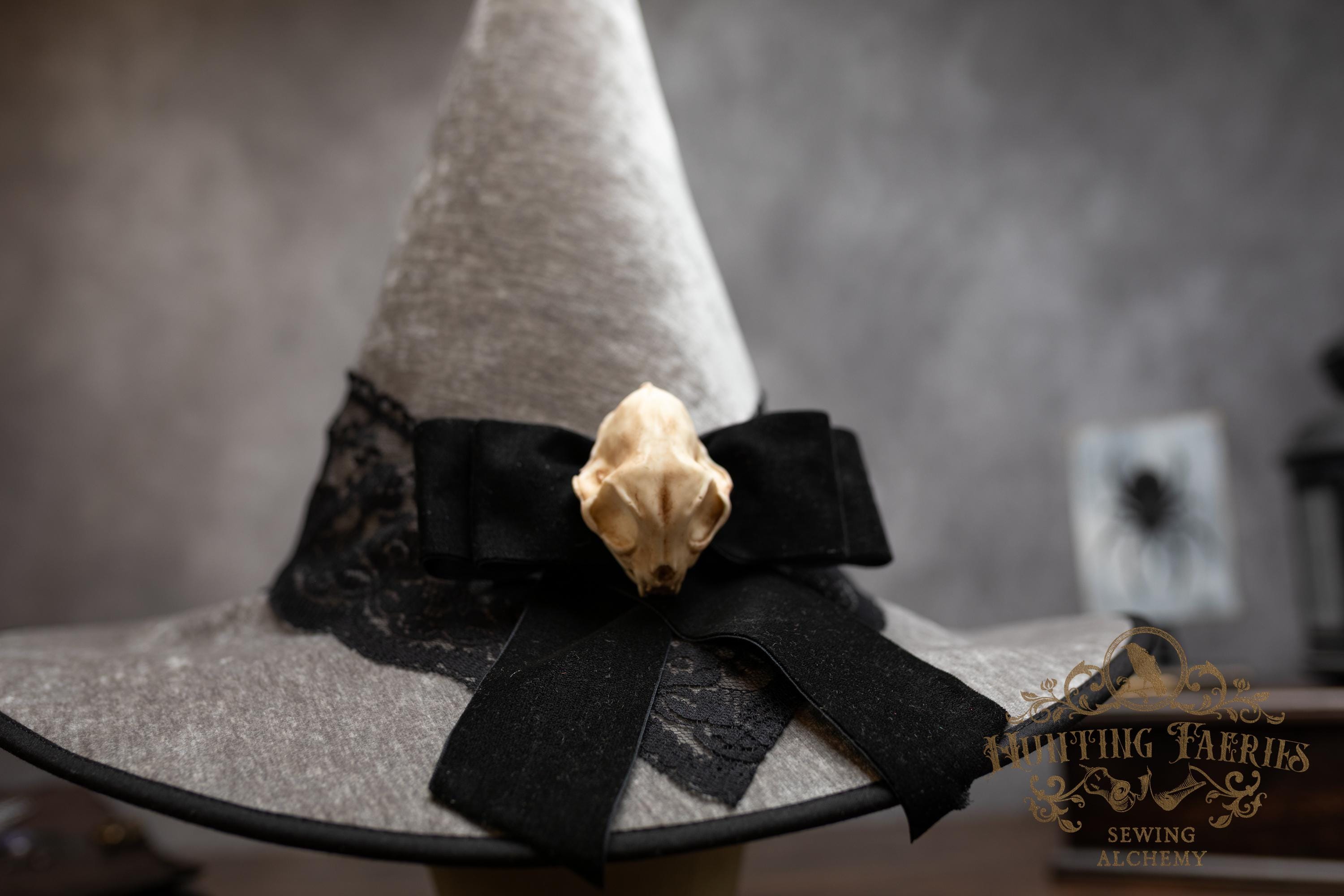 This handcrafted light grey witch hat features a lace band around the cone with a velvet ribbon bow with detachable faux cat skull accent on the side. The latter is attached via a set of pins, allowing you to take it off and decorate yourself if you wish.