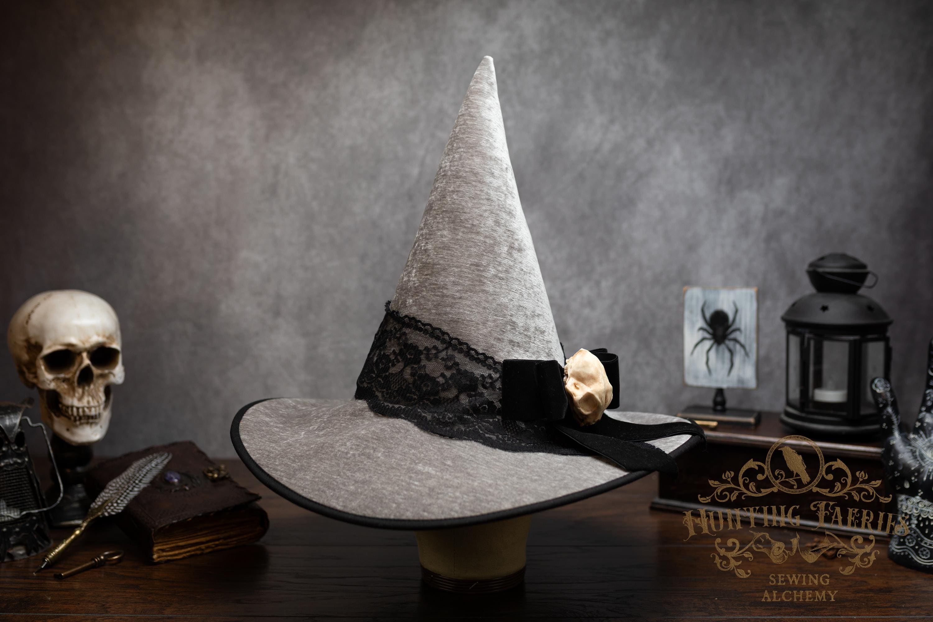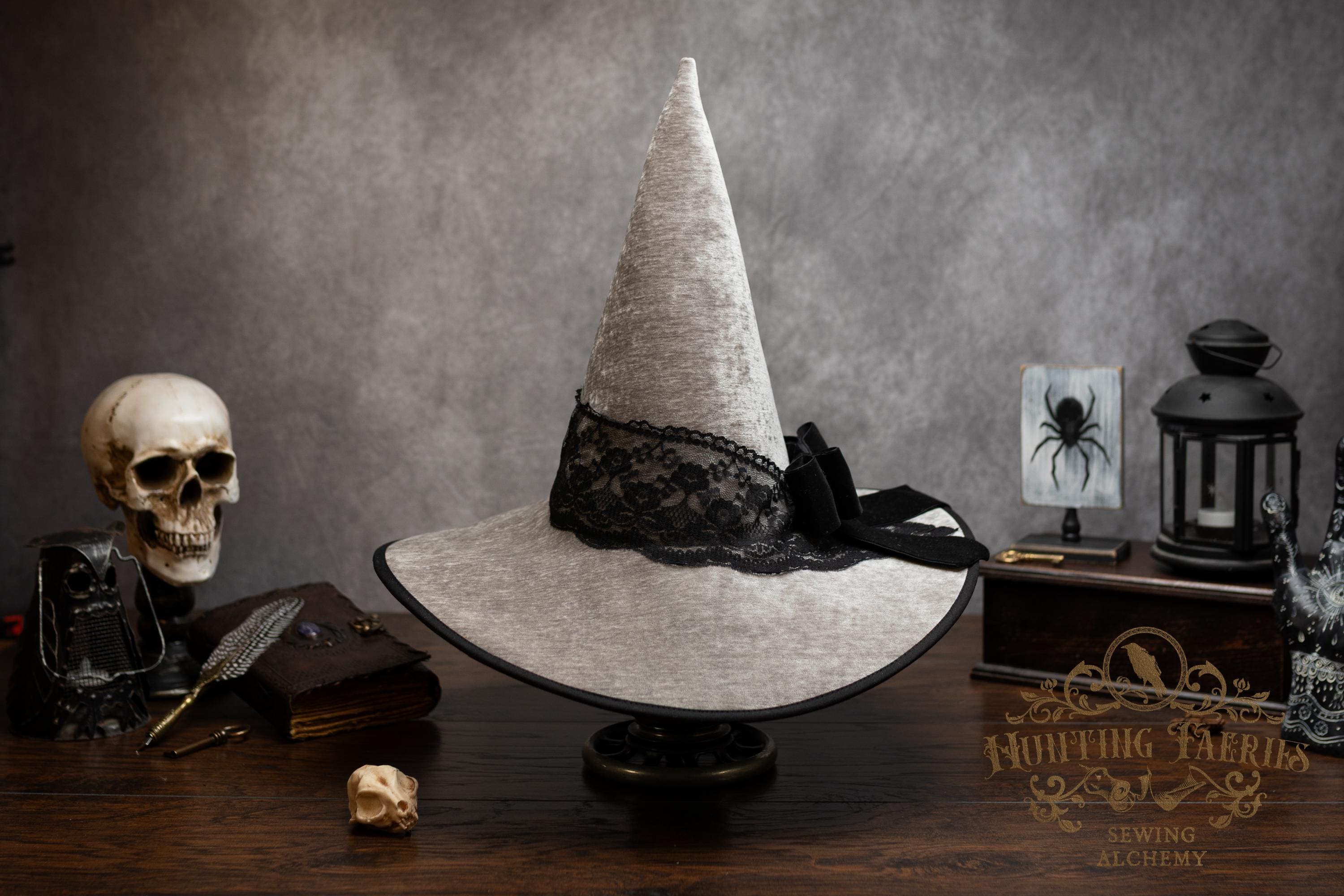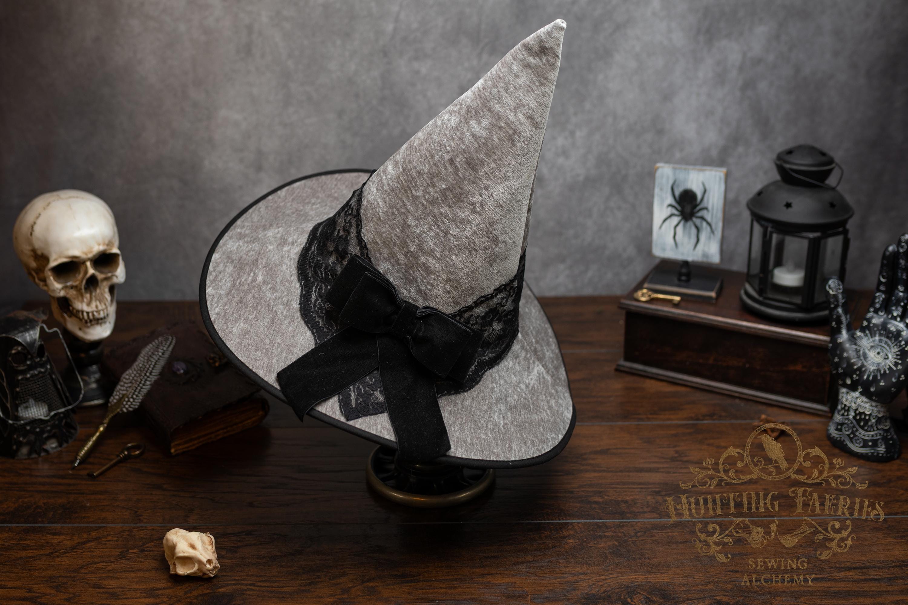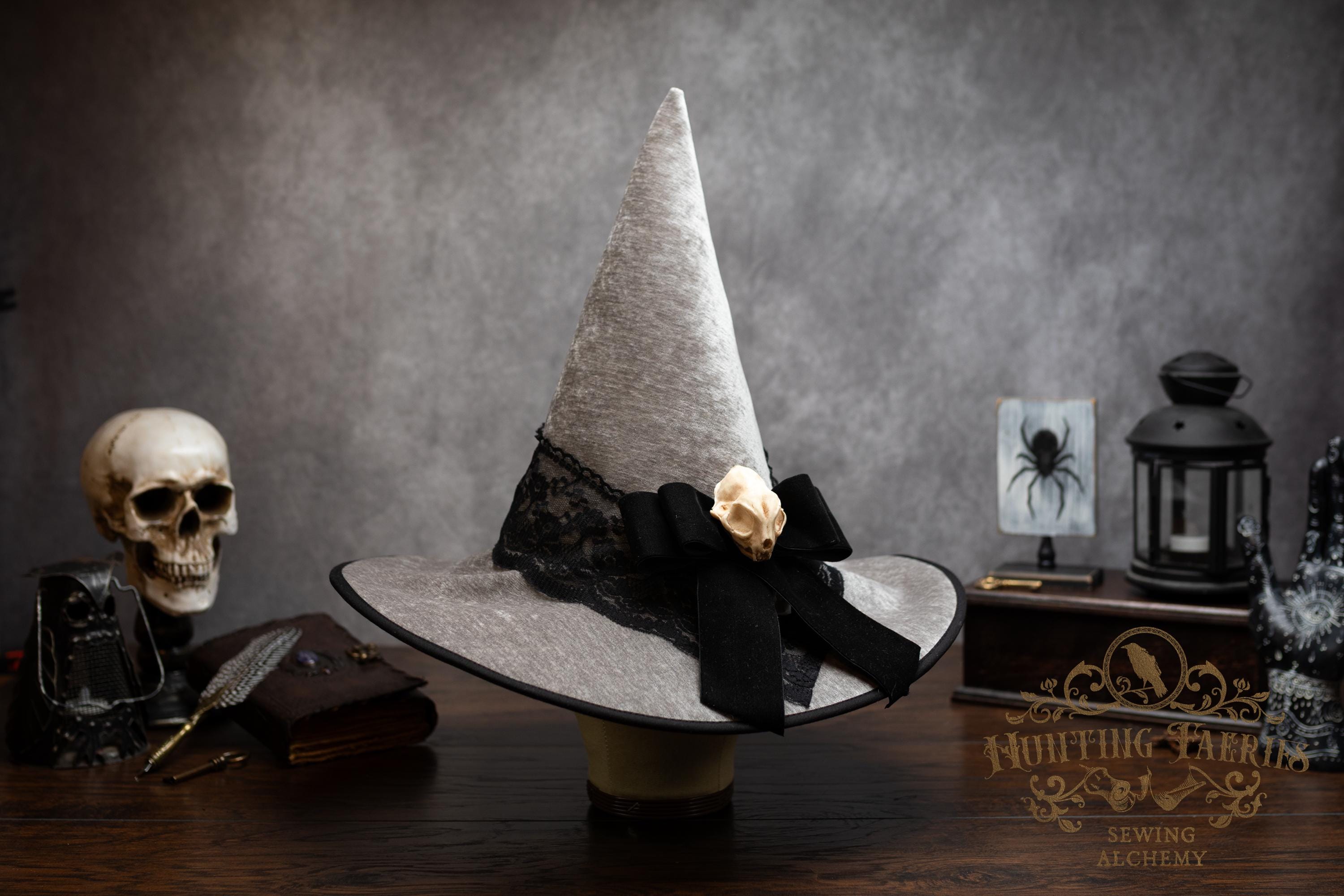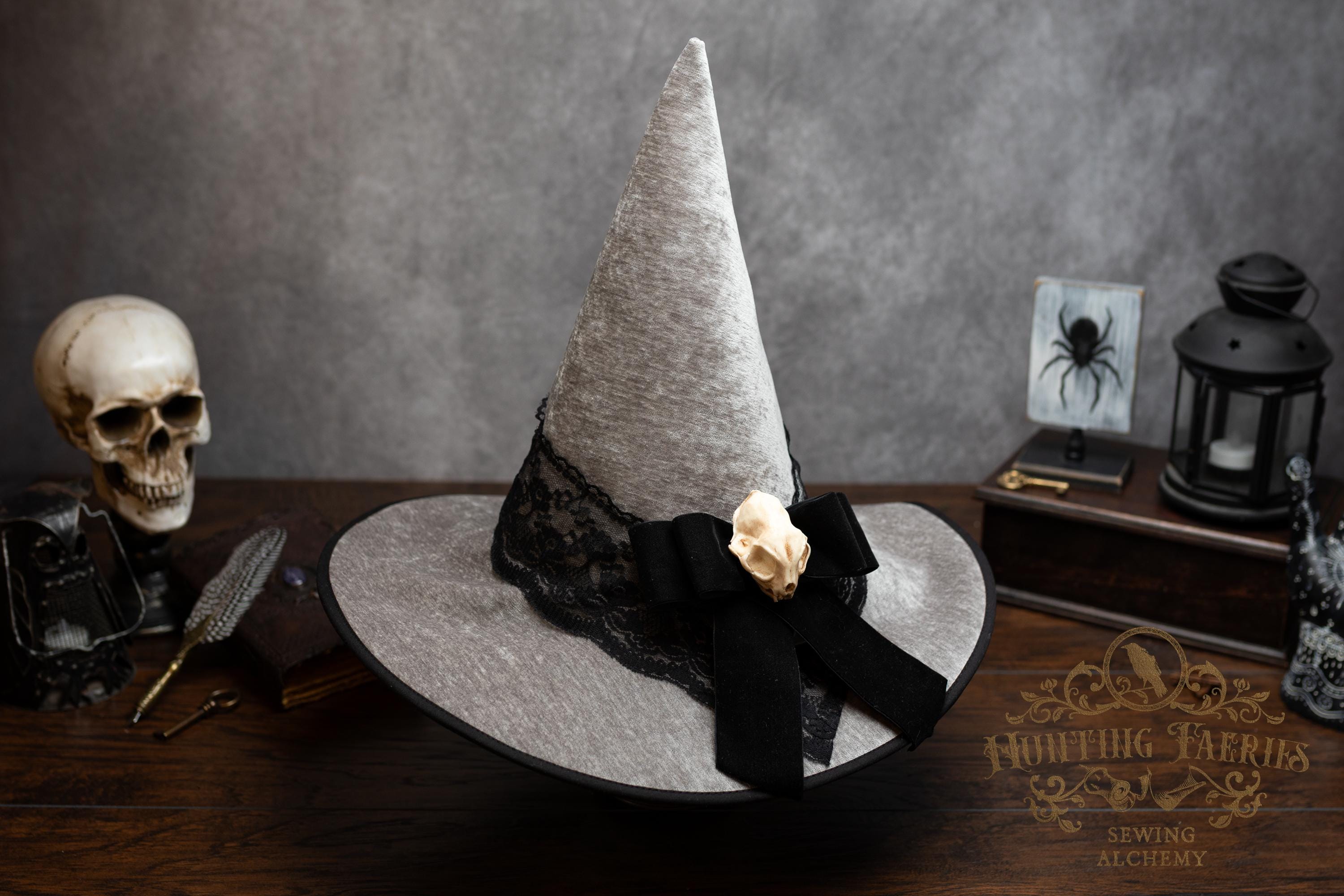 This handcrafted light grey witch hat features a lace band around the cone with a velvet ribbon bow with detachable faux cat skull accent on the side. The latter is attached via a set of pins, allowing you to take it off and decorate yourself if you wish.