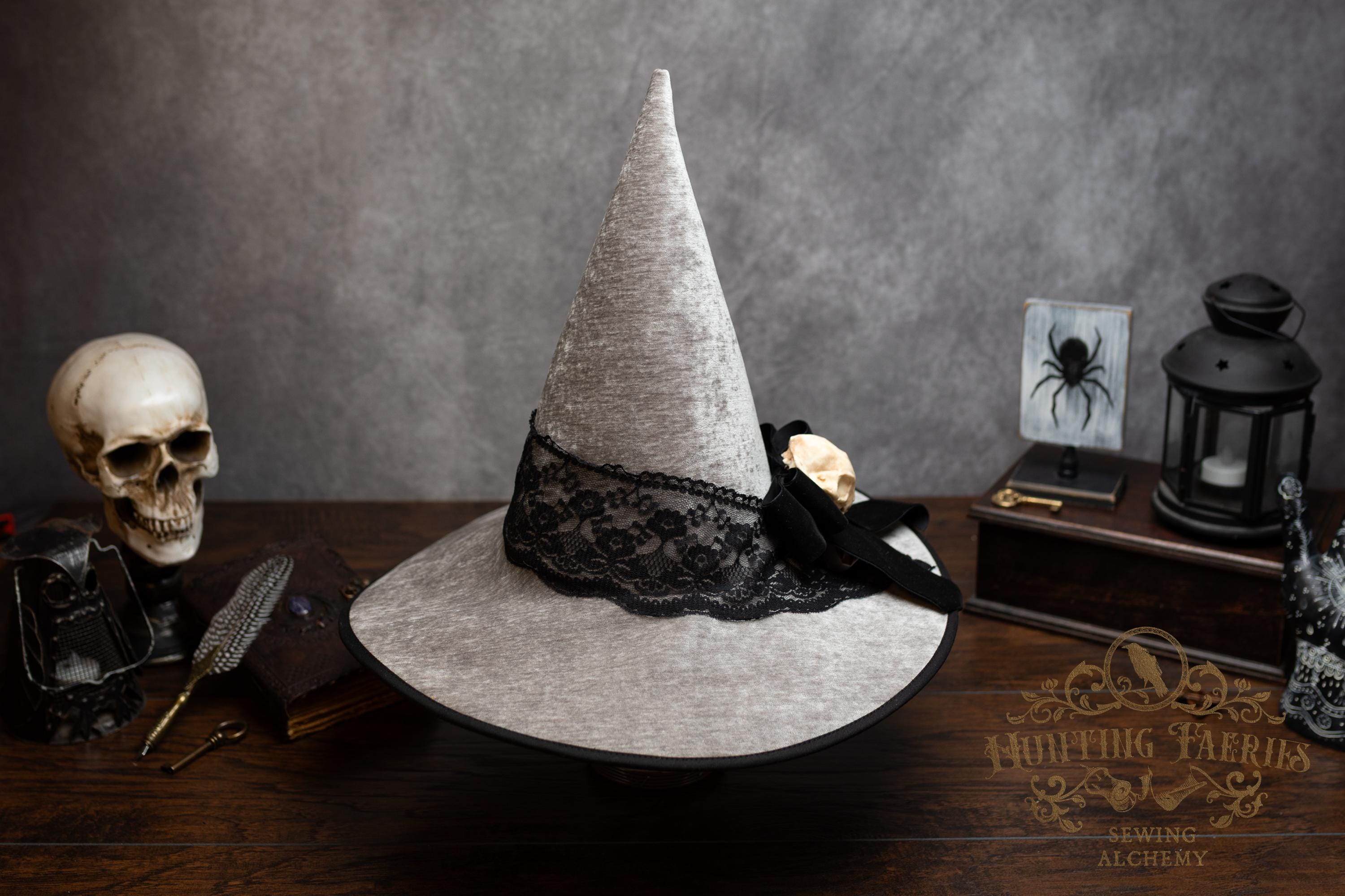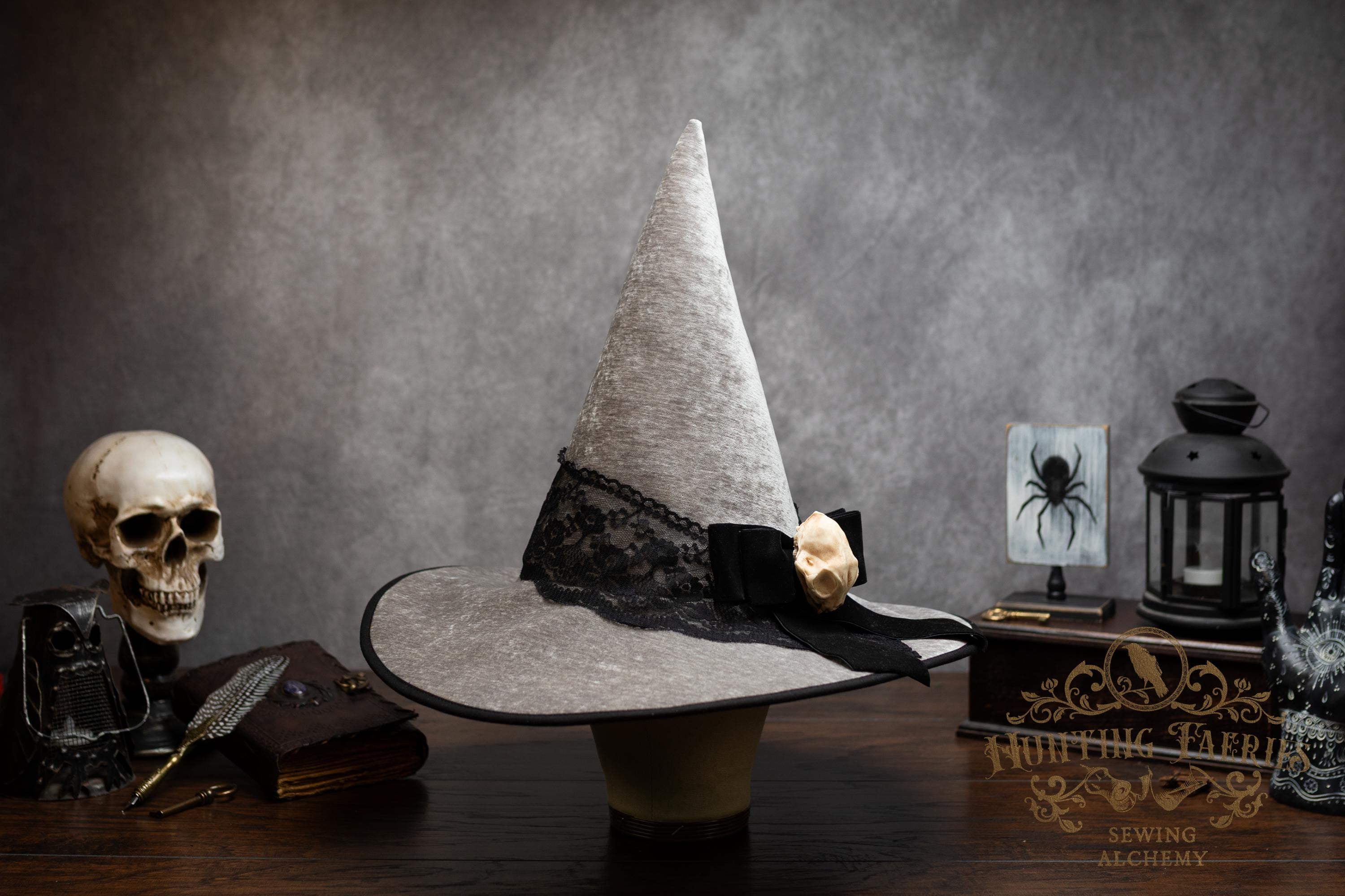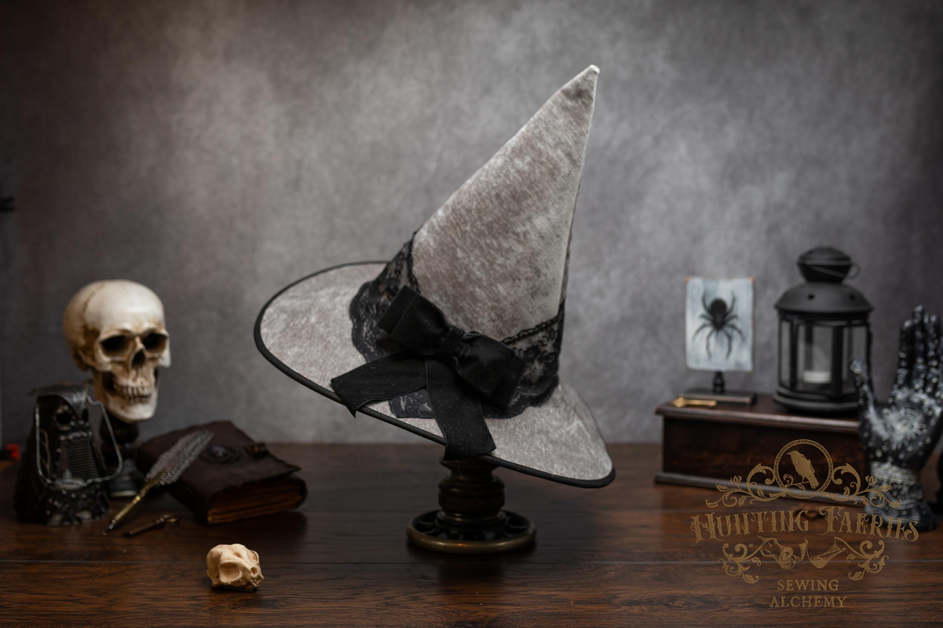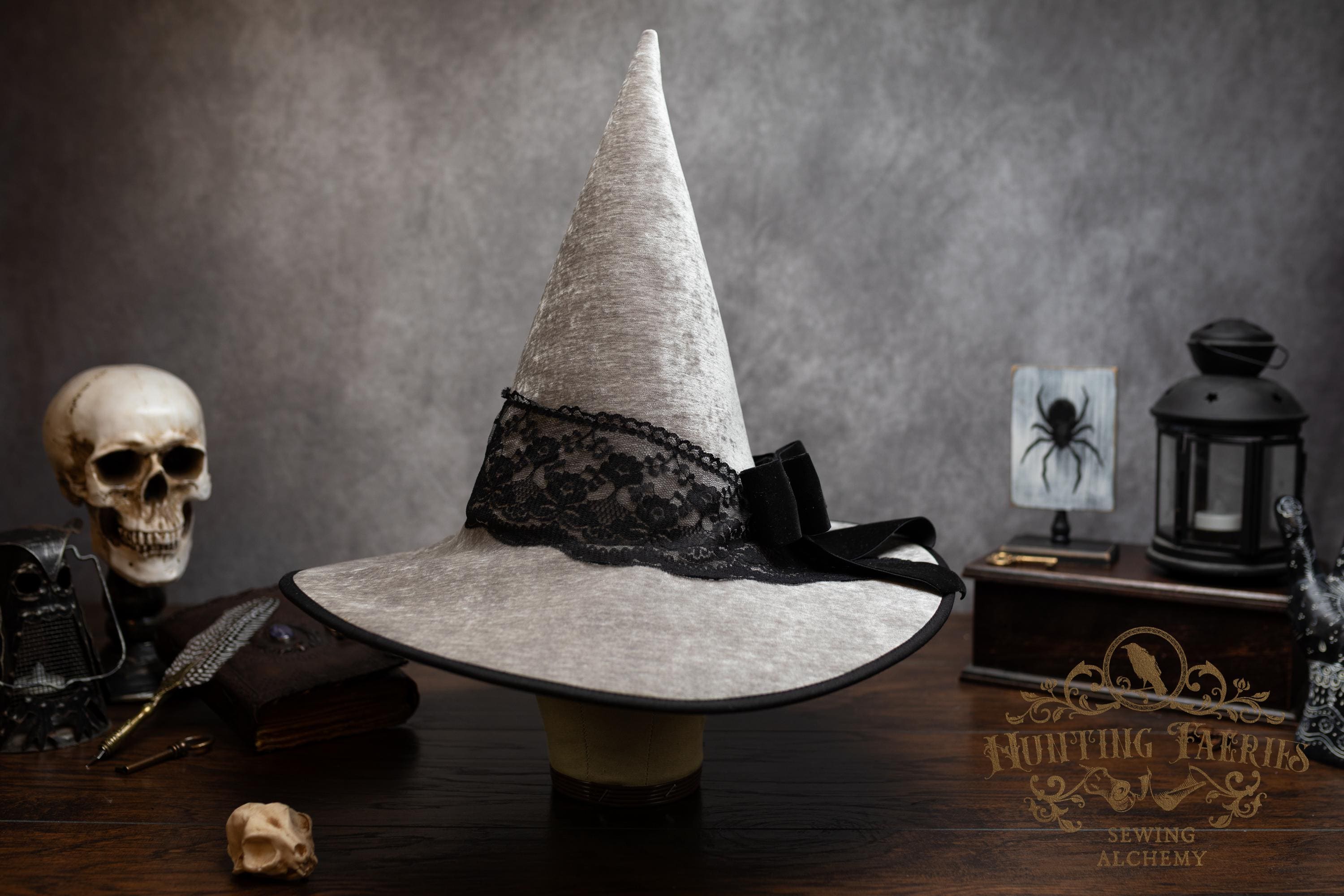 This handcrafted light grey witch hat features a lace band around the cone with a velvet ribbon bow with detachable faux cat skull accent on the side. The latter is attached via a set of pins, allowing you to take it off and decorate yourself if you wish.