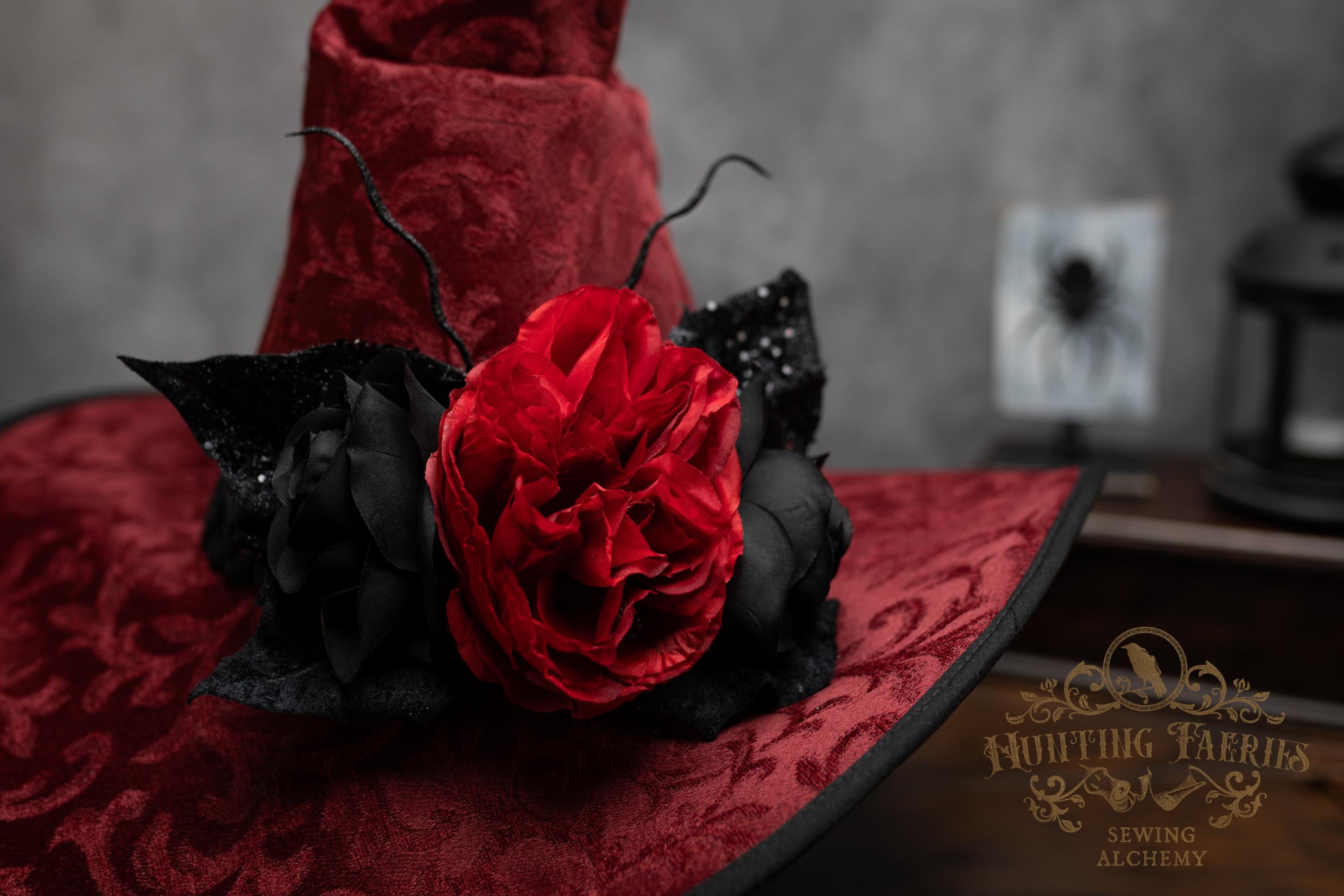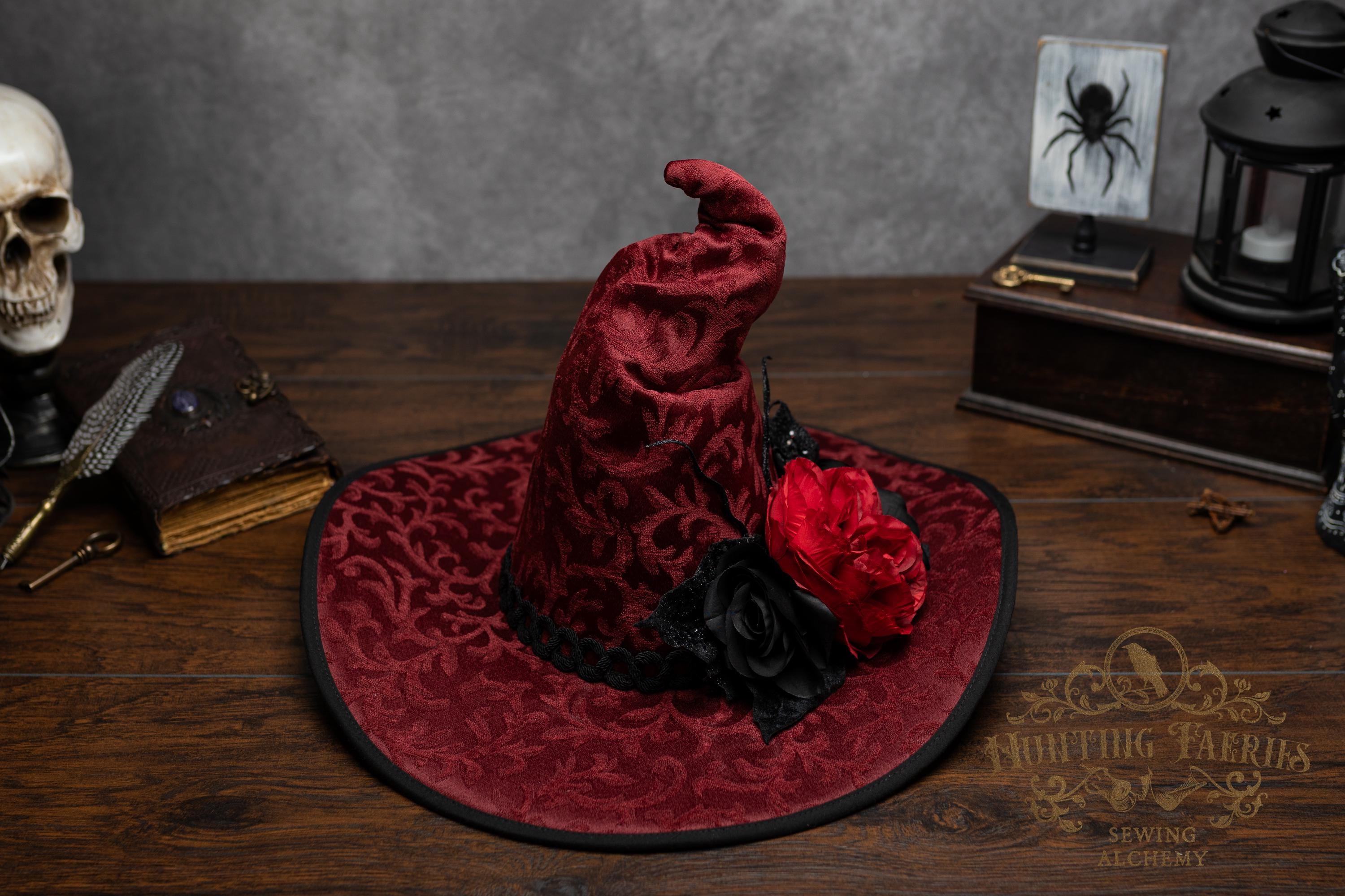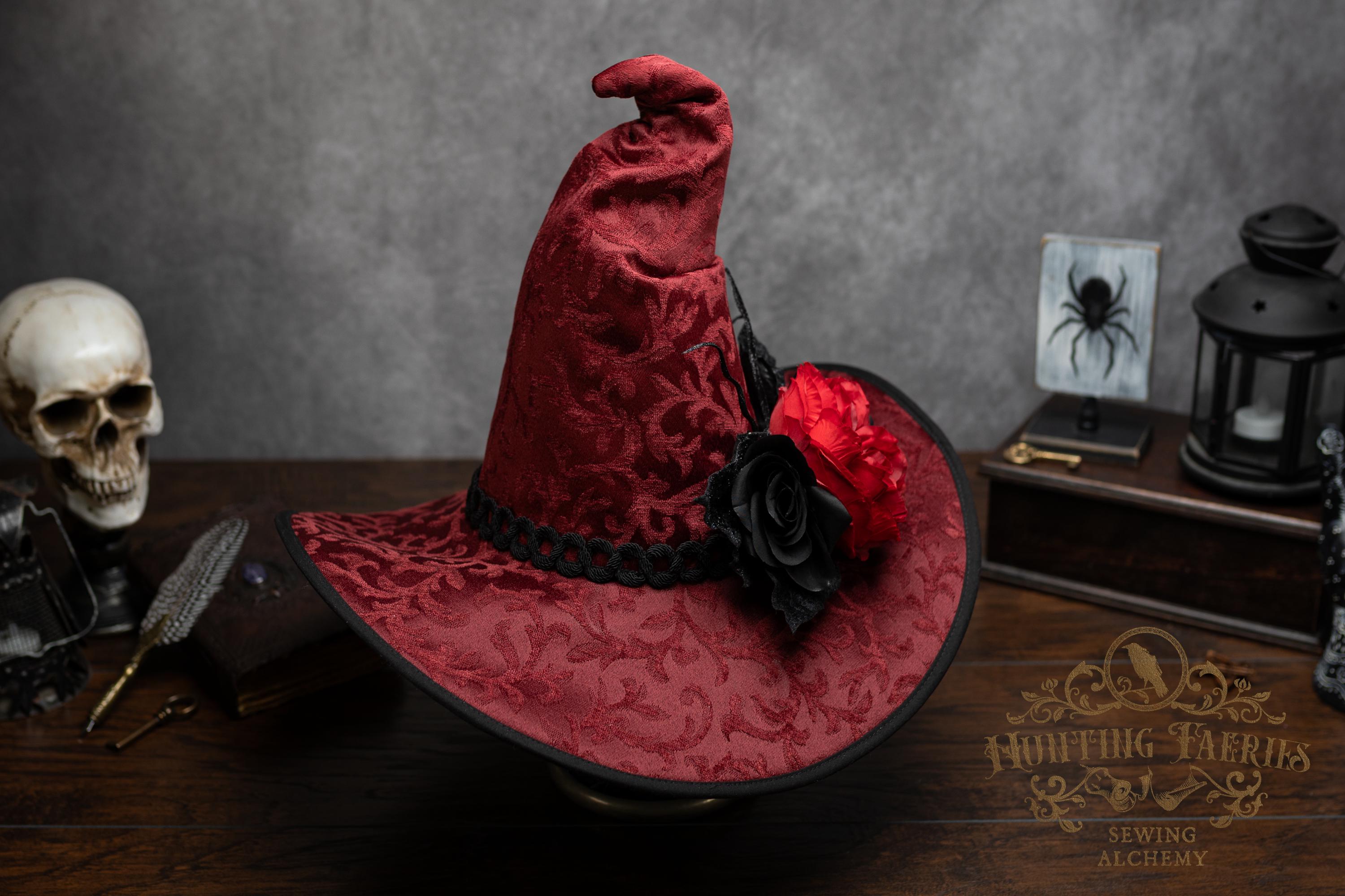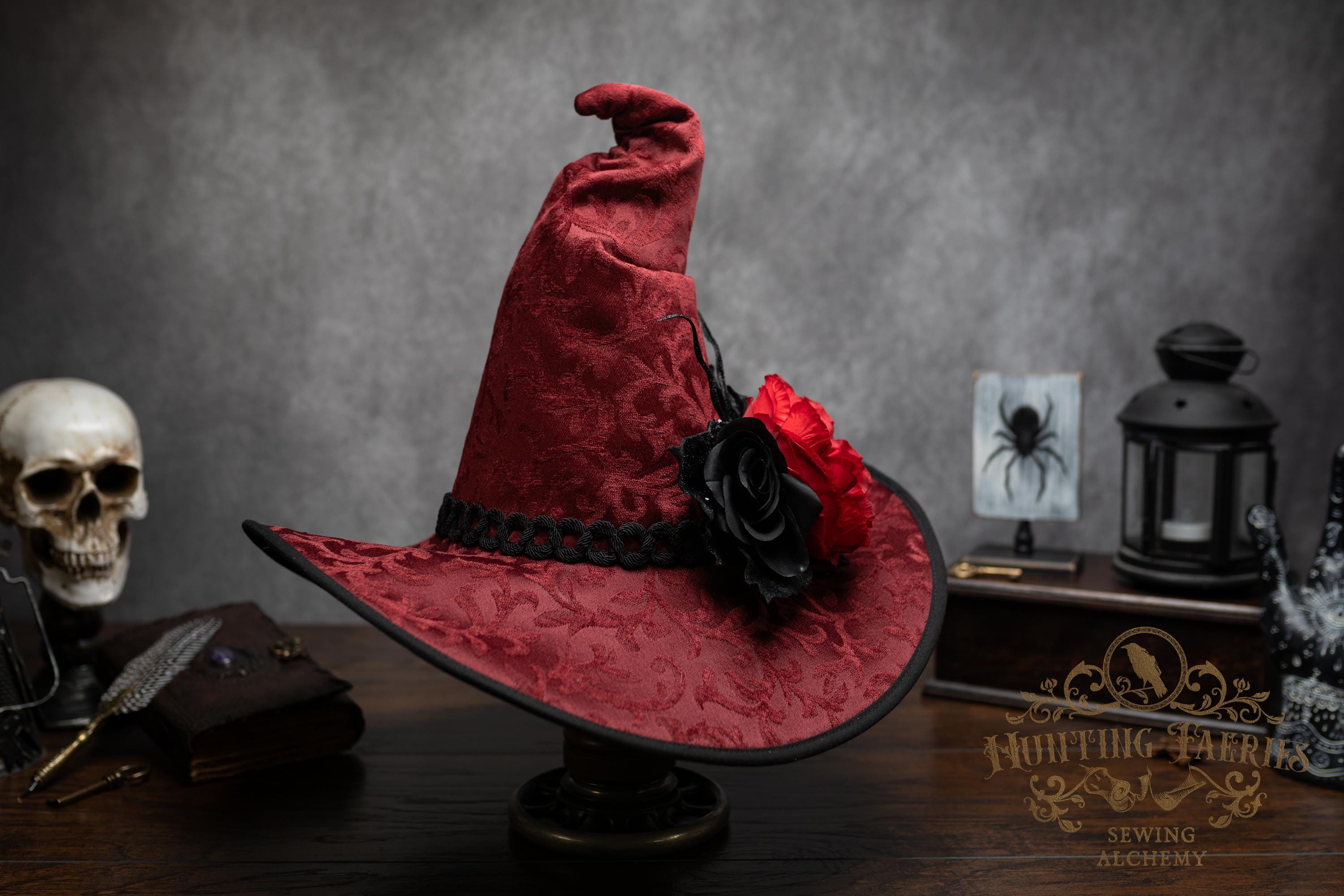 This handcrafted dark red witch hat features a braided band around the cone with an artificial flower accent on the side, which resembles a butterfly with antennae. The latter is attached with a set of pins, allowing you to remove it and decorate yourself if you wish.