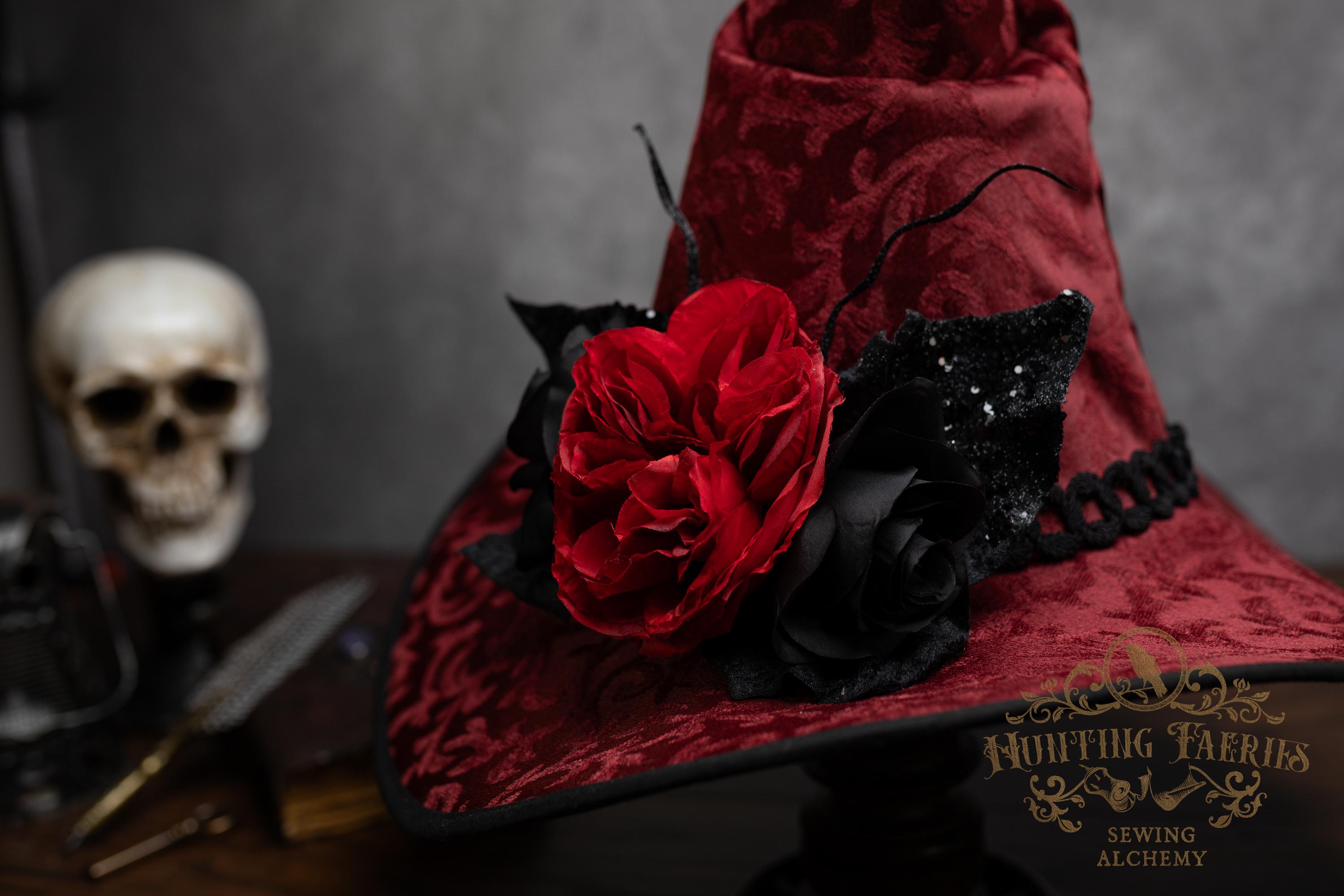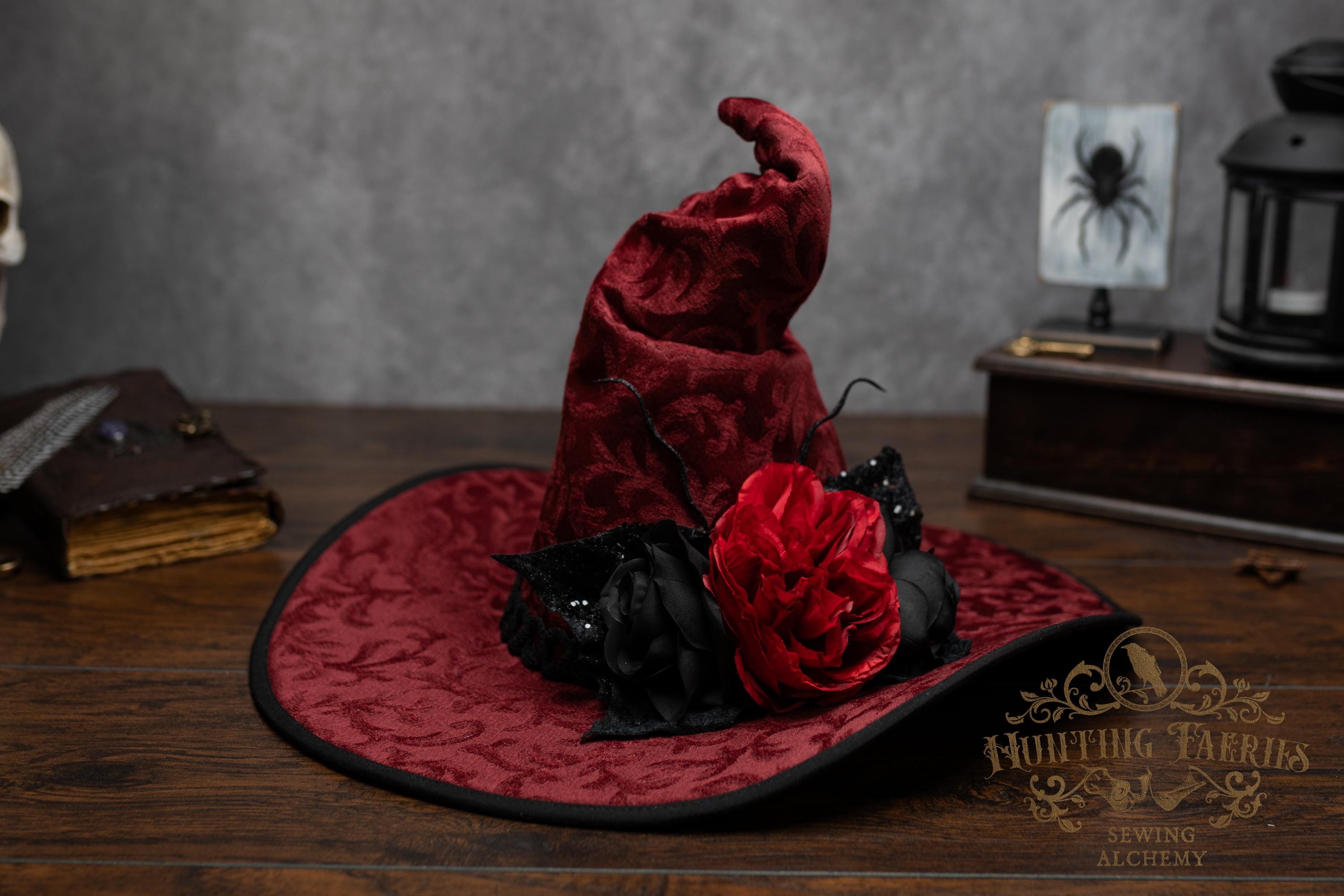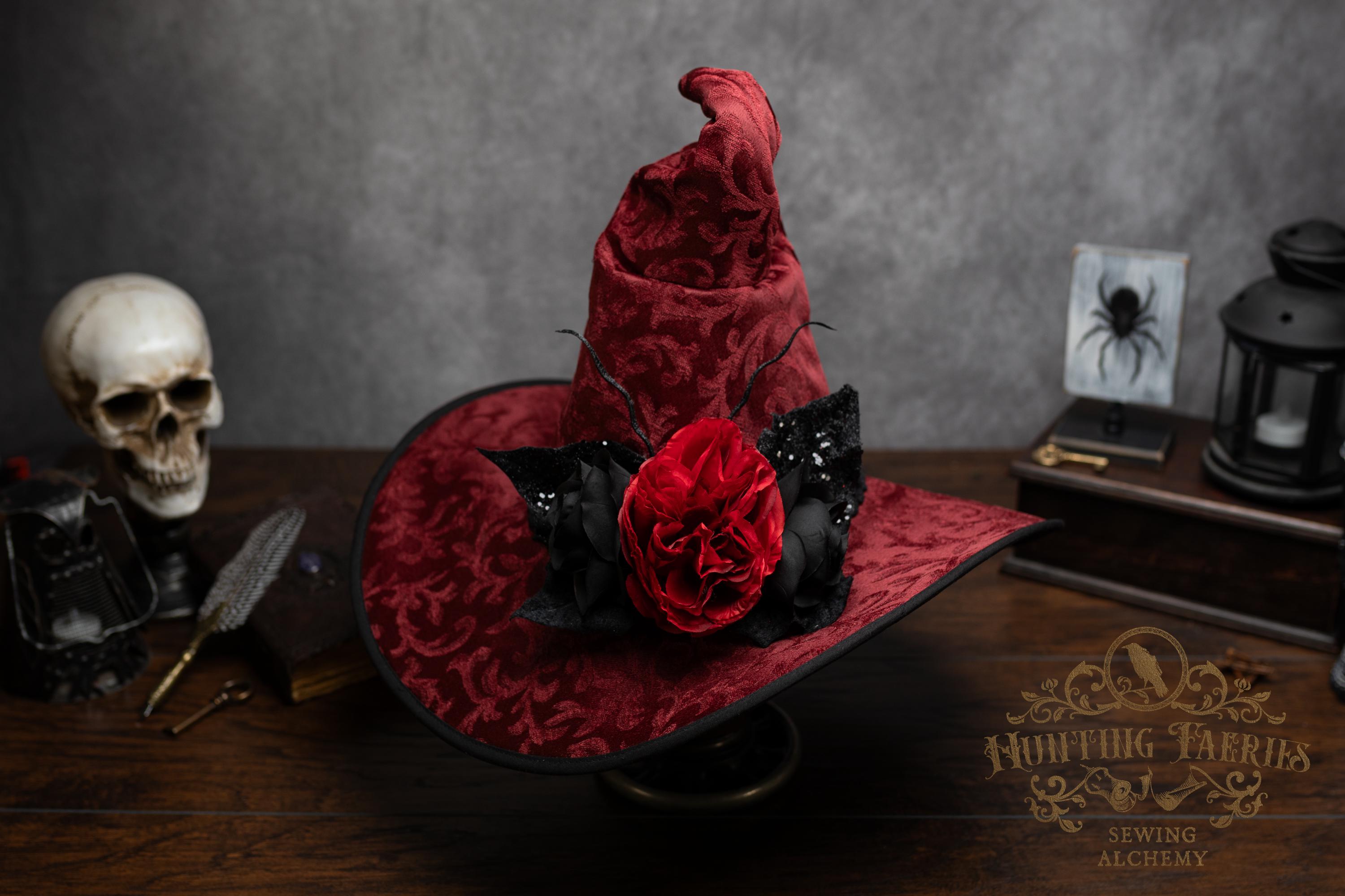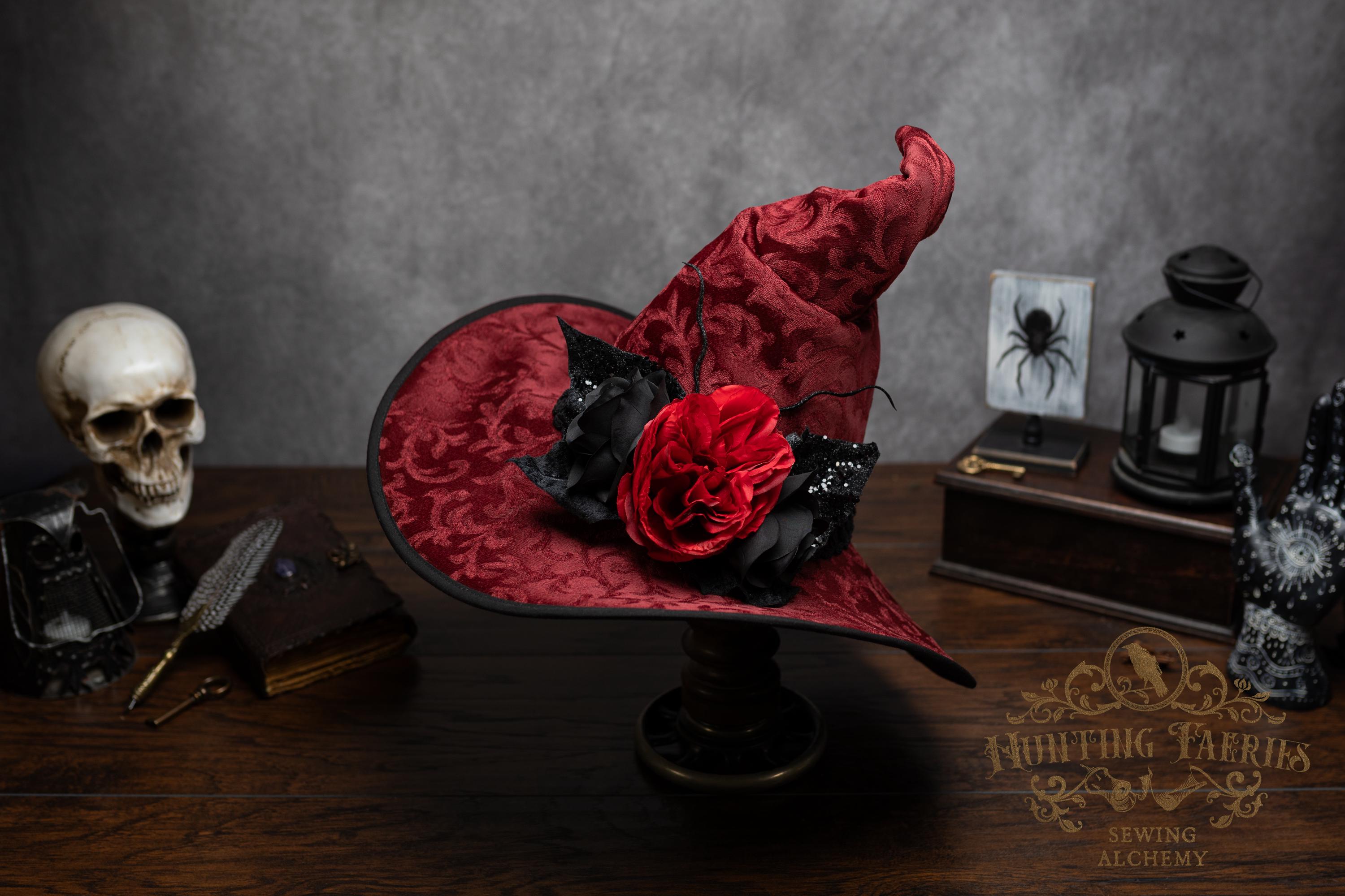 This handcrafted dark red witch hat features a braided band around the cone with an artificial flower accent on the side, which resembles a butterfly with antennae. The latter is attached with a set of pins, allowing you to remove it and decorate yourself if you wish.