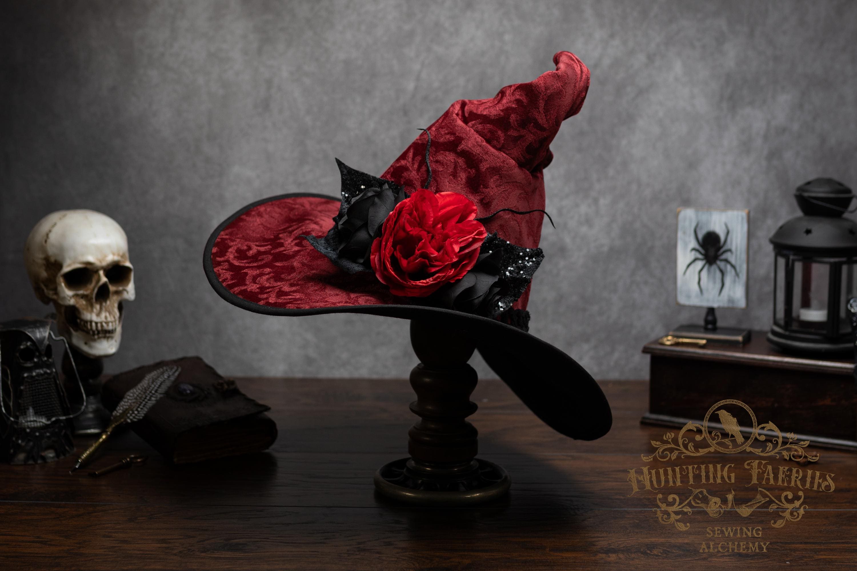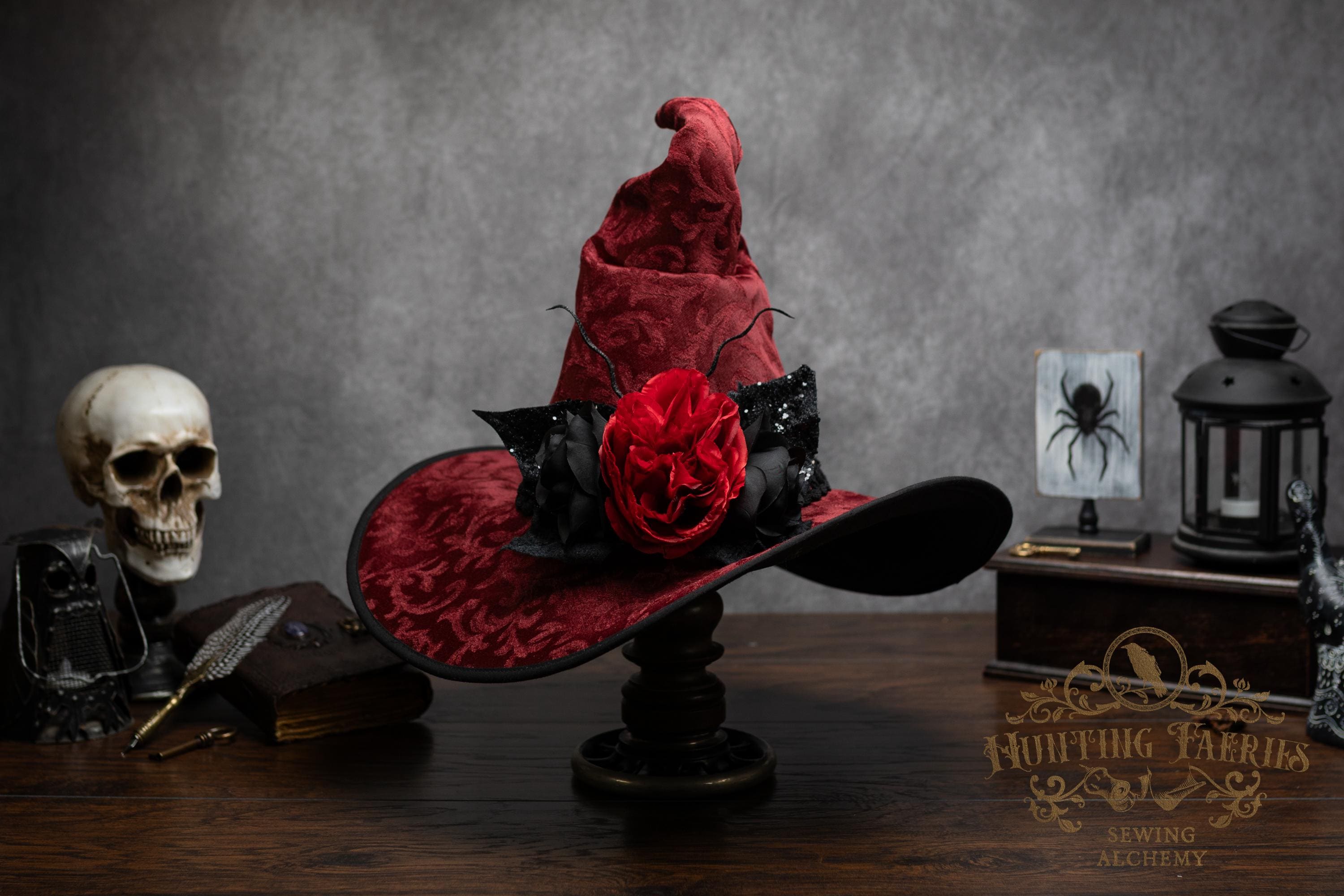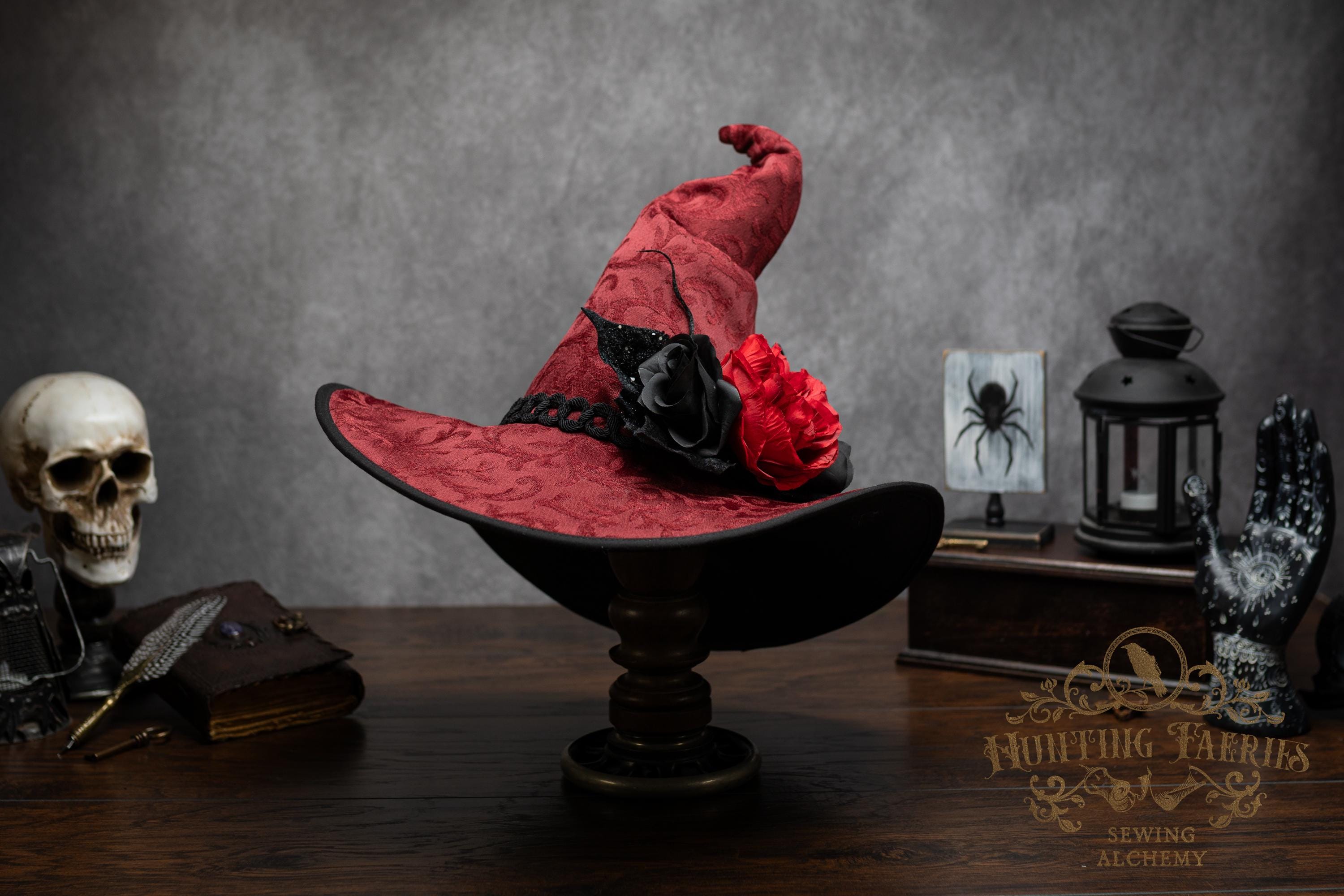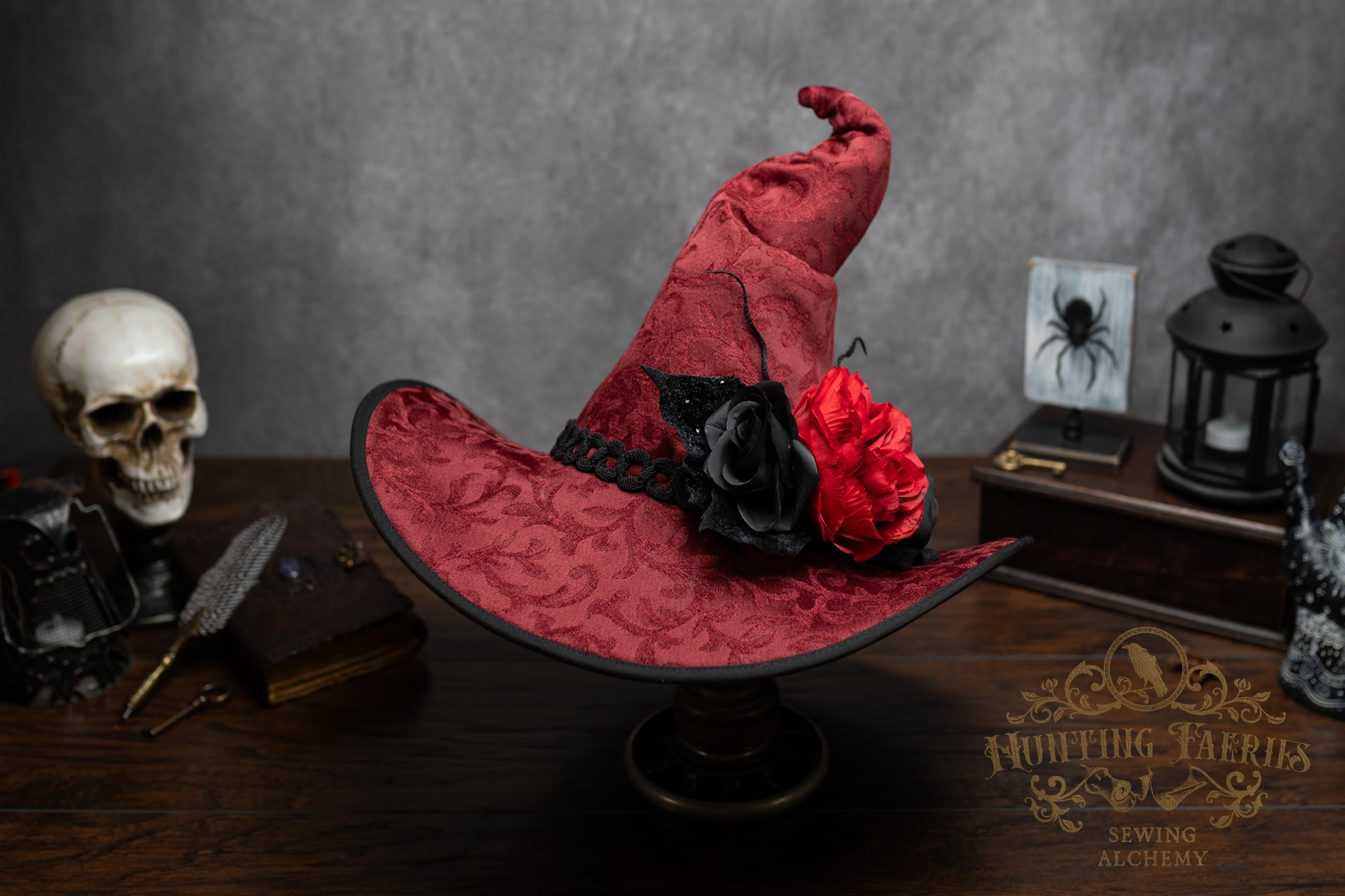 This handcrafted dark red witch hat features a braided band around the cone with an artificial flower accent on the side, which resembles a butterfly with antennae. The latter is attached with a set of pins, allowing you to remove it and decorate yourself if you wish.