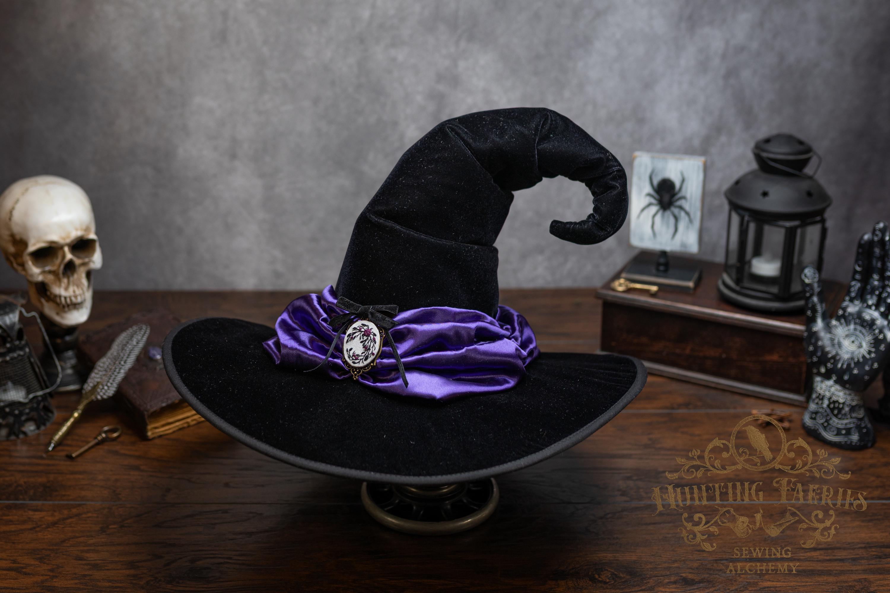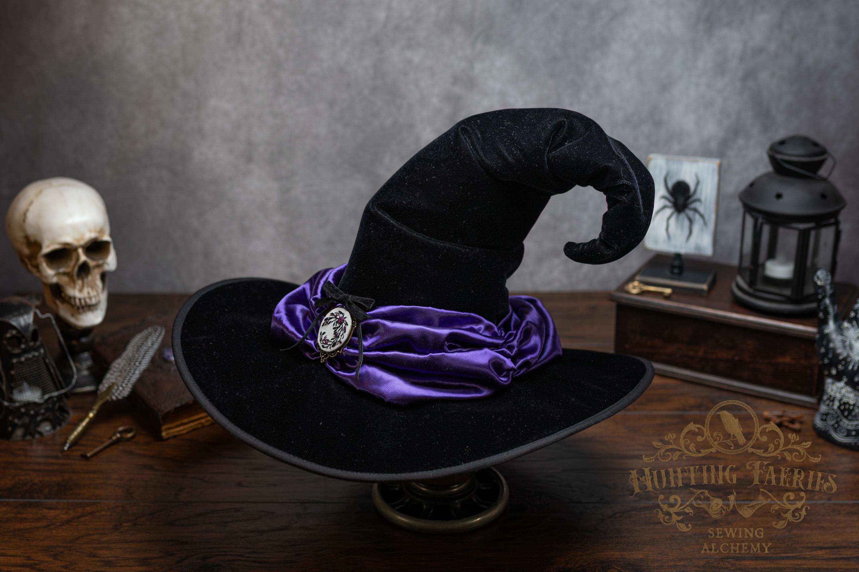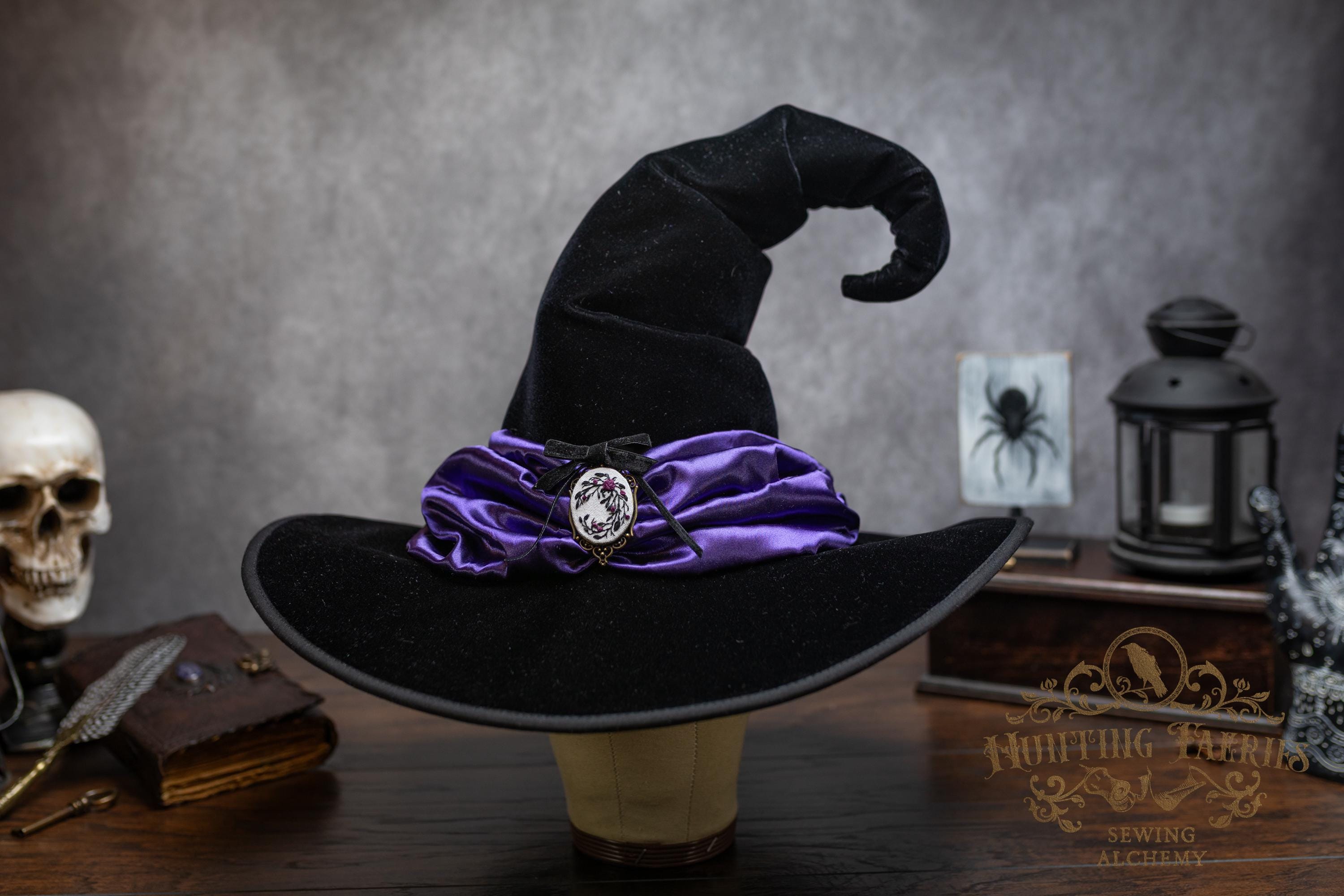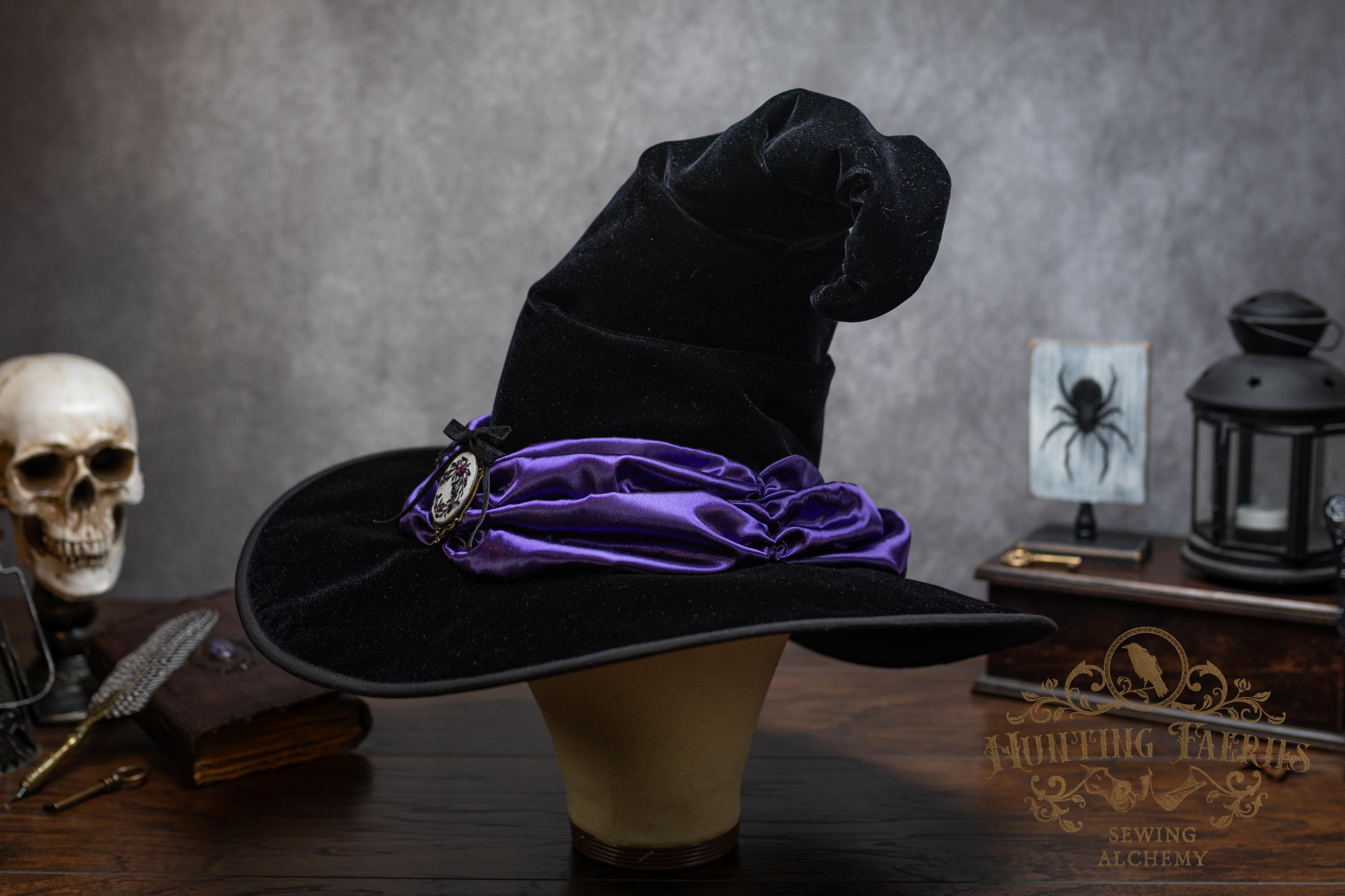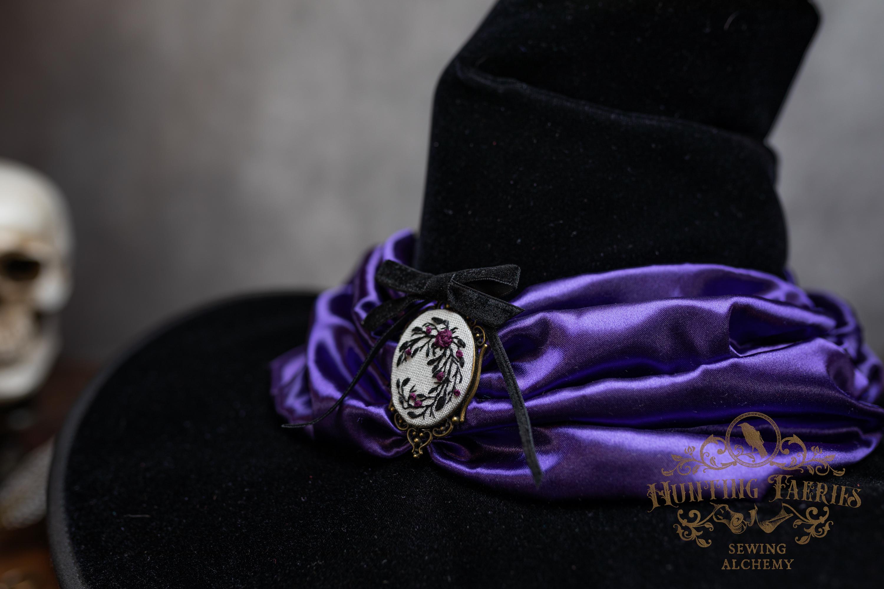 This handcrafted black velvet witch hat features a purple satin scarf around the cone with a hand-embroidered brooch at the front. The latter is attached via a pin, allowing you to take it off and decorate yourself if you wish.