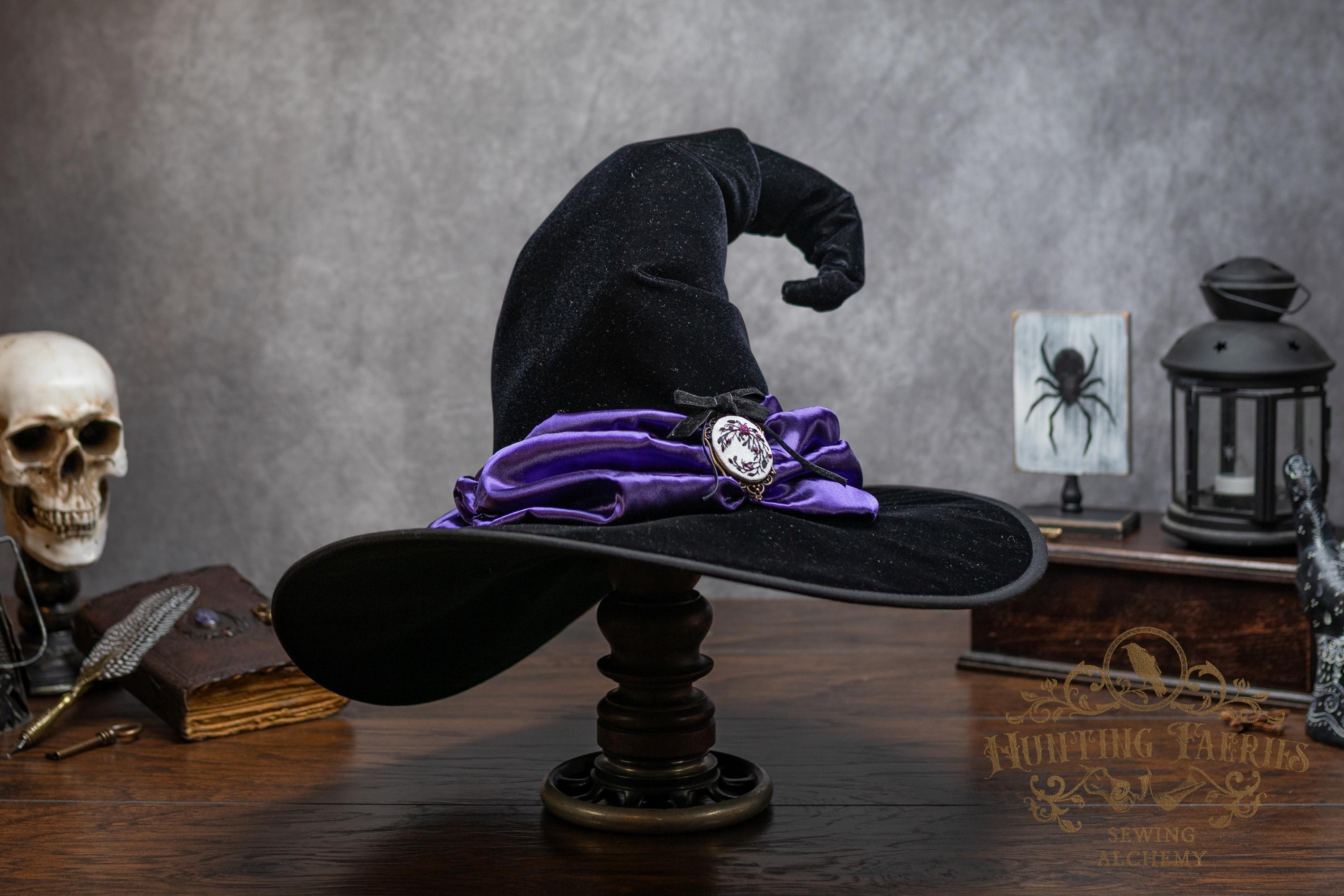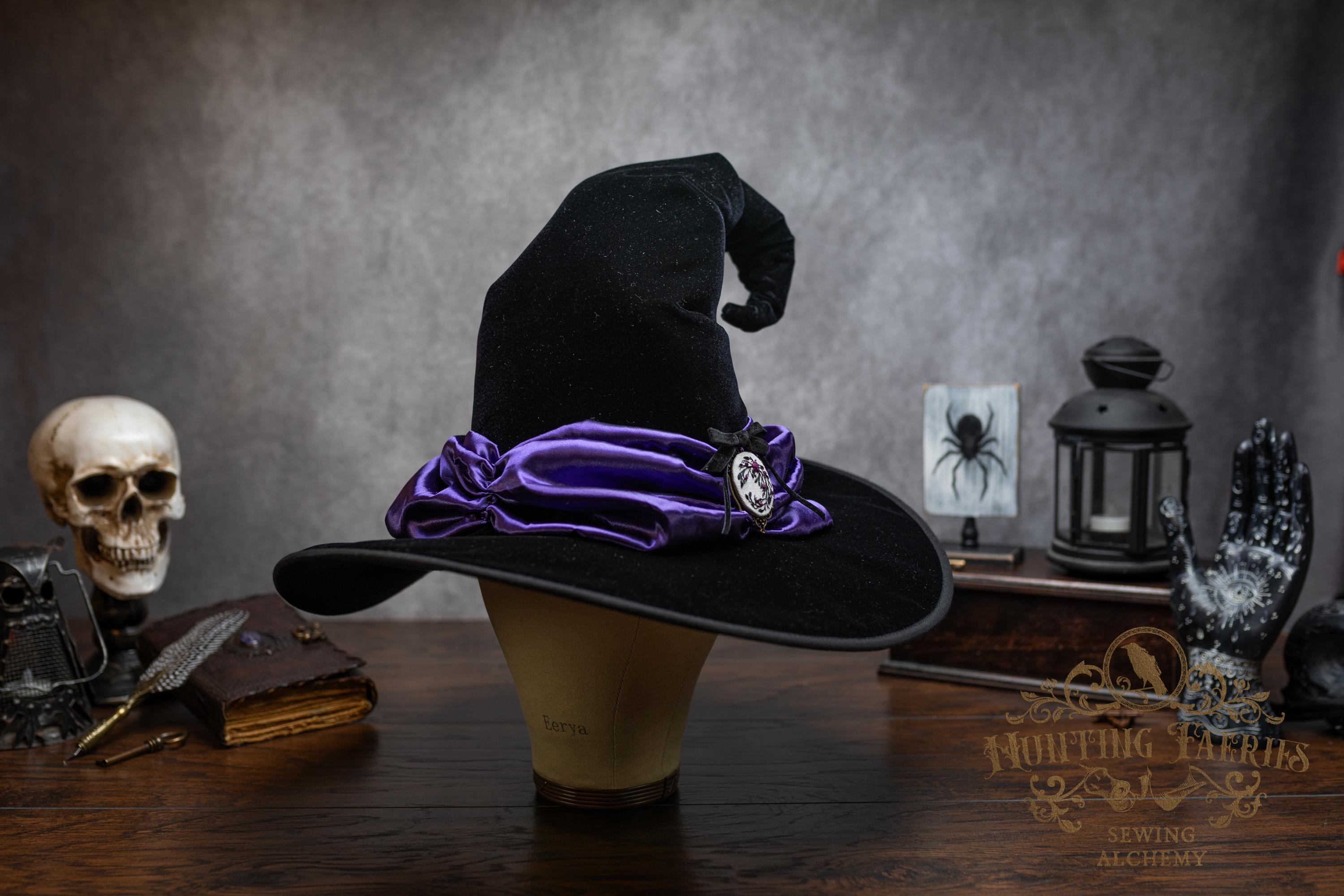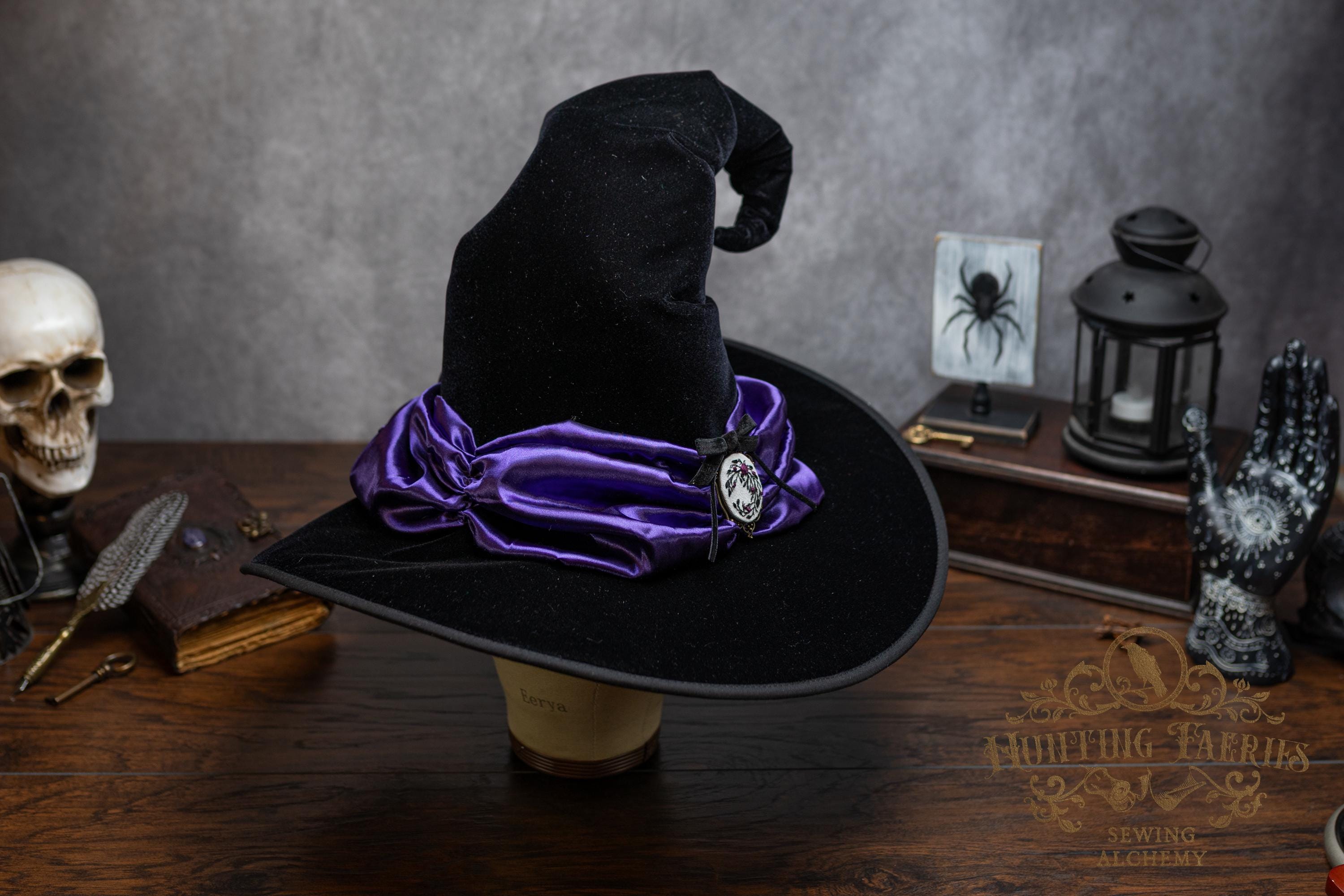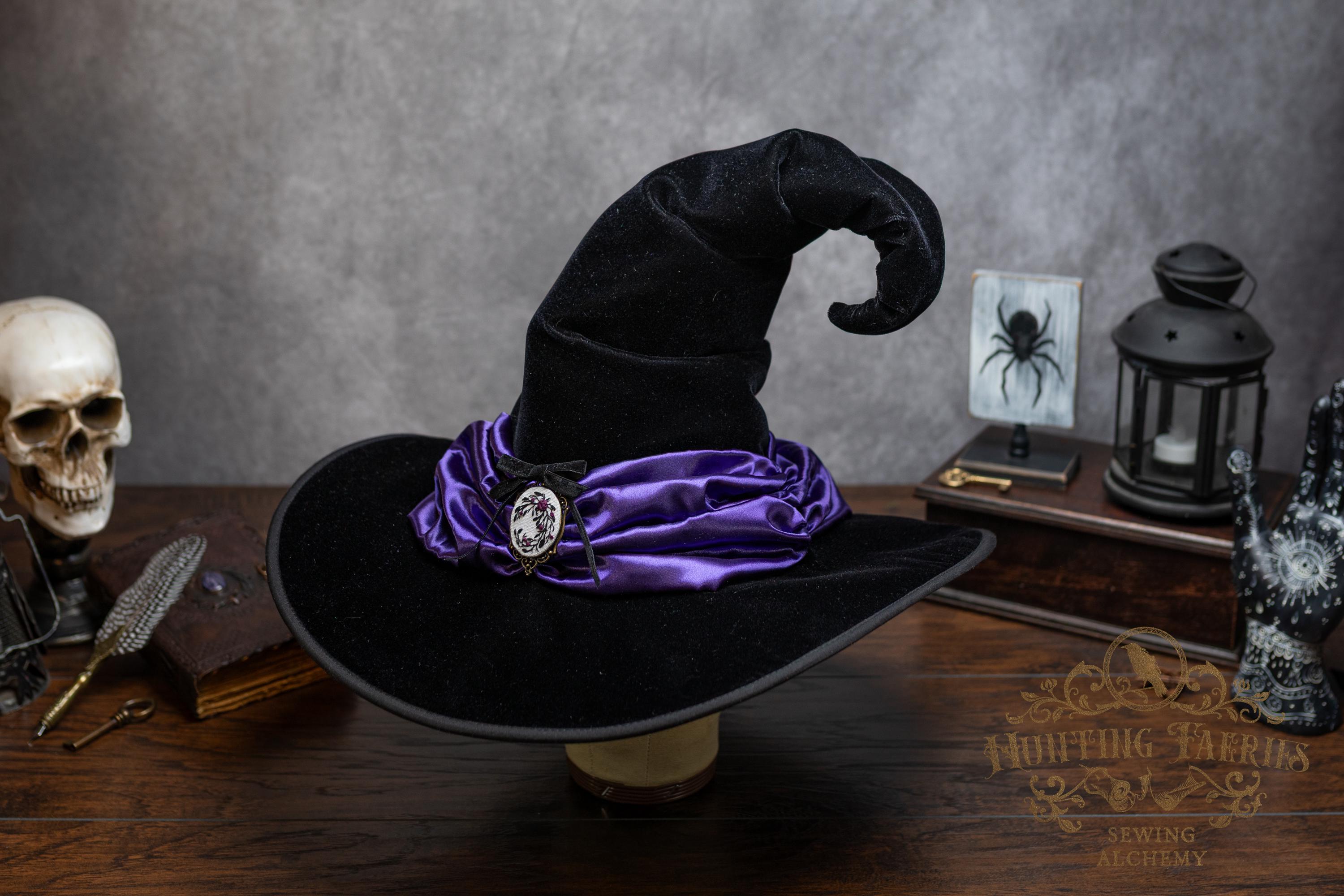 This handcrafted black velvet witch hat features a purple satin scarf around the cone with a hand-embroidered brooch at the front. The latter is attached via a pin, allowing you to take it off and decorate yourself if you wish.