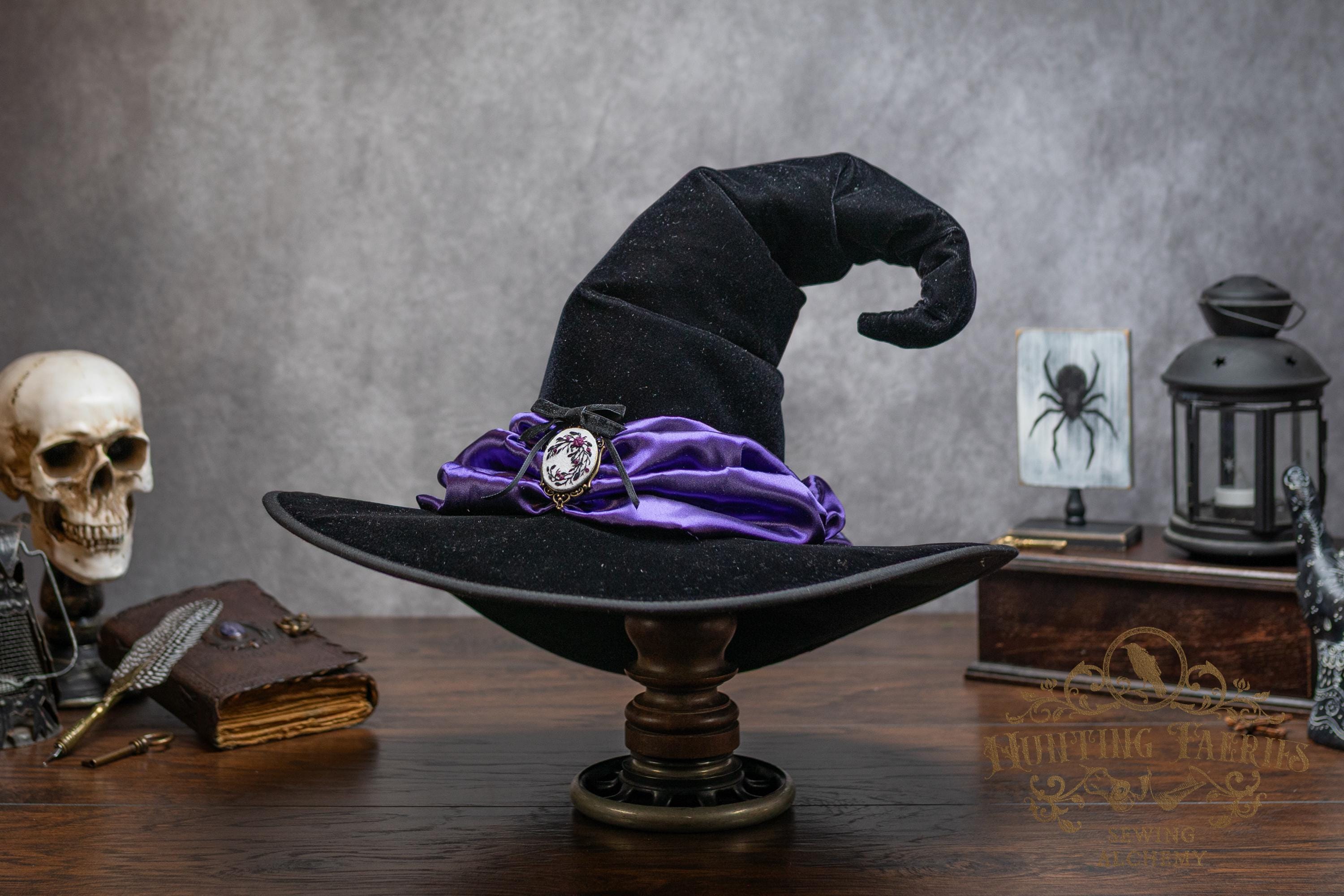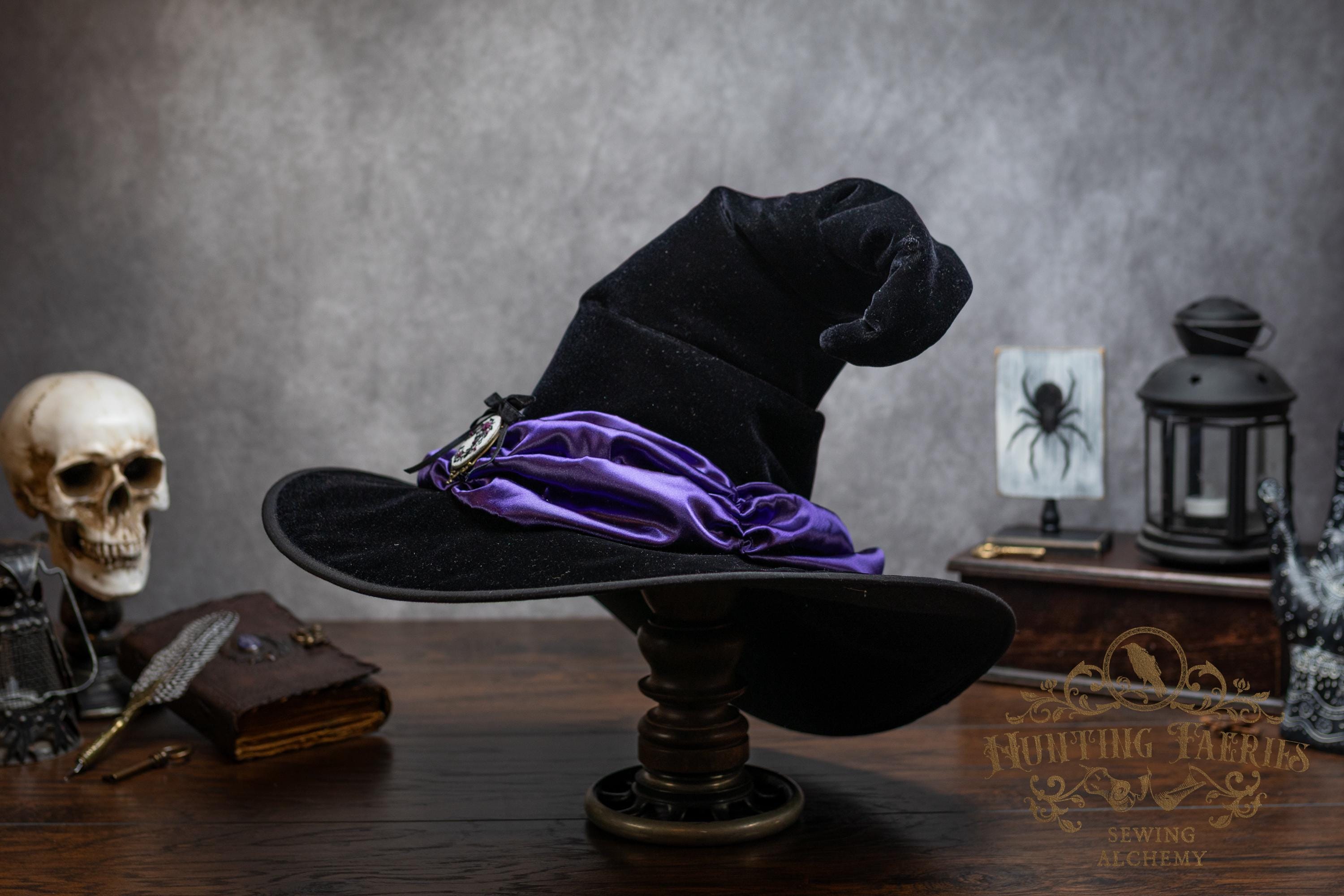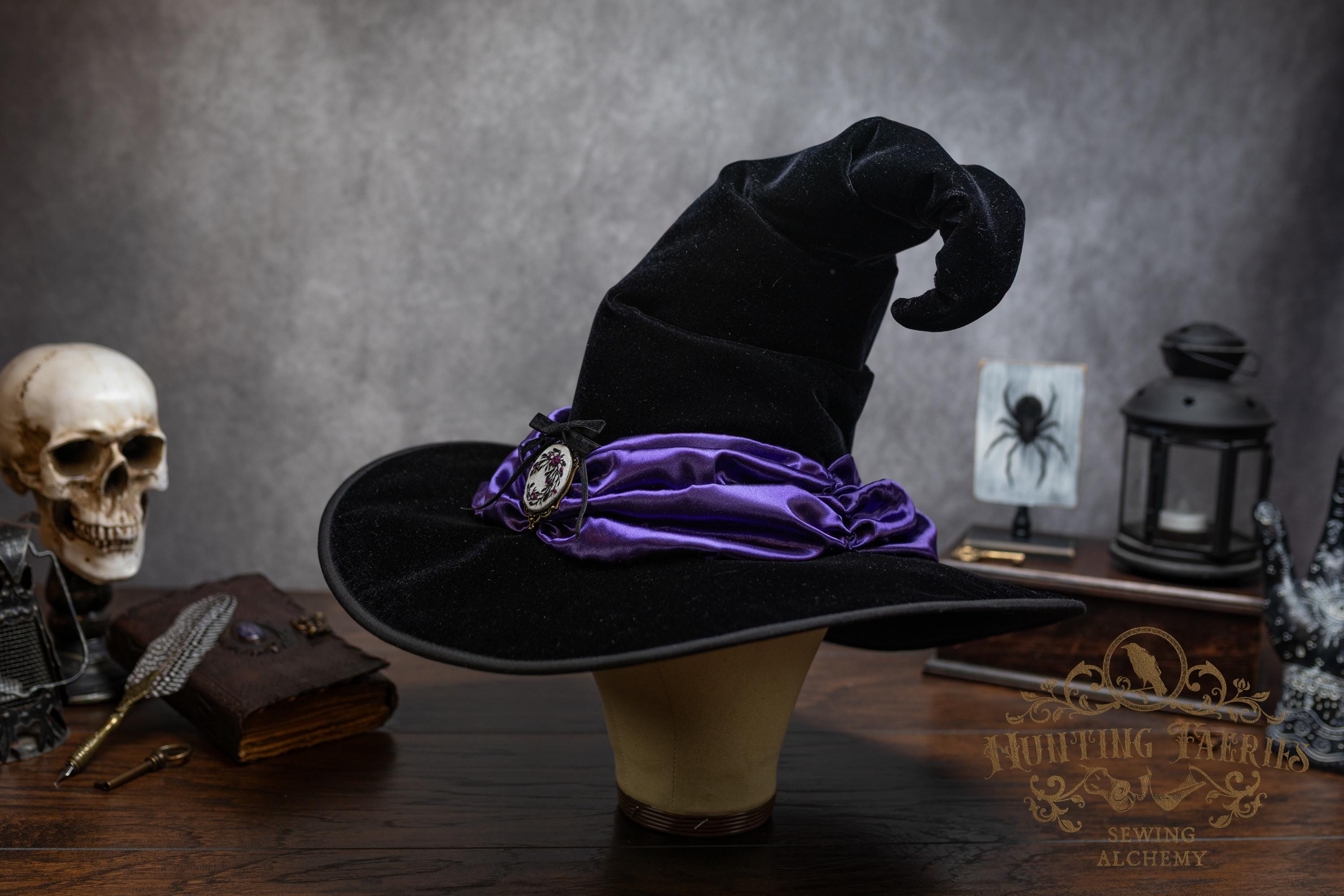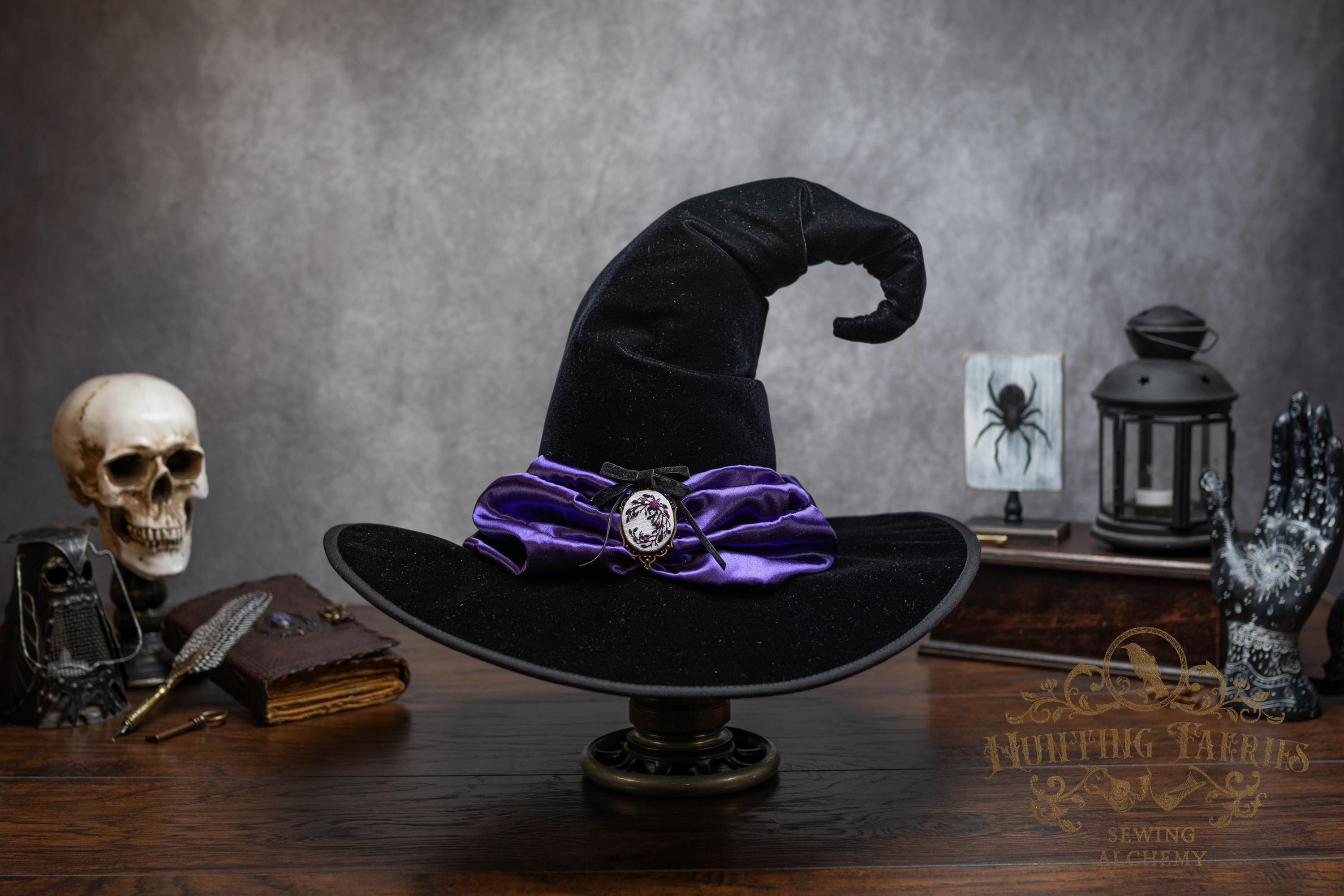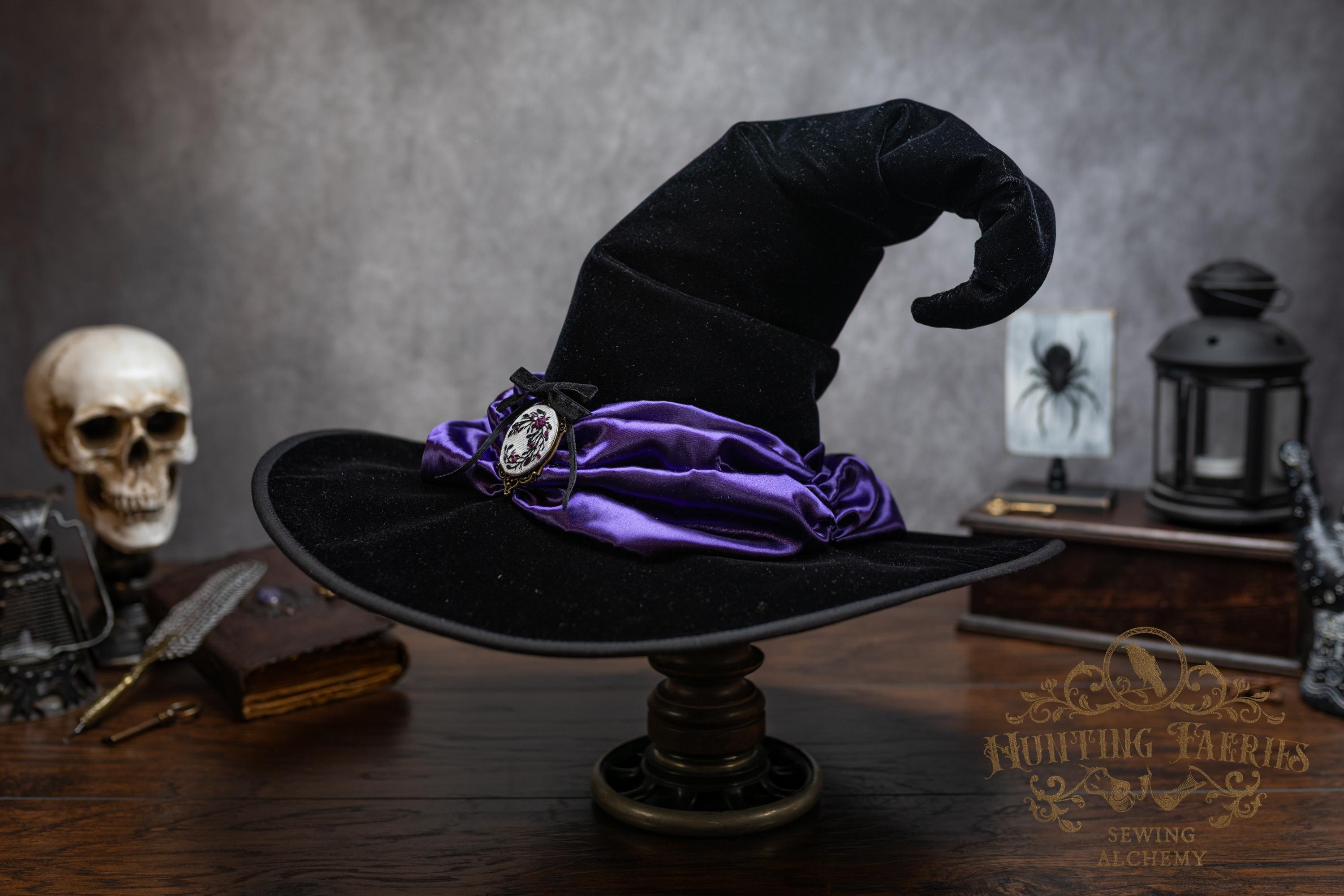 This handcrafted black velvet witch hat features a purple satin scarf around the cone with a hand-embroidered brooch at the front. The latter is attached via a pin, allowing you to take it off and decorate yourself if you wish.