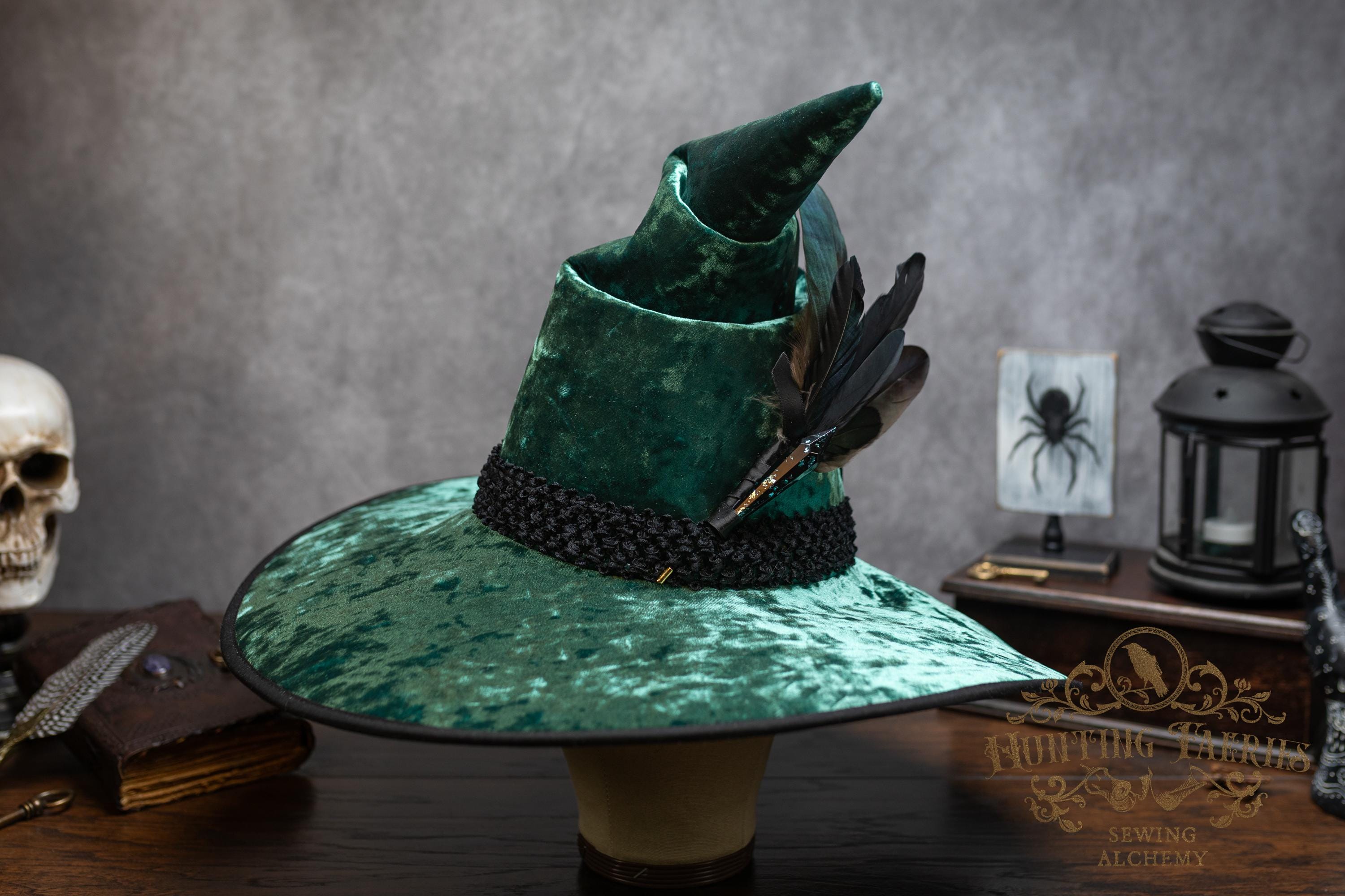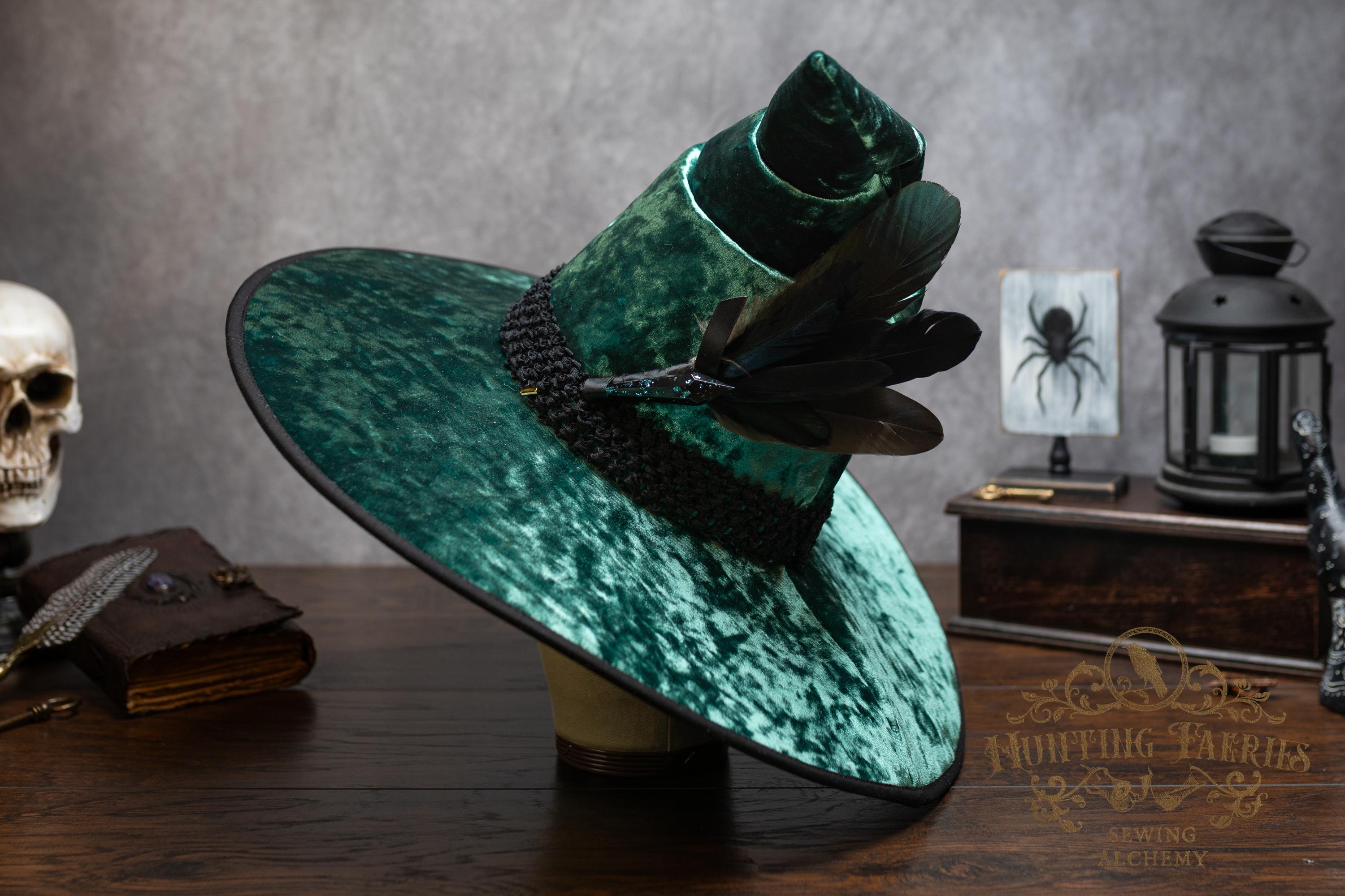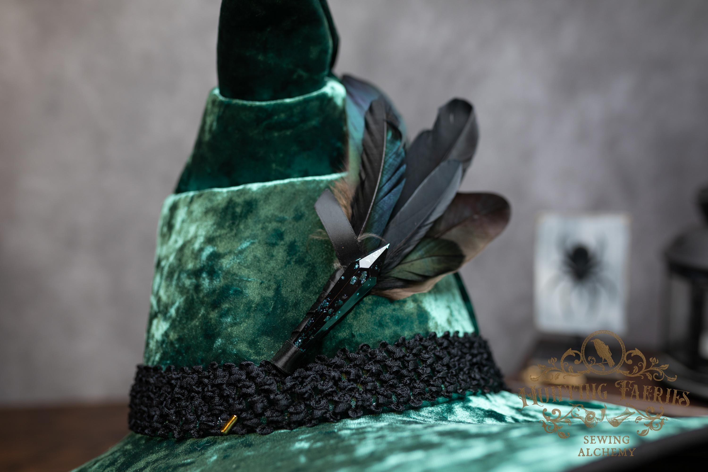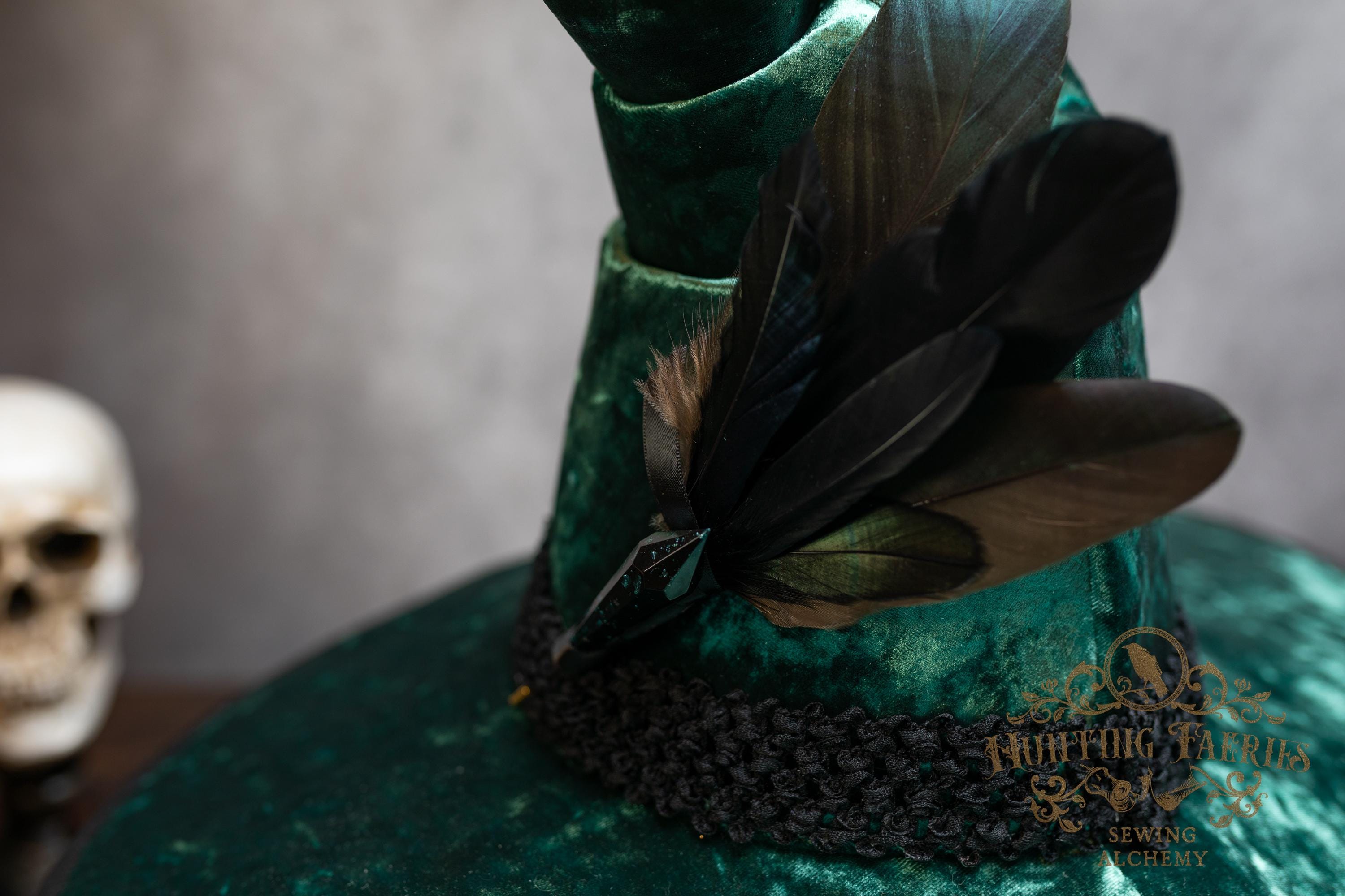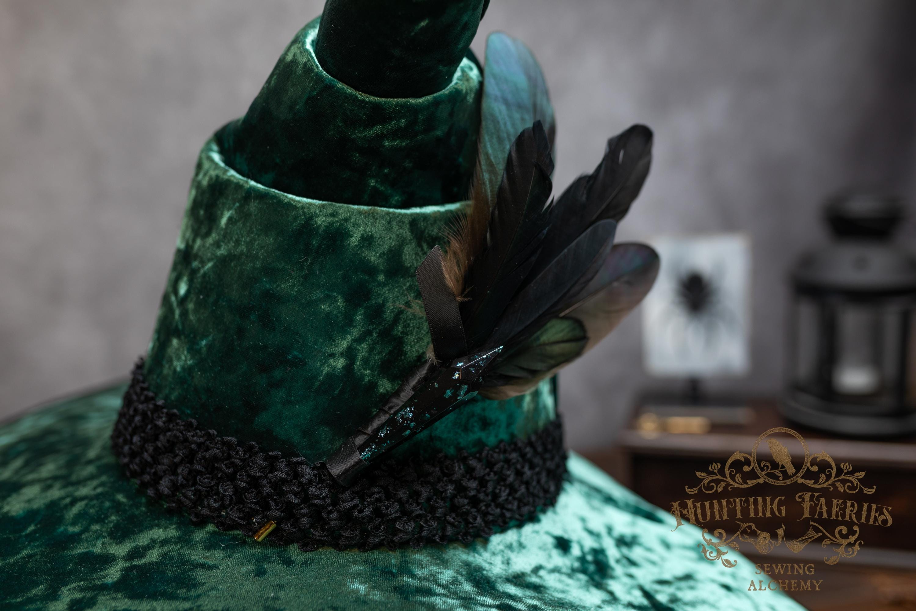 This handcrafted emerald green, crushed velvet witch hat features a black woven band. At the side is a faux crystal and feather pin, which can be removed if you want to decorate it yourself.