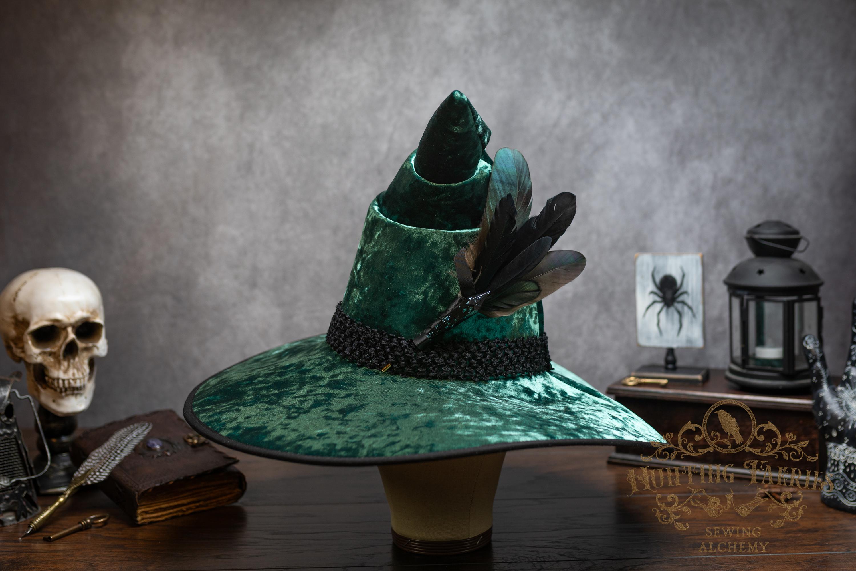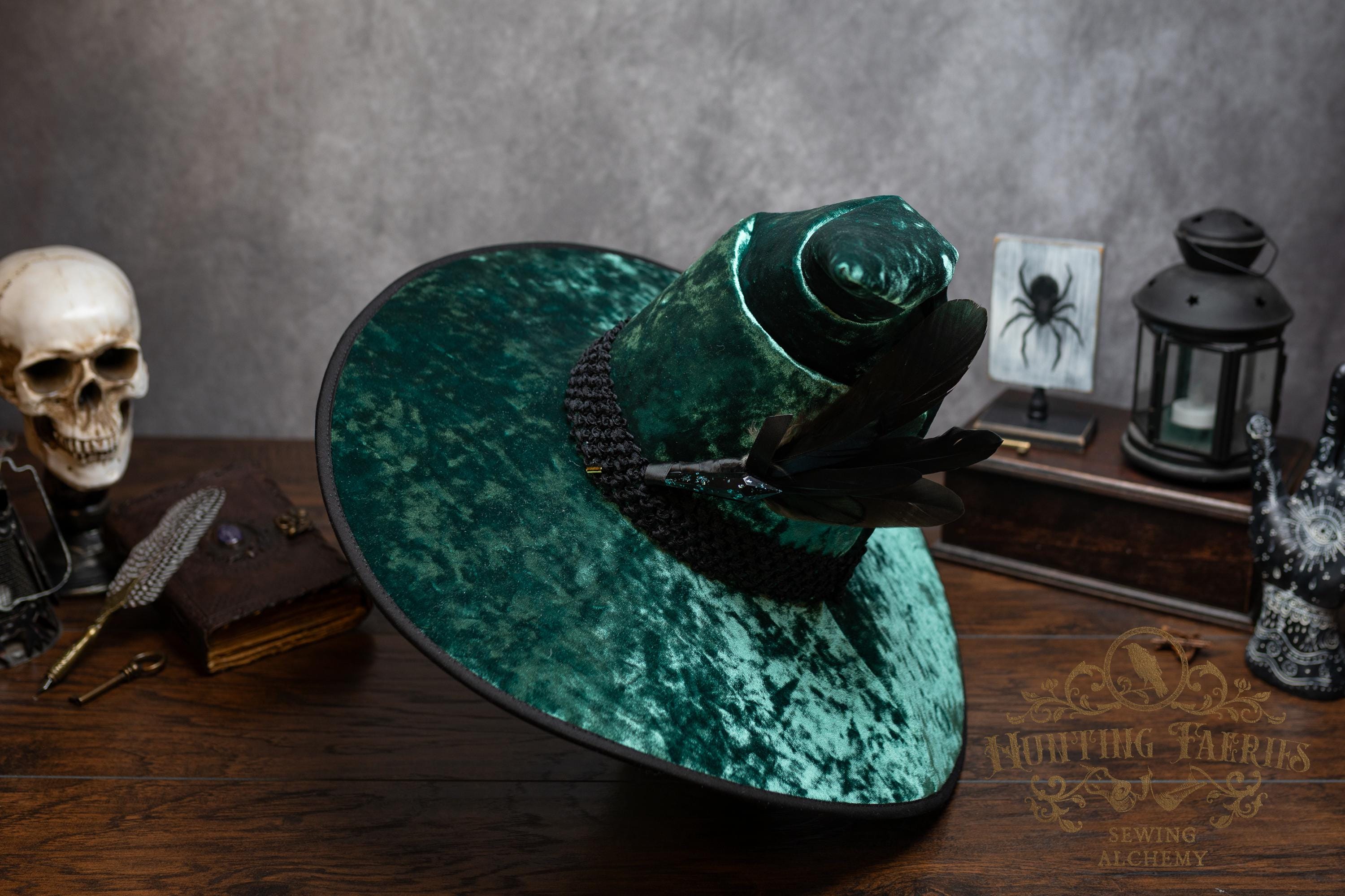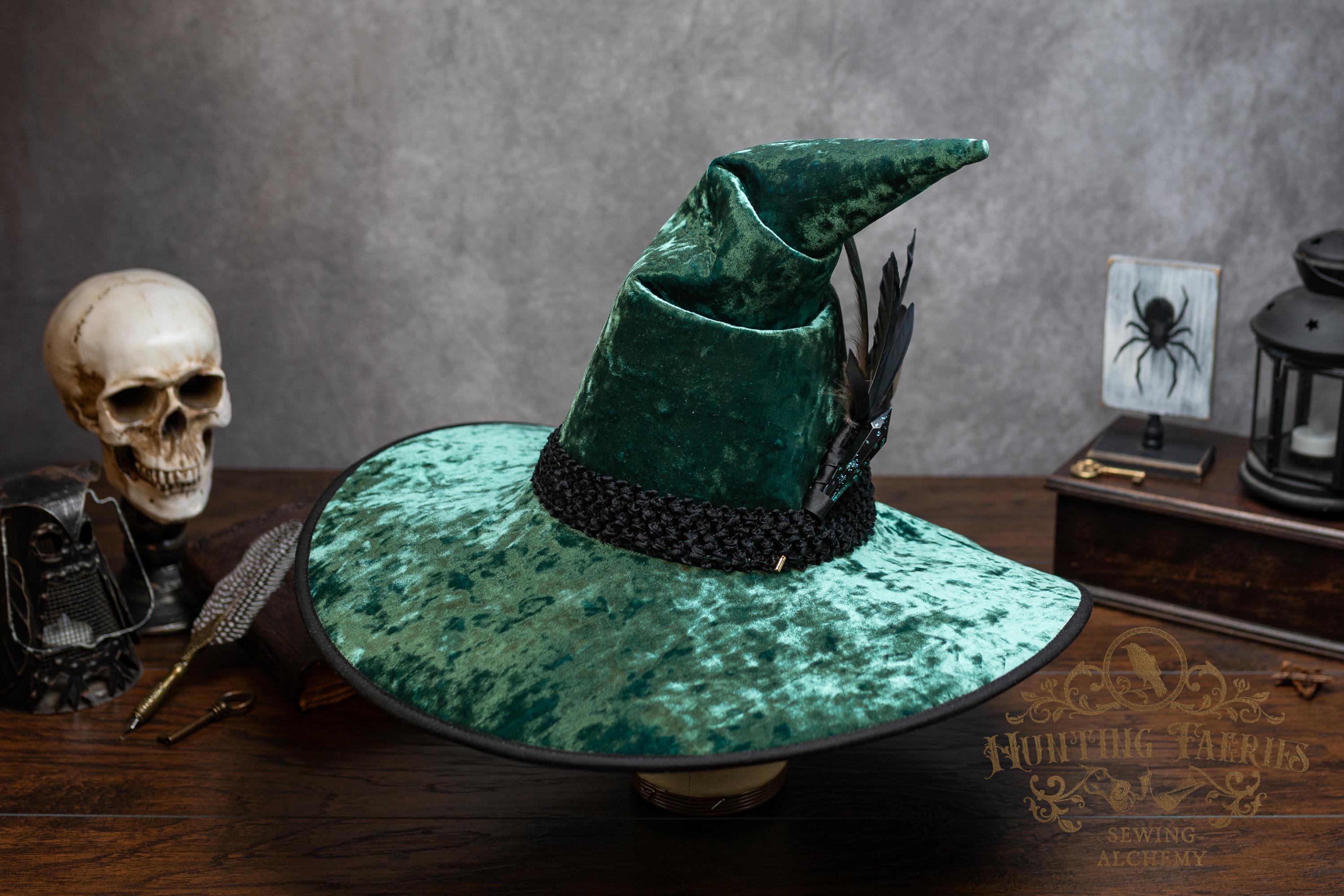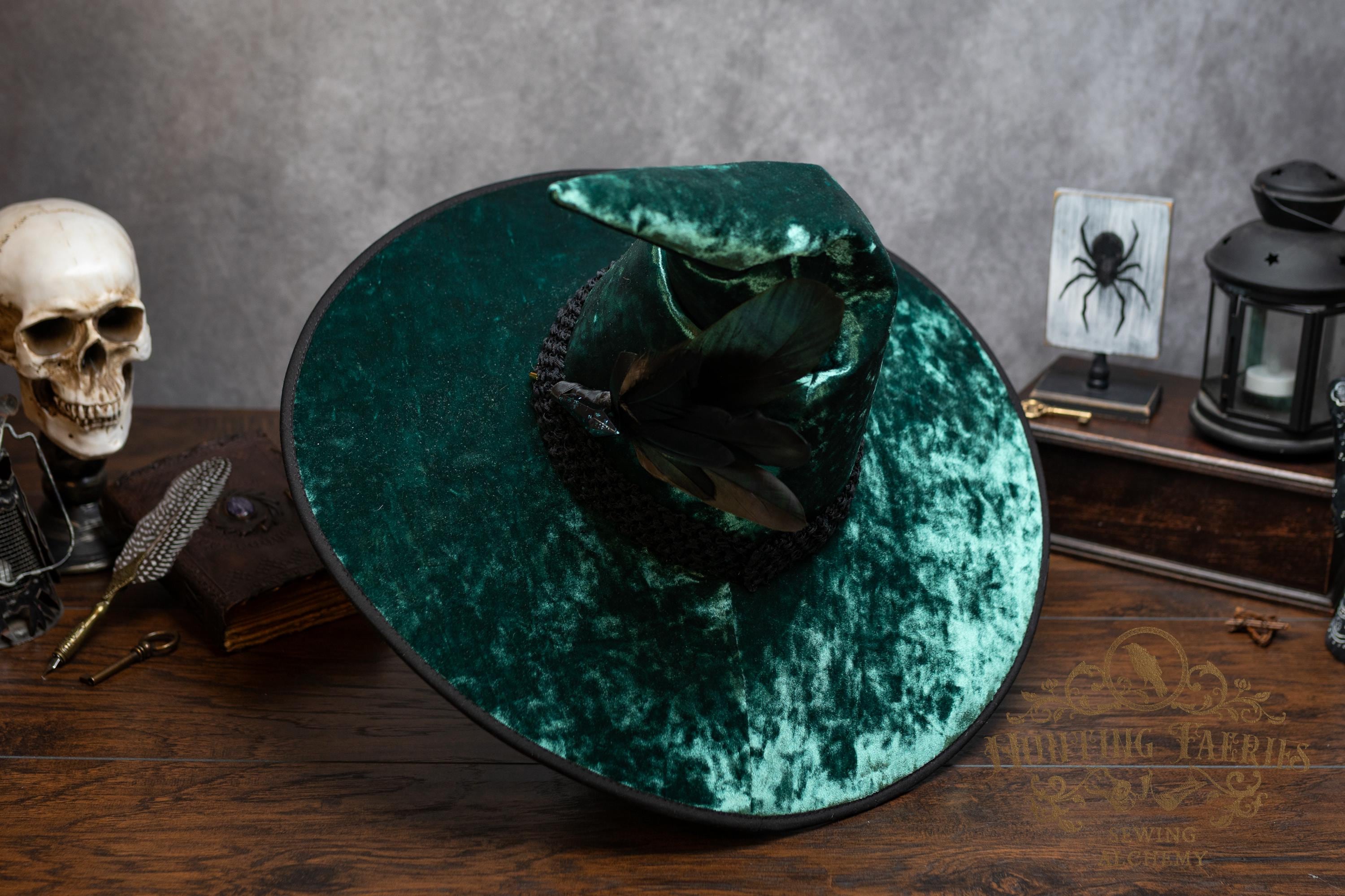 This handcrafted emerald green, crushed velvet witch hat features a black woven band. At the side is a faux crystal and feather pin, which can be removed if you want to decorate it yourself.
