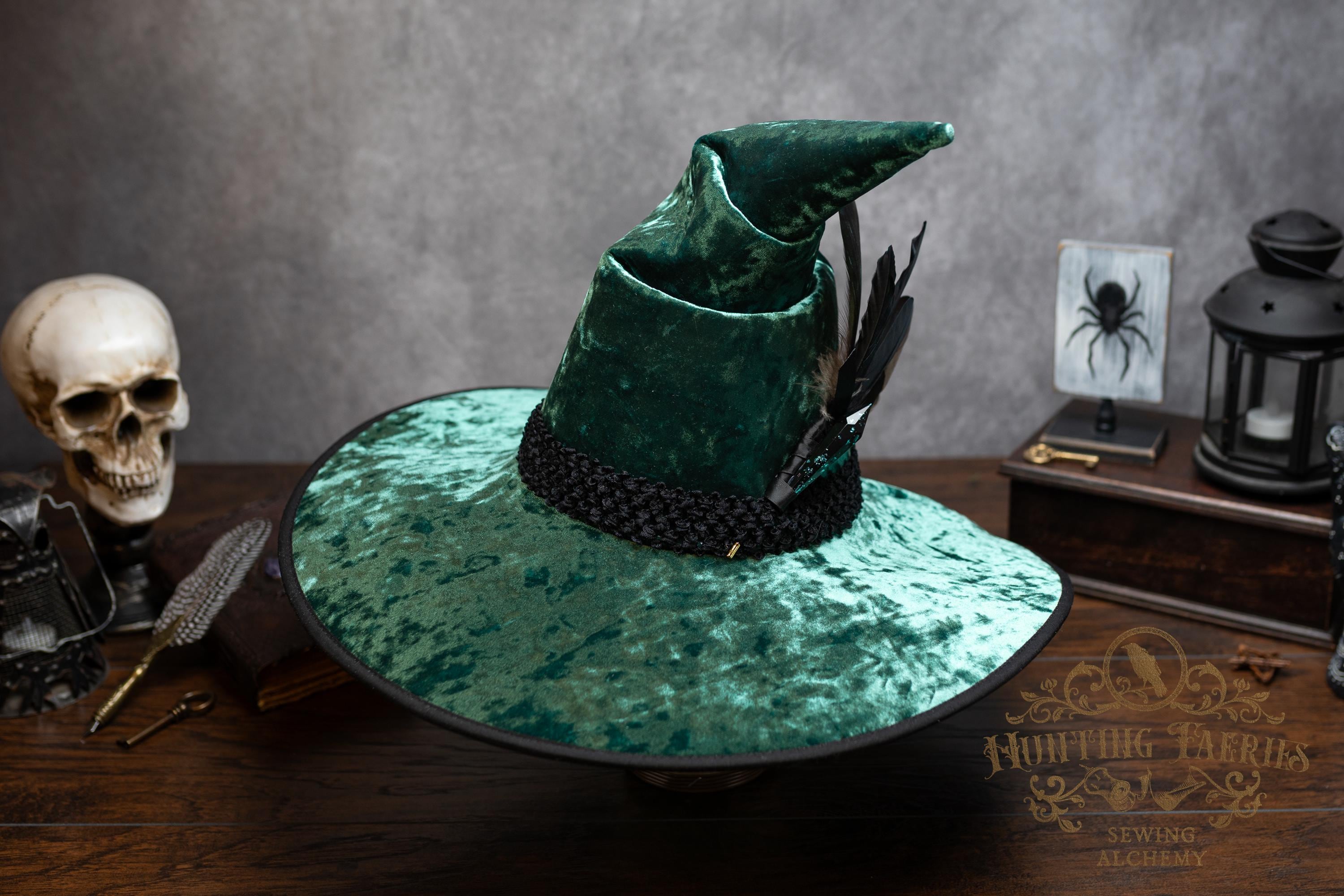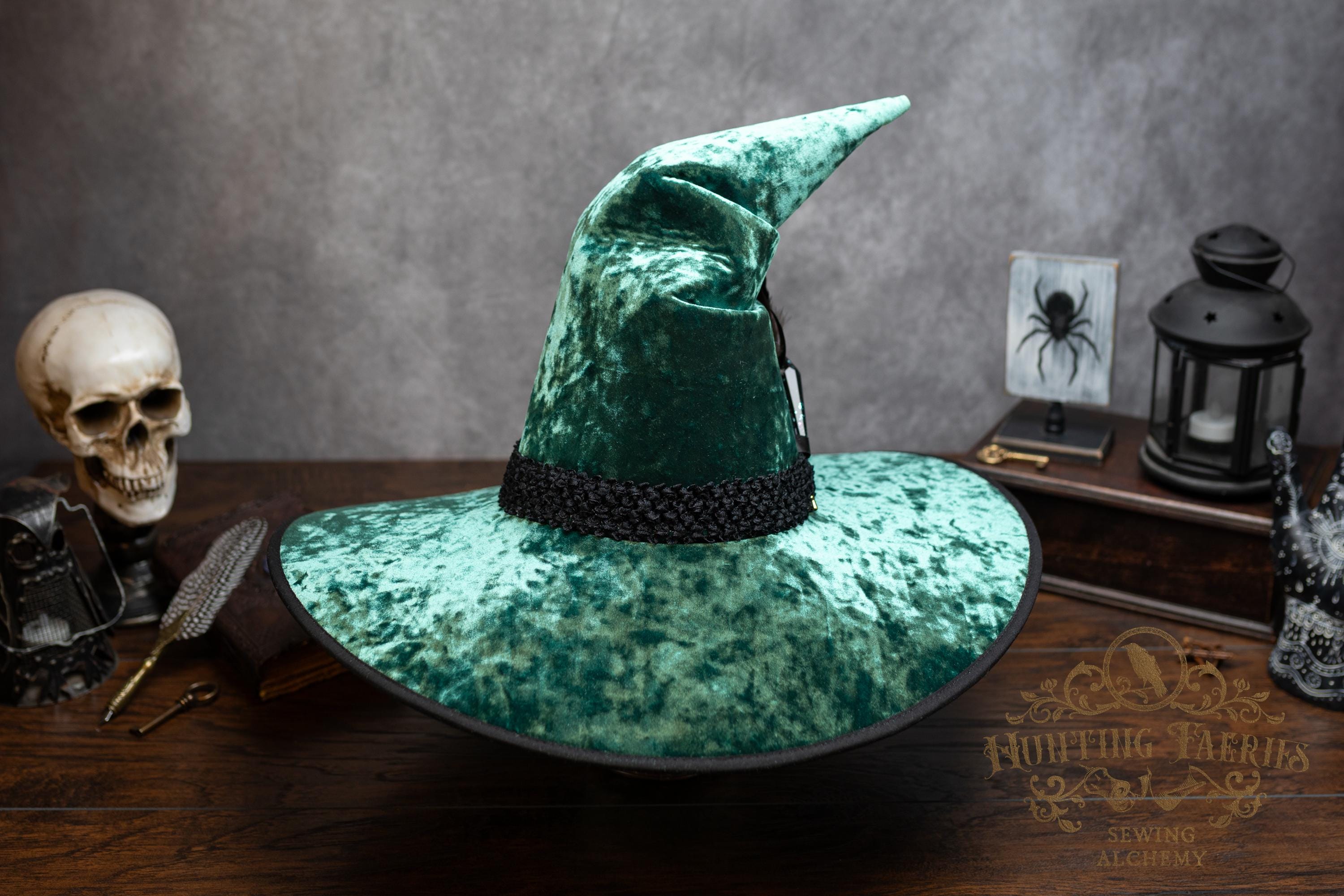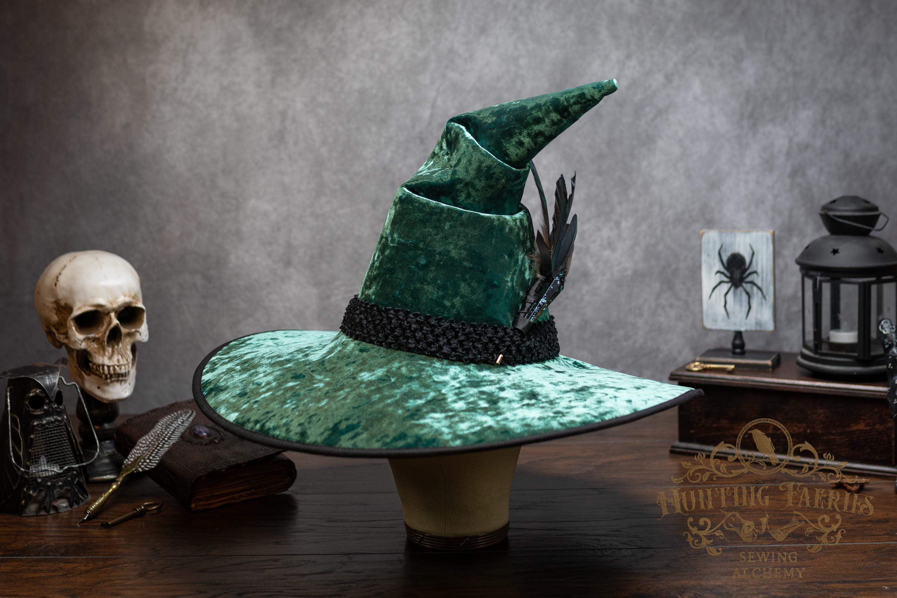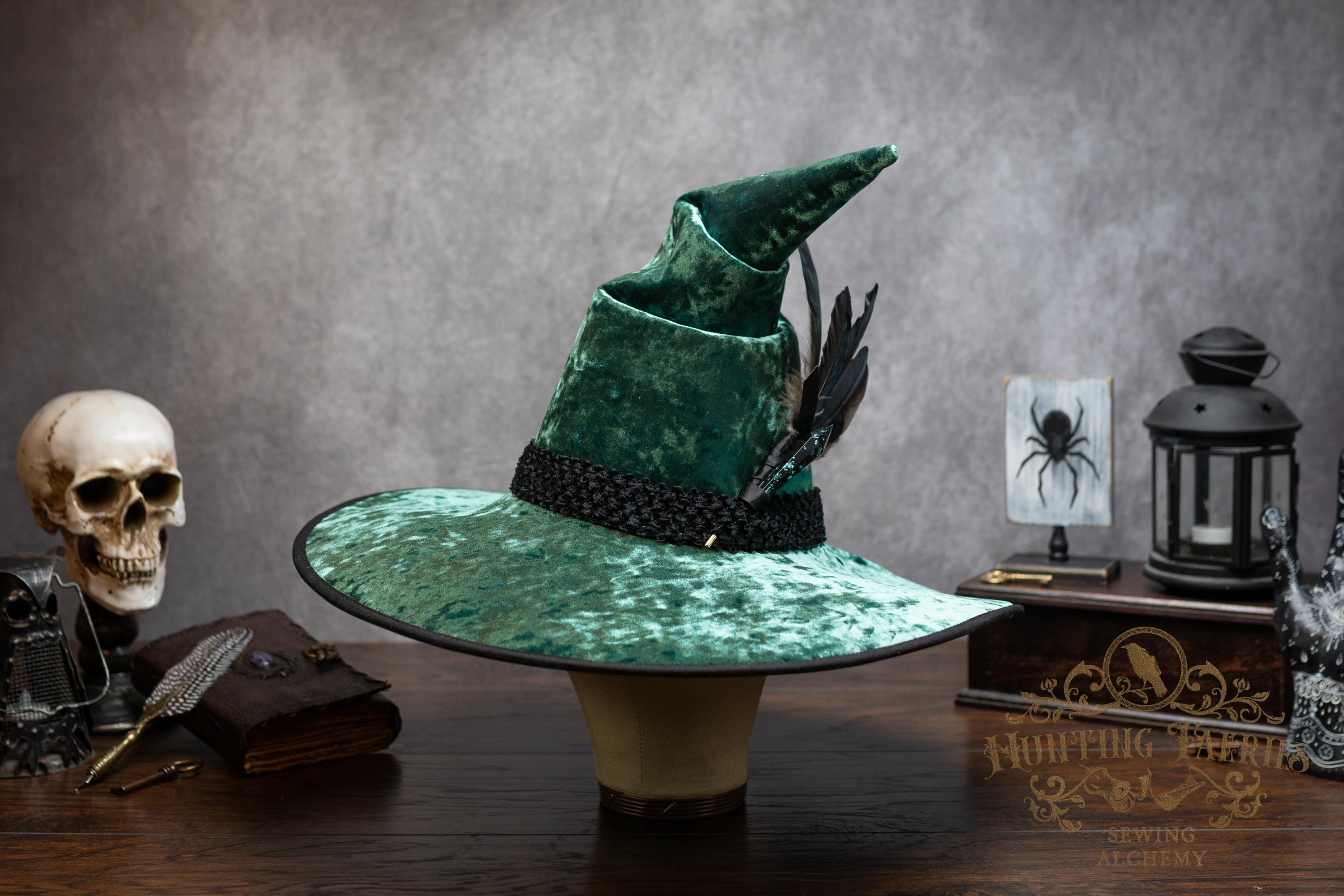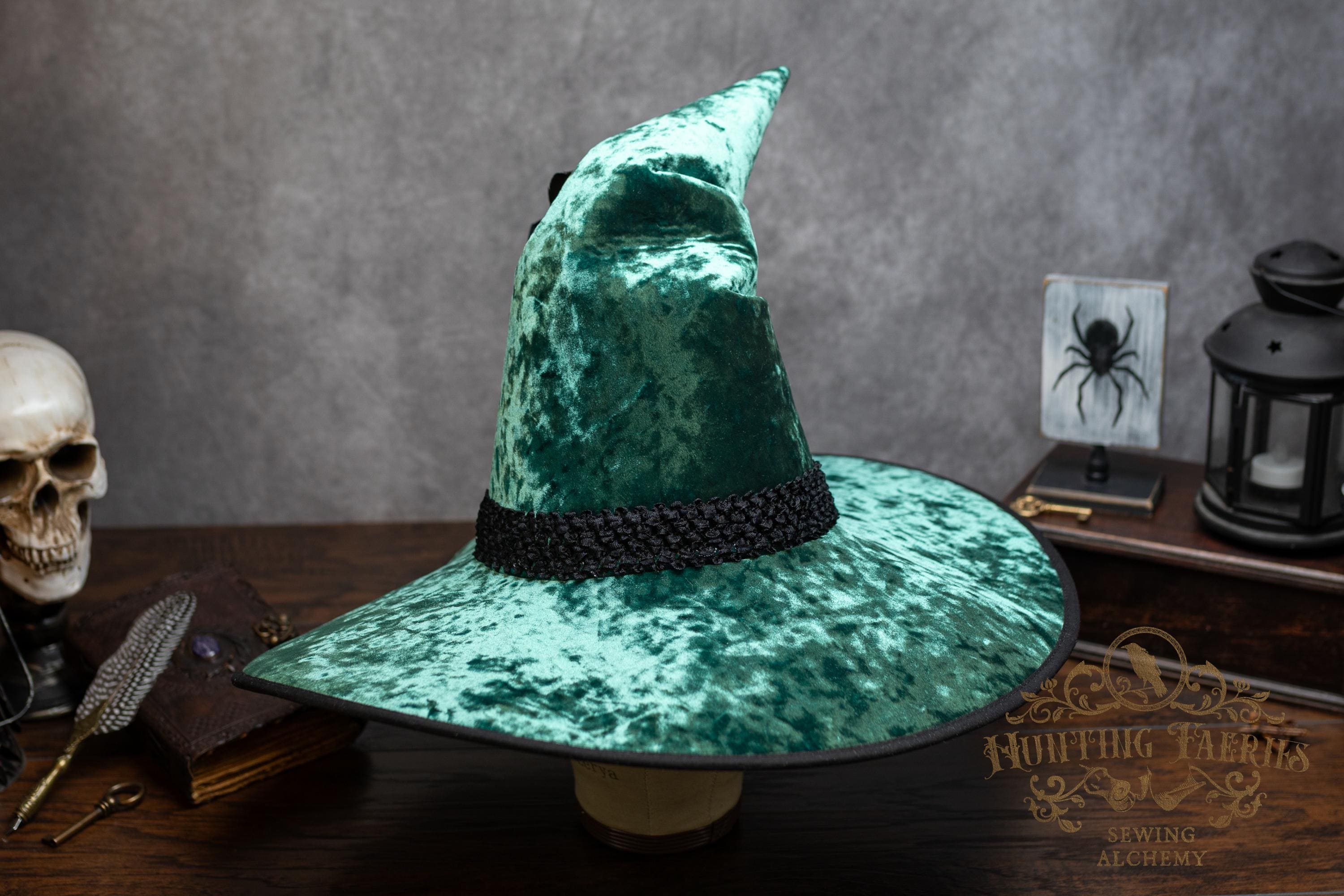 This handcrafted emerald green, crushed velvet witch hat features a black woven band. At the side is a faux crystal and feather pin, which can be removed if you want to decorate it yourself.
