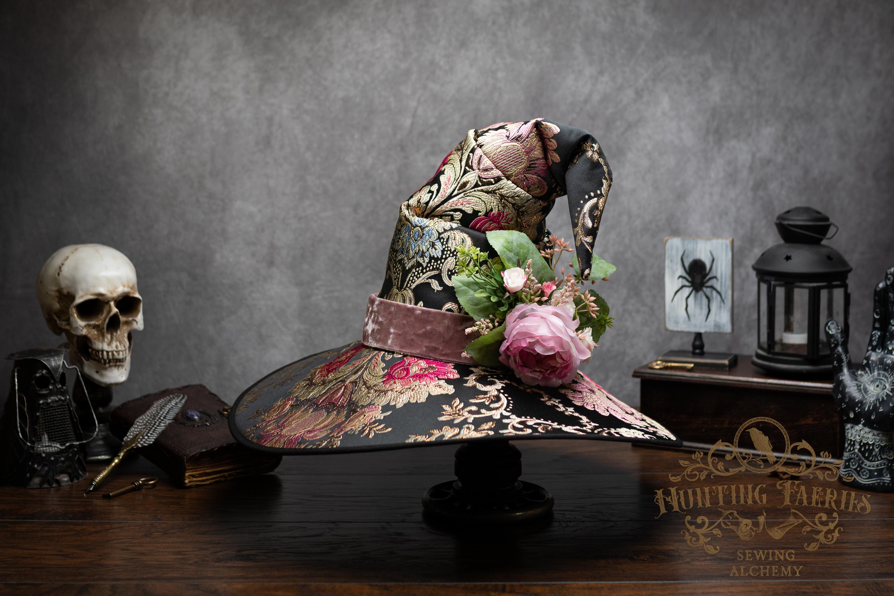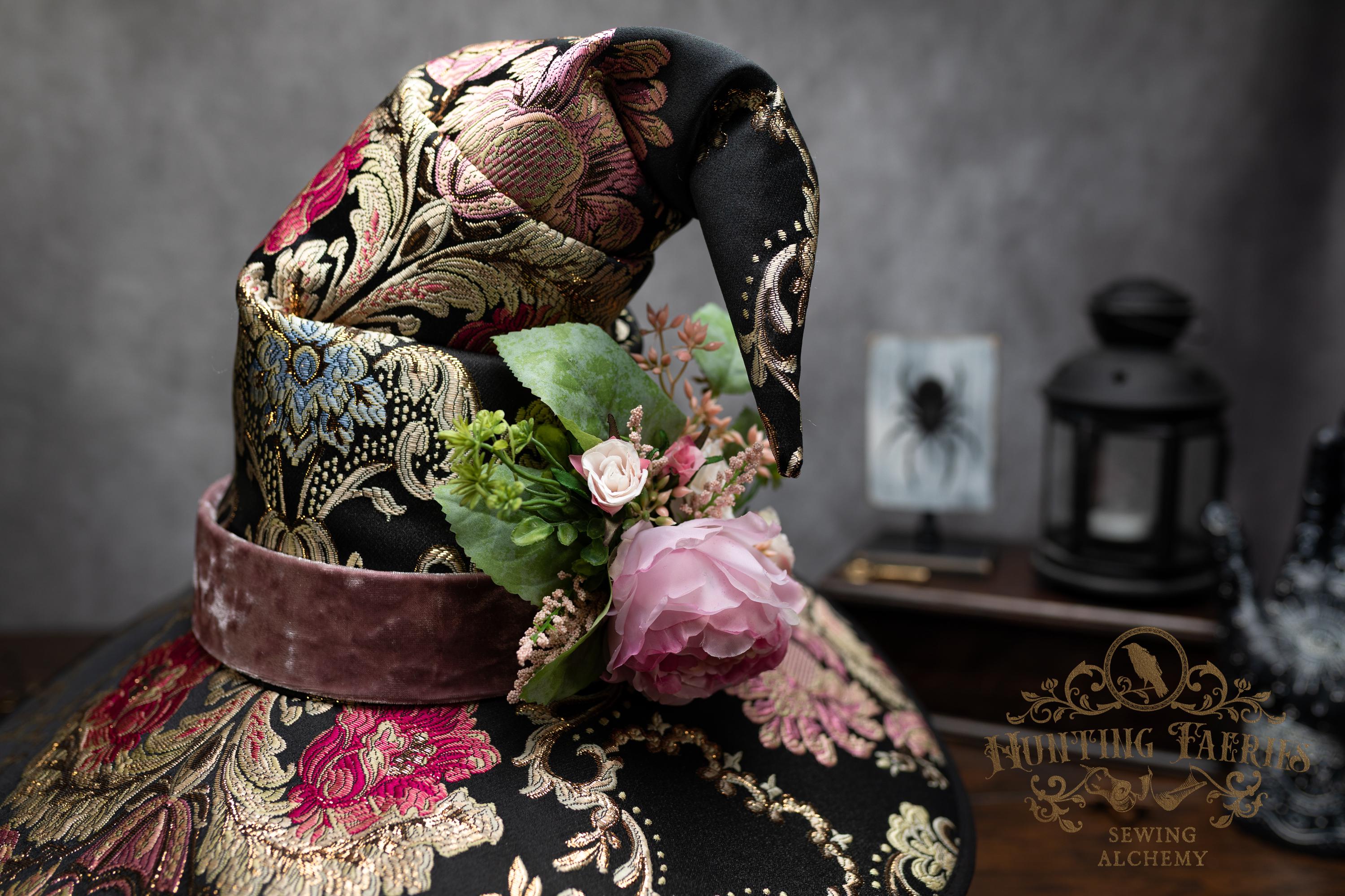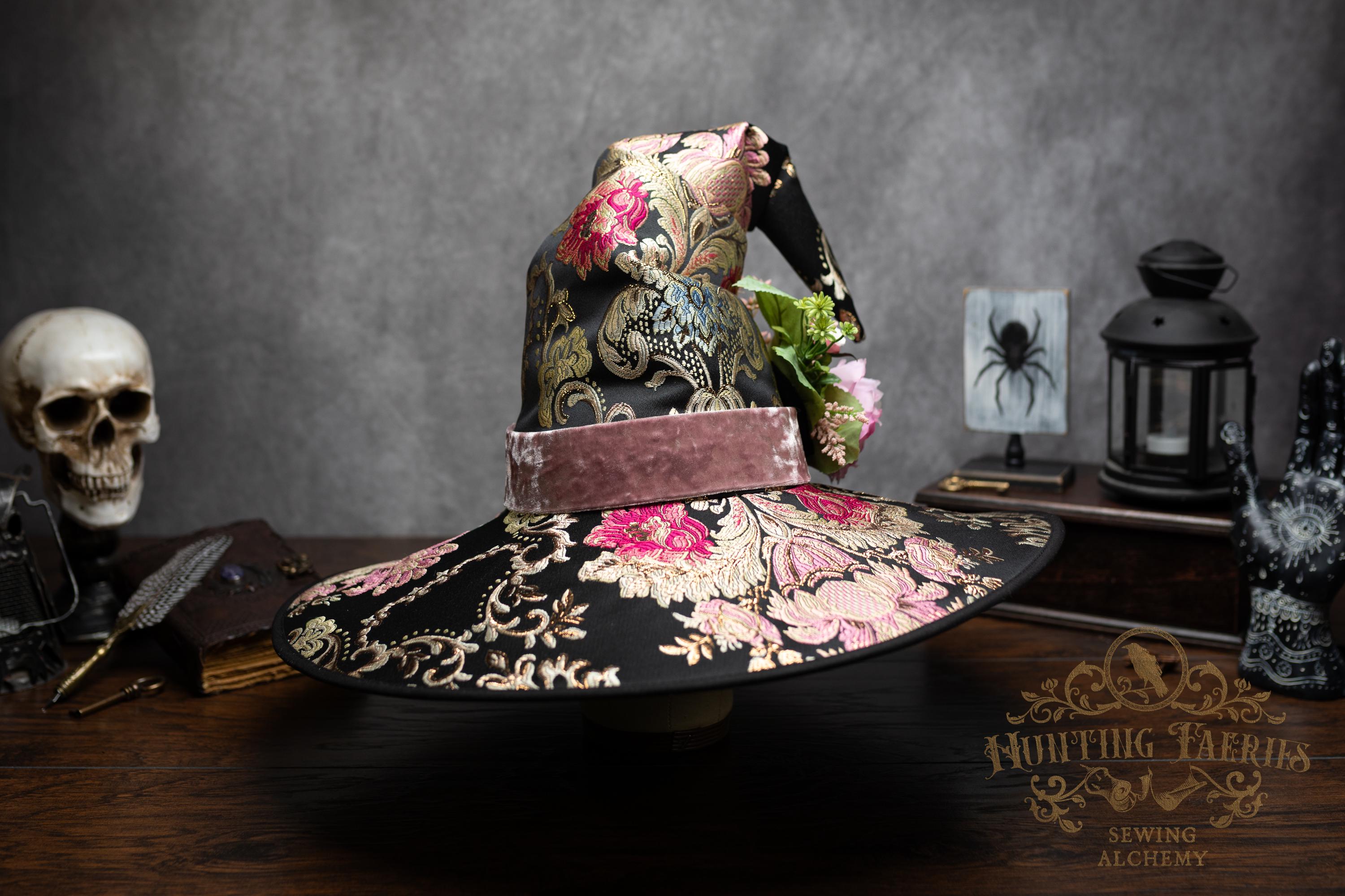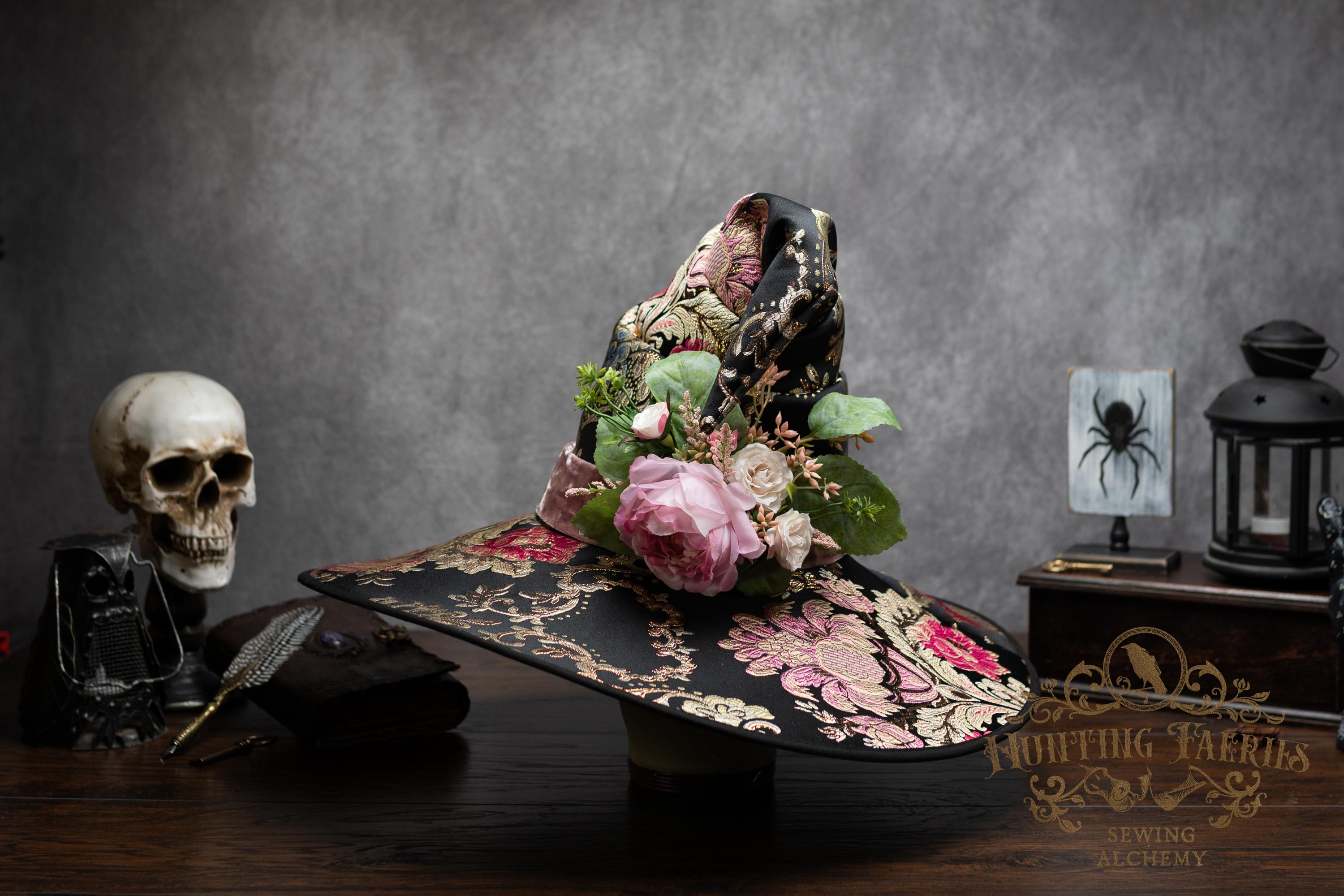 This handcrafted floral satin witch hat features a light pink velvet band. At the side is a small bunch of flowers accenting the brocade fabric. This can be removed if you want to decorate it yourself and change up your look.