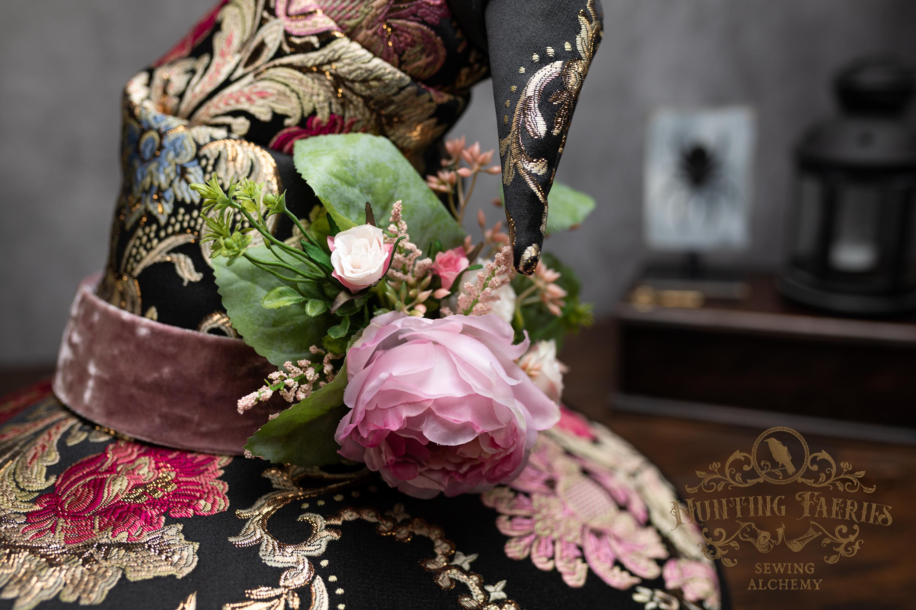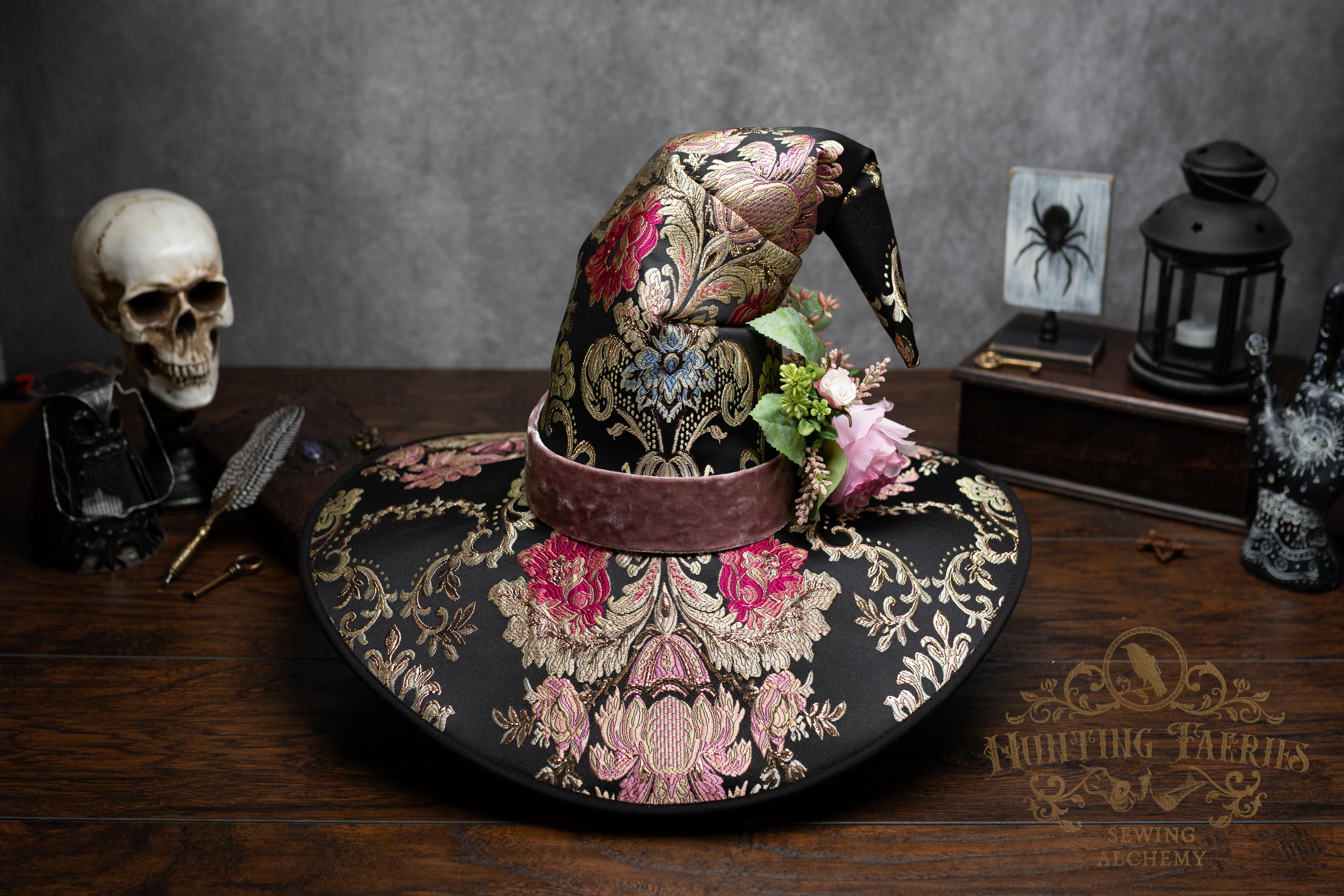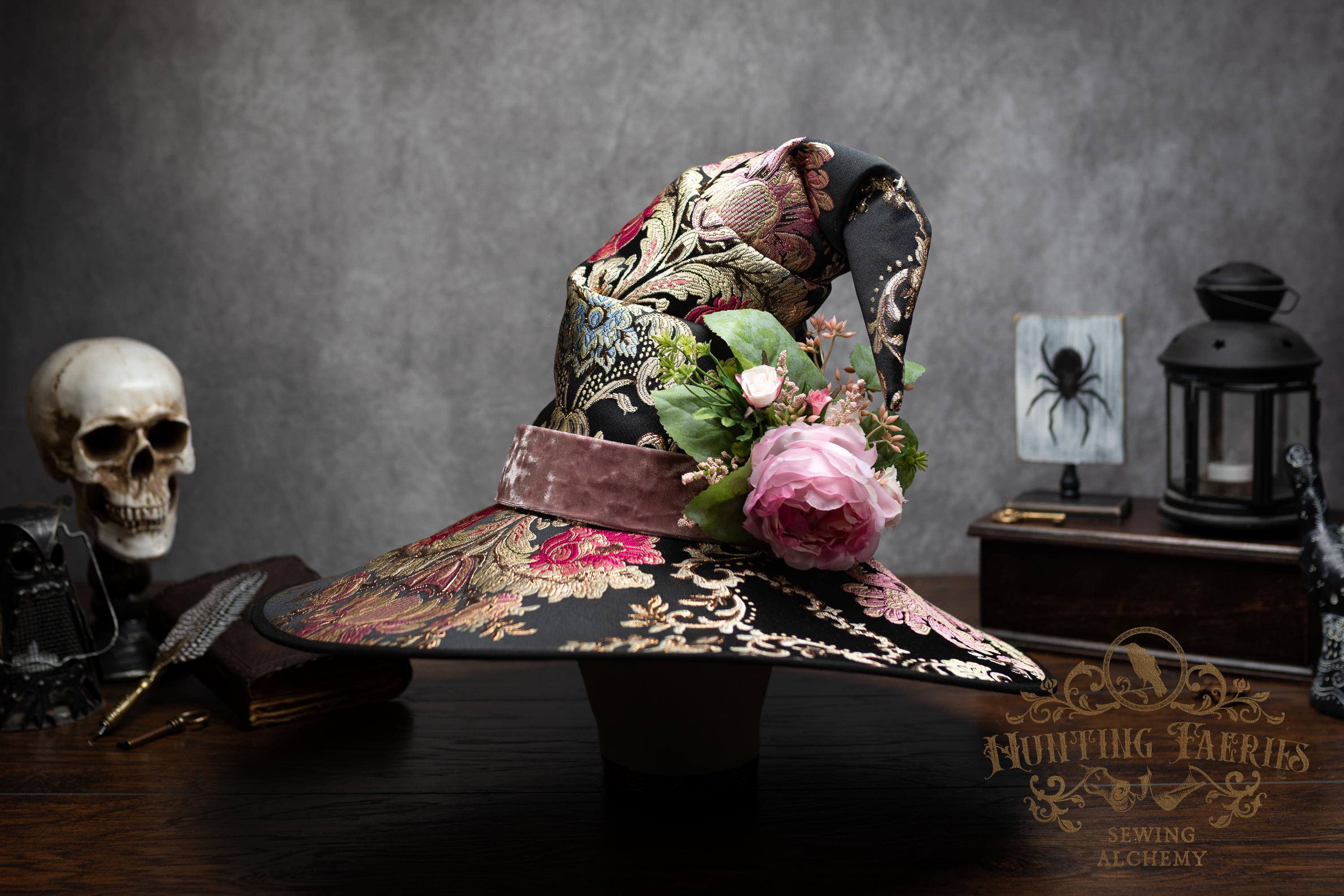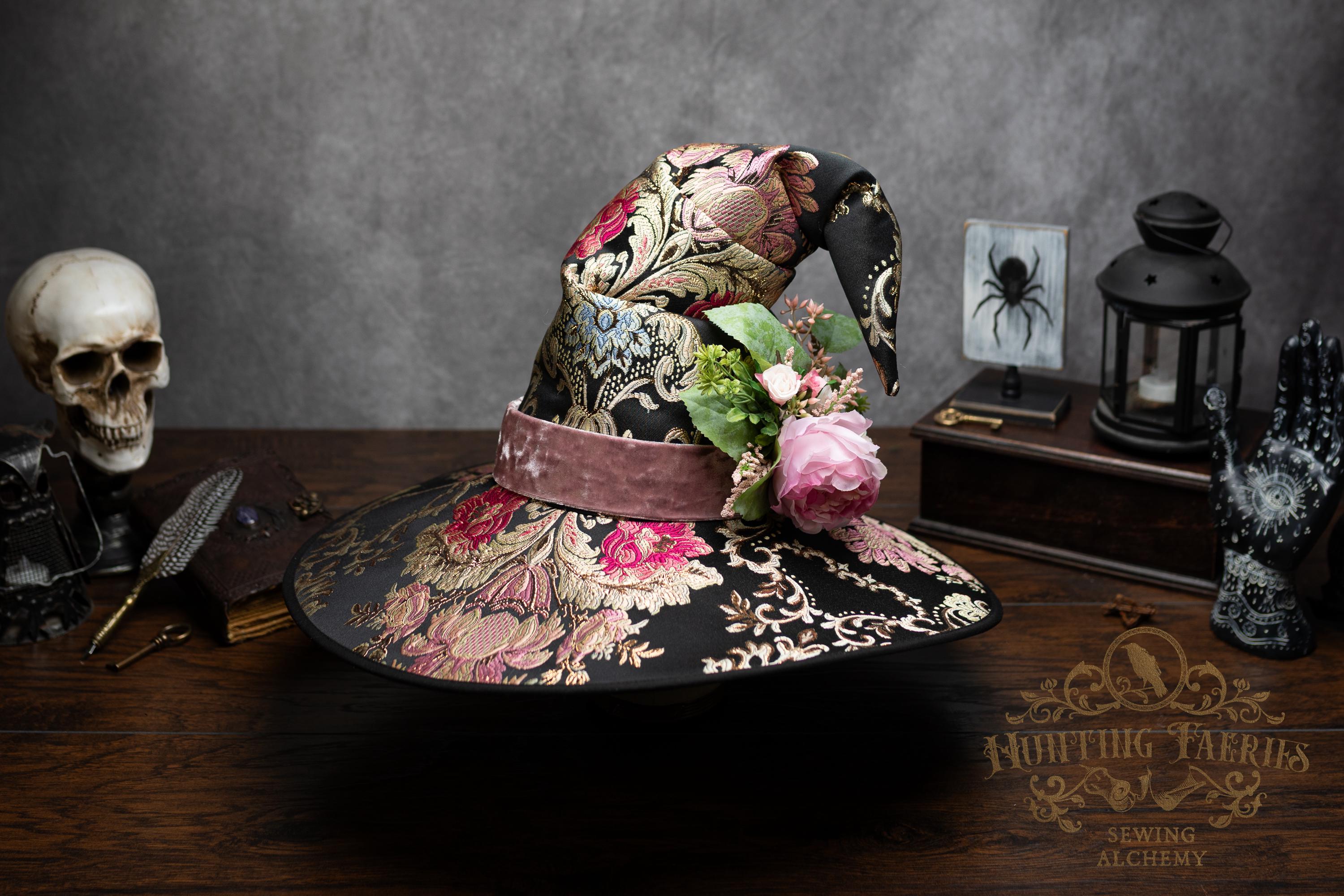 This handcrafted floral satin witch hat features a light pink velvet band. At the side is a small bunch of flowers accenting the brocade fabric. This can be removed if you want to decorate it yourself and change up your look.