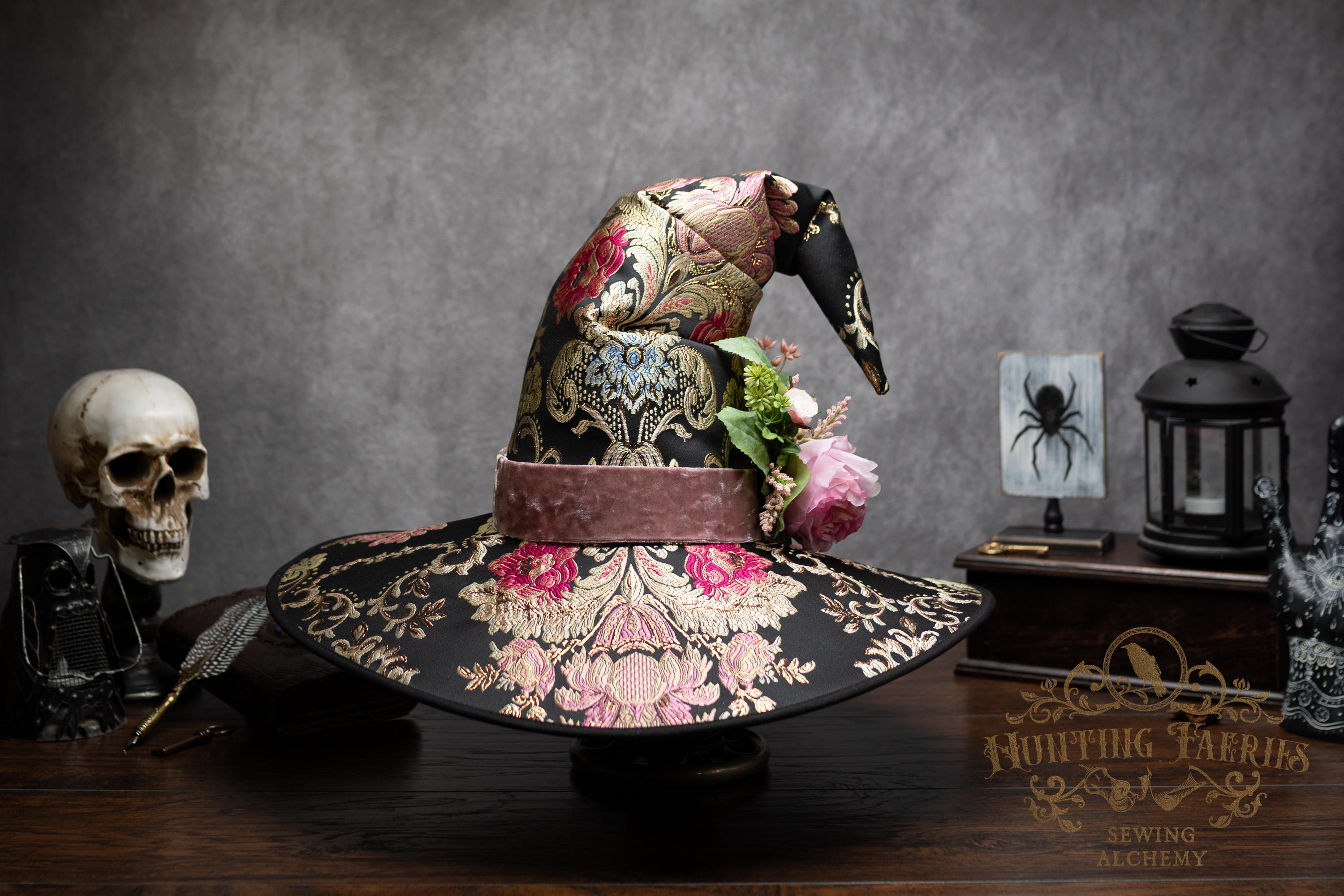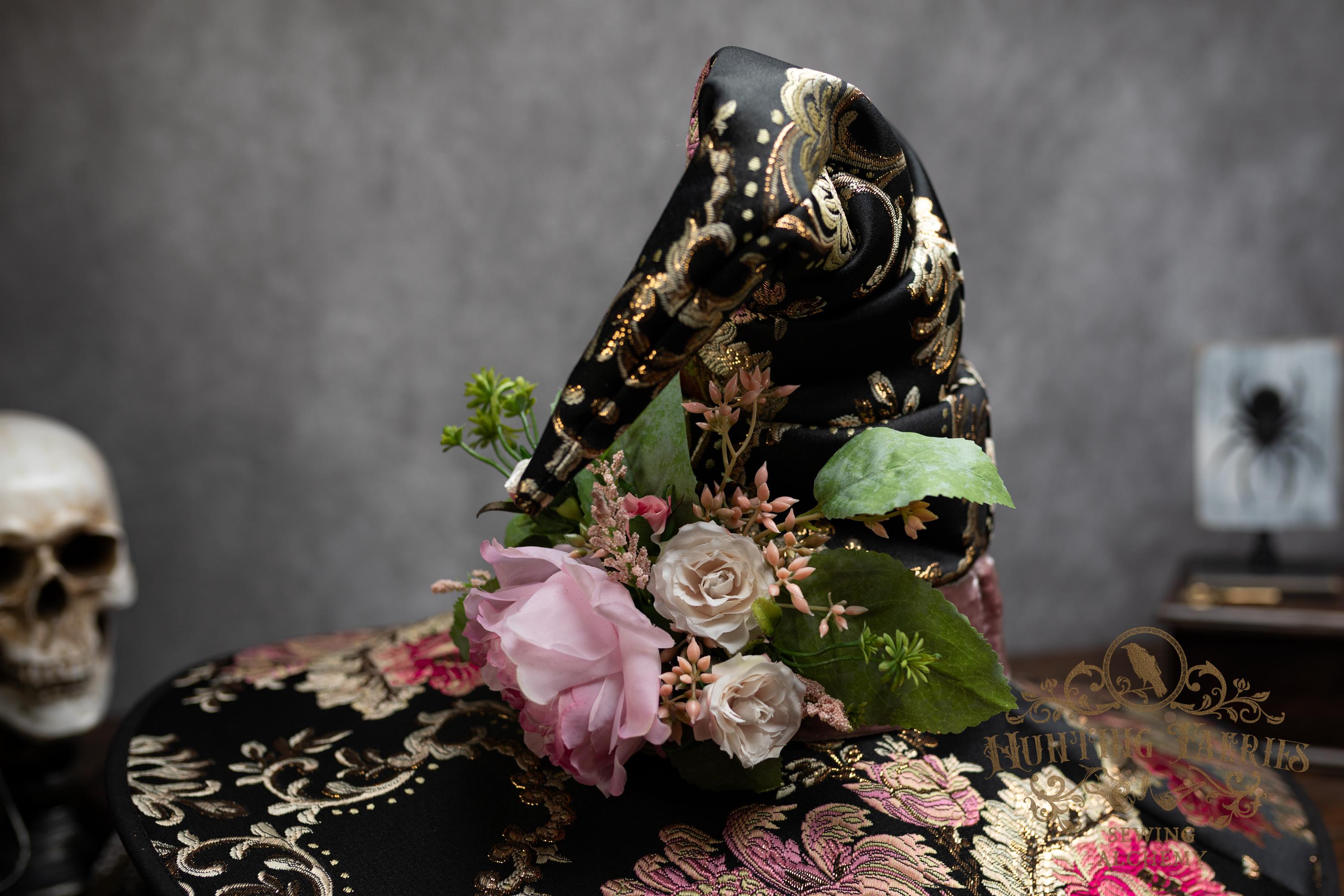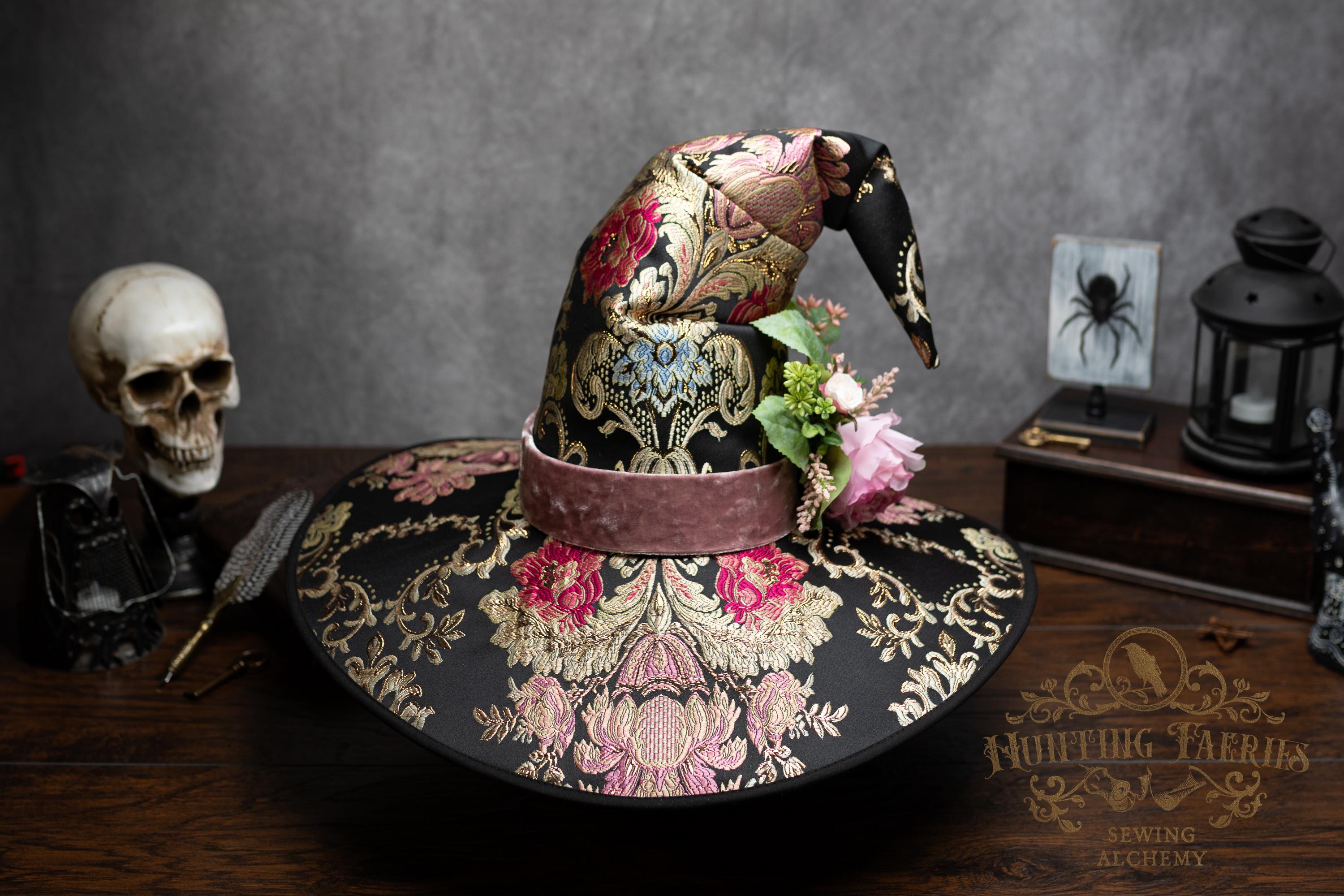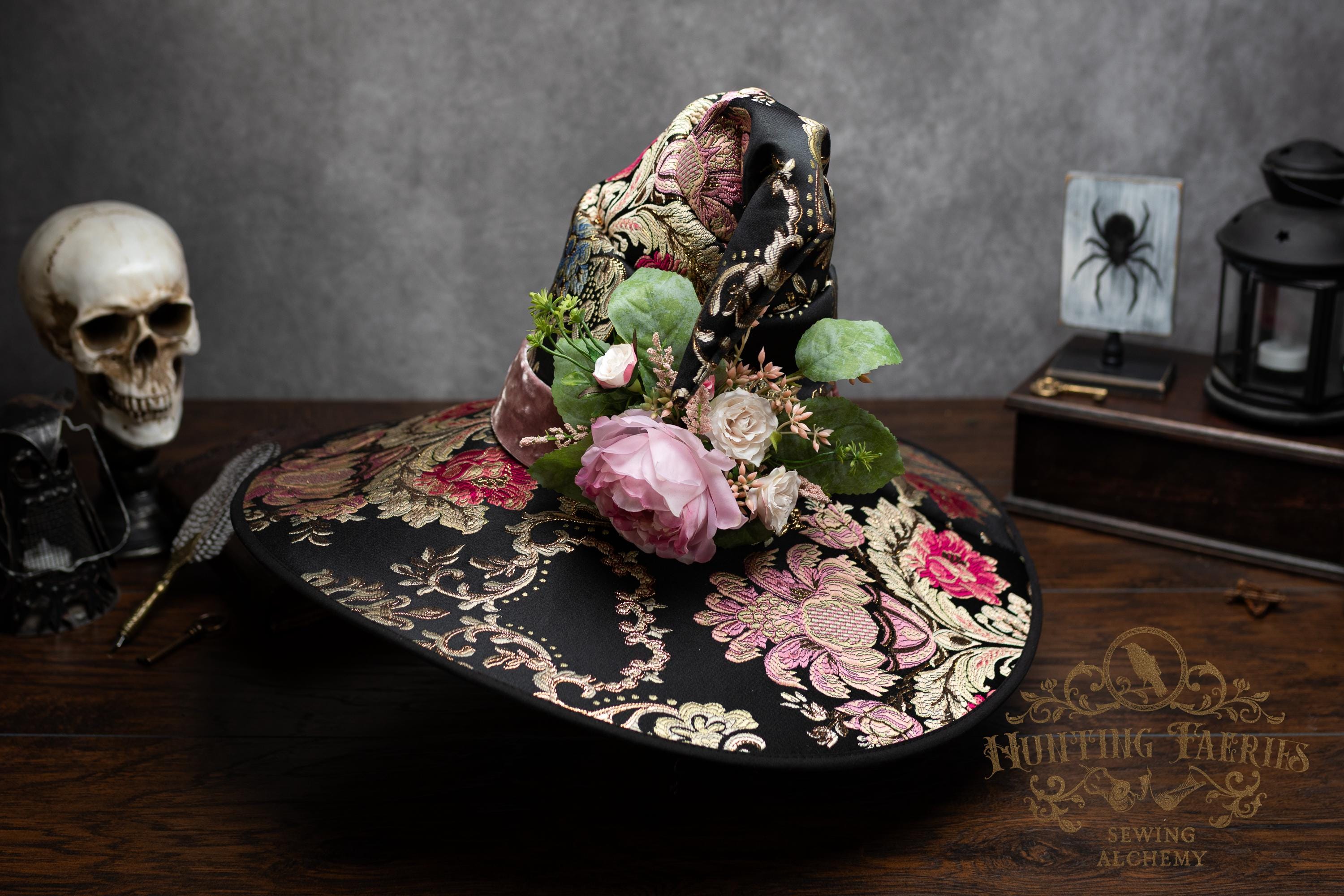 This handcrafted floral satin witch hat features a light pink velvet band. At the side is a small bunch of flowers accenting the brocade fabric. This can be removed if you want to decorate it yourself and change up your look.