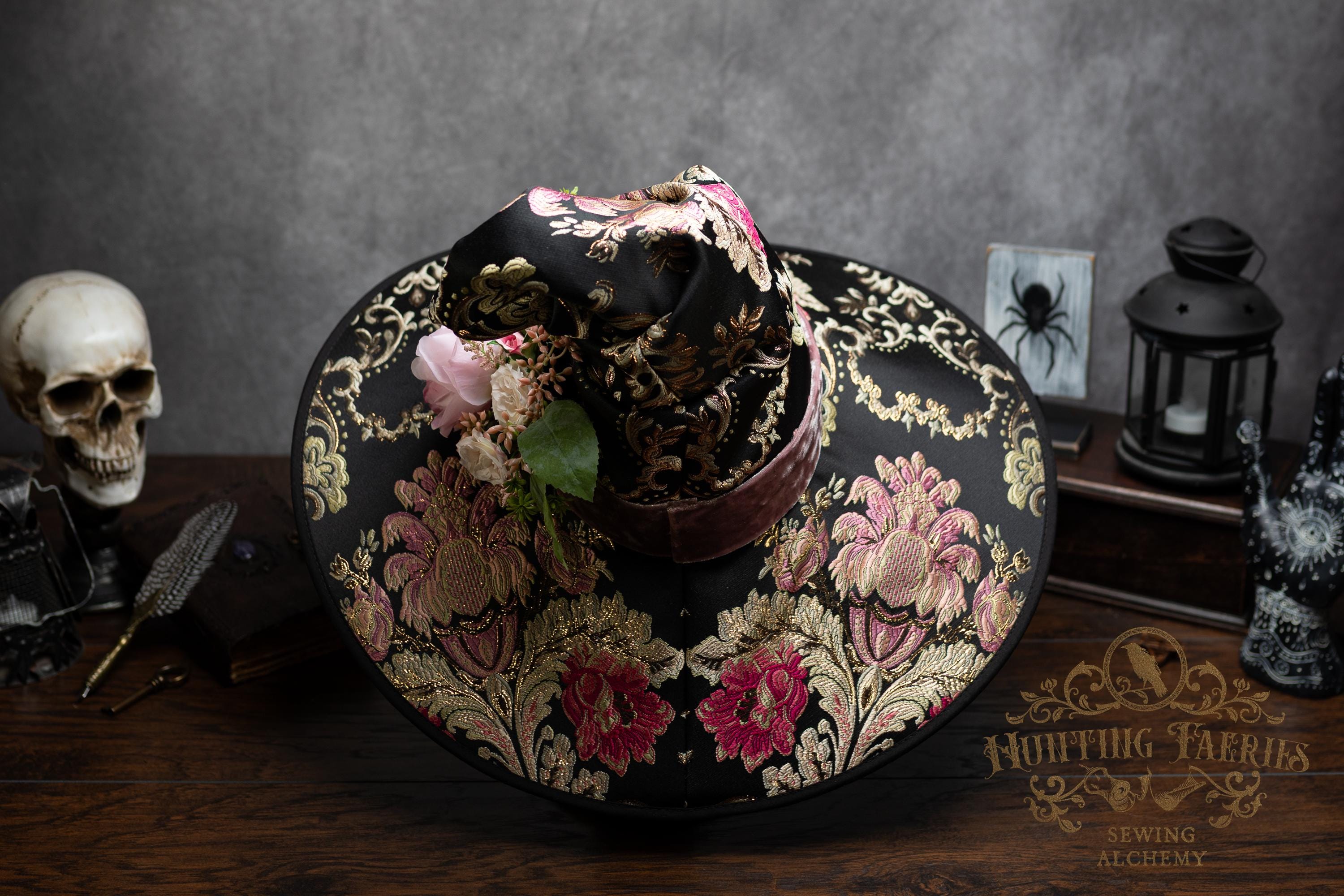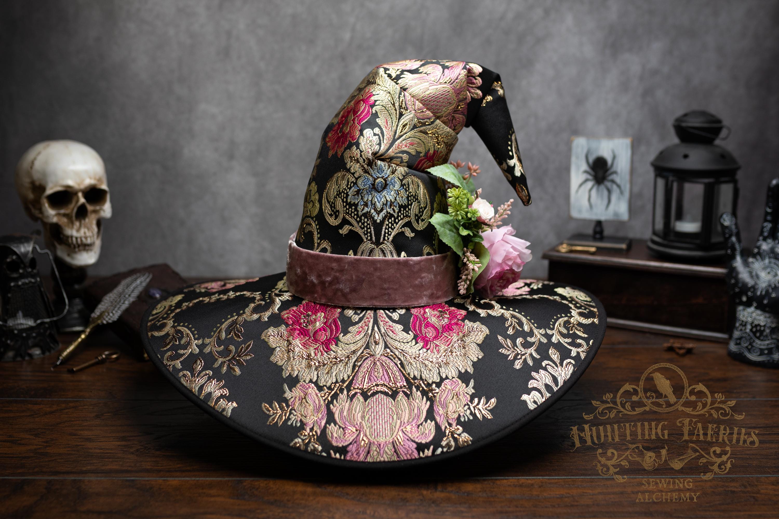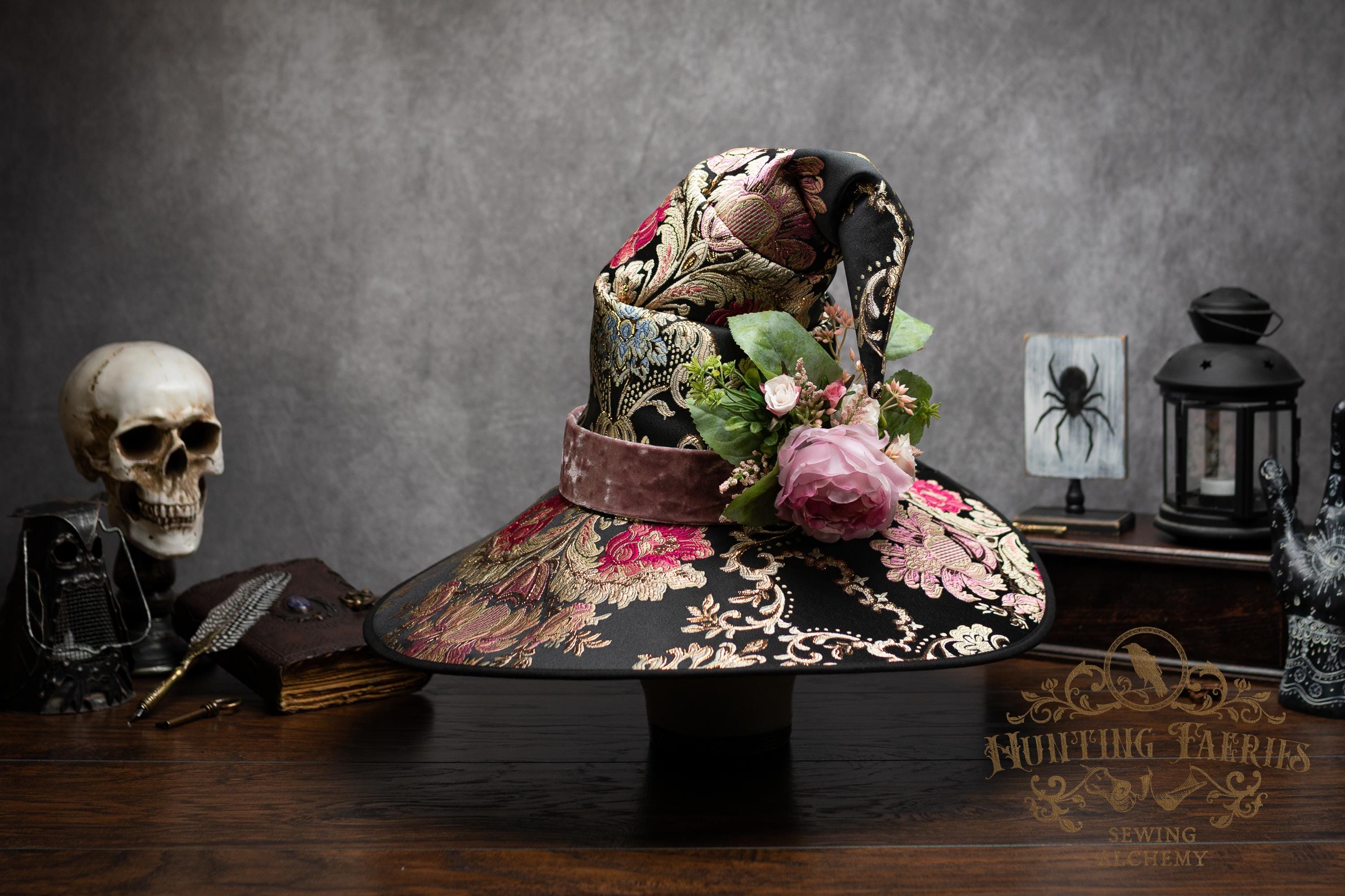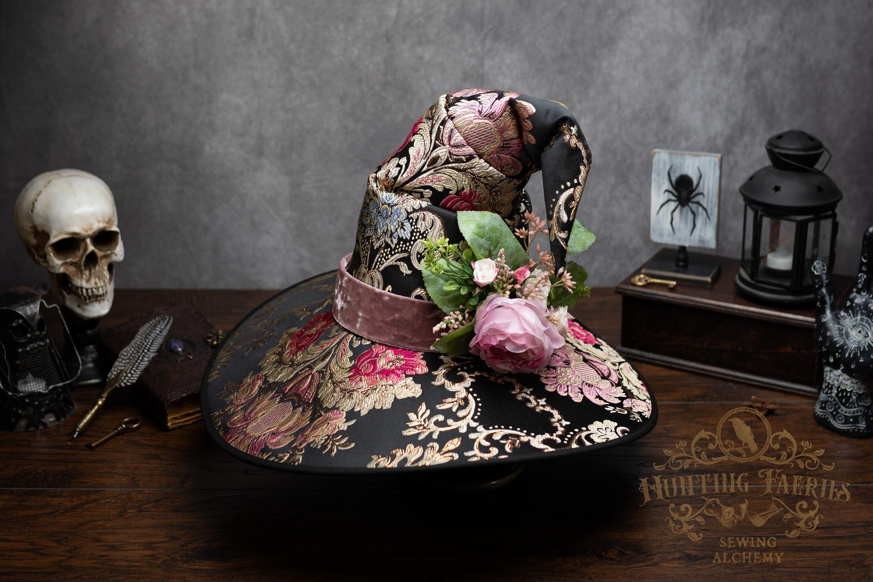 This handcrafted floral satin witch hat features a light pink velvet band. At the side is a small bunch of flowers accenting the brocade fabric. This can be removed if you want to decorate it yourself and change up your look.