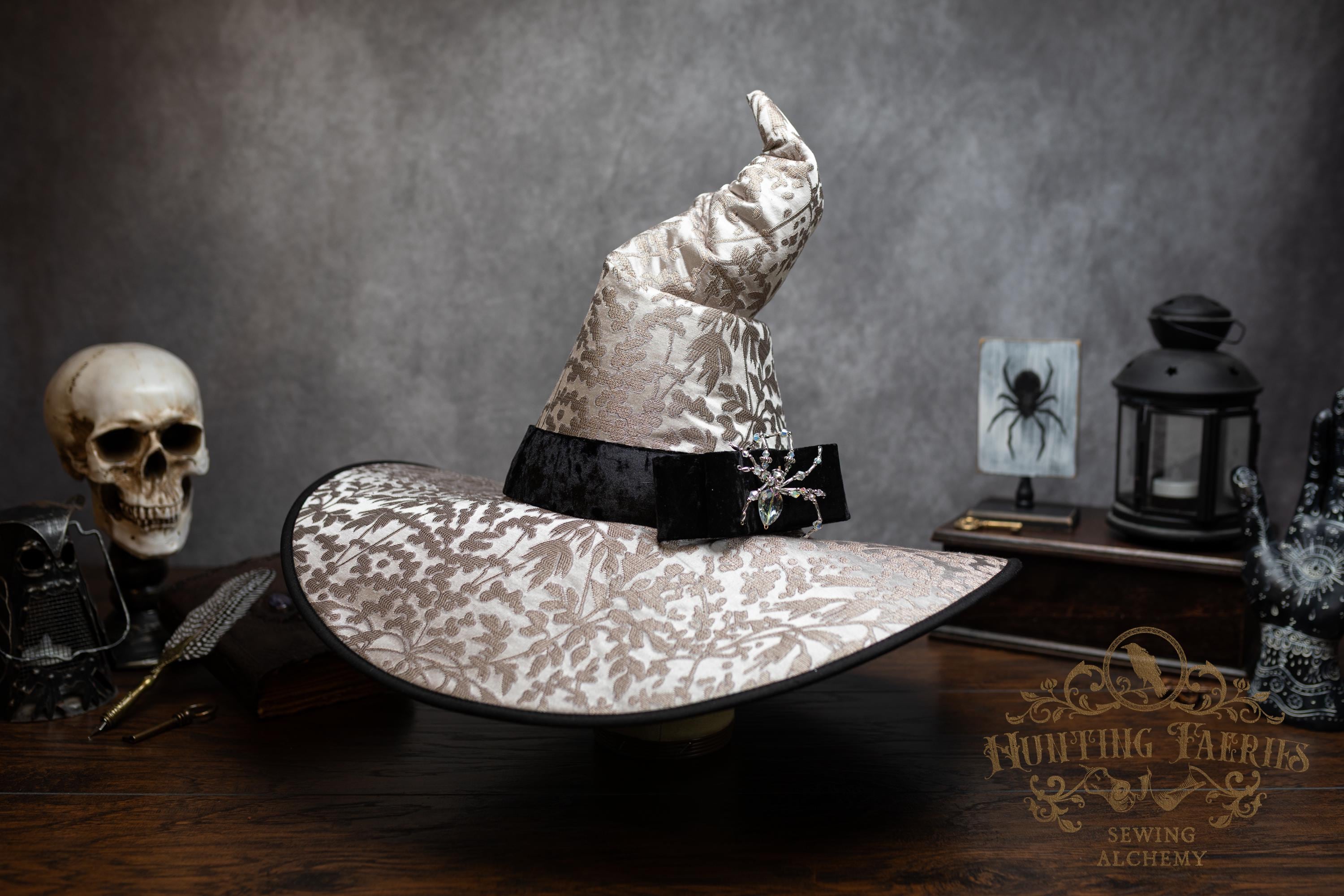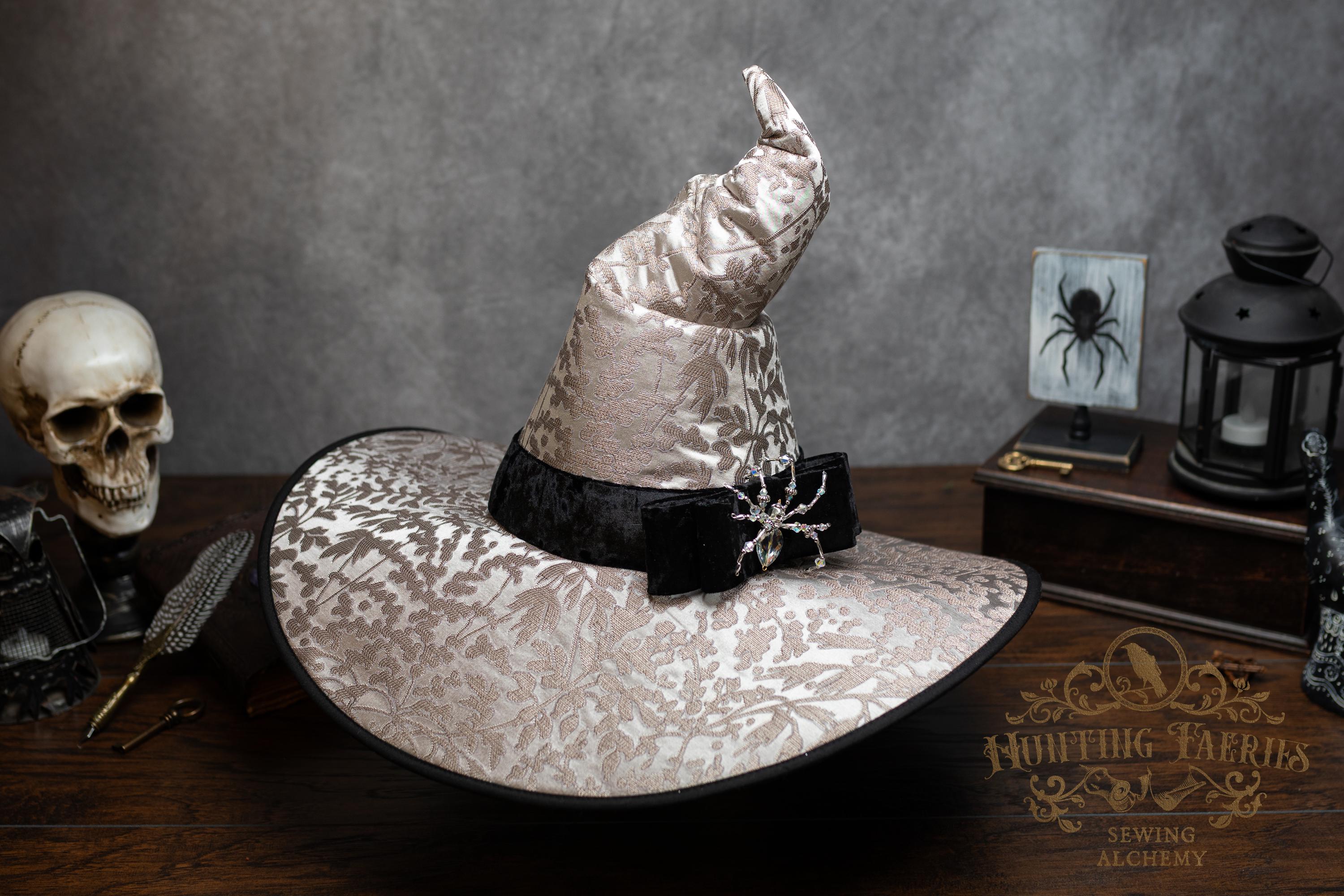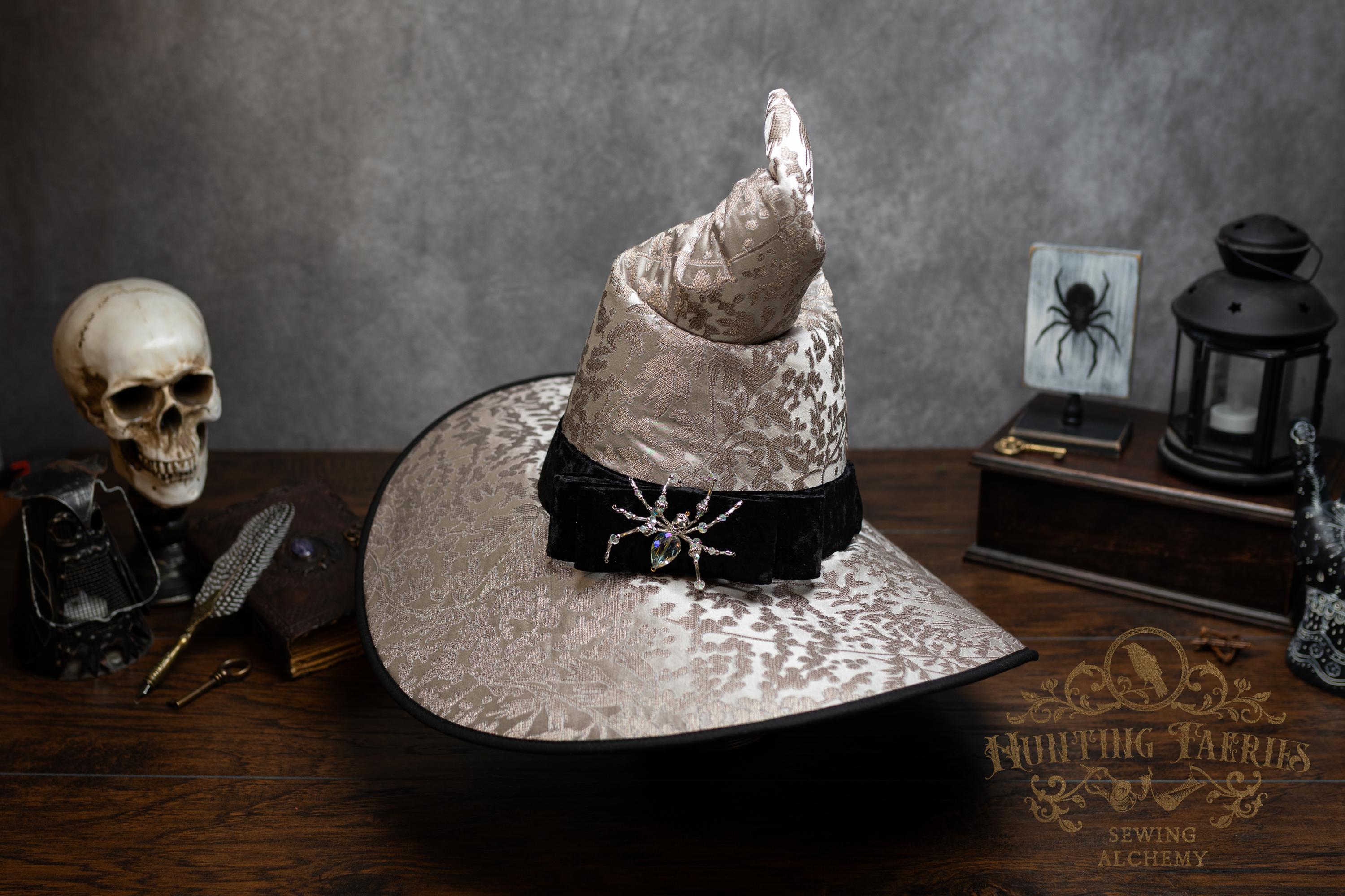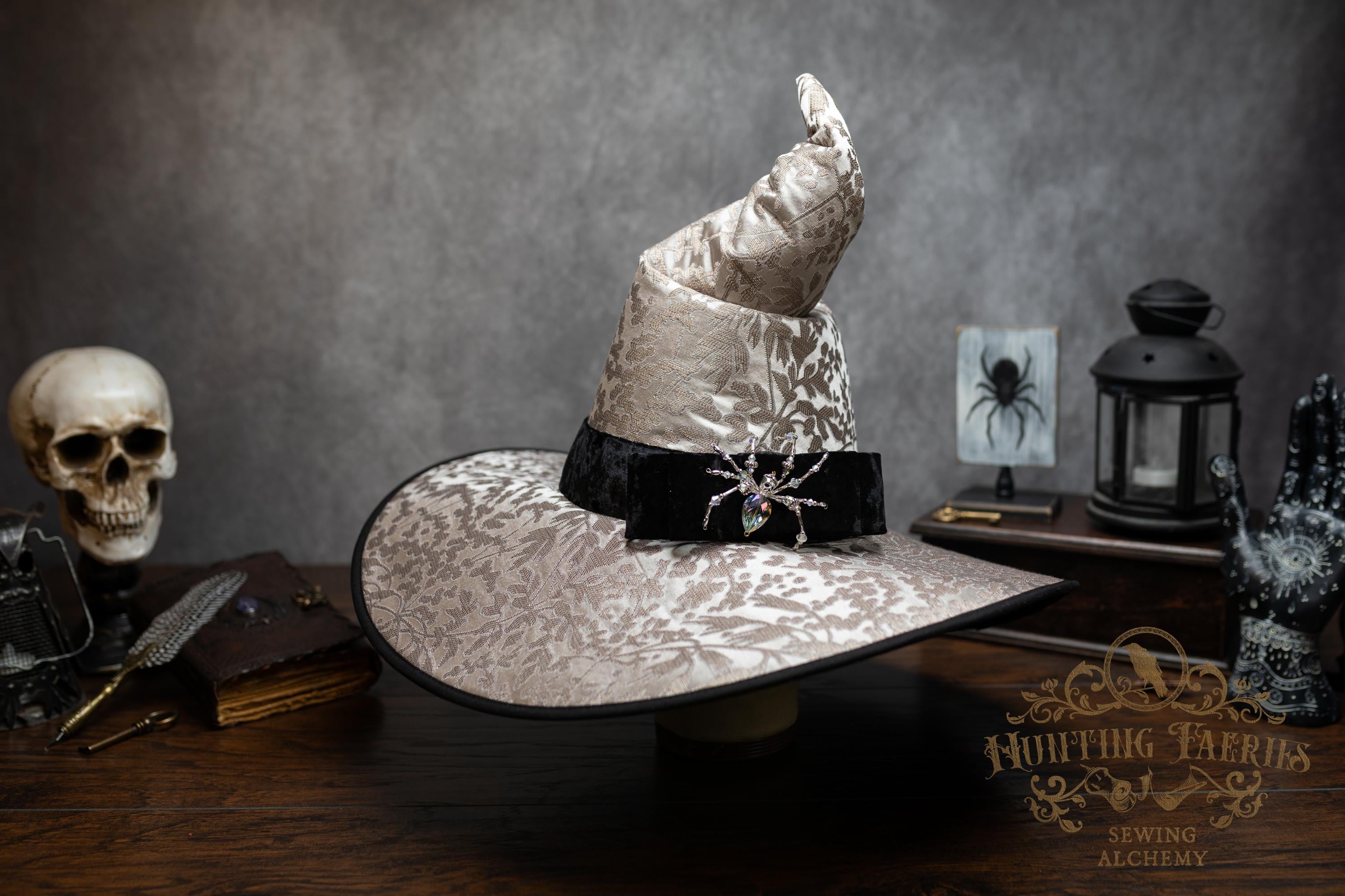 This handcrafted witch hat is constructed from a silver brocade, floral, tone on tone fabric. A black velvet band encircles the cone with a bow at the side. There is a beaded crystal spider at the center of the bow.