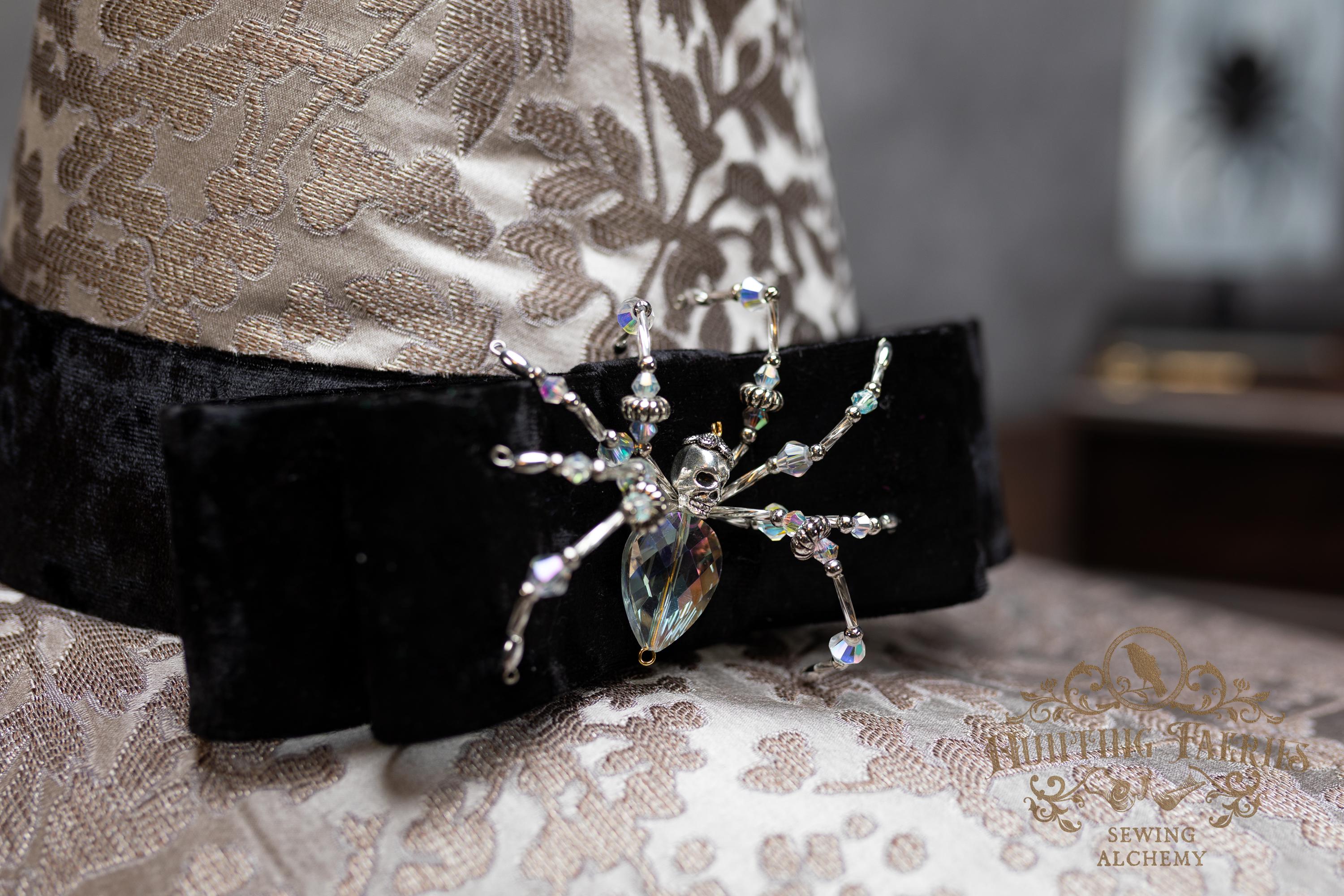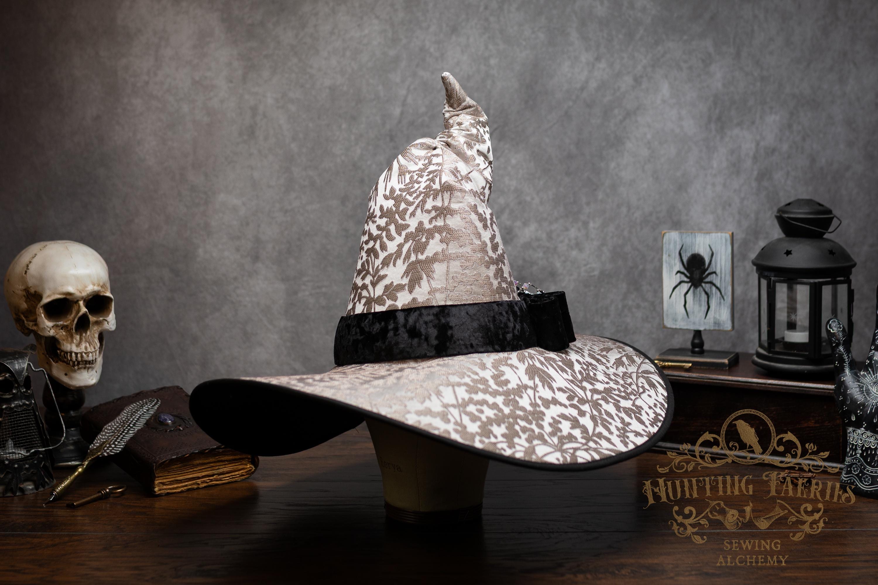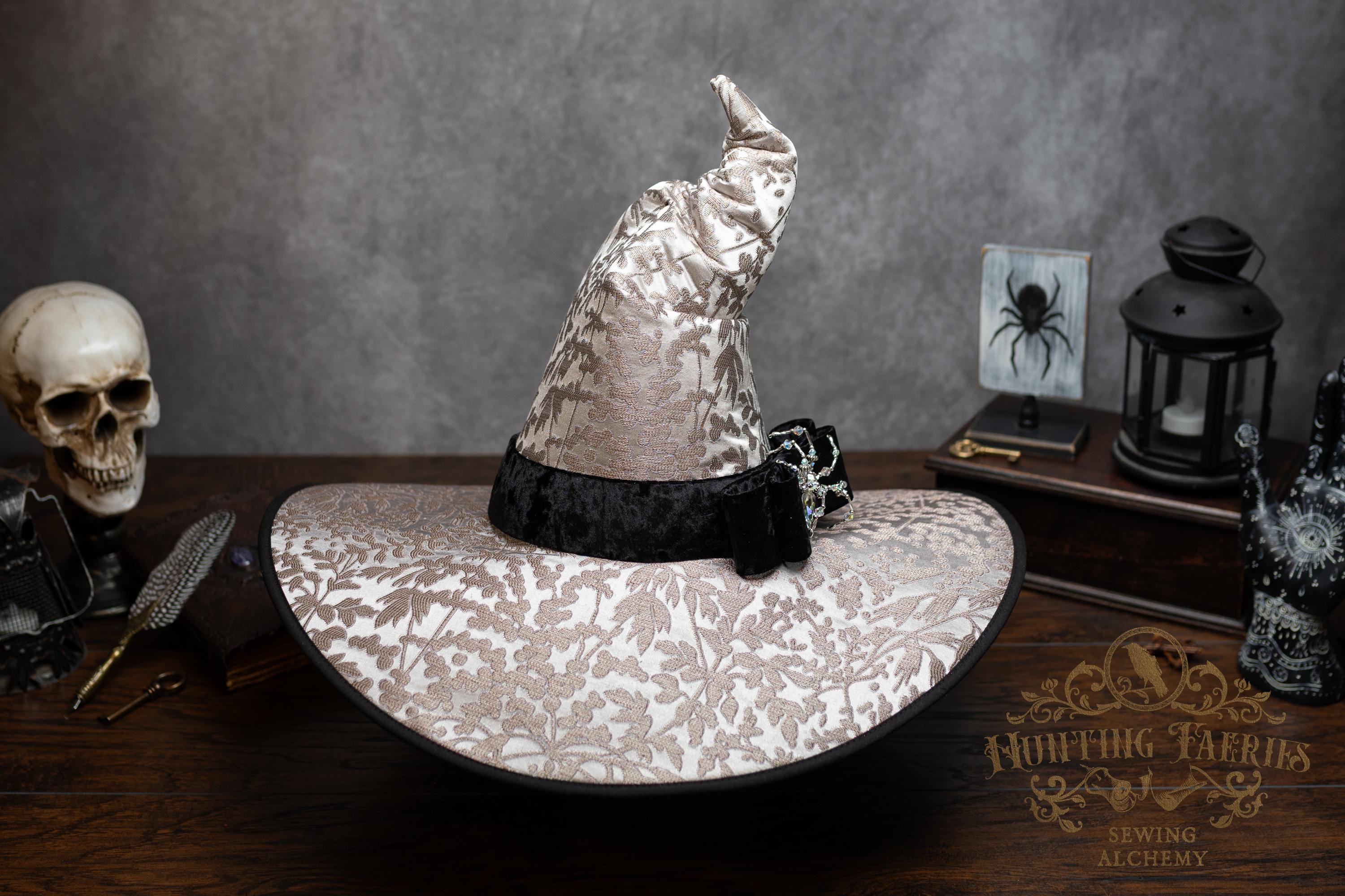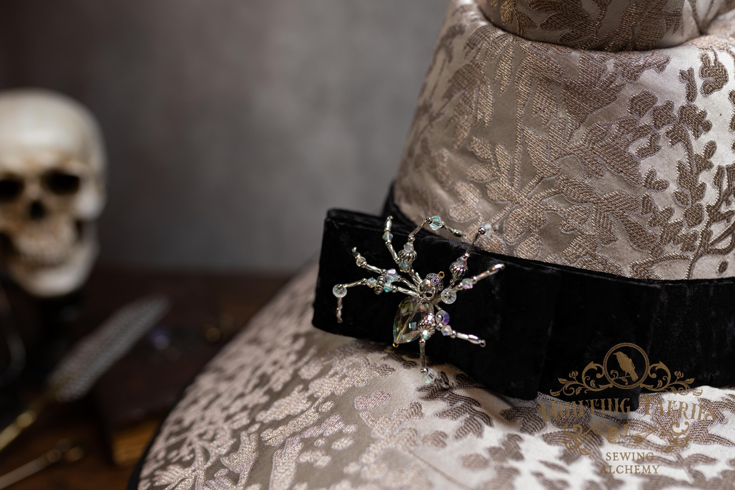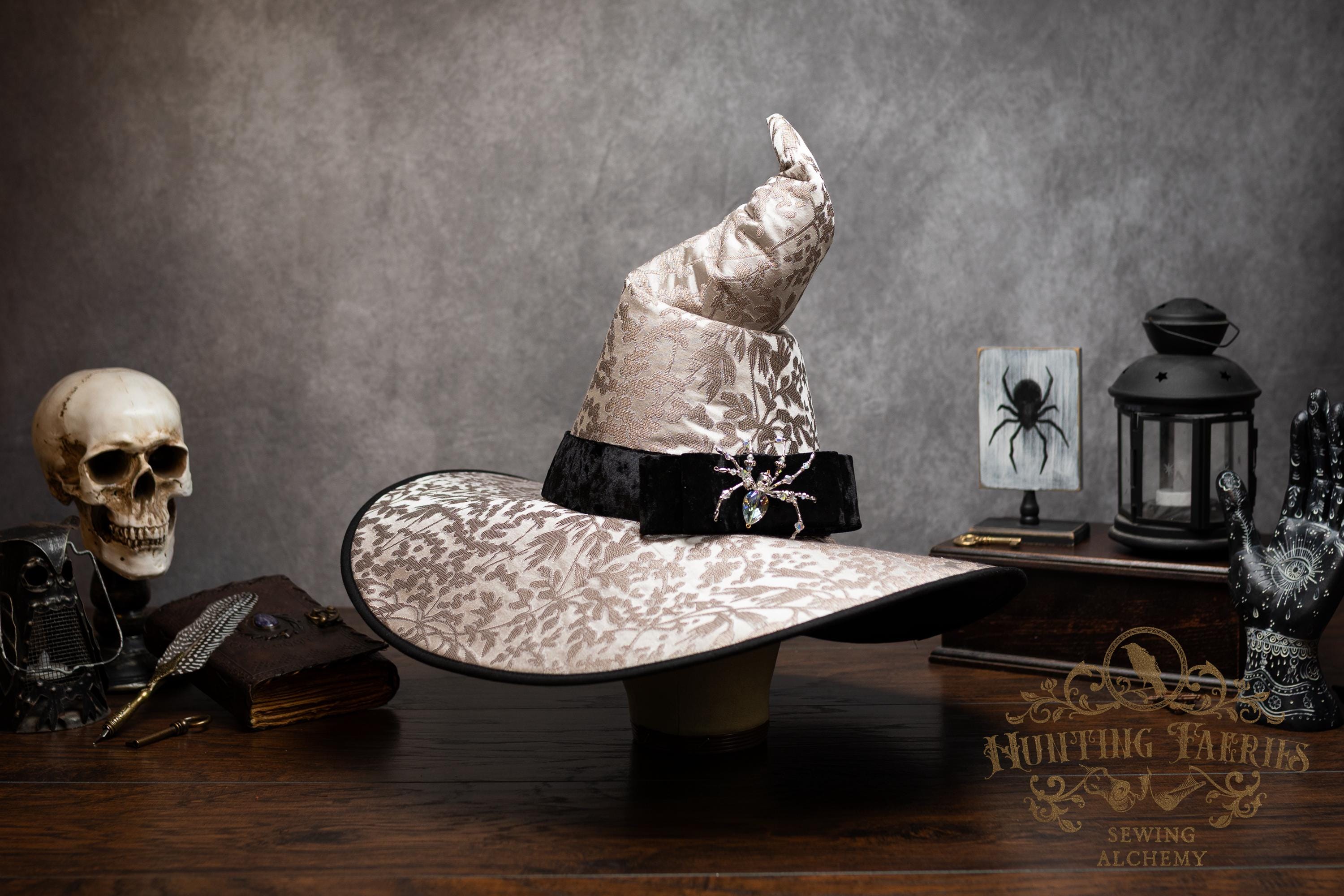 This handcrafted witch hat is constructed from a silver brocade, floral, tone on tone fabric. A black velvet band encircles the cone with a bow at the side. There is a beaded crystal spider at the center of the bow.