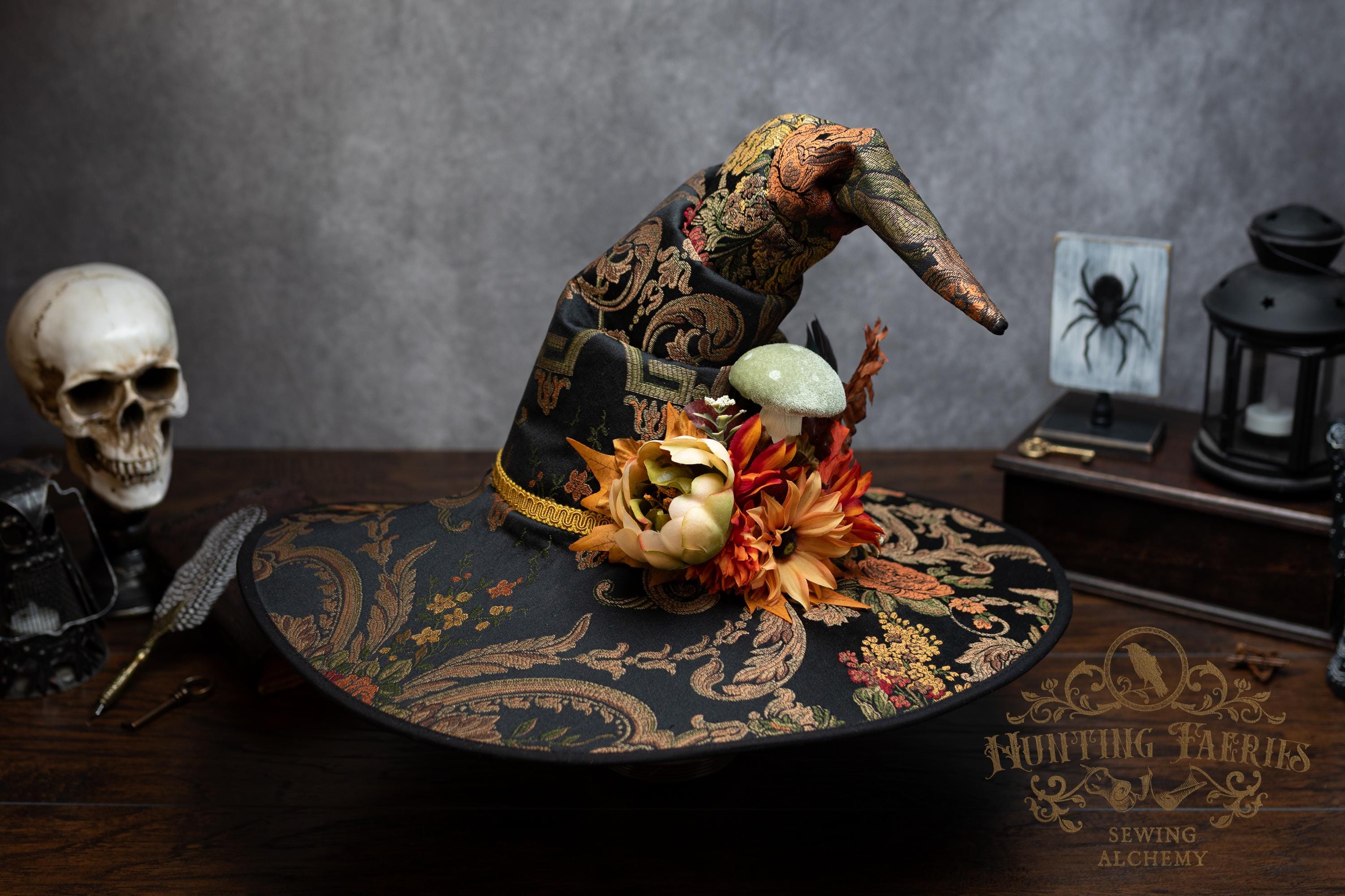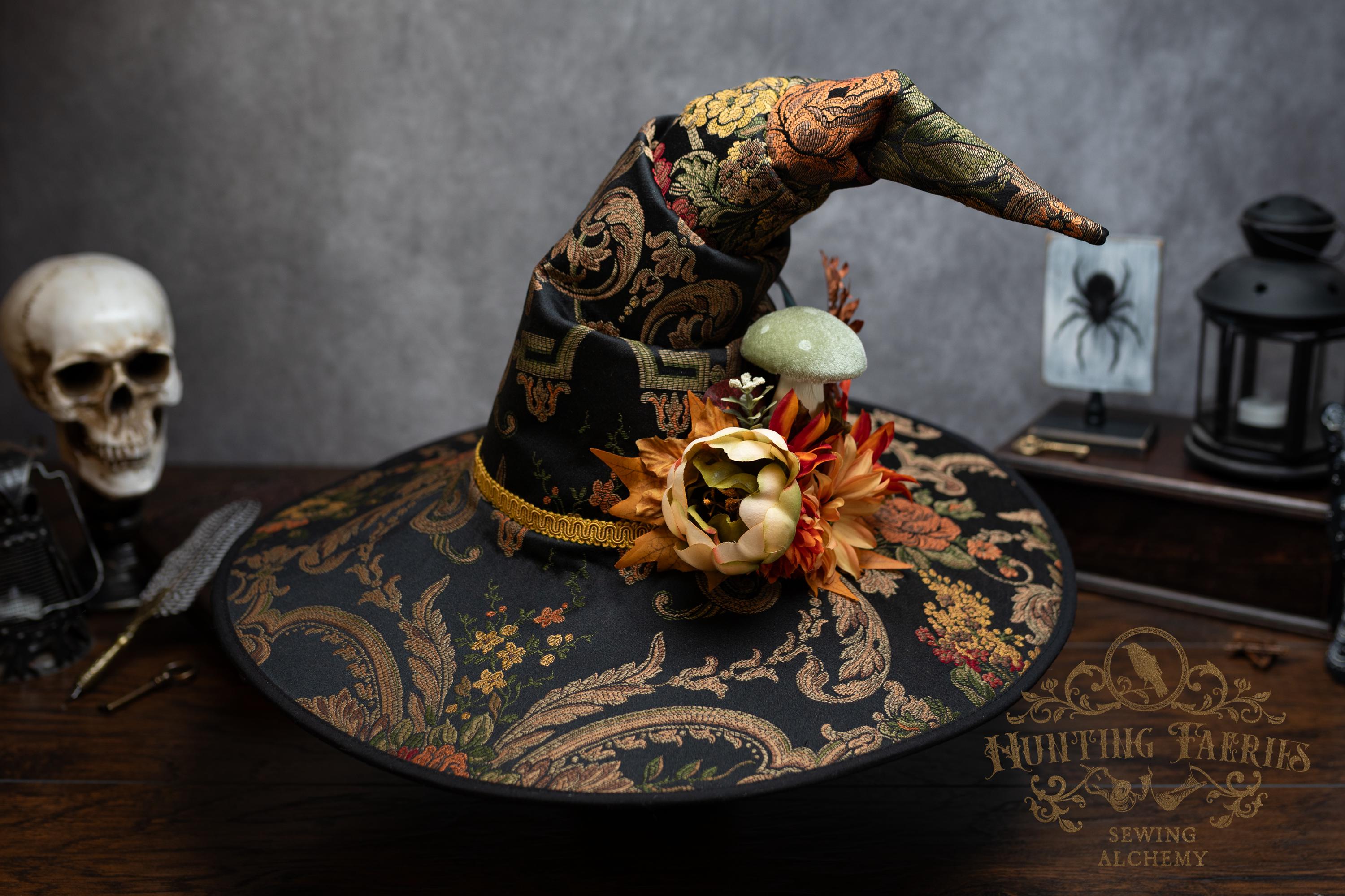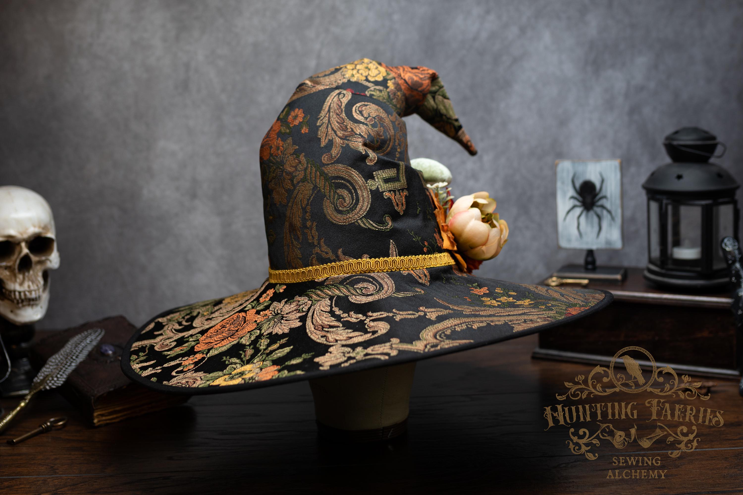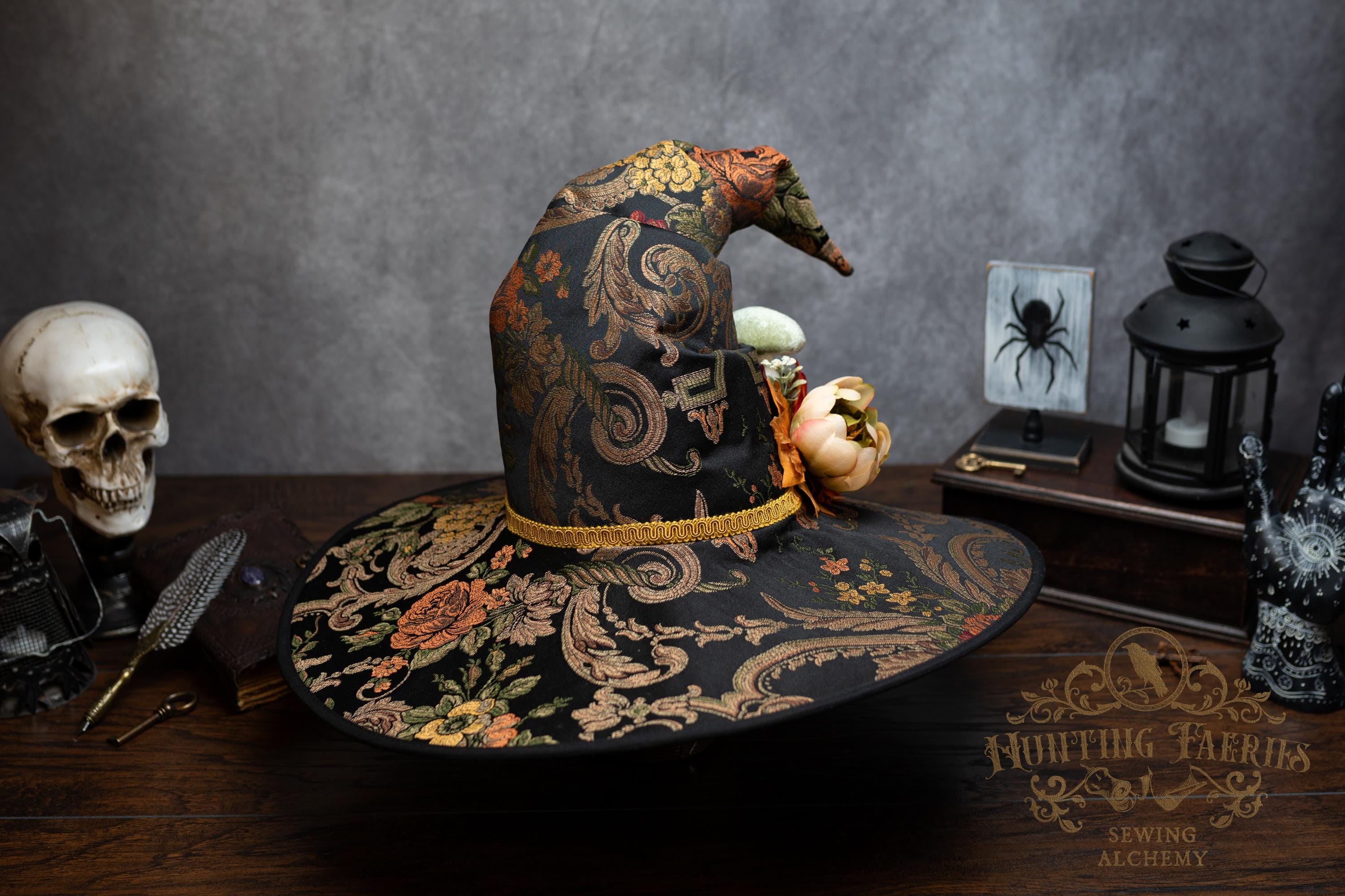 This handcrafted floral satin witch hat features a golden yellow band. At the side is a small bunch of flowers accenting the brocade fabric. This can be removed if you want to decorate it yourself and change up your look.