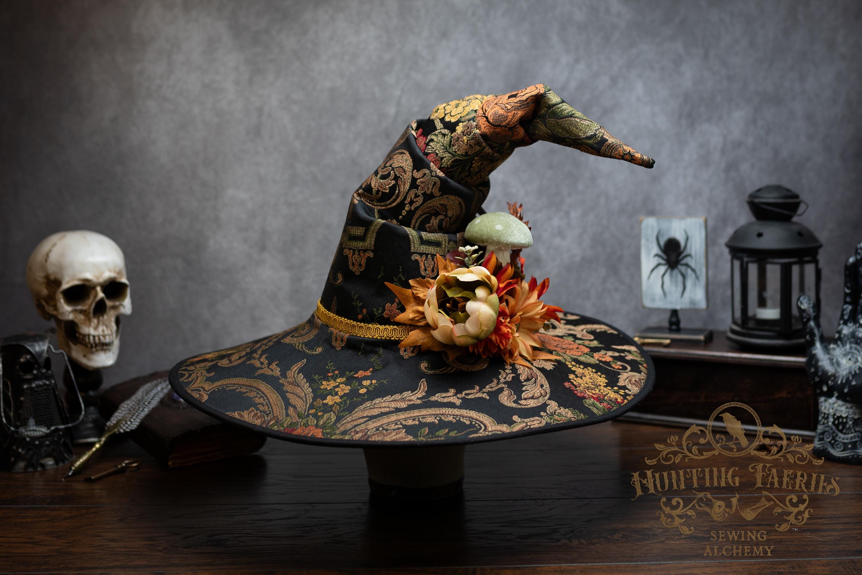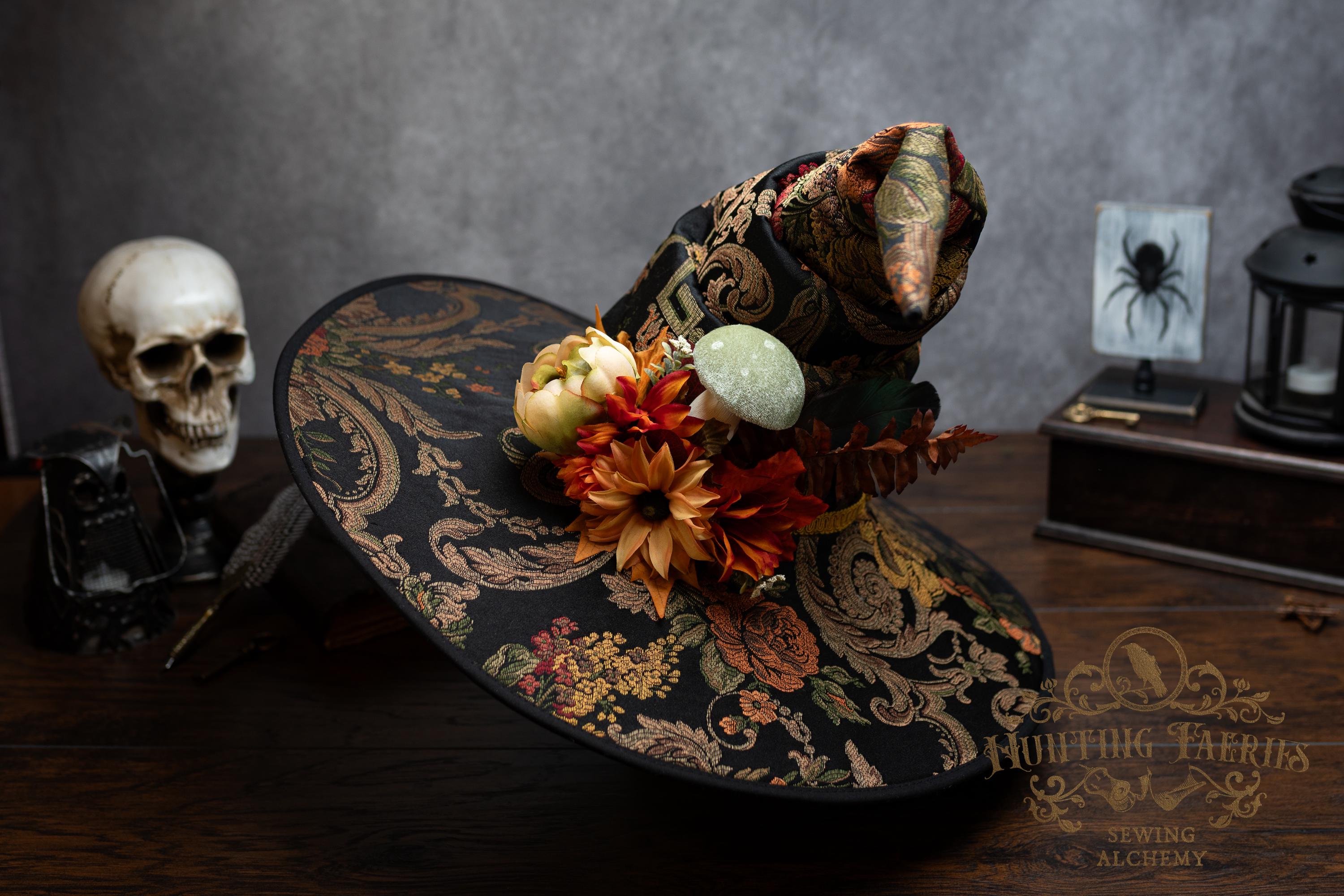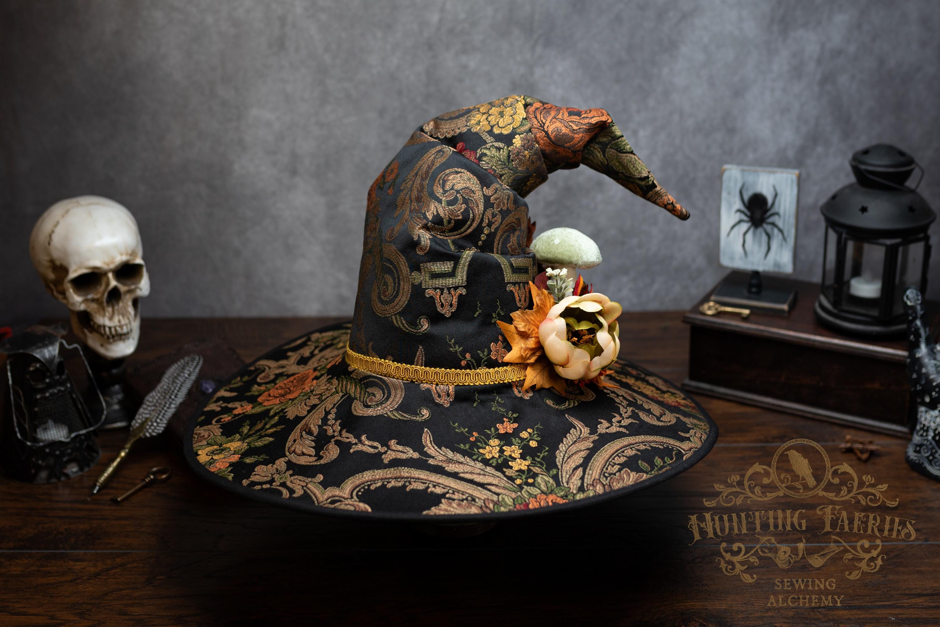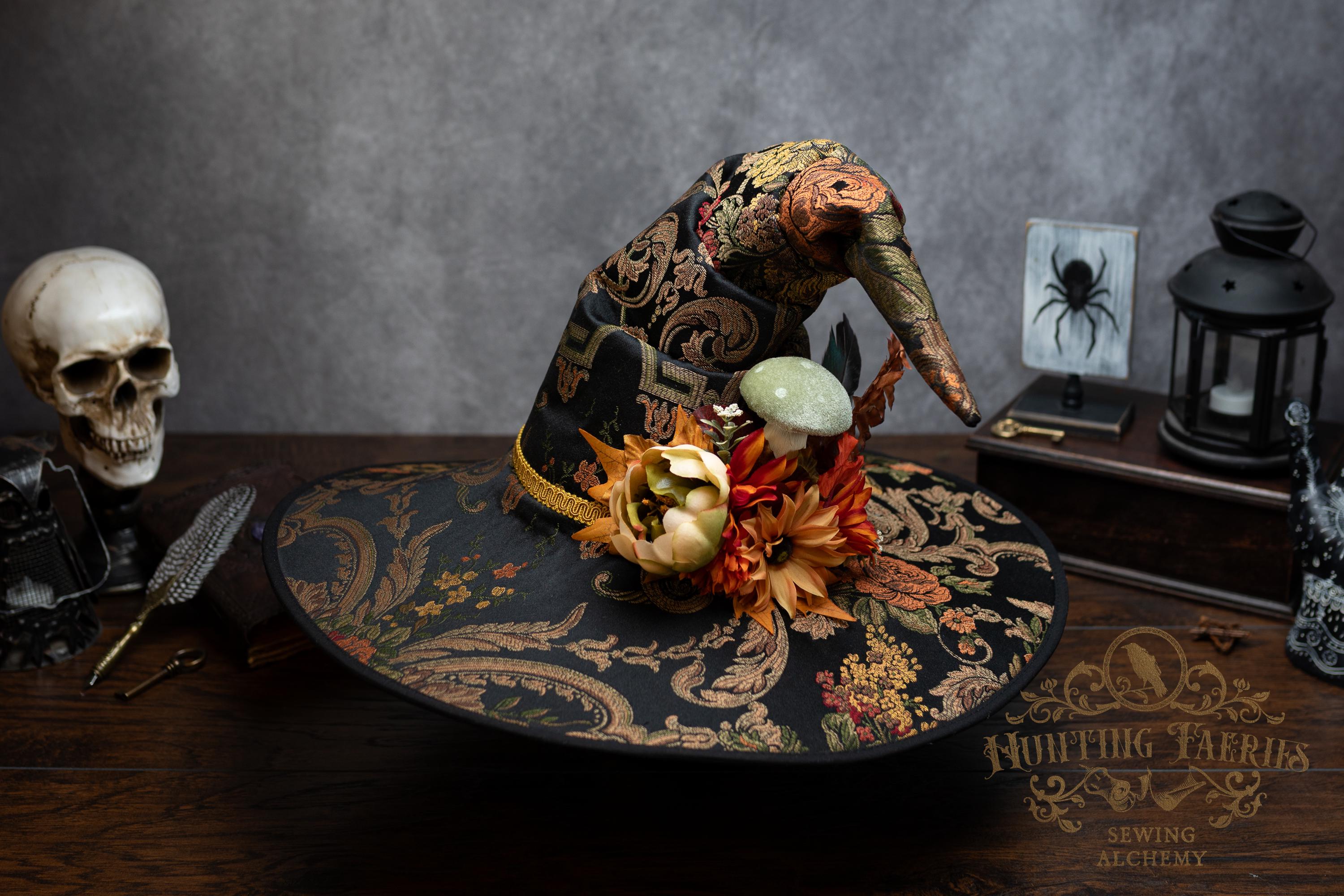 This handcrafted floral satin witch hat features a golden yellow band. At the side is a small bunch of flowers accenting the brocade fabric. This can be removed if you want to decorate it yourself and change up your look.