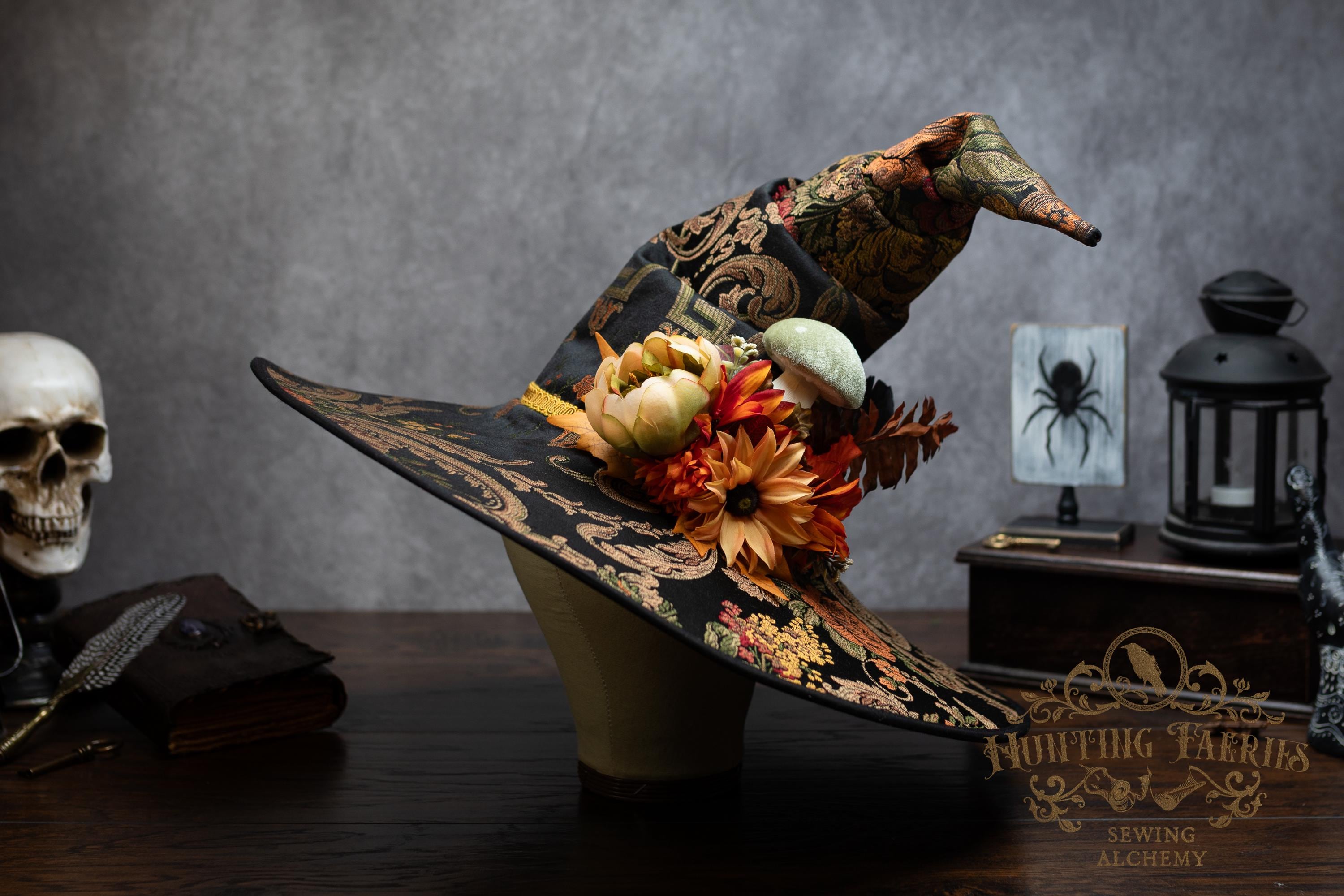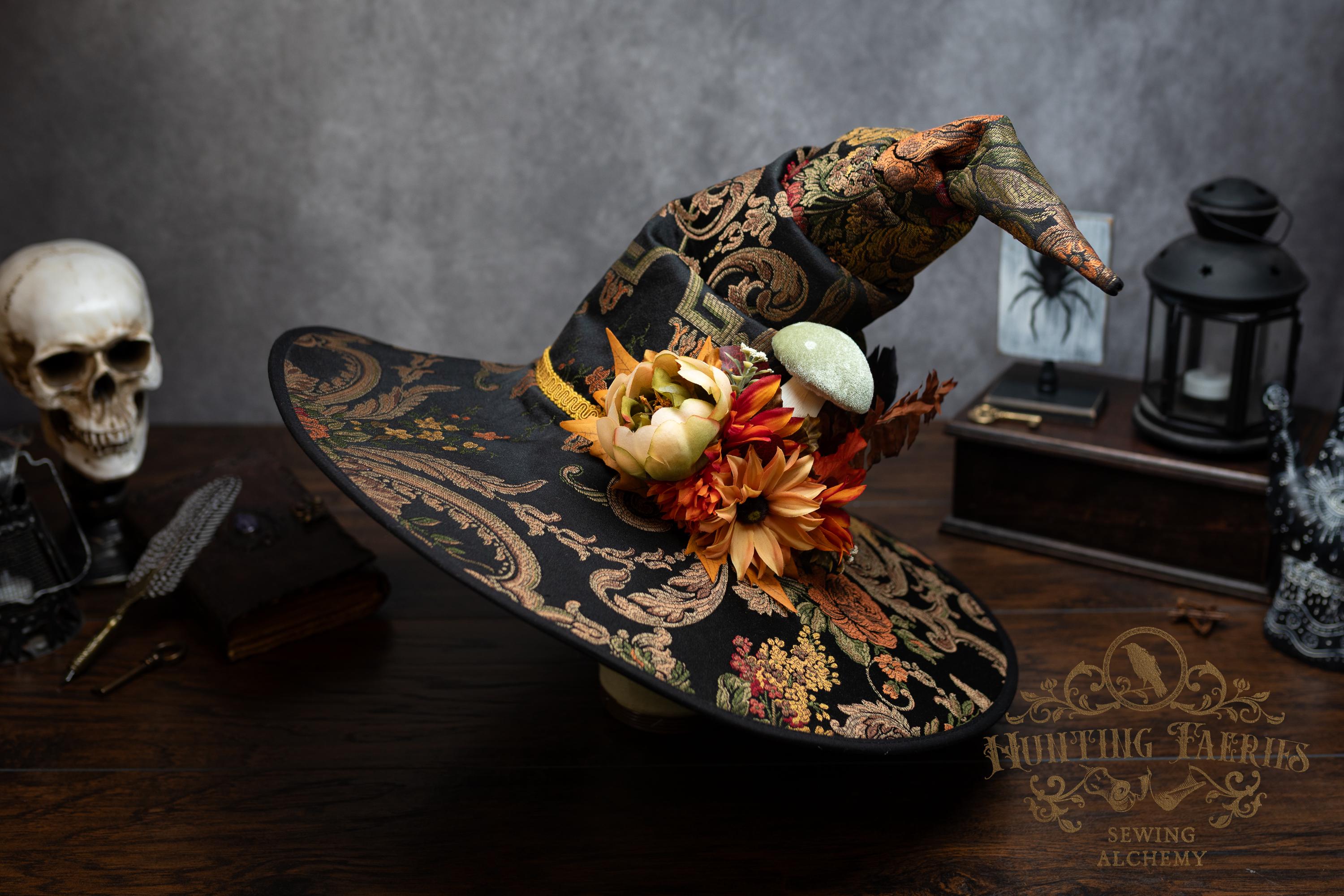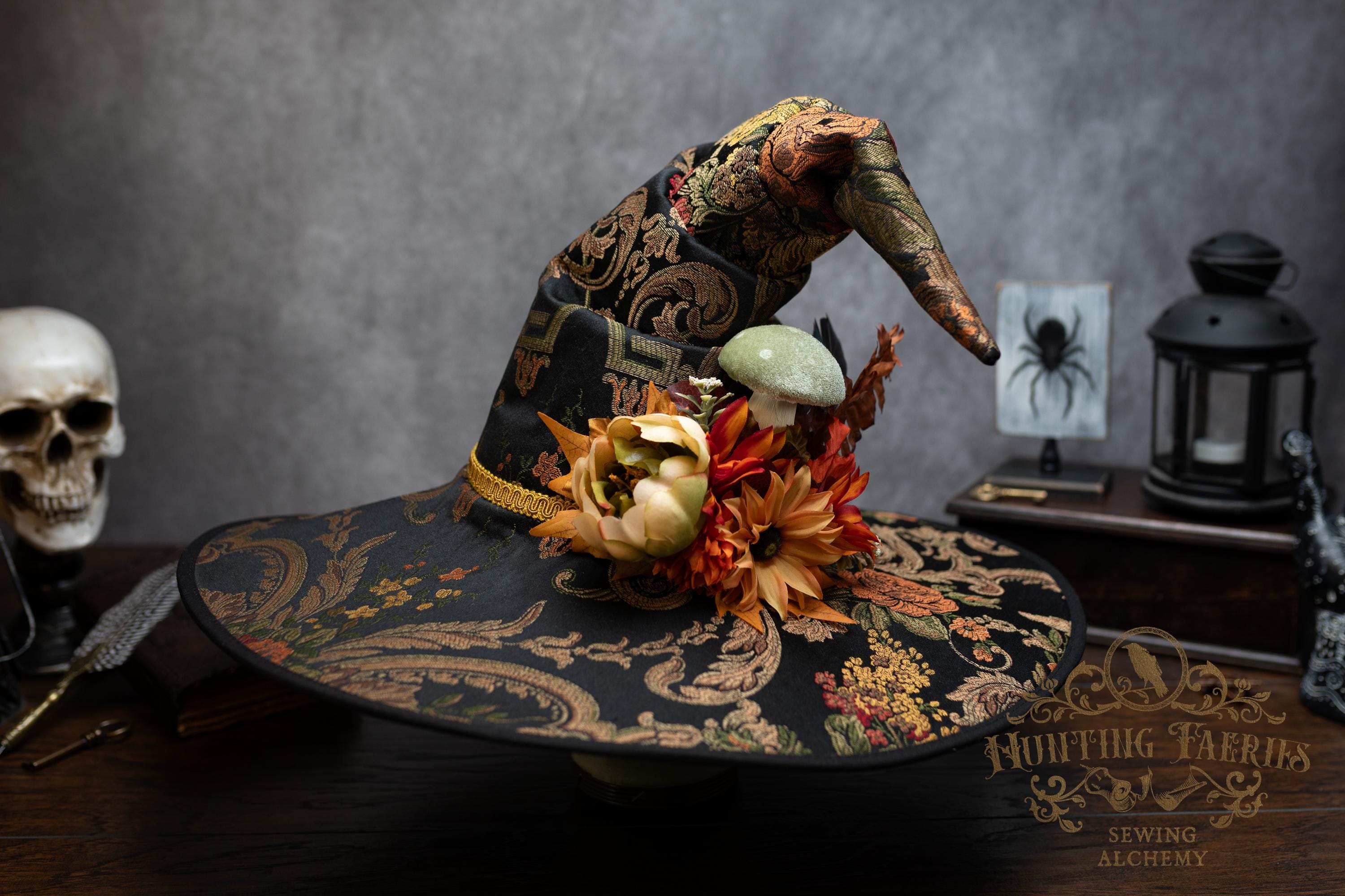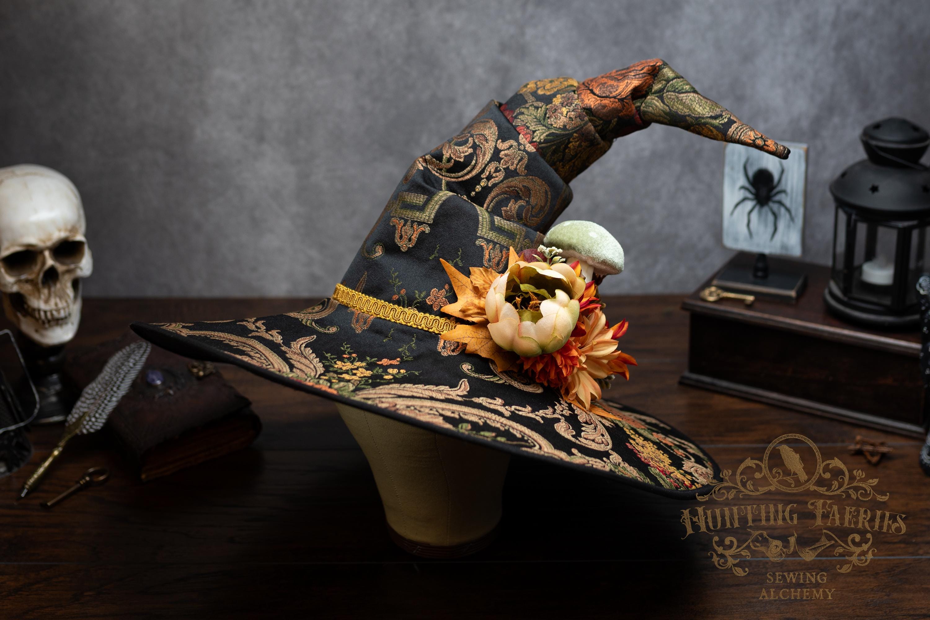 This handcrafted floral satin witch hat features a golden yellow band. At the side is a small bunch of flowers accenting the brocade fabric. This can be removed if you want to decorate it yourself and change up your look.
