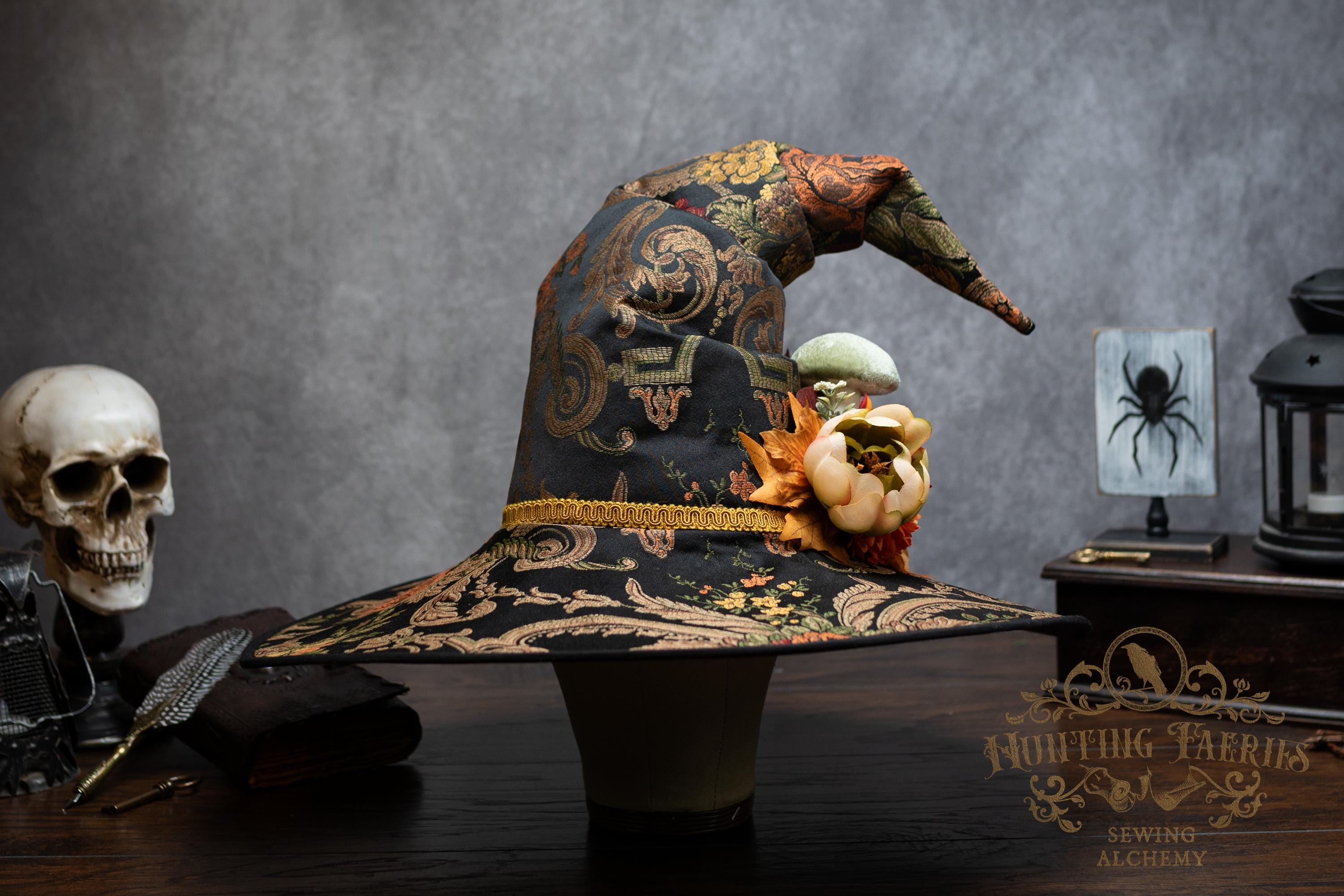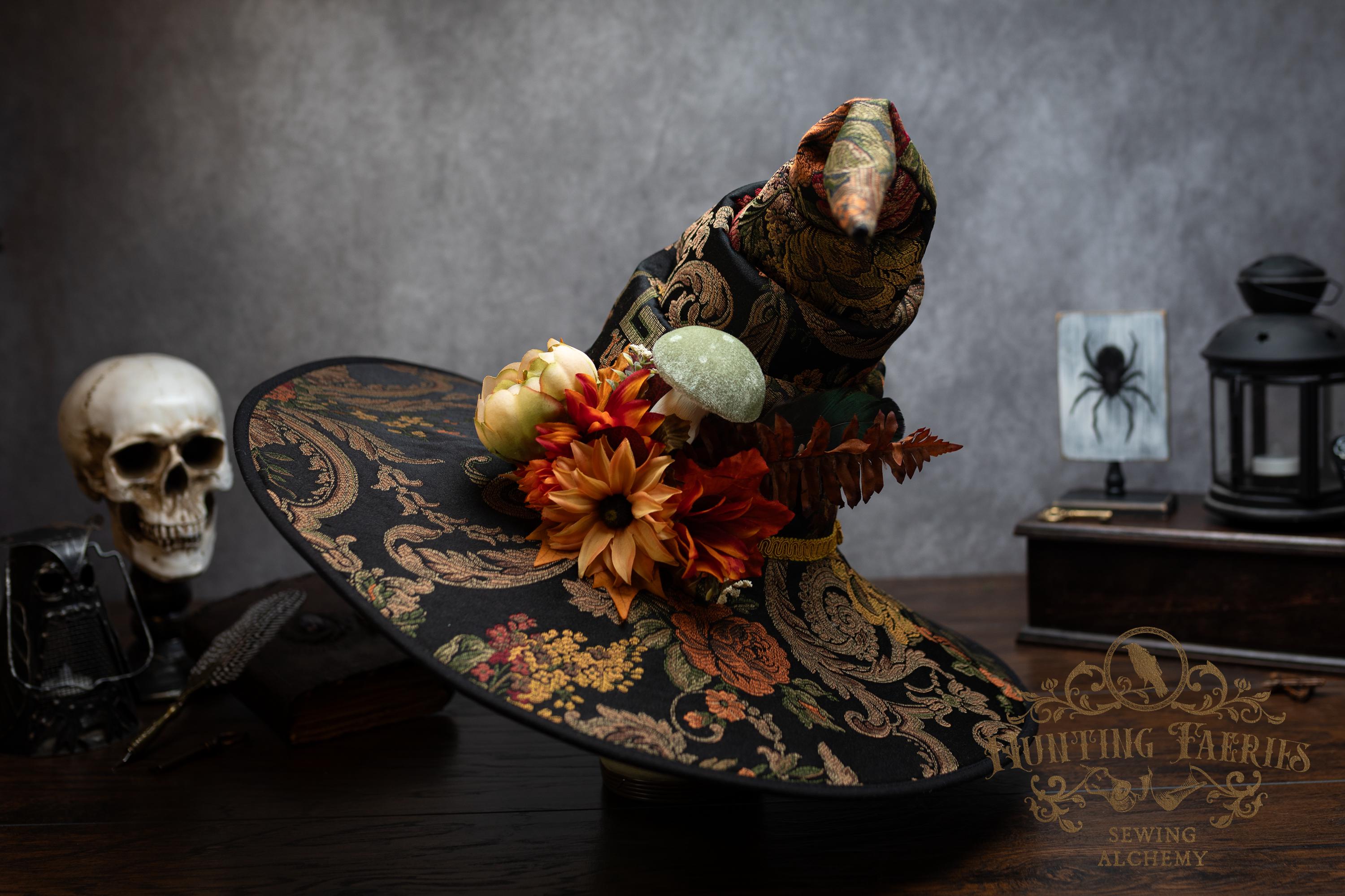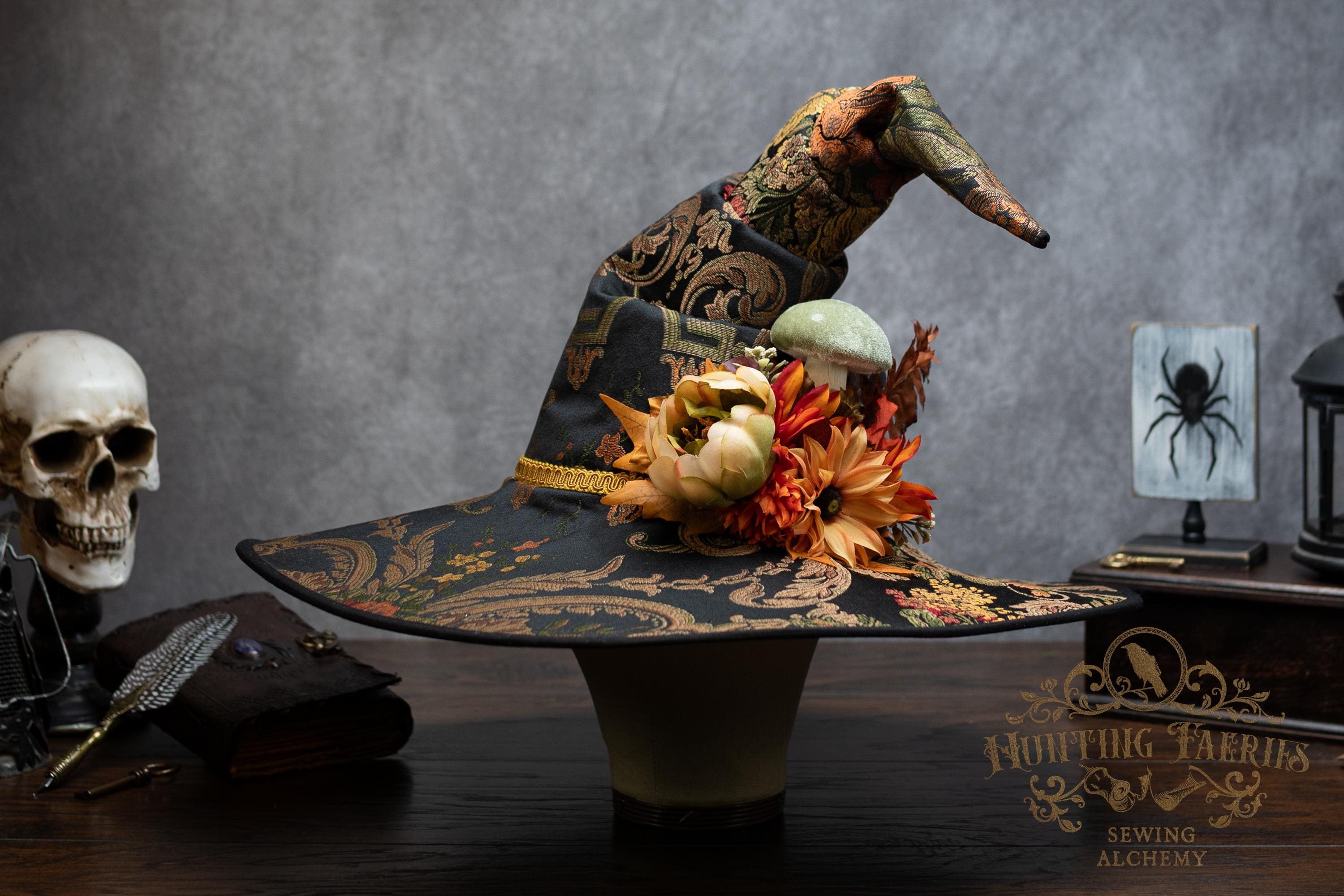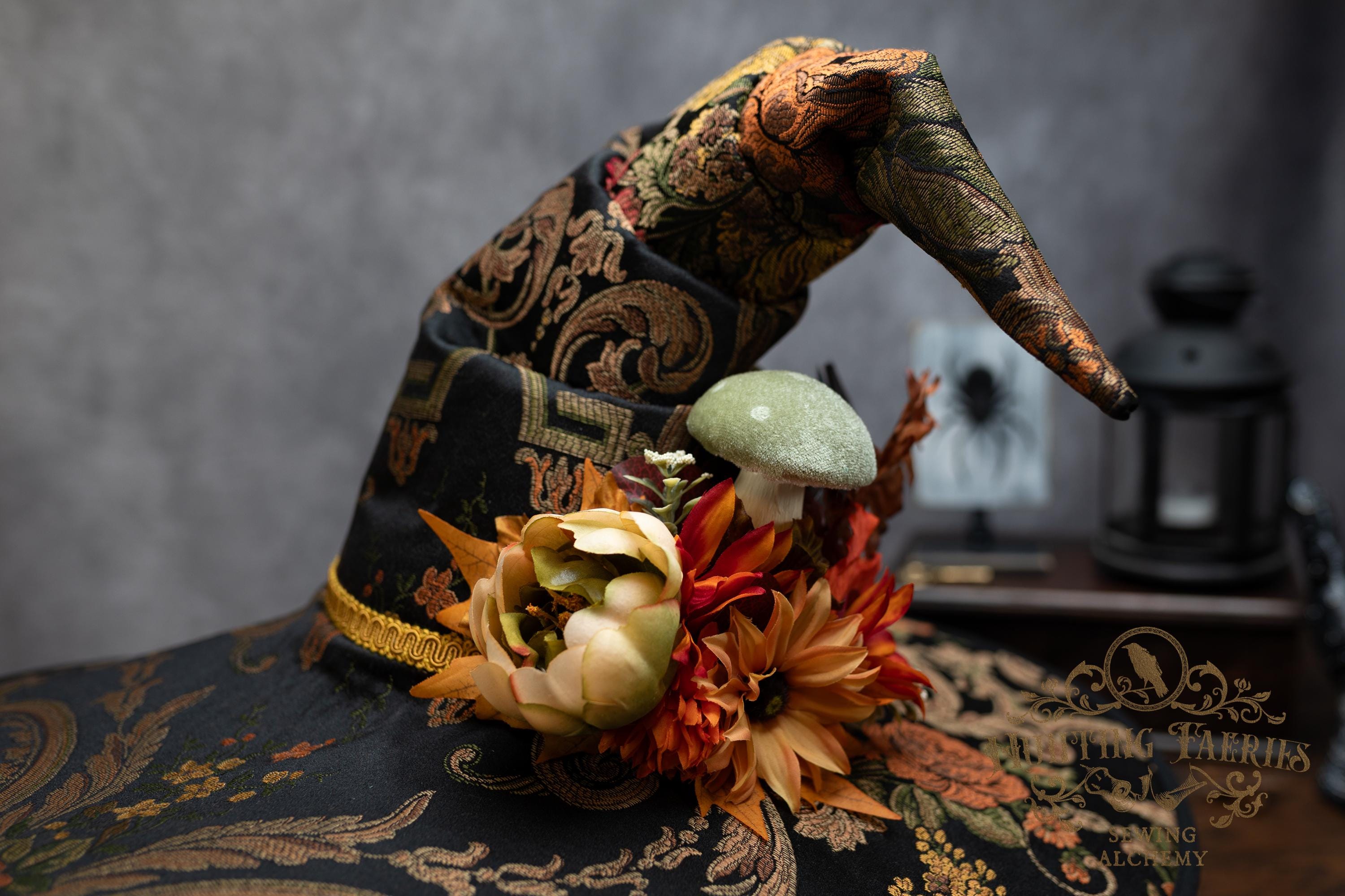 This handcrafted floral satin witch hat features a golden yellow band. At the side is a small bunch of flowers accenting the brocade fabric. This can be removed if you want to decorate it yourself and change up your look.
