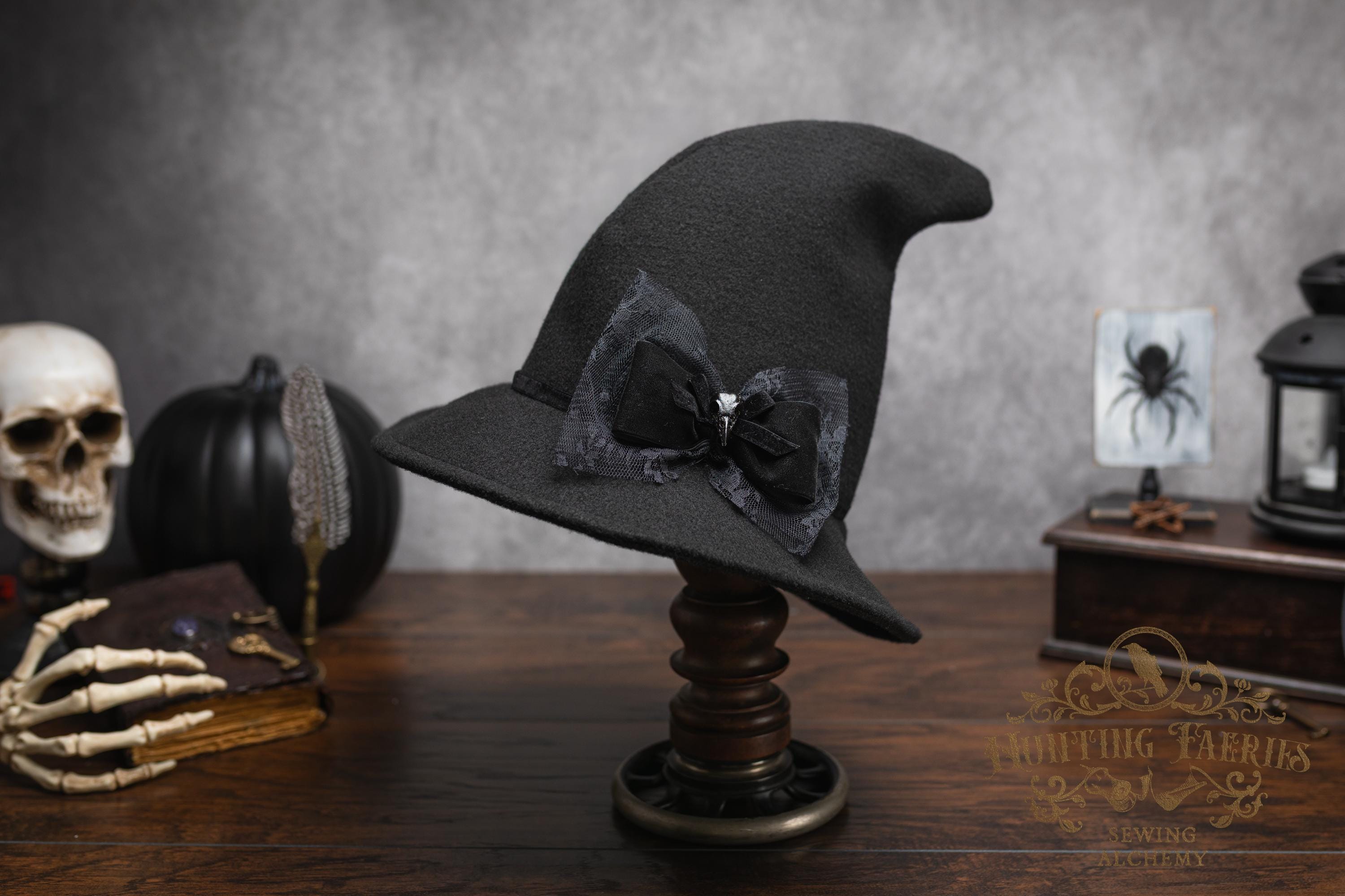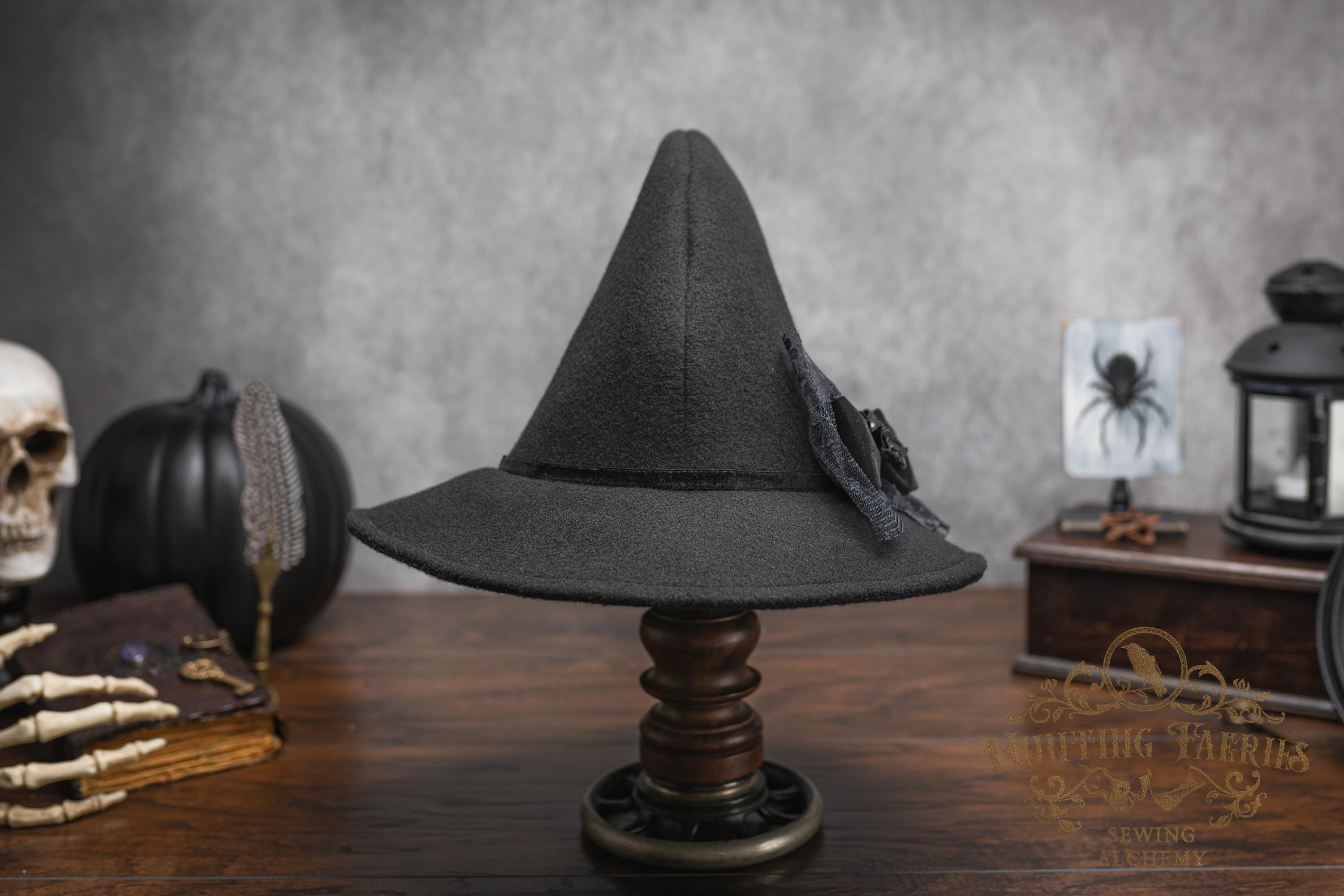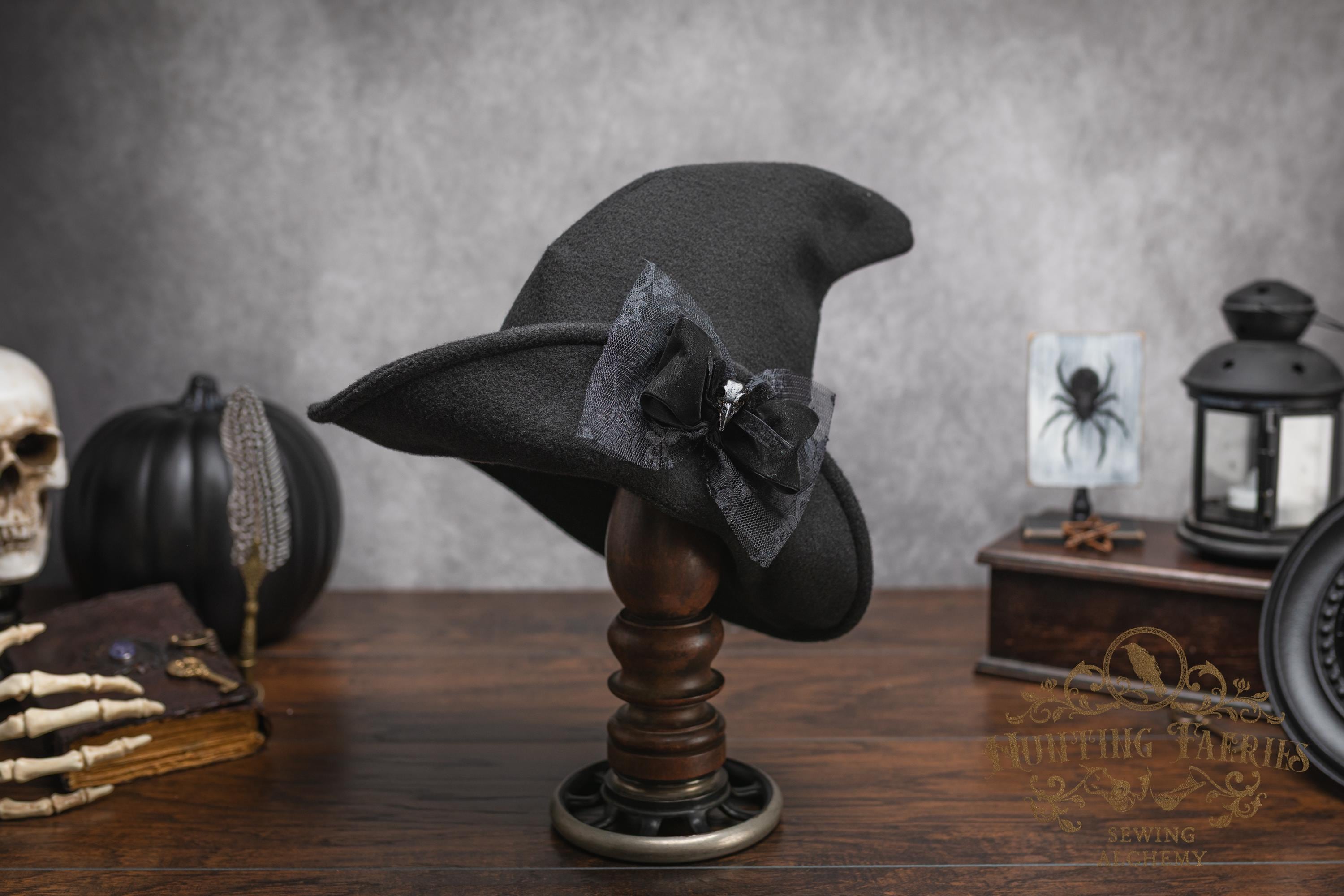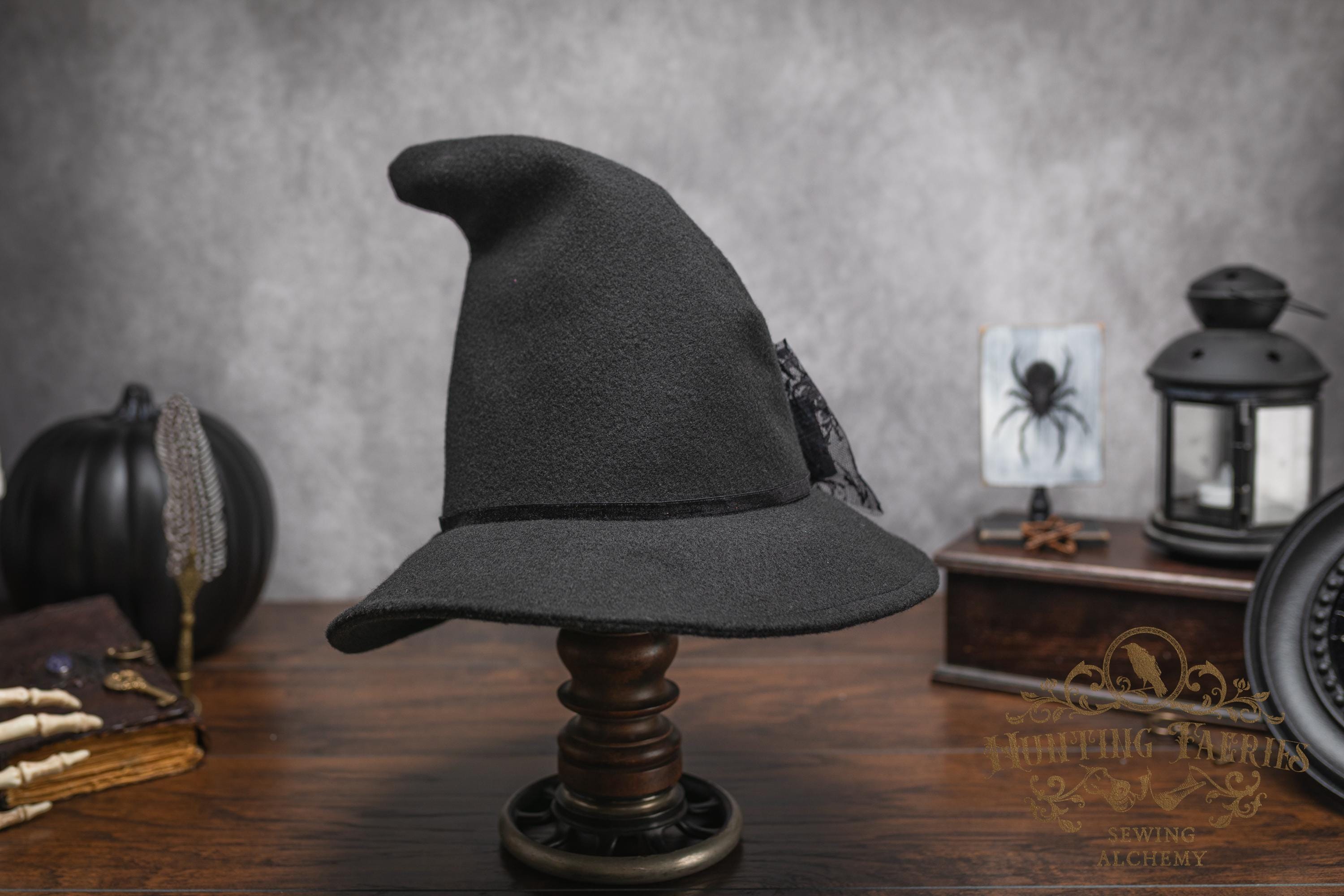This witch's hat is versatile, as it can be dressed up or down. It would be a great choice for your dark academia or cottagecore witch style ensemble. Its narrow brim gently curls up at the ends for a dramatic look, or you can fold it down to a gentle slope to cover your eyes. Inspired by the ancestors who hid in plain sight, it's an ode to a classic style hat. The vintage vibes are strong with this one. Great for a Halloween costume or everyday wear! The possibilities are only limited by your imagination!