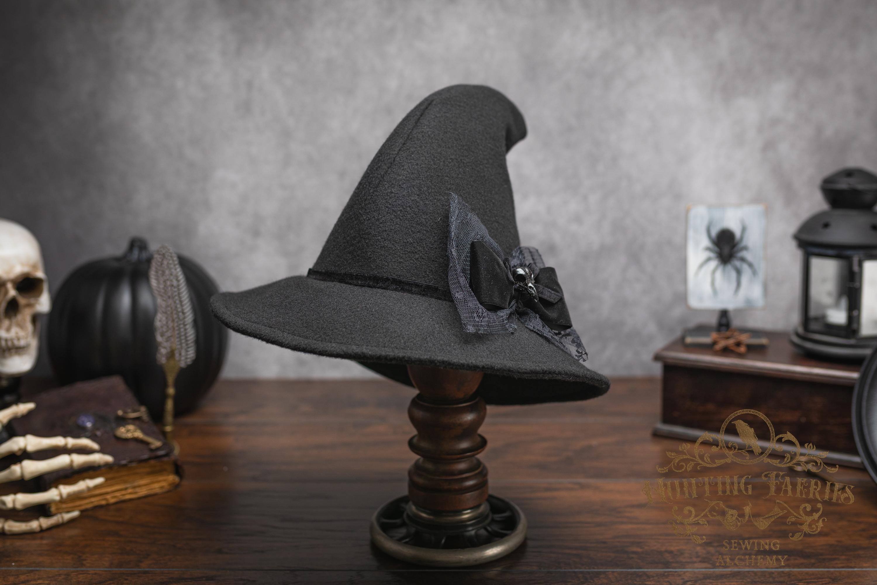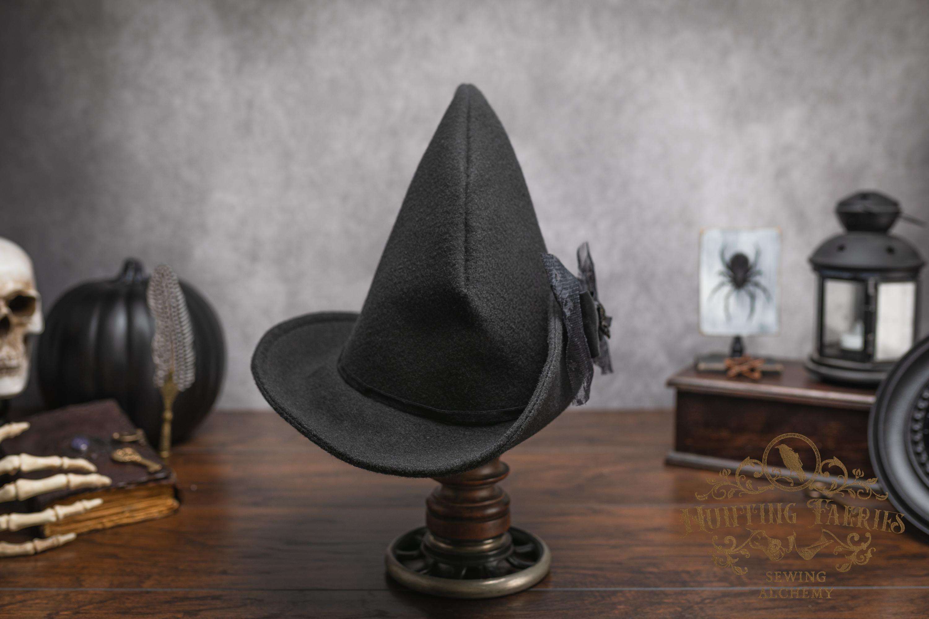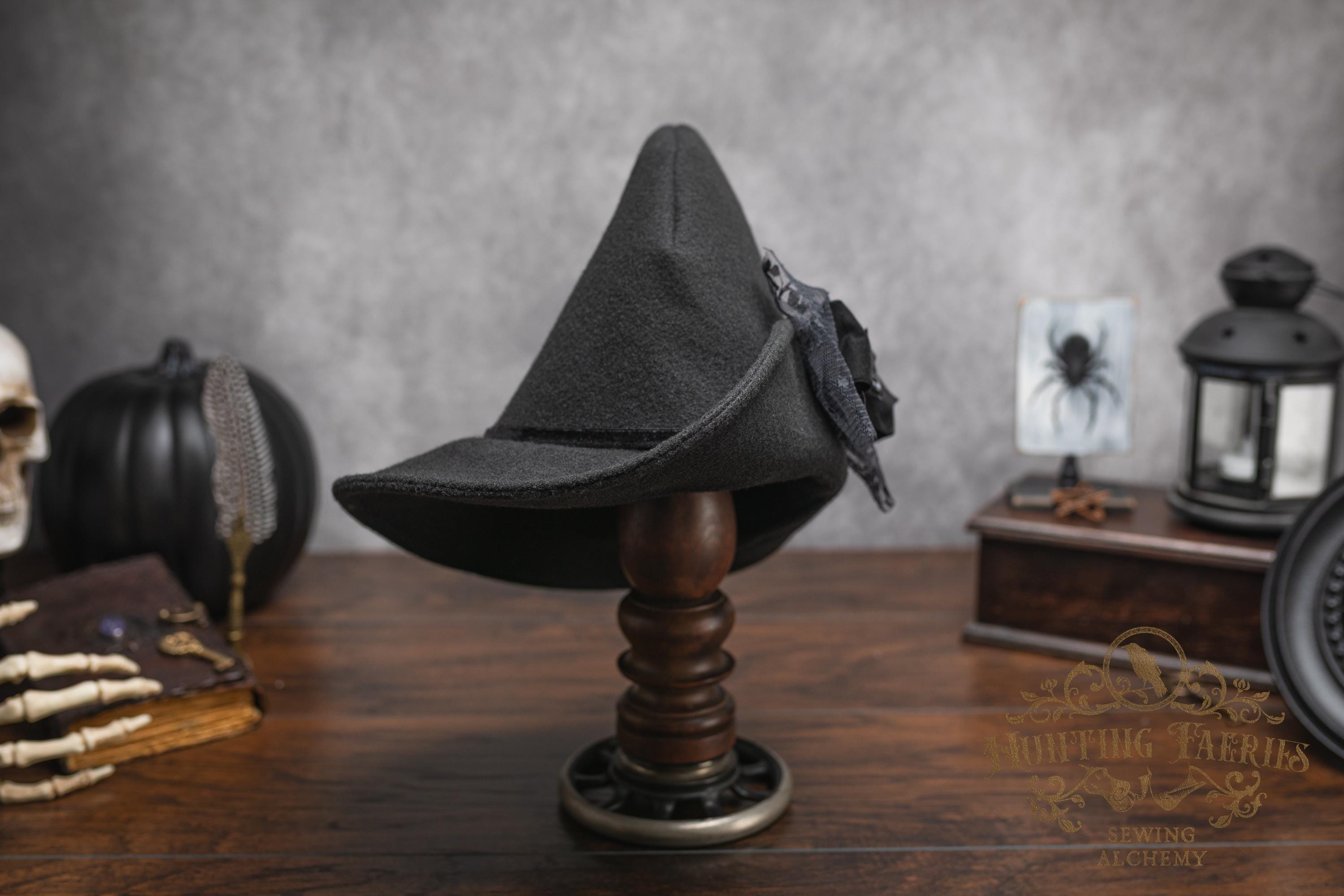 This witch's hat is versatile, as it can be dressed up or down. It would be a great choice for your dark academia or cottagecore witch style ensemble. Its narrow brim gently curls up at the ends for a dramatic look, or you can fold it down to a gentle slope to cover your eyes. Inspired by the ancestors who hid in plain sight, it's an ode to a classic style hat. The vintage vibes are strong with this one. Great for a Halloween costume or everyday wear! The possibilities are only limited by your imagination!