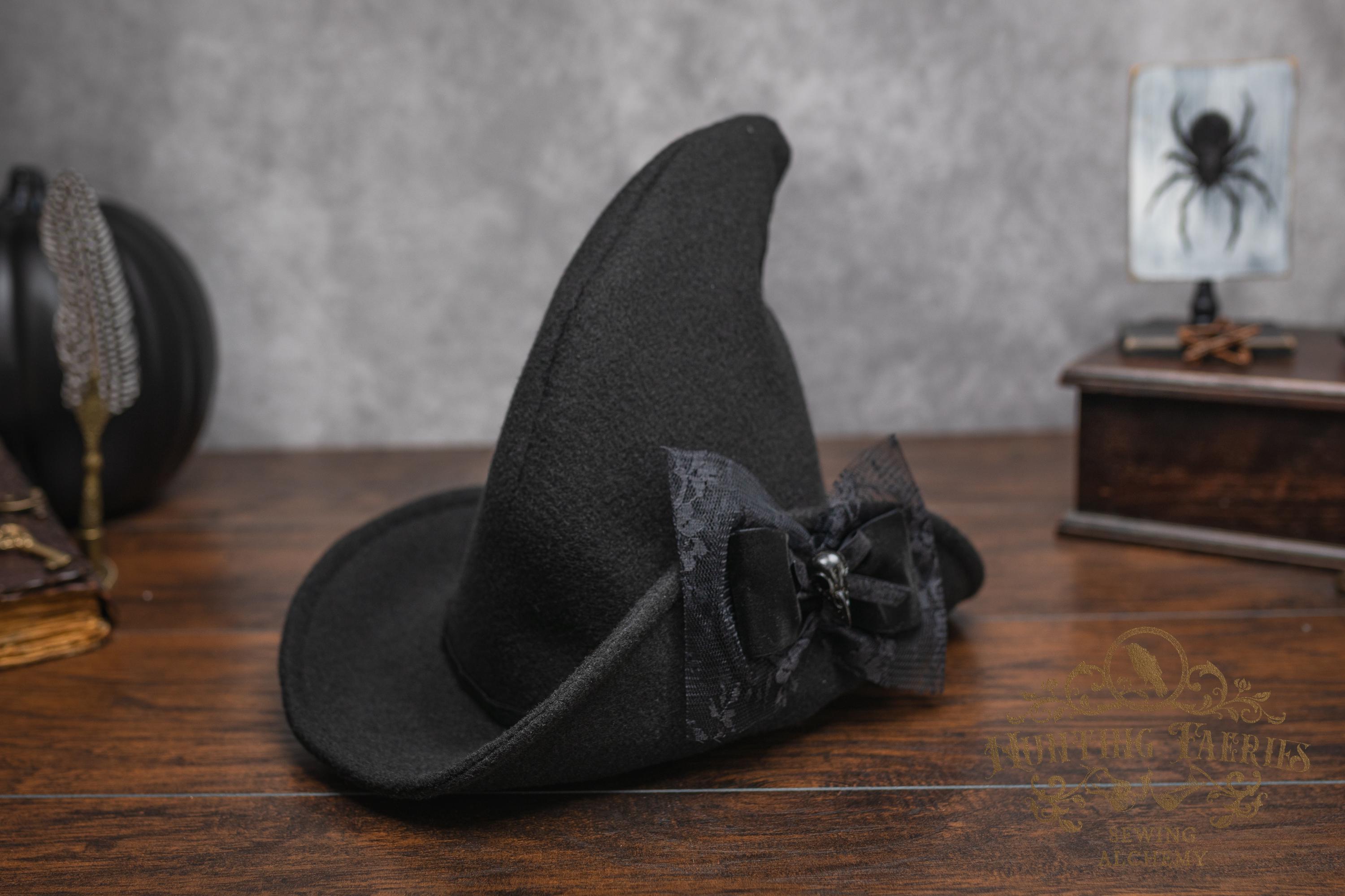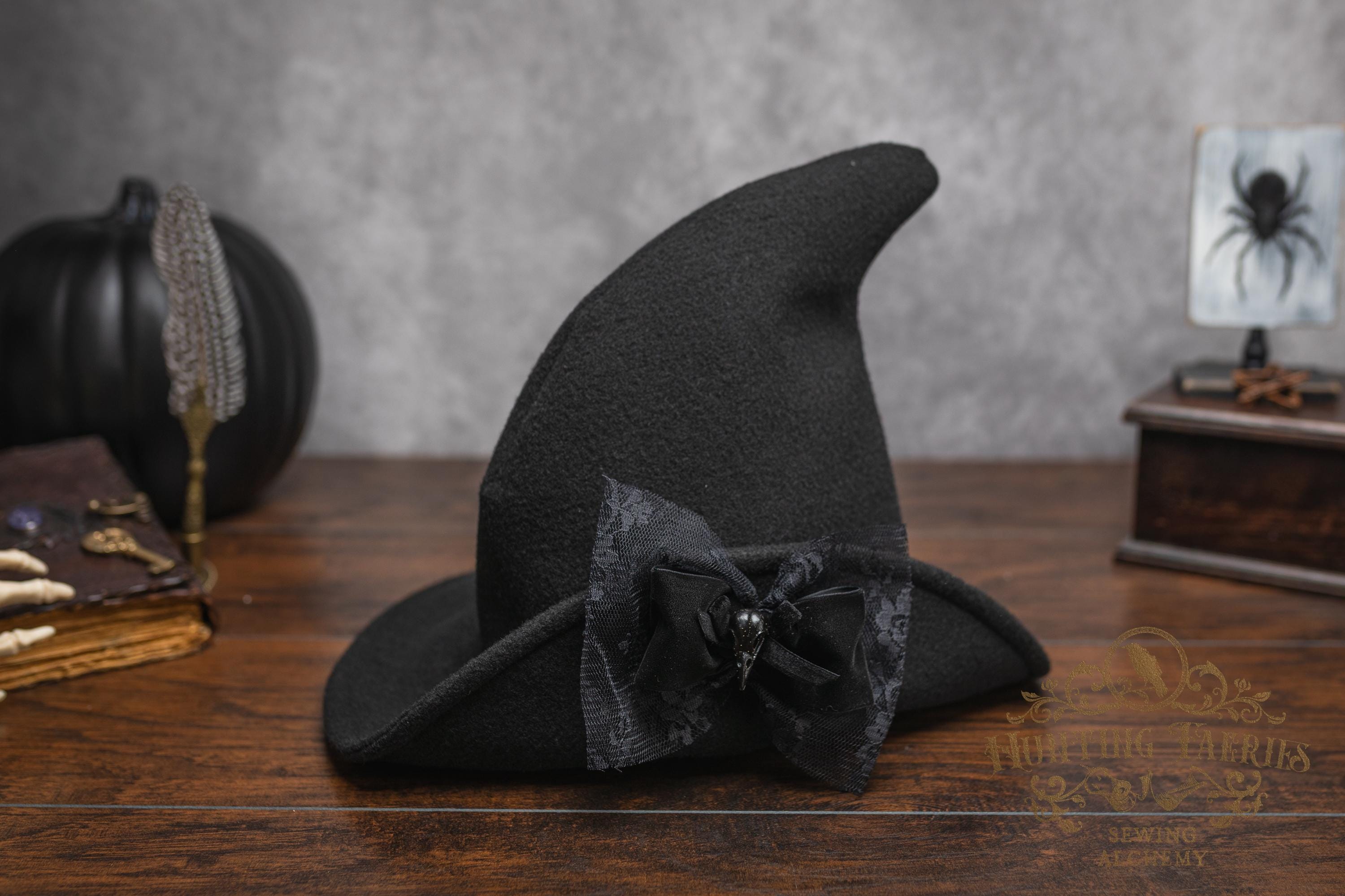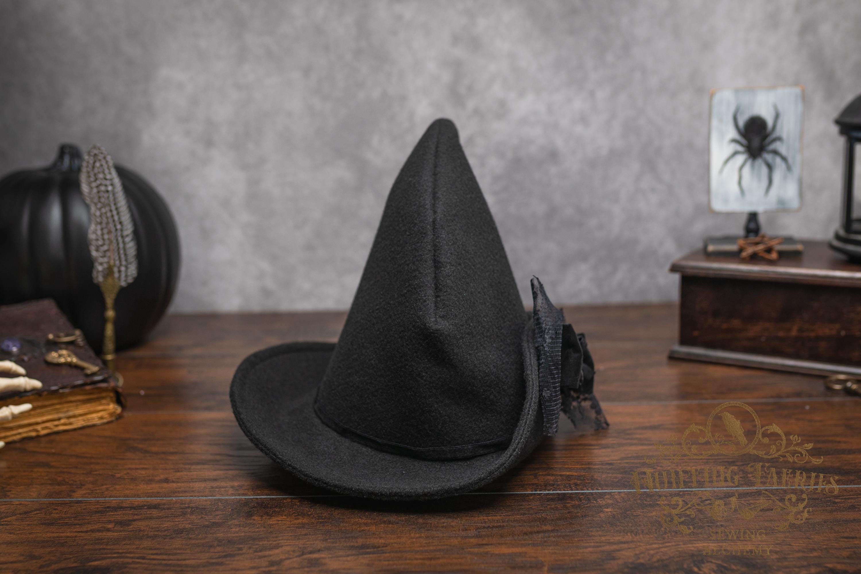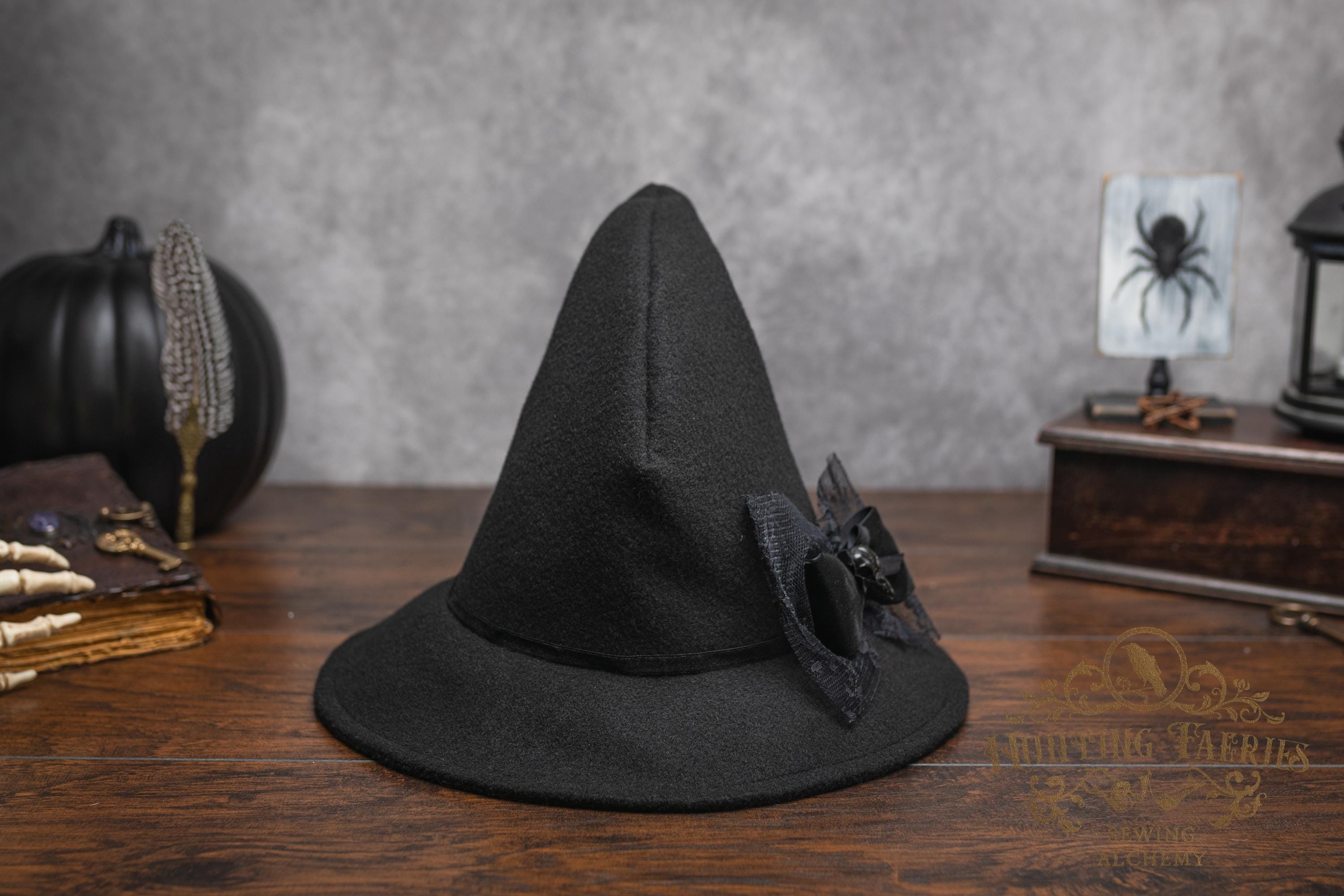 This witch's hat is versatile, as it can be dressed up or down. It would be a great choice for your dark academia or cottagecore witch style ensemble. Its narrow brim gently curls up at the ends for a dramatic look, or you can fold it down to a gentle slope to cover your eyes. Inspired by the ancestors who hid in plain sight, it's an ode to a classic style hat. The vintage vibes are strong with this one. Great for a Halloween costume or everyday wear! The possibilities are only limited by your imagination!
