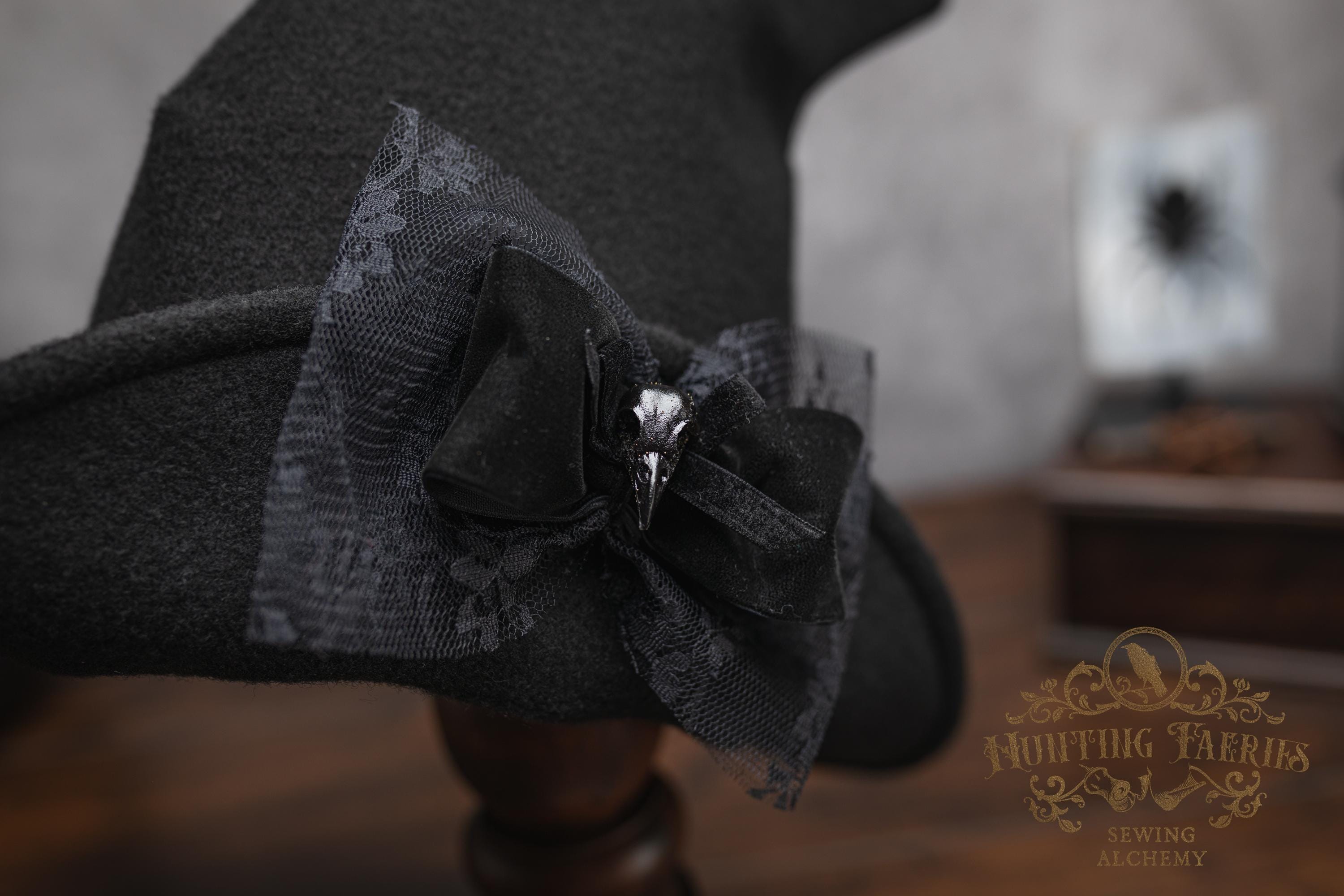 This cloche-style witch hat is made of black, eco-friendly felt. This black witches' hat is a modern twist on a vintage style. The velvet ribbon is 1/4" thin black with a matching lace and velvet bow. At its center is a black bird skull. (Made from resin.)