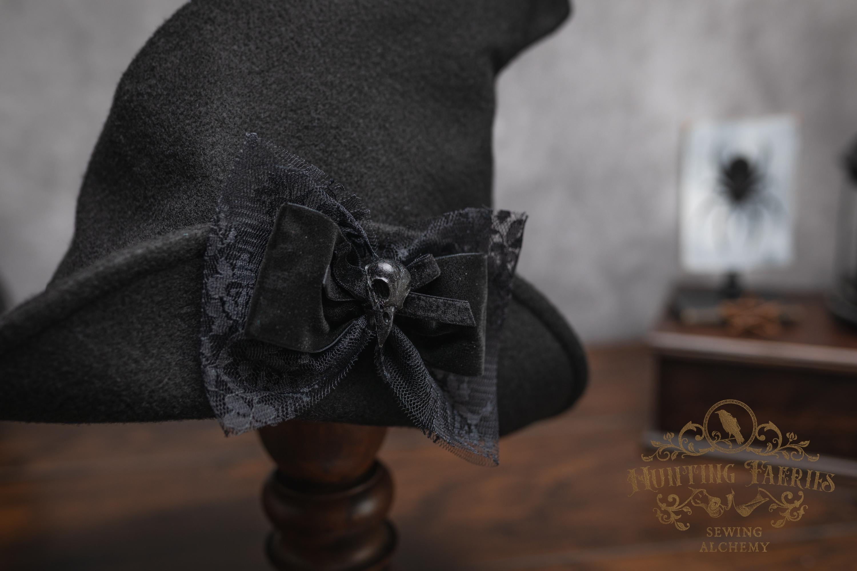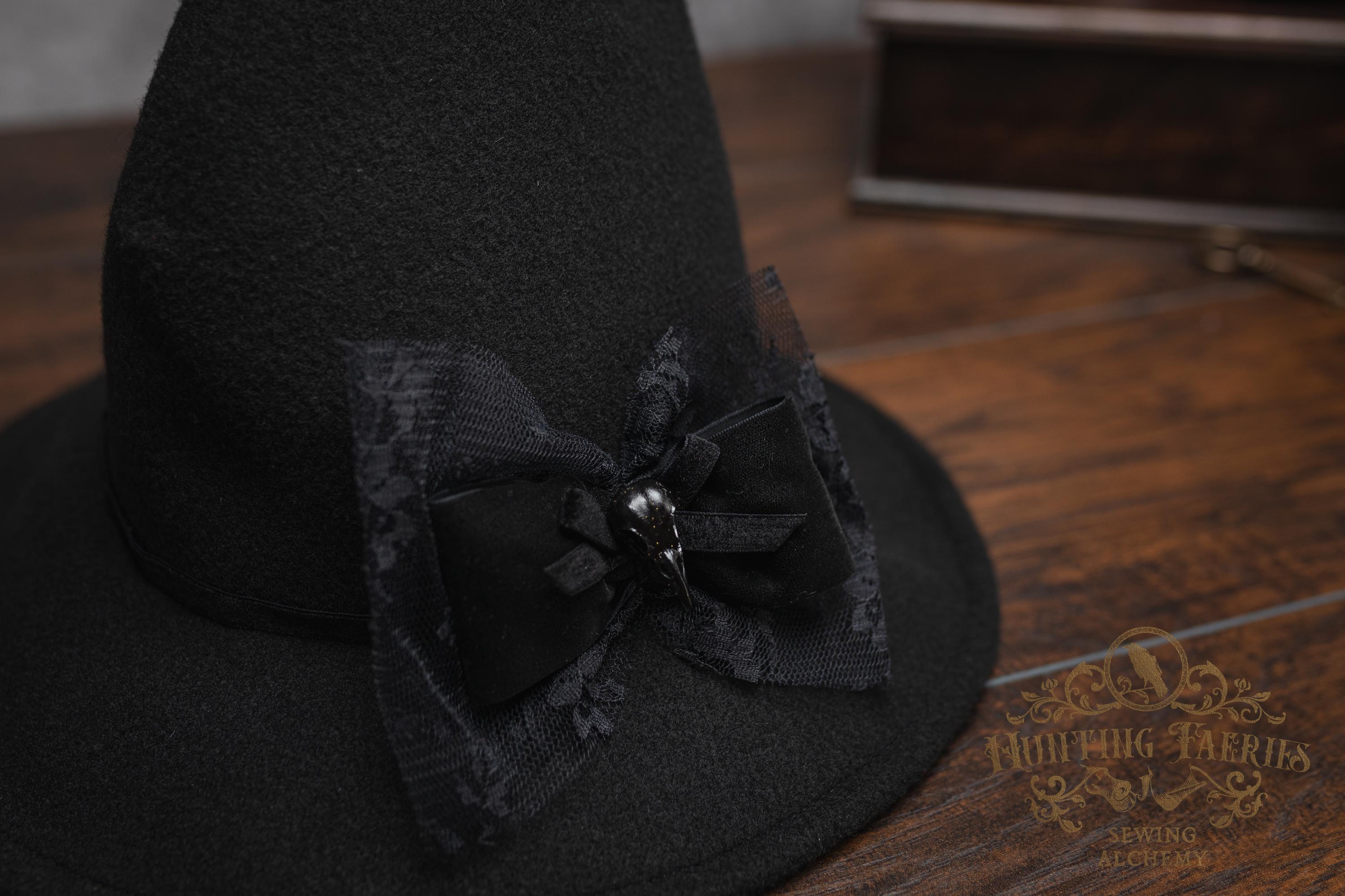 This cloche-style witch hat is made of black, eco-friendly felt. This black witches' hat is a modern twist on a vintage style. The velvet ribbon is 1/2" thick black with a matching lace and velvet bow. At its center is a black bird skull. (Made from resin.)