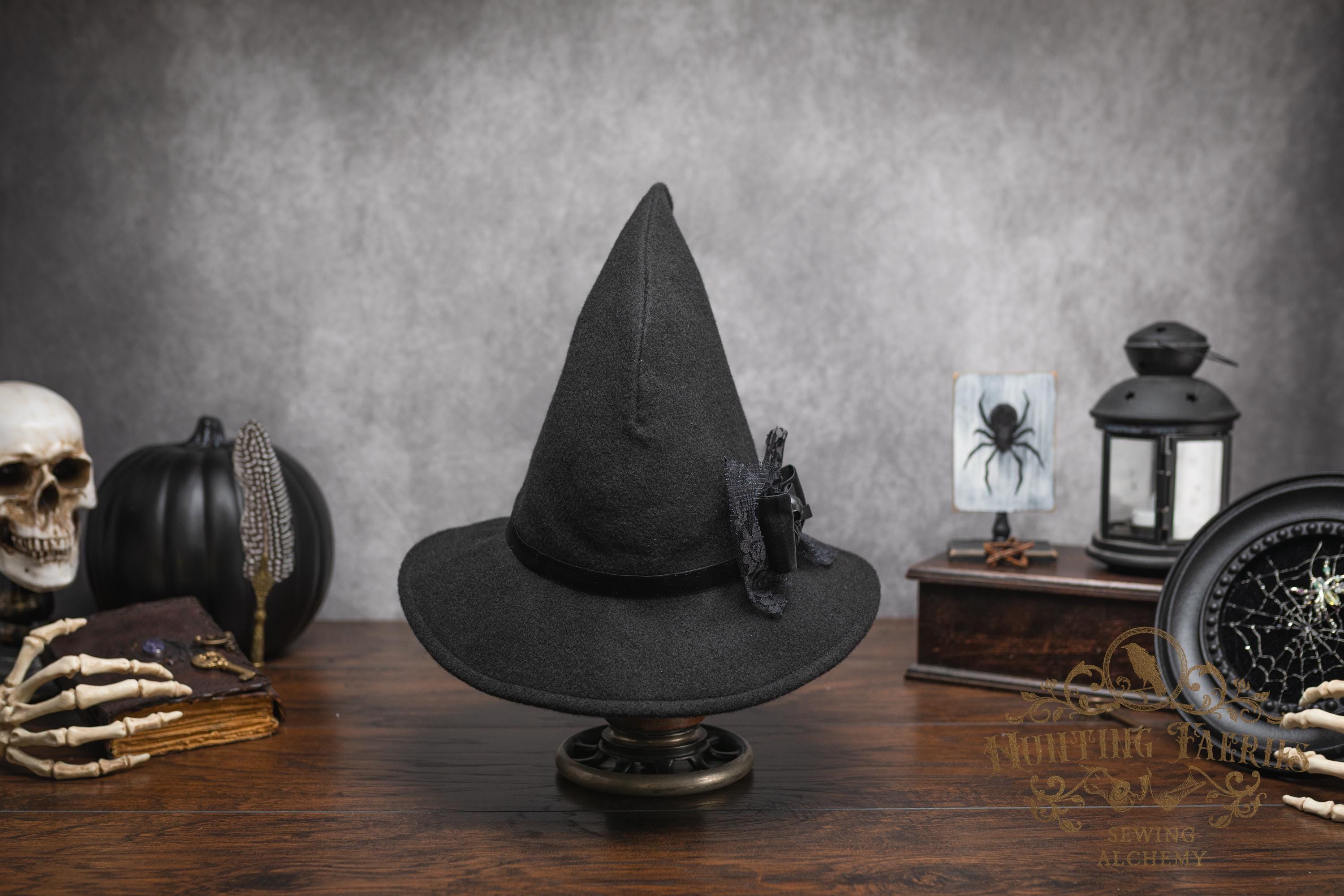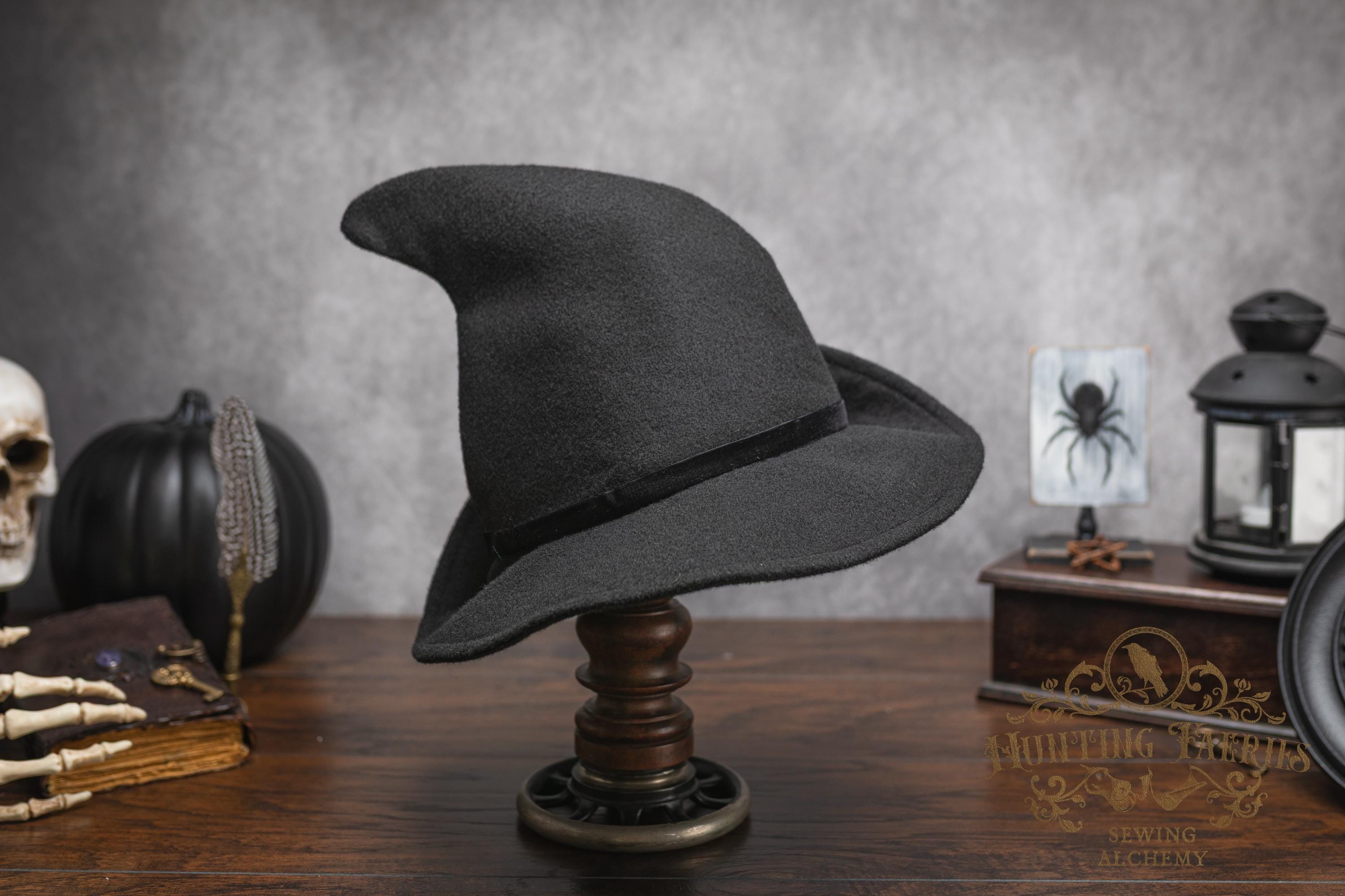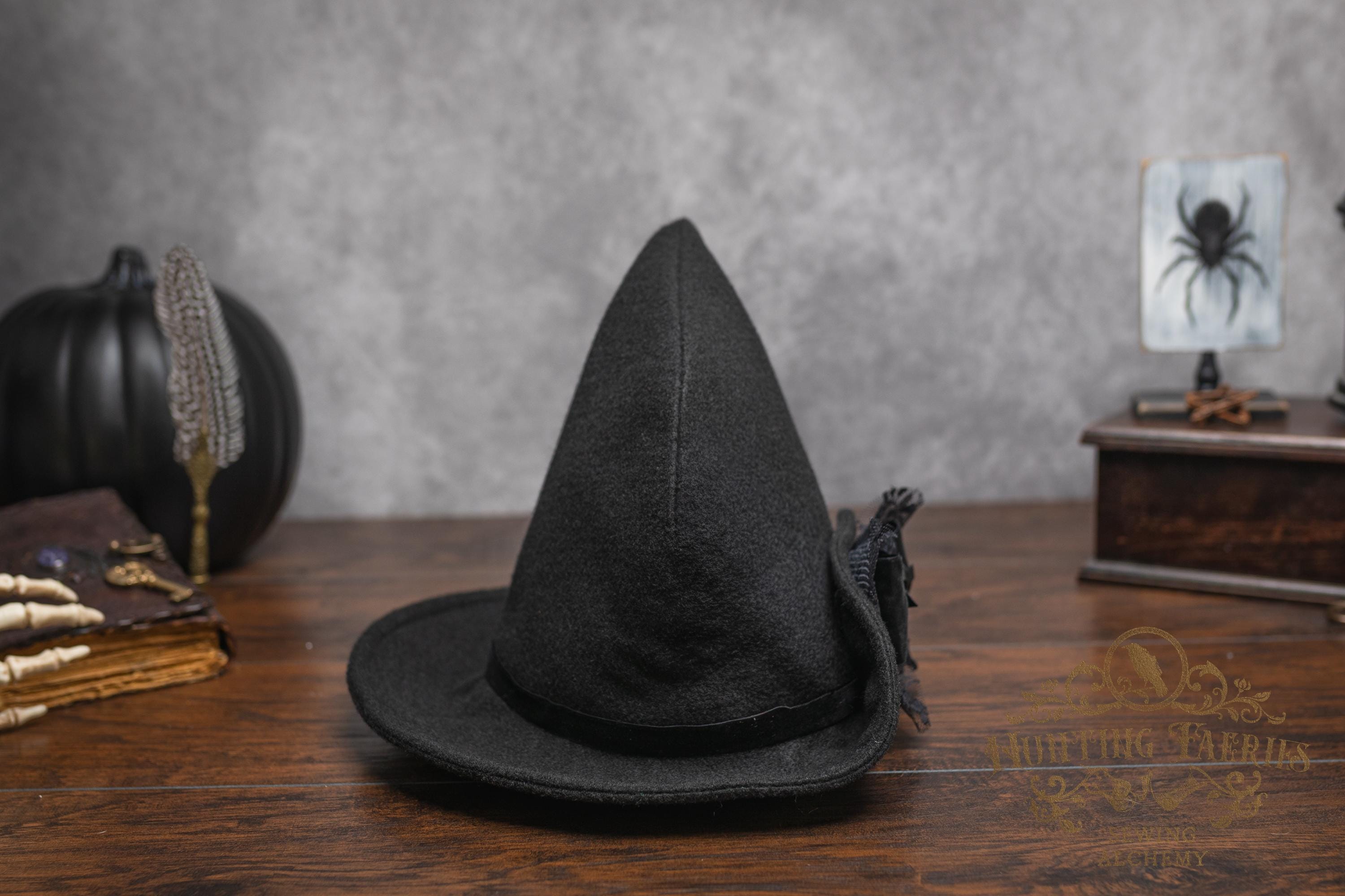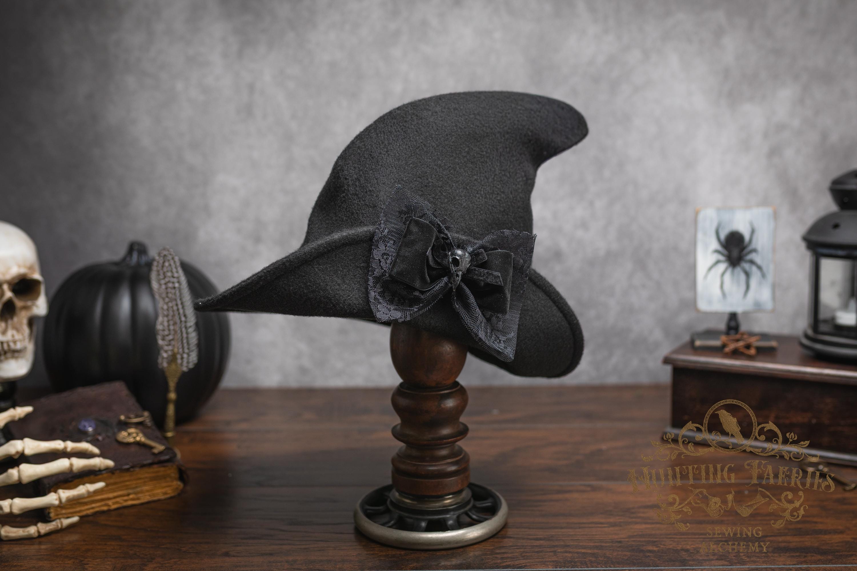 This witch's hat is versatile, as it can be dressed up or down. It would be a great choice for your dark academia or cottagecore witch style ensemble. Its narrow brim gently curls up at the ends for a dramatic look, or you can fold it down to a gentle slope to cover your eyes. Inspired by the ancestors who hid in plain sight, it's an ode to a classic style hat. The vintage vibes are strong with this one. Great for a Halloween costume or everyday wear! The possibilities are only limited by your imagination!