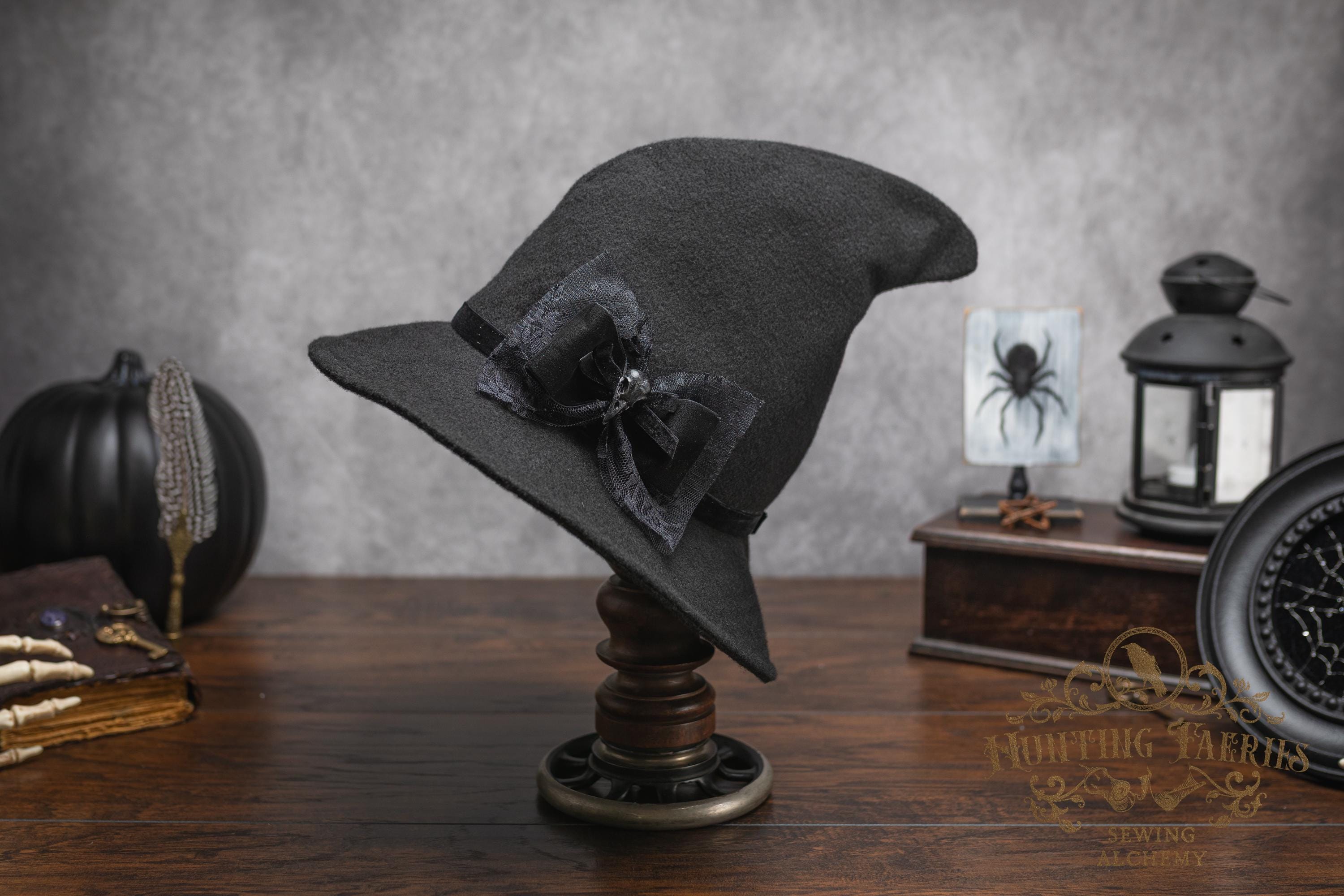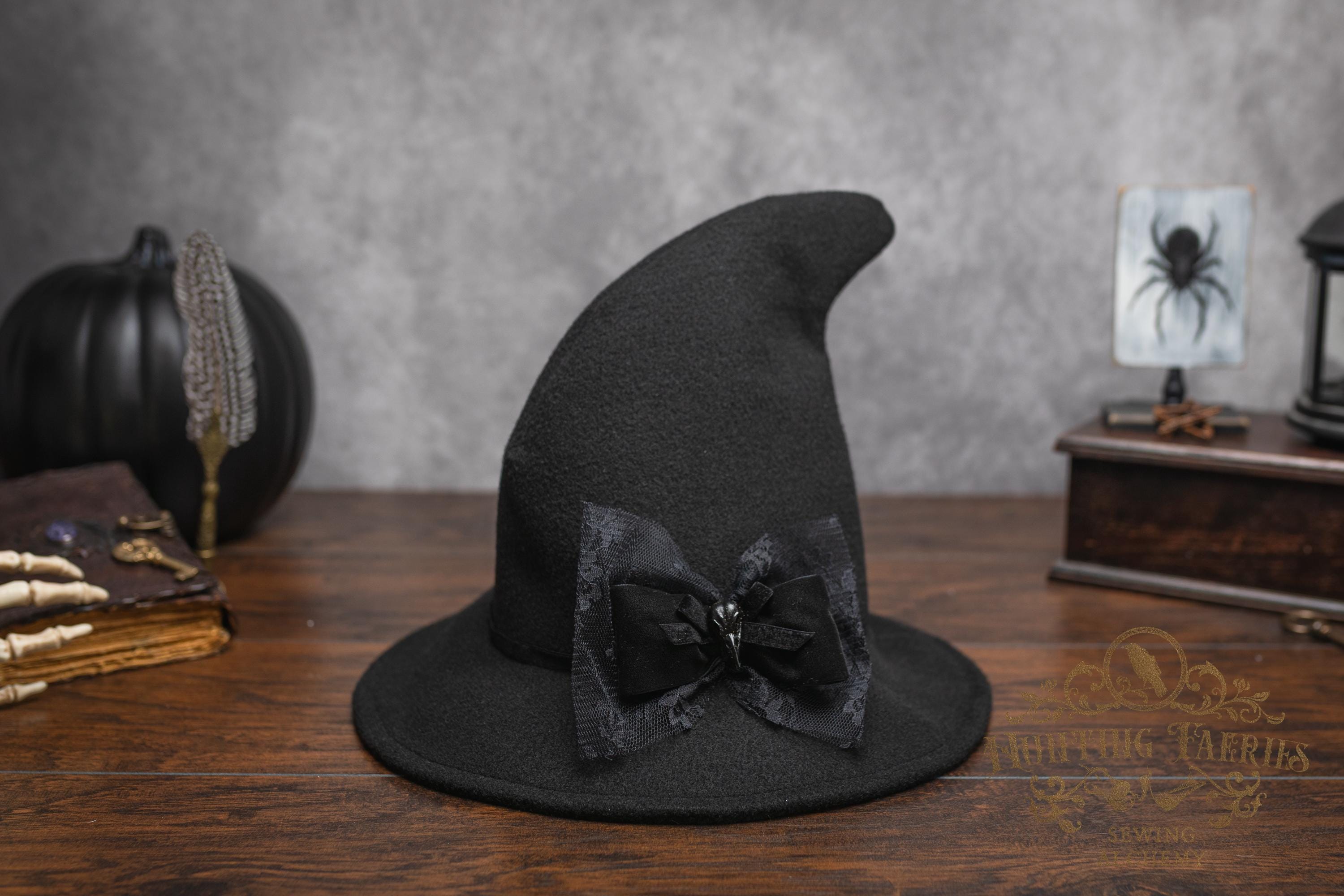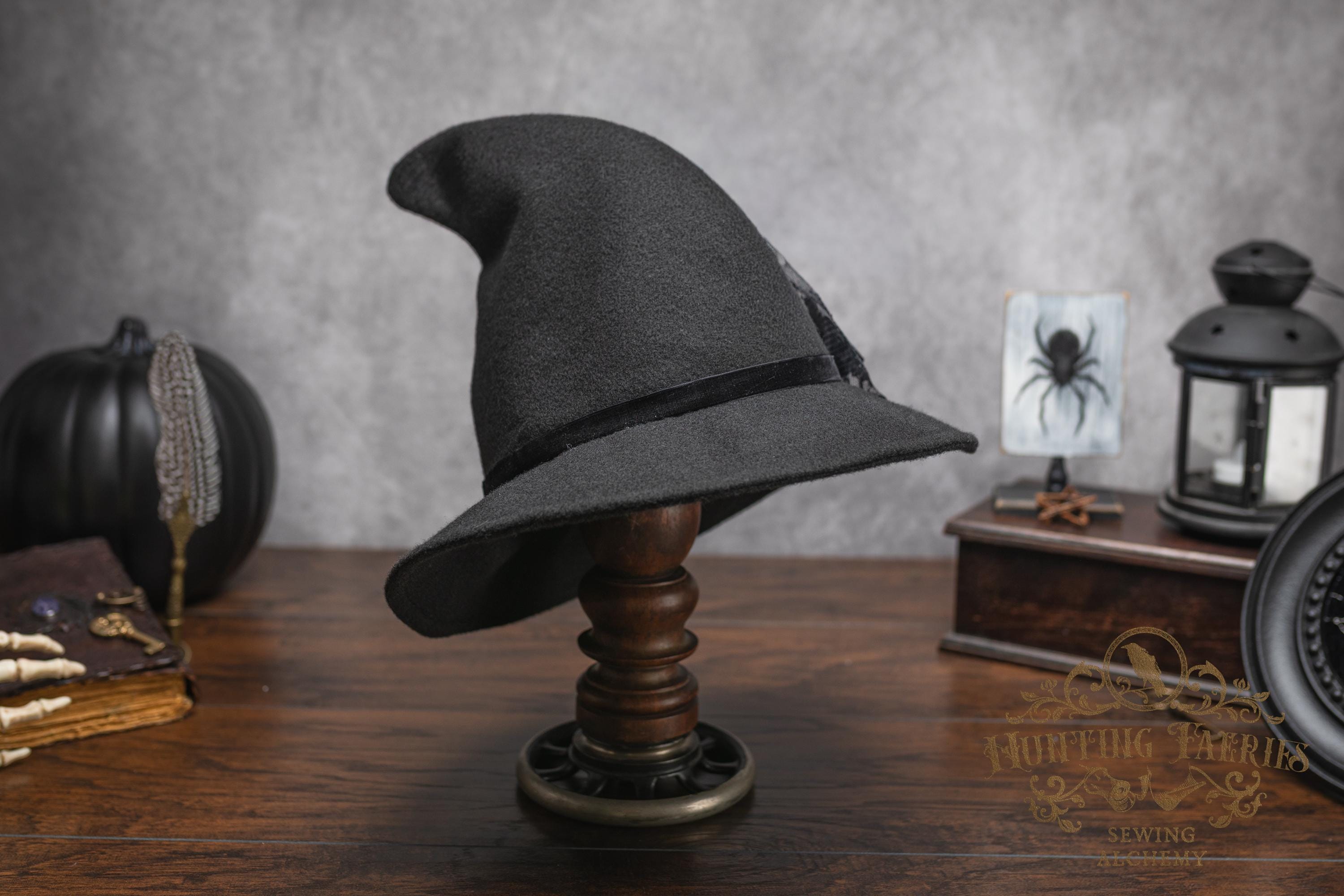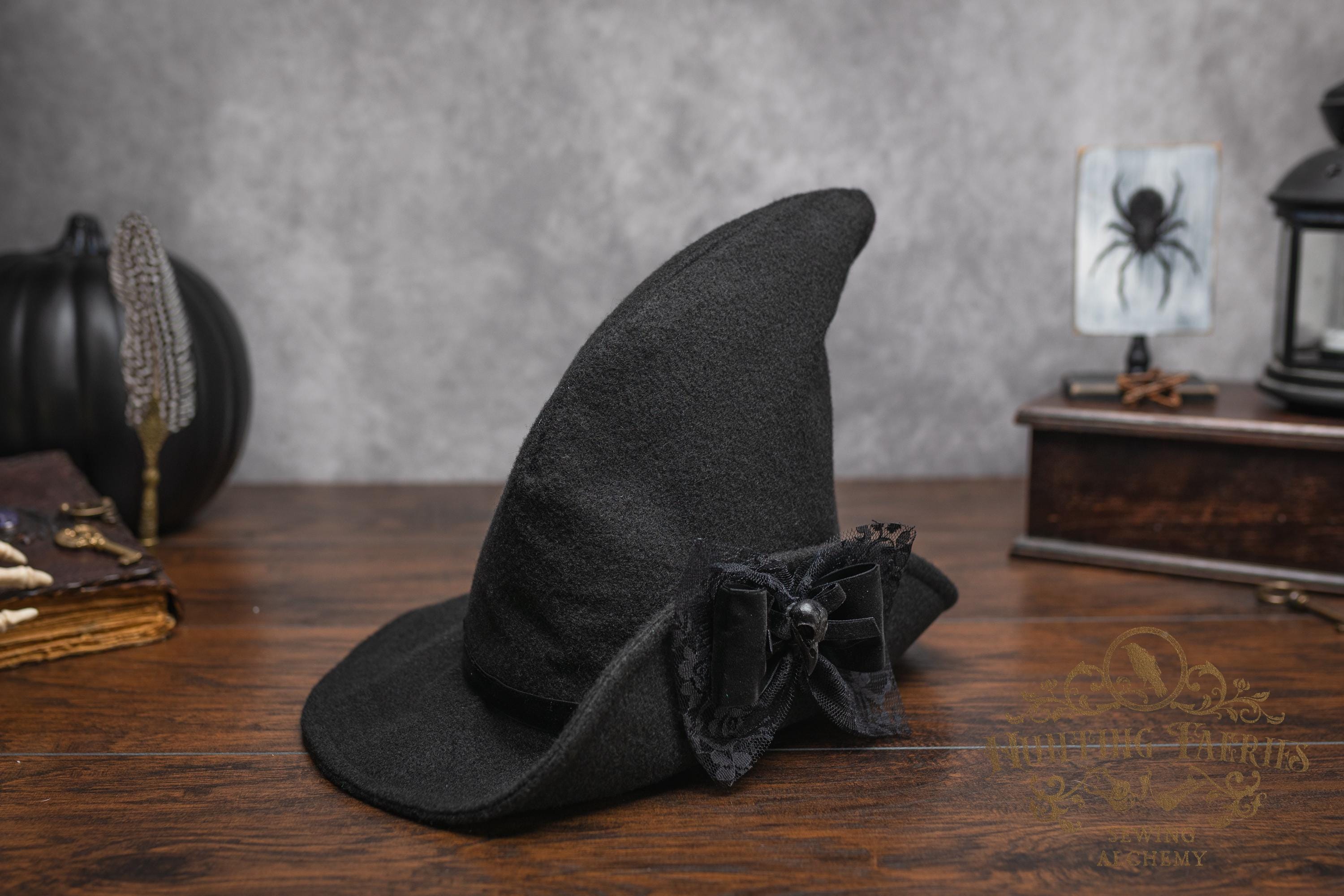 This witch's hat is versatile, as it can be dressed up or down. It would be a great choice for your dark academia or cottagecore witch style ensemble. Its narrow brim gently curls up at the ends for a dramatic look, or you can fold it down to a gentle slope to cover your eyes. Inspired by the ancestors who hid in plain sight, it's an ode to a classic style hat. The vintage vibes are strong with this one. Great for a Halloween costume or everyday wear! The possibilities are only limited by your imagination!