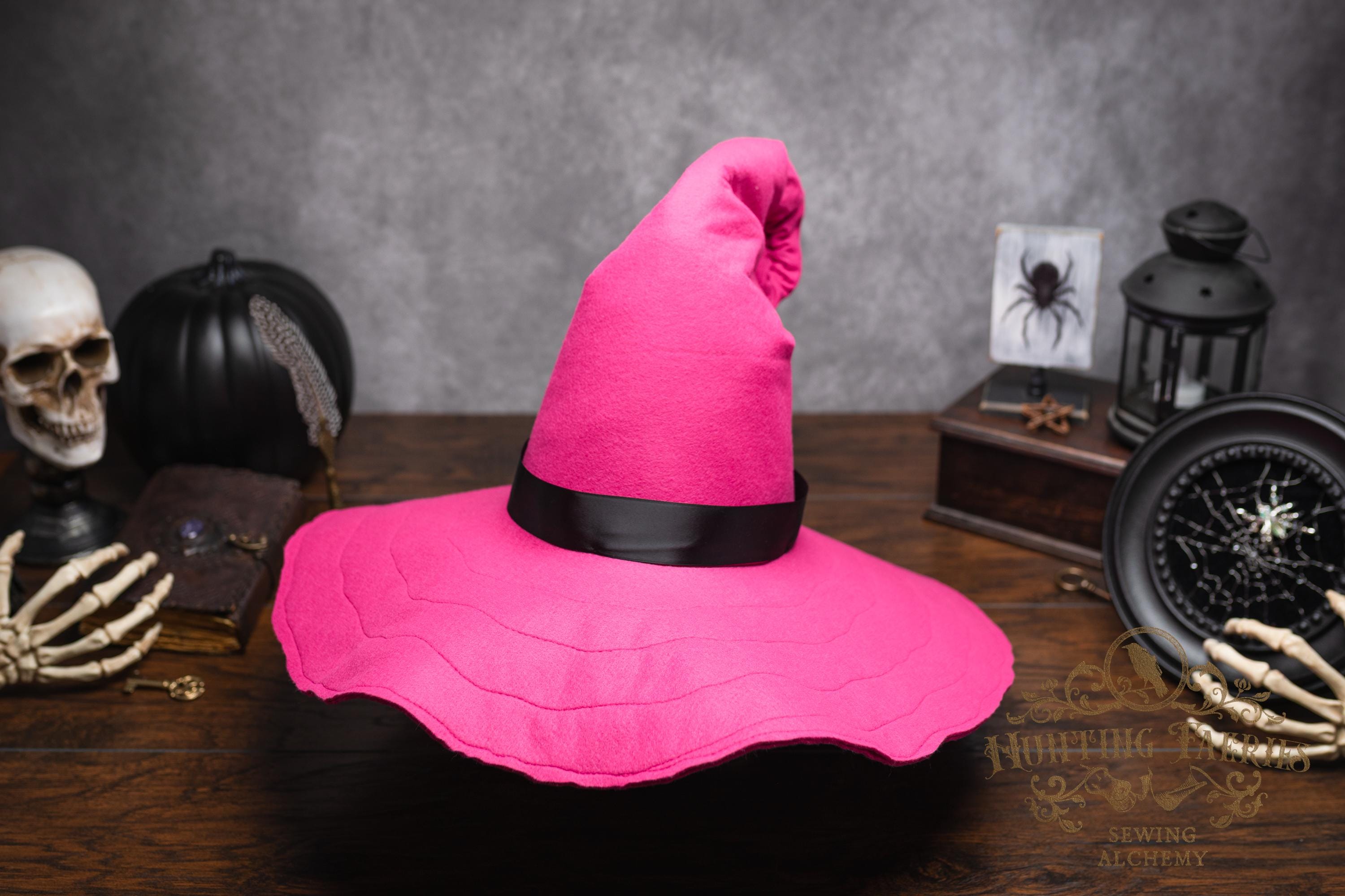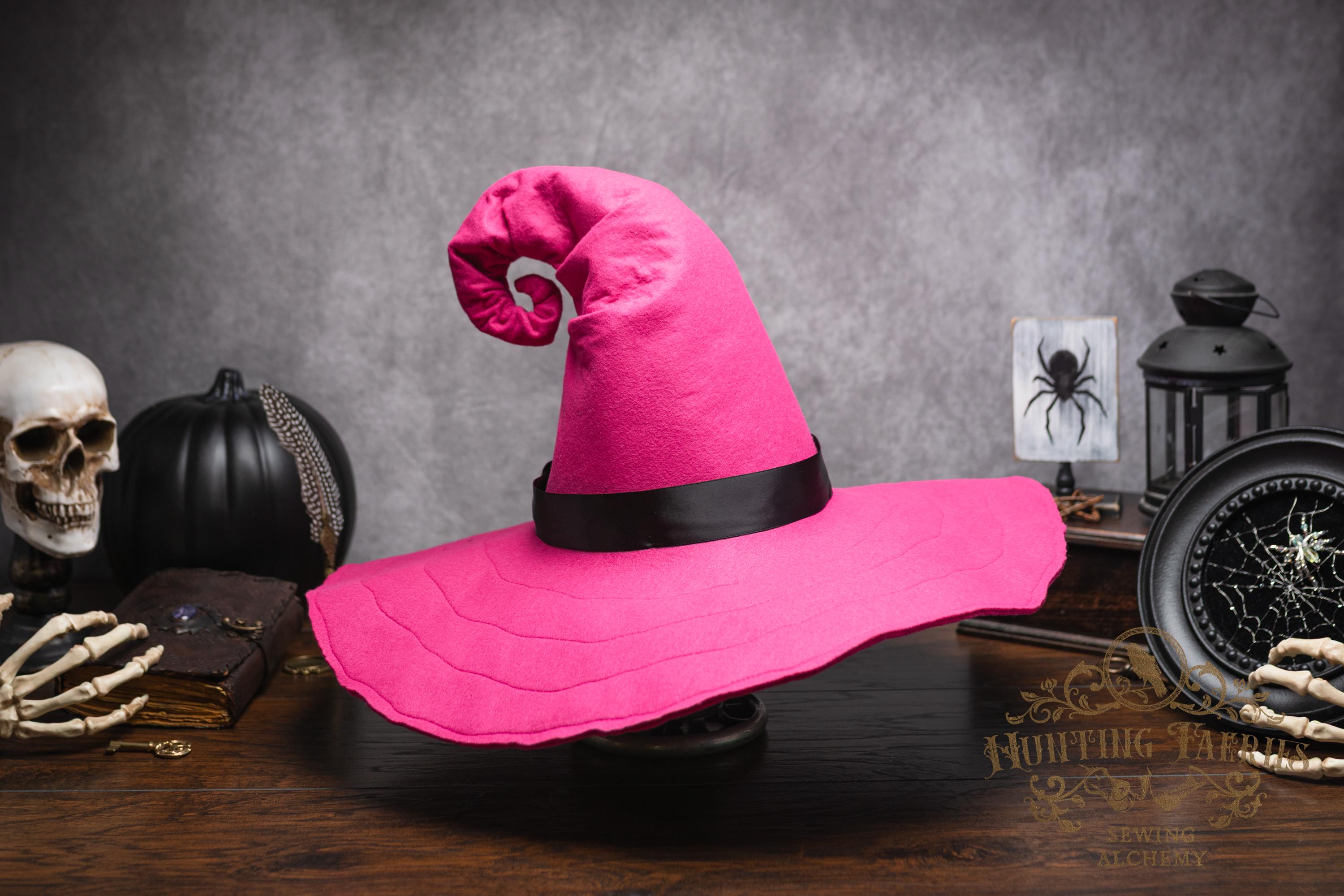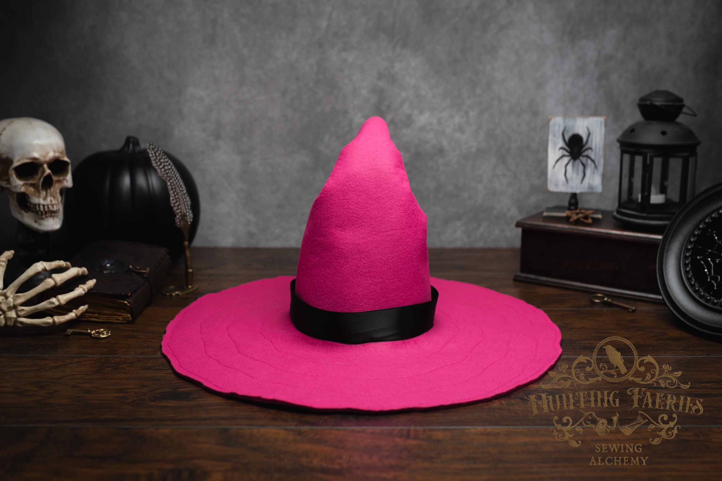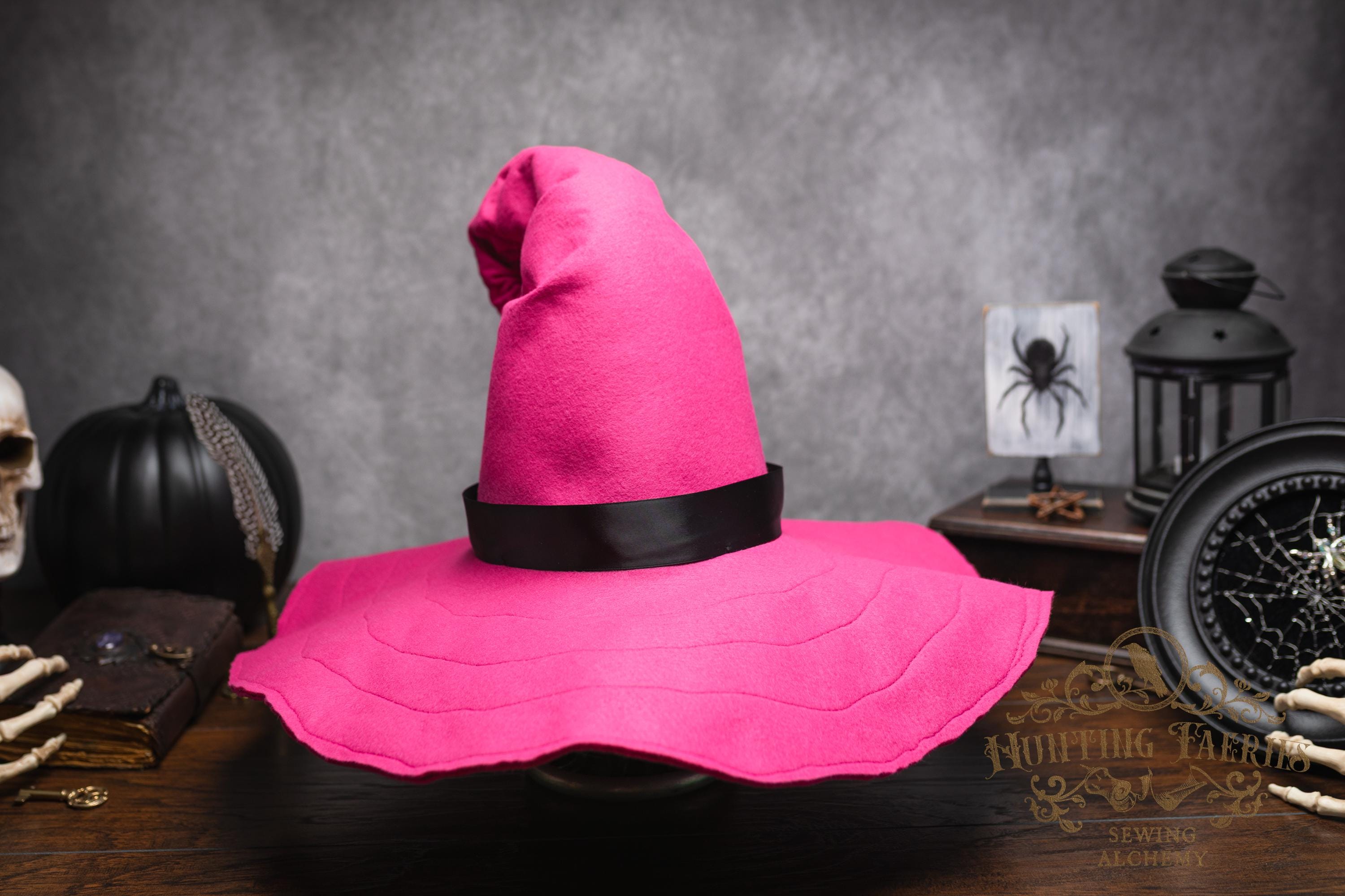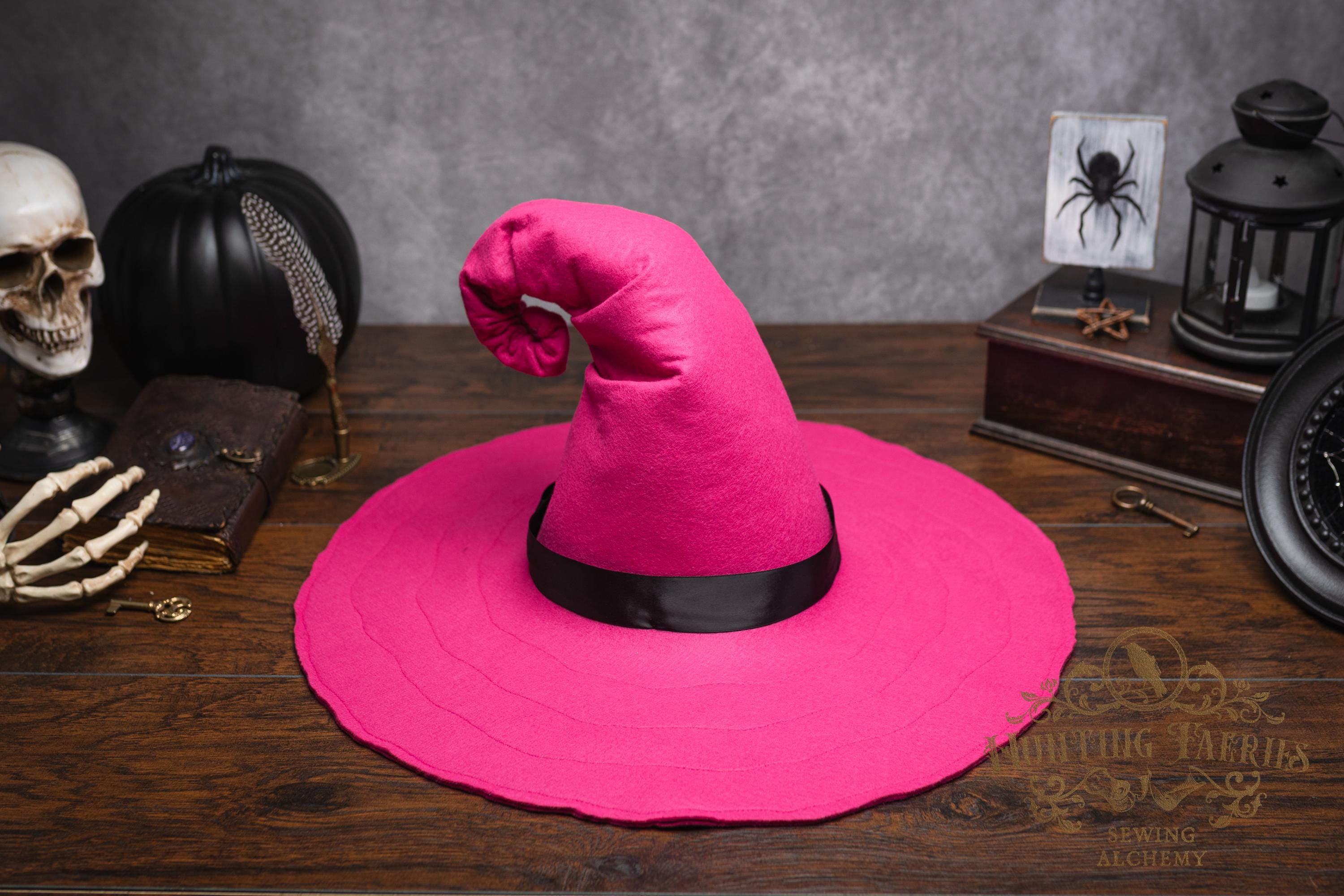 This Pinktastic curl-back witch hat is made of hot pink vegan-friendly felt. It's a classic shape with a black satin ribbon at the base of the cone. There is lots of potential for dressing up...imagine it with your favorite pink witches outfit! It's out there! Its wide brim has layers of magic stitched together for a floppy, yet rigid look and feel. Dress it down with wicked face makeup that you can reveal or keep hidden by the xl brim. This pink witch's hat would be great for a good witch look with your favorite pink dress or cosplay, Renaissance Faire costume, or everyday wear! Make a statement in this hat! The possibilities are only limited by your imagination!