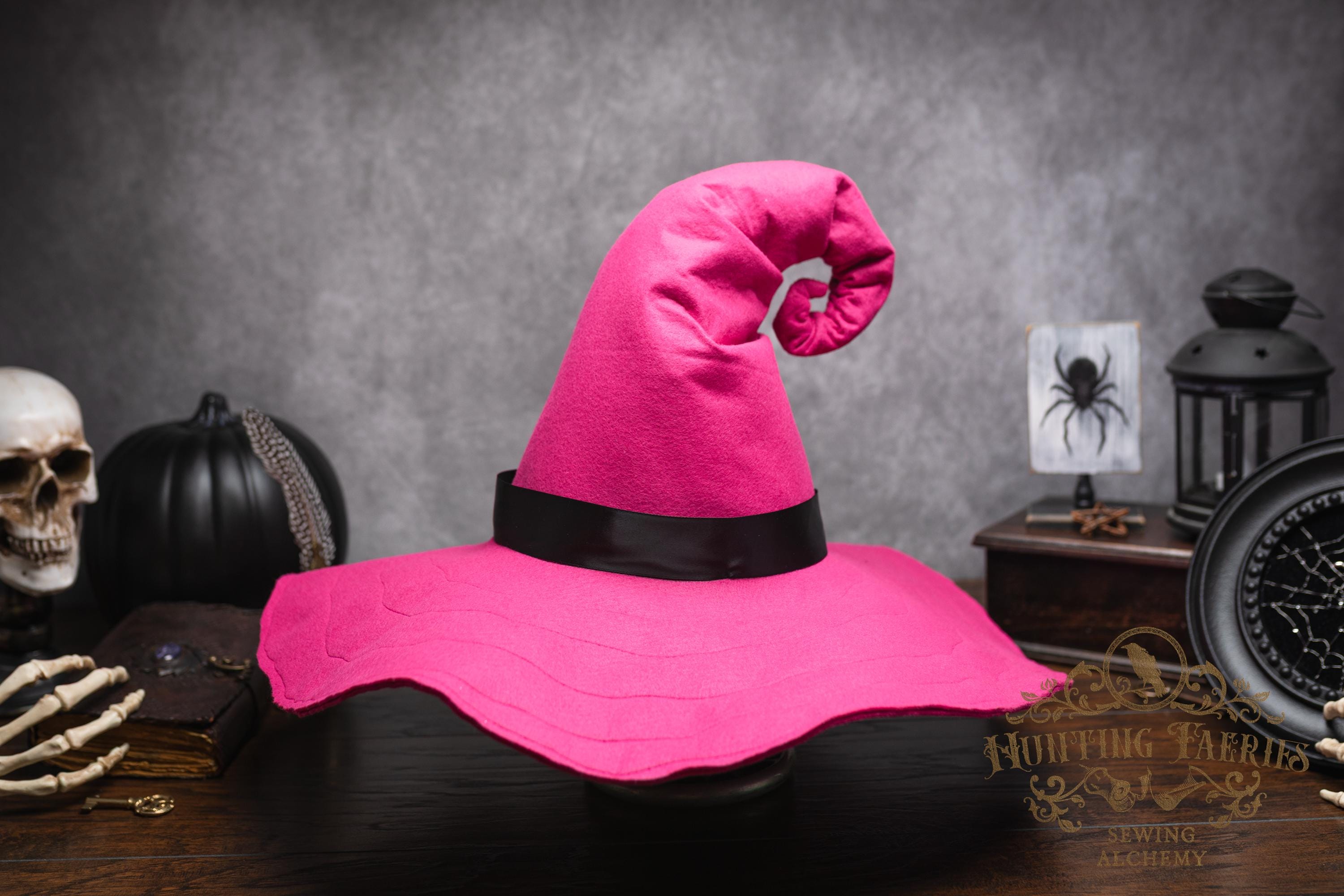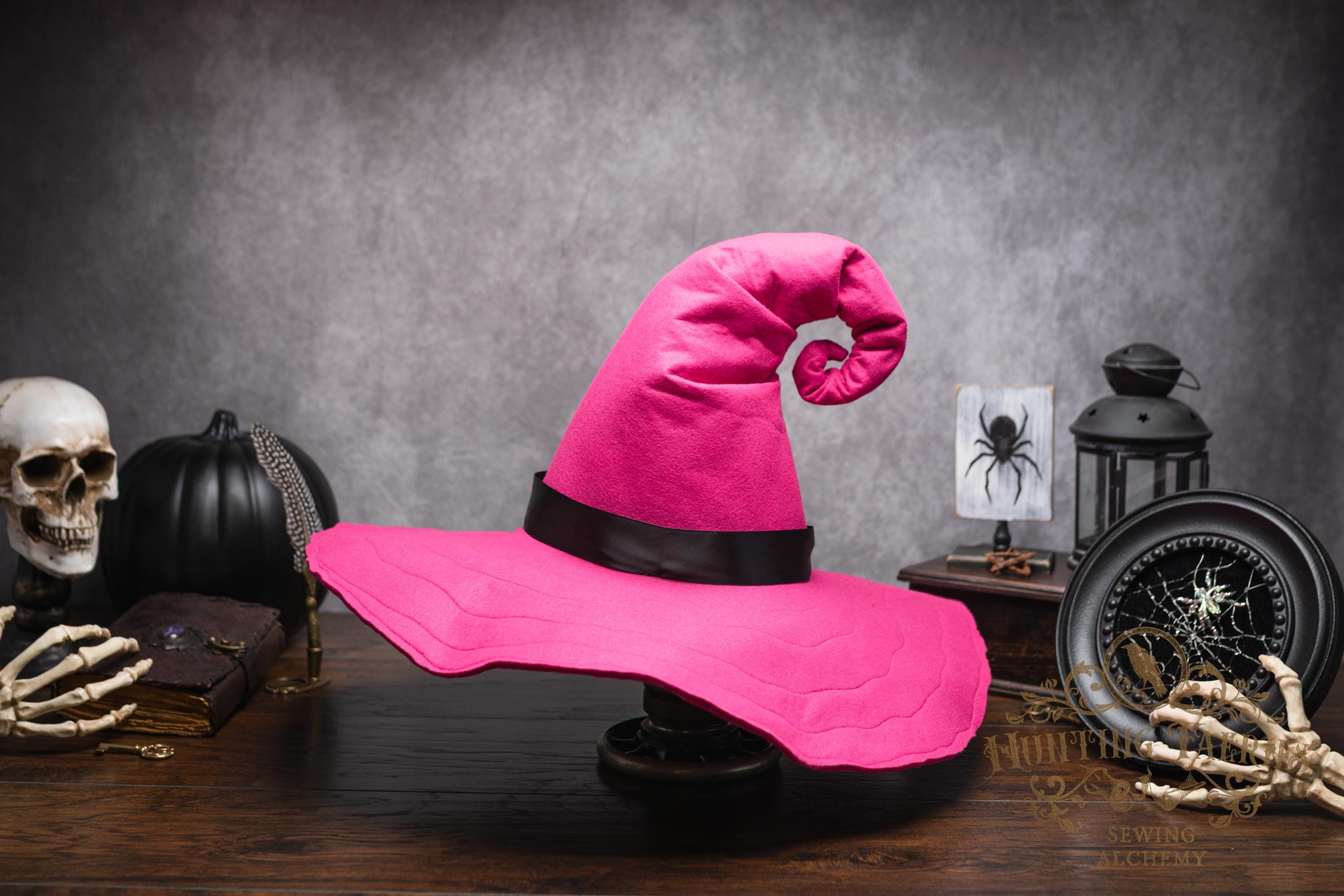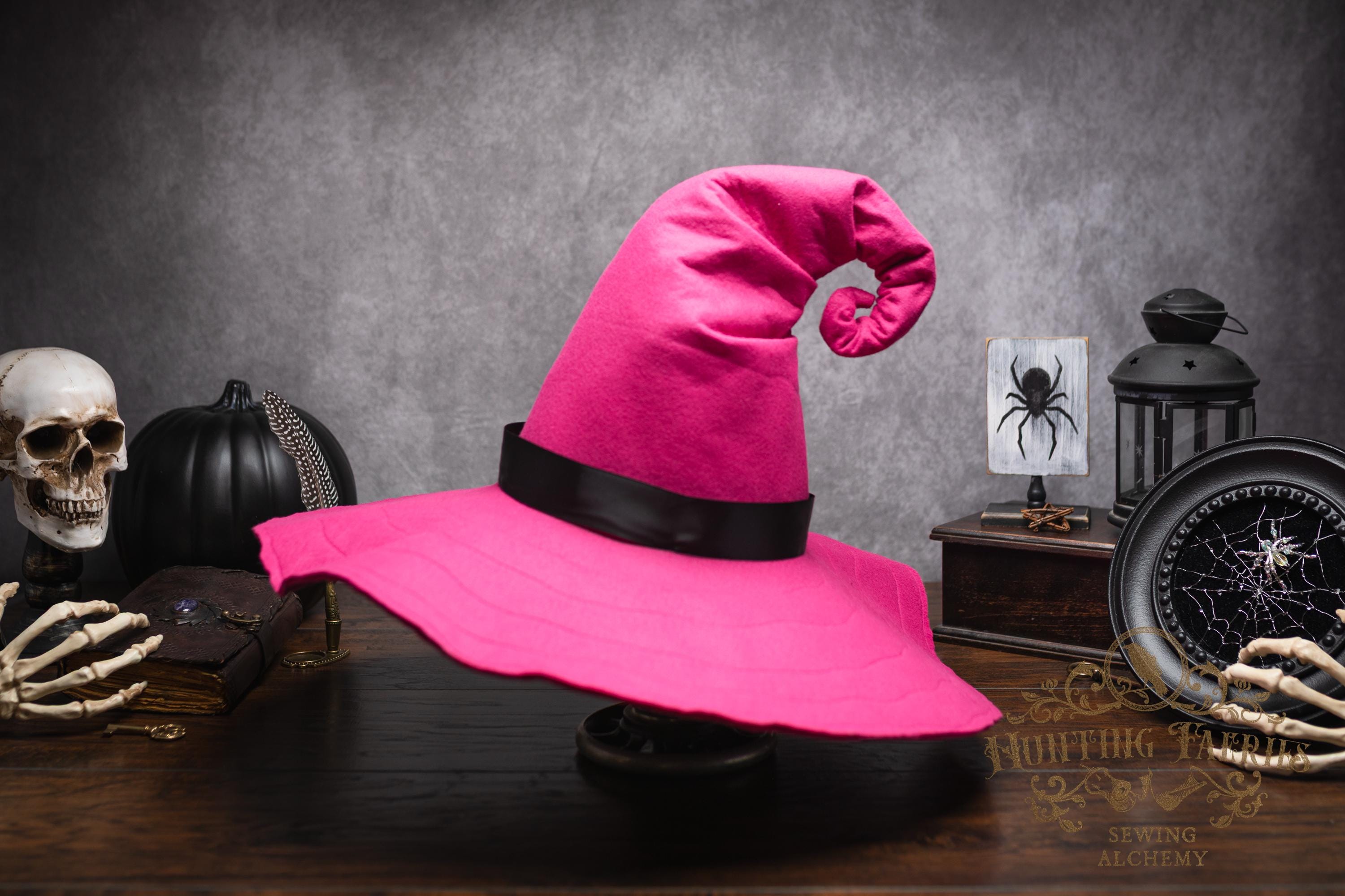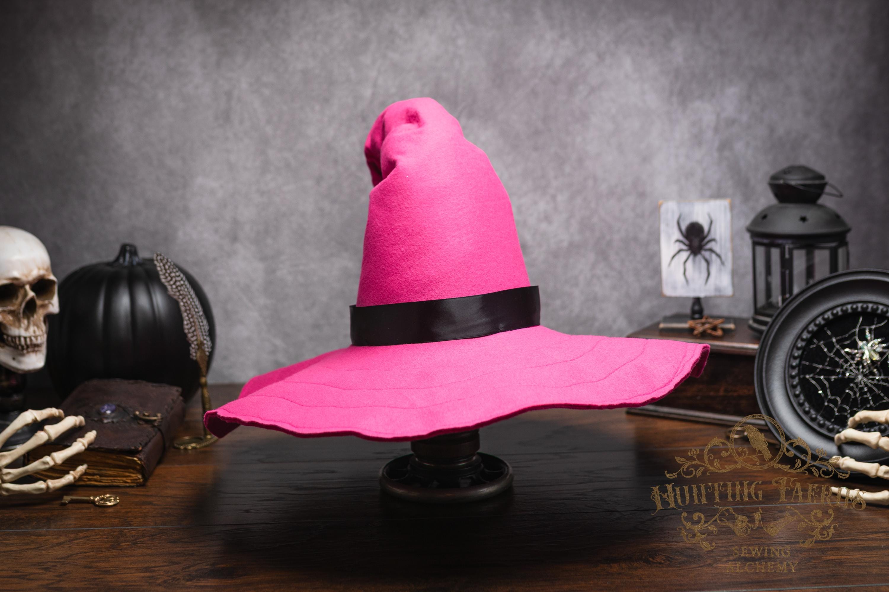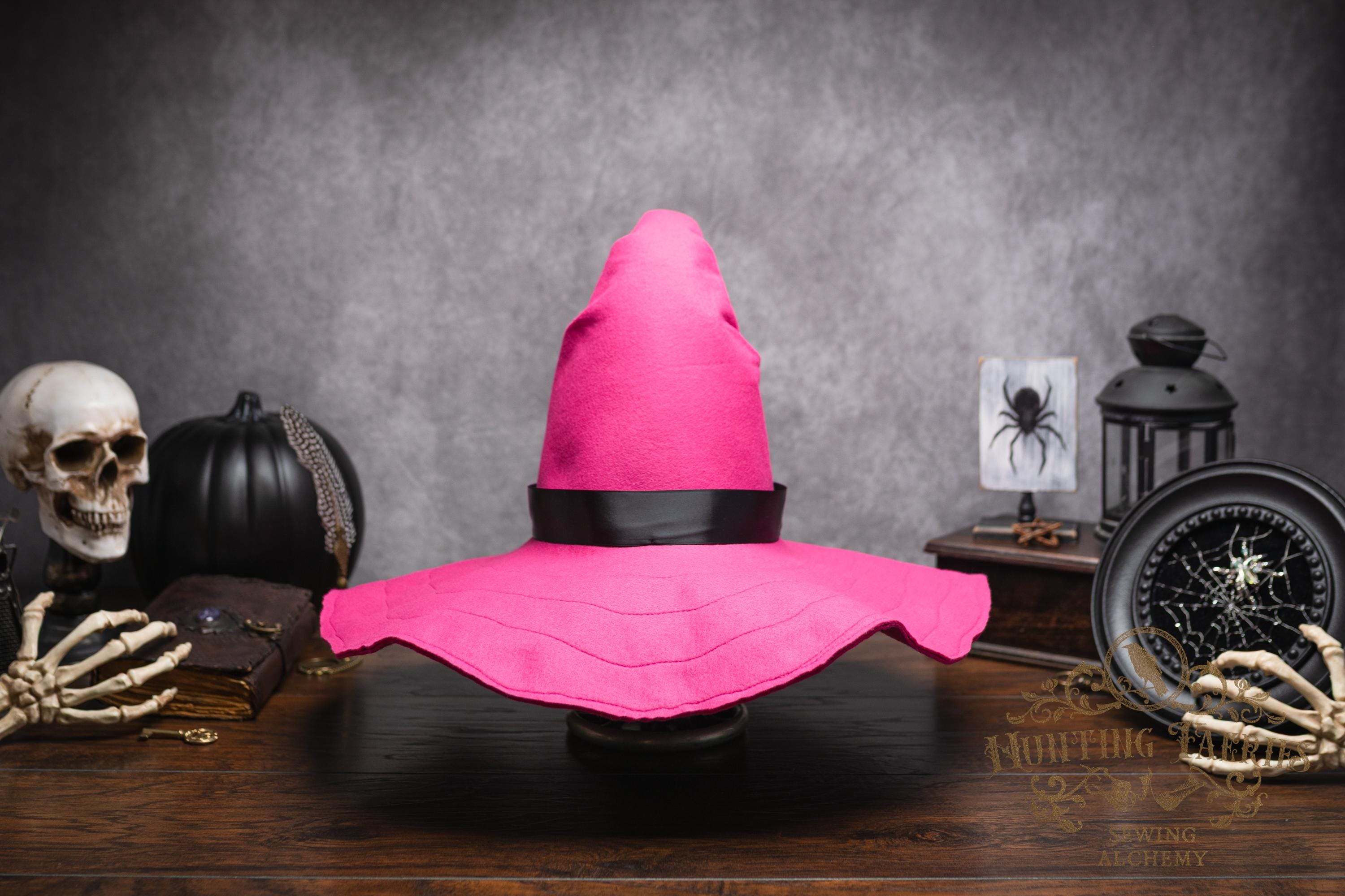 This Pinktastic curl-back witch hat is made of hot pink vegan-friendly felt. It's a classic shape with a black satin ribbon at the base of the cone. There is lots of potential for dressing up...imagine it with your favorite pink witches outfit! It's out there! Its wide brim has layers of magic stitched together for a floppy, yet rigid look and feel. Dress it down with wicked face makeup that you can reveal or keep hidden by the xl brim. This pink witch's hat would be great for a good witch look with your favorite pink dress or cosplay, Renaissance Faire costume, or everyday wear! Make a statement in this hat! The possibilities are only limited by your imagination!