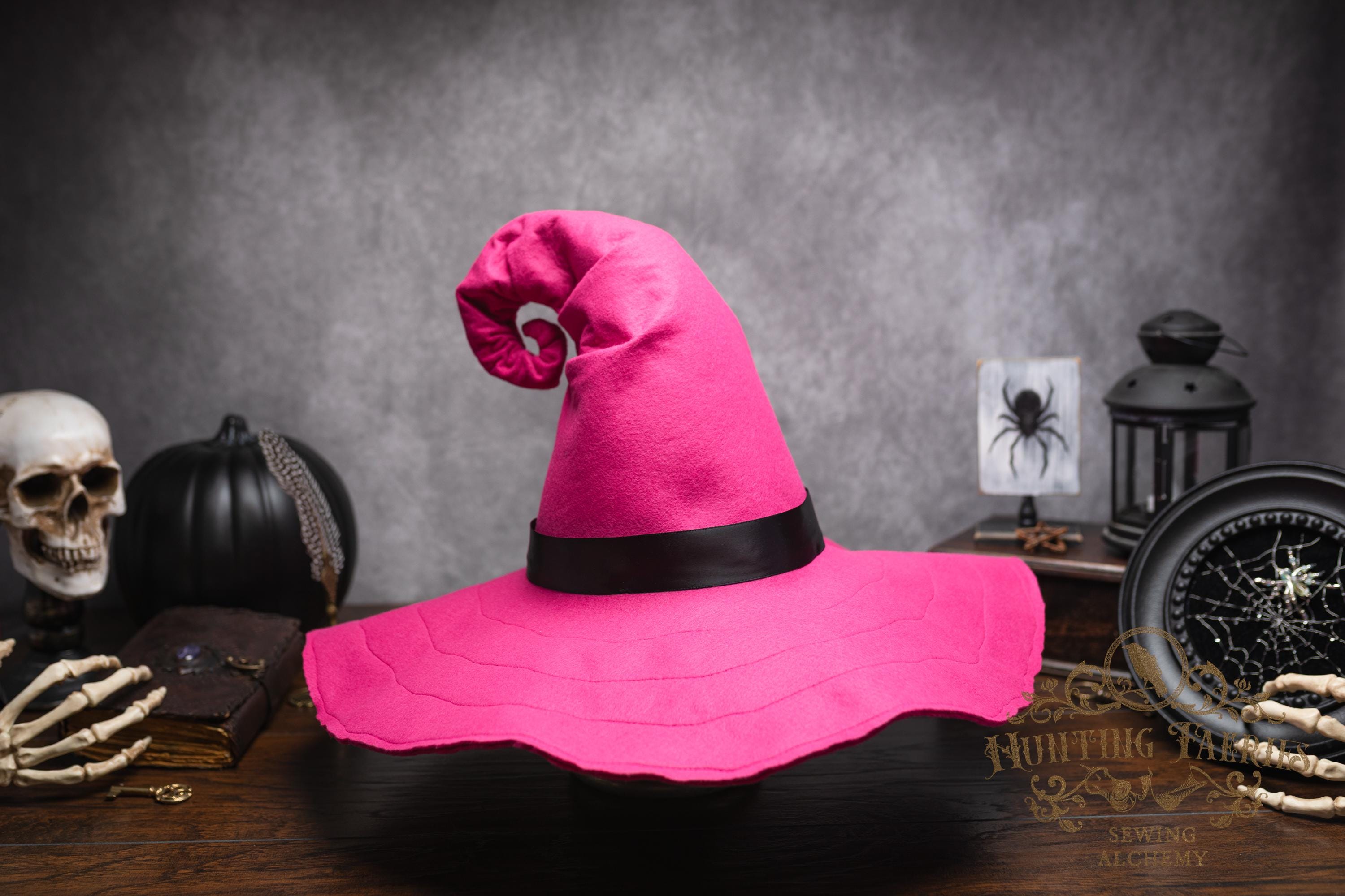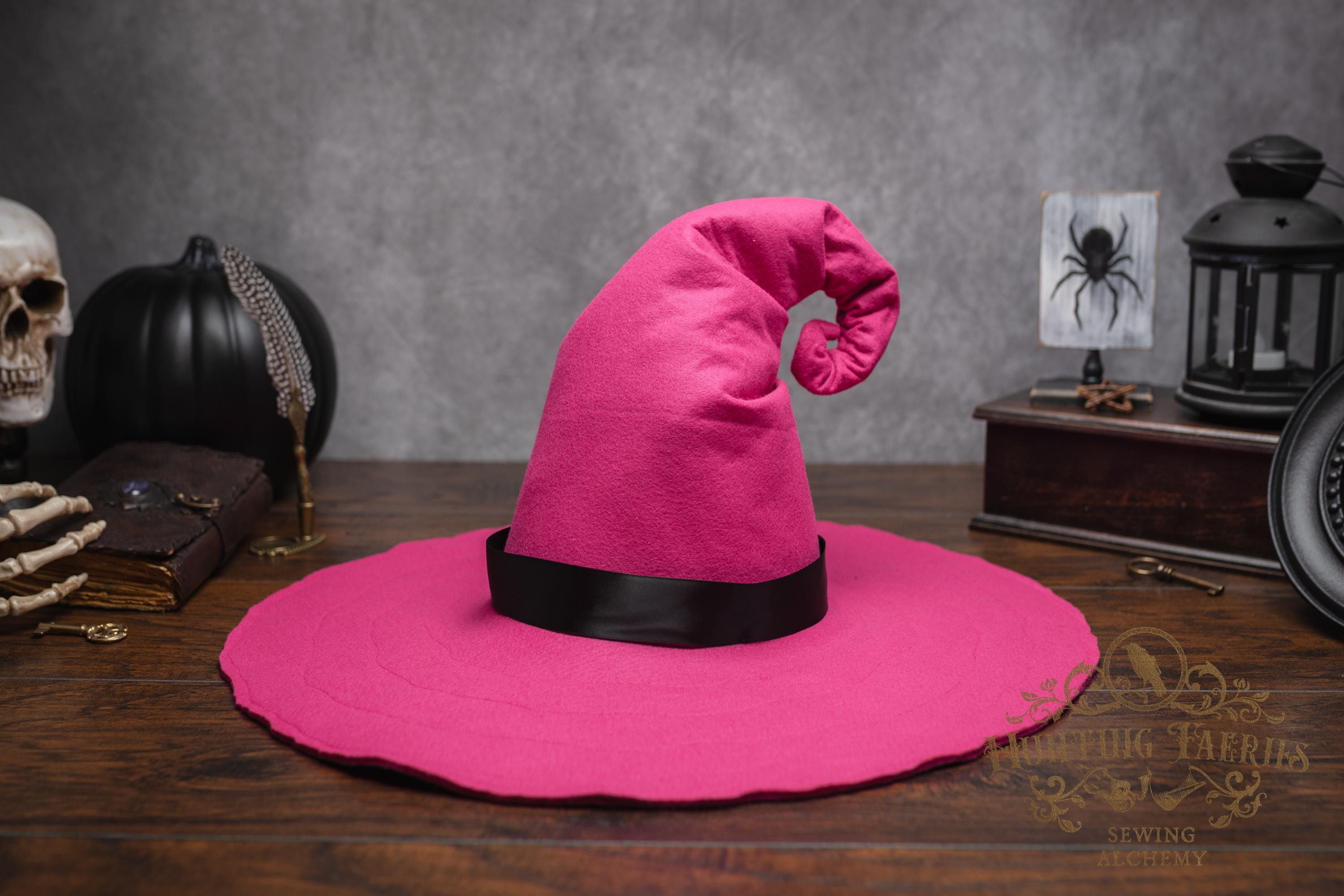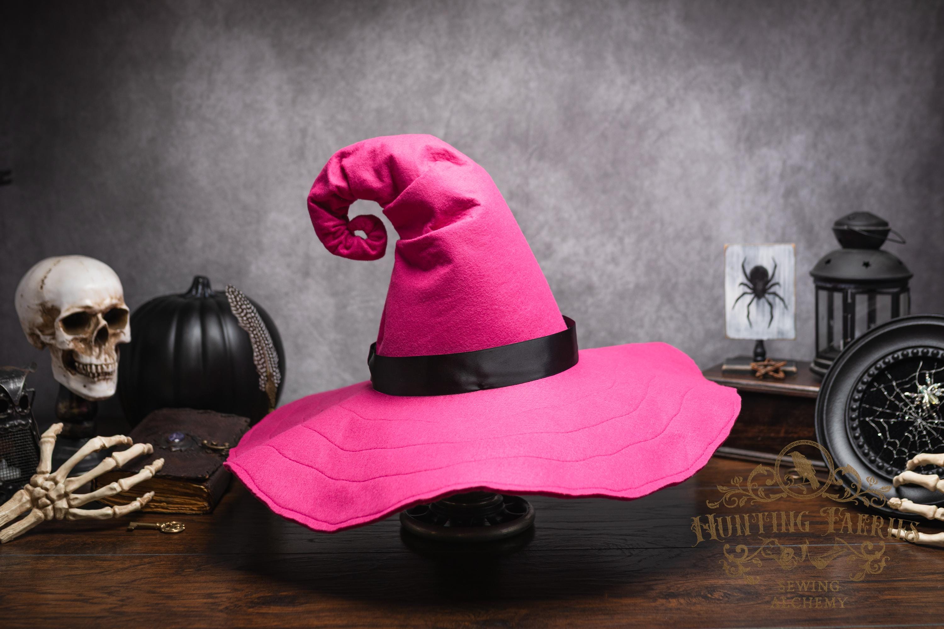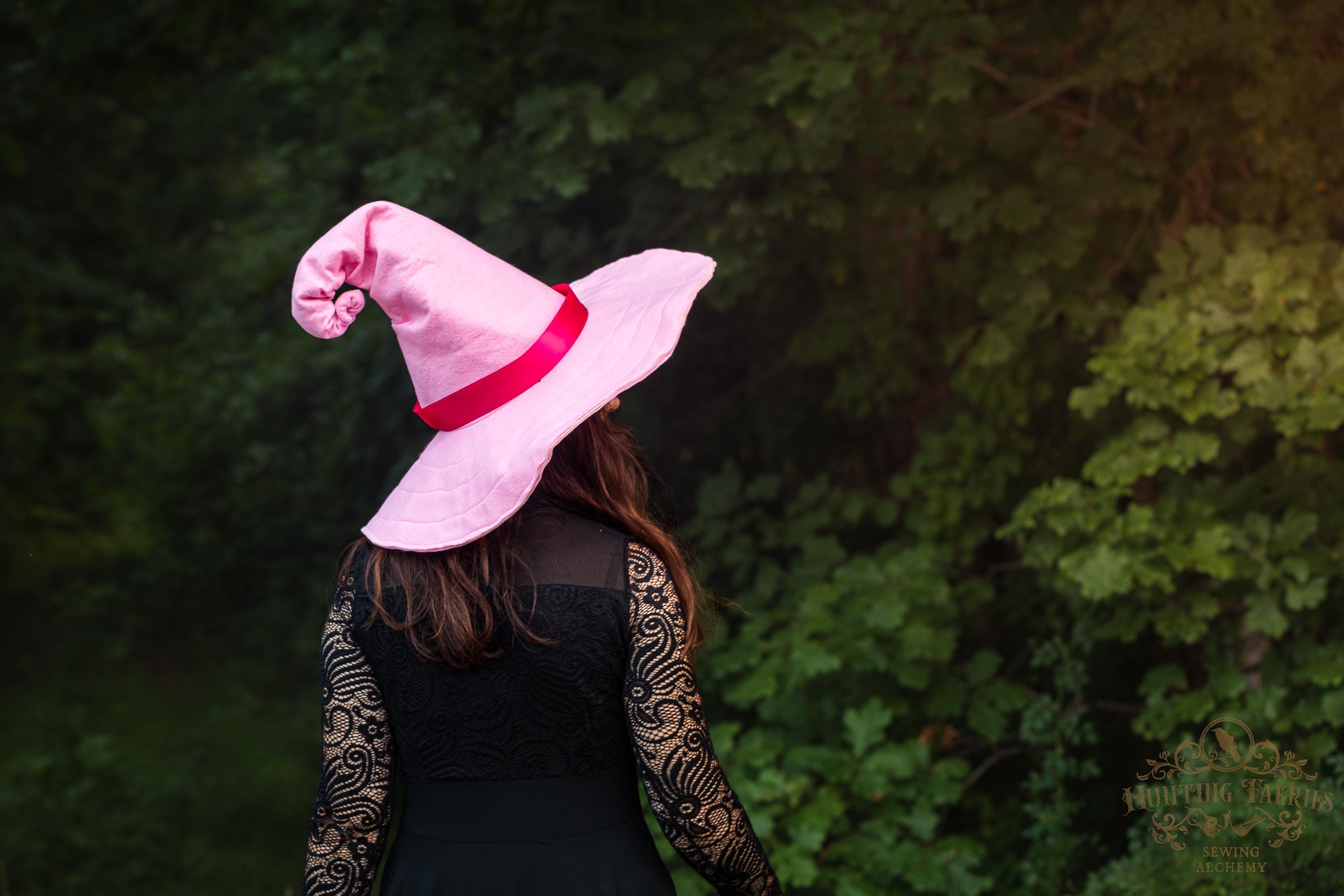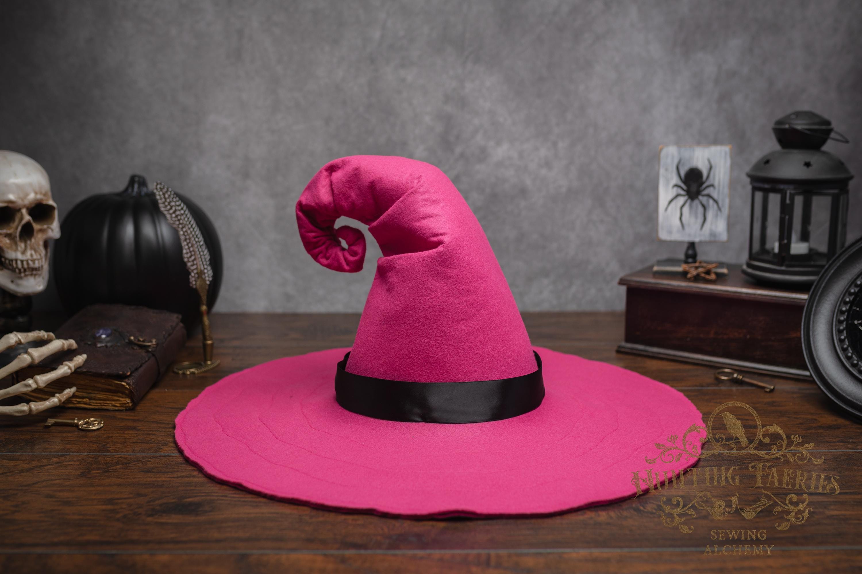 This Pinktastic curl-back witch hat is made of hot pink vegan-friendly felt. It's a classic shape with a black satin ribbon at the base of the cone. There is lots of potential for dressing up...imagine it with your favorite pink witches outfit! It's out there! Its wide brim has layers of magic stitched together for a floppy, yet rigid look and feel. Dress it down with wicked face makeup that you can reveal or keep hidden by the xl brim. This pink witch's hat would be great for a good witch look with your favorite pink dress or cosplay, Renaissance Faire costume, or everyday wear! Make a statement in this hat! The possibilities are only limited by your imagination!