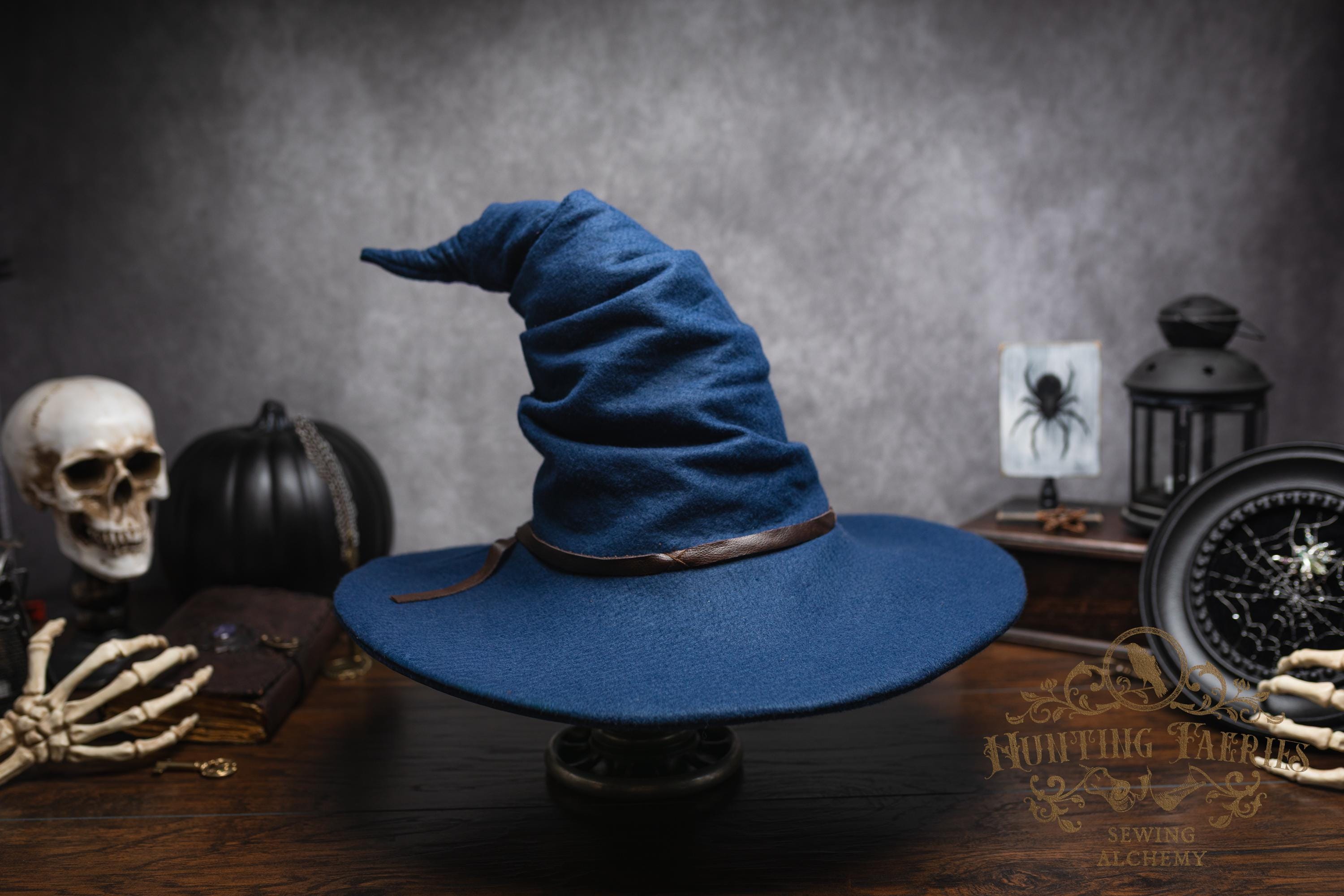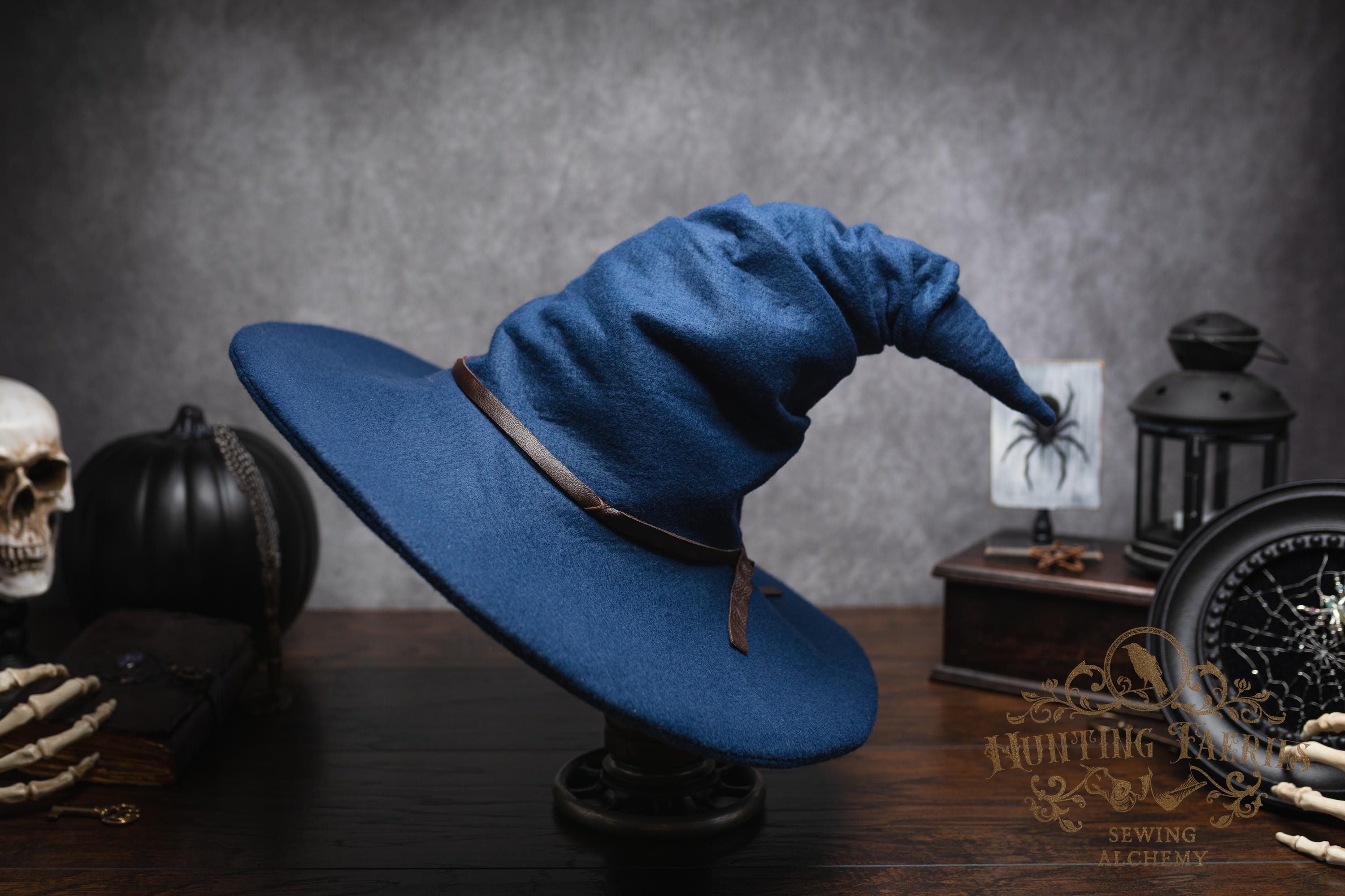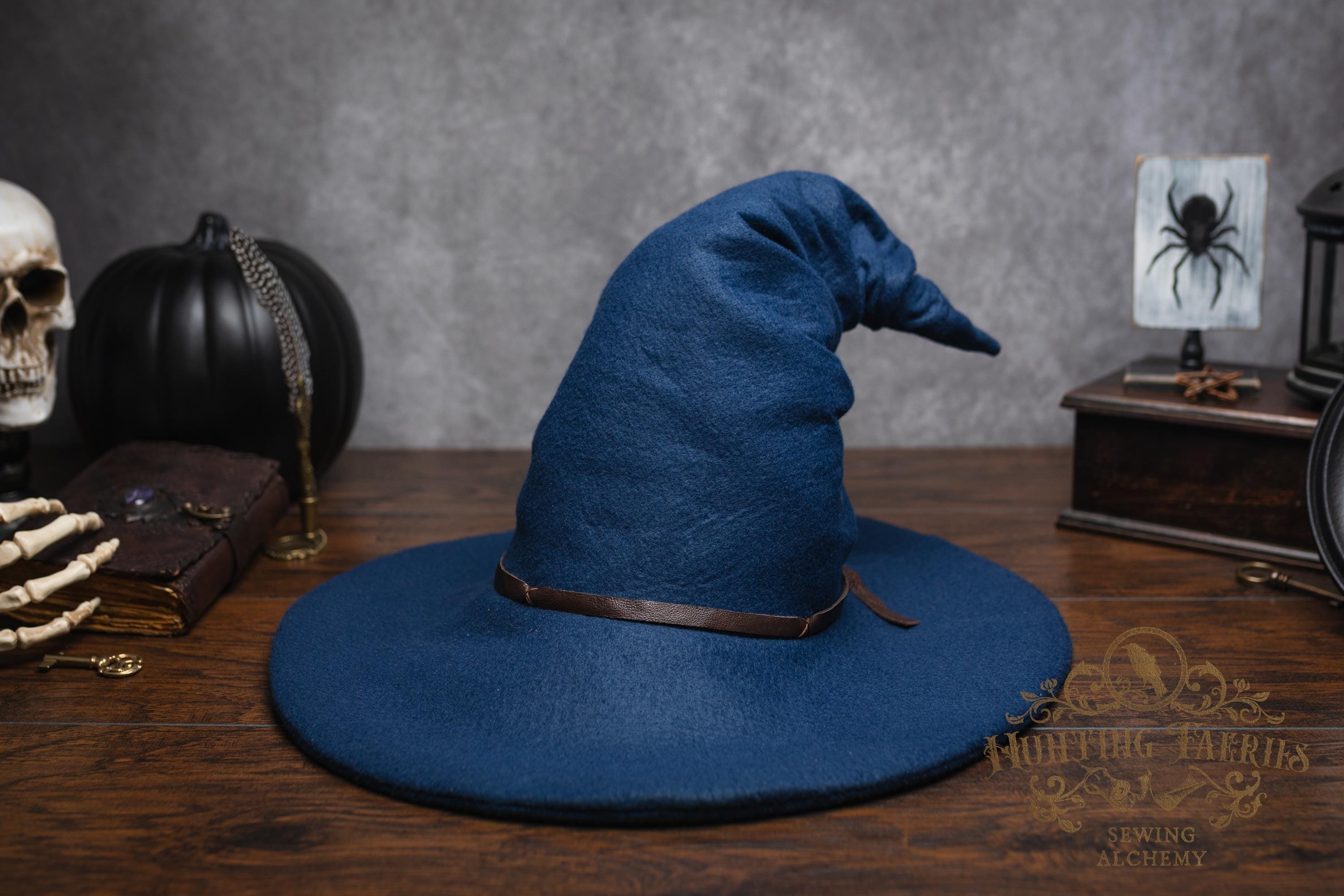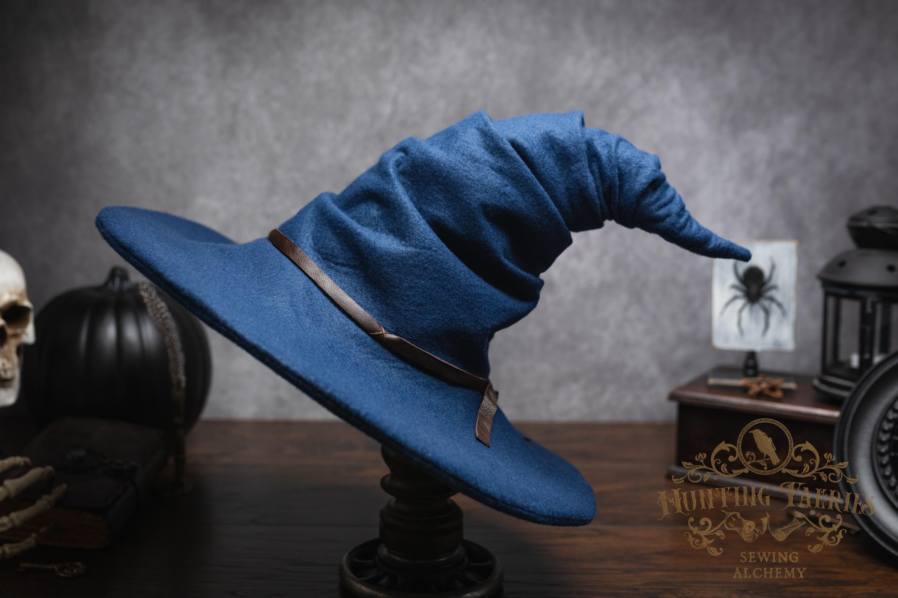 This witch hat is made of navy blue felt, (eco friendly) it offers a dar wizarding look with a ruched curled cone perfect for either a dressed up or down witch look. Its wide-sloped brim has layers of magic stitched together and wired for a ridgid-looking brim and soft feel from the cone. It has a thin strip of leather that crosses in the back offering a natural strong, powerful woodland look. It would be great for a wizard or mage cosplay, ren faire costume, or everyday wear! This hat screams for a powerful wearer, no frills here, it's all business. The possibilities are only limited by your imagination!