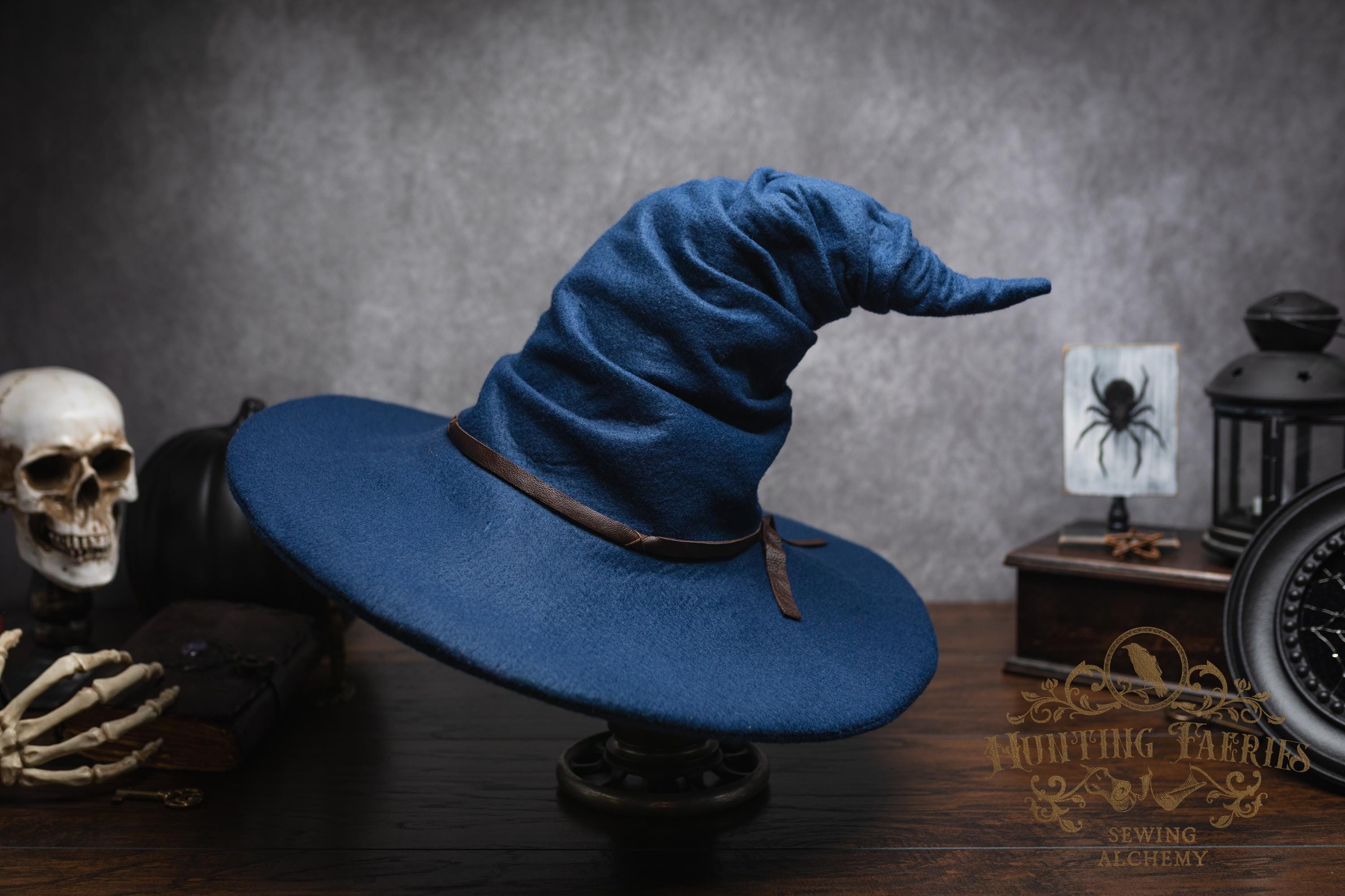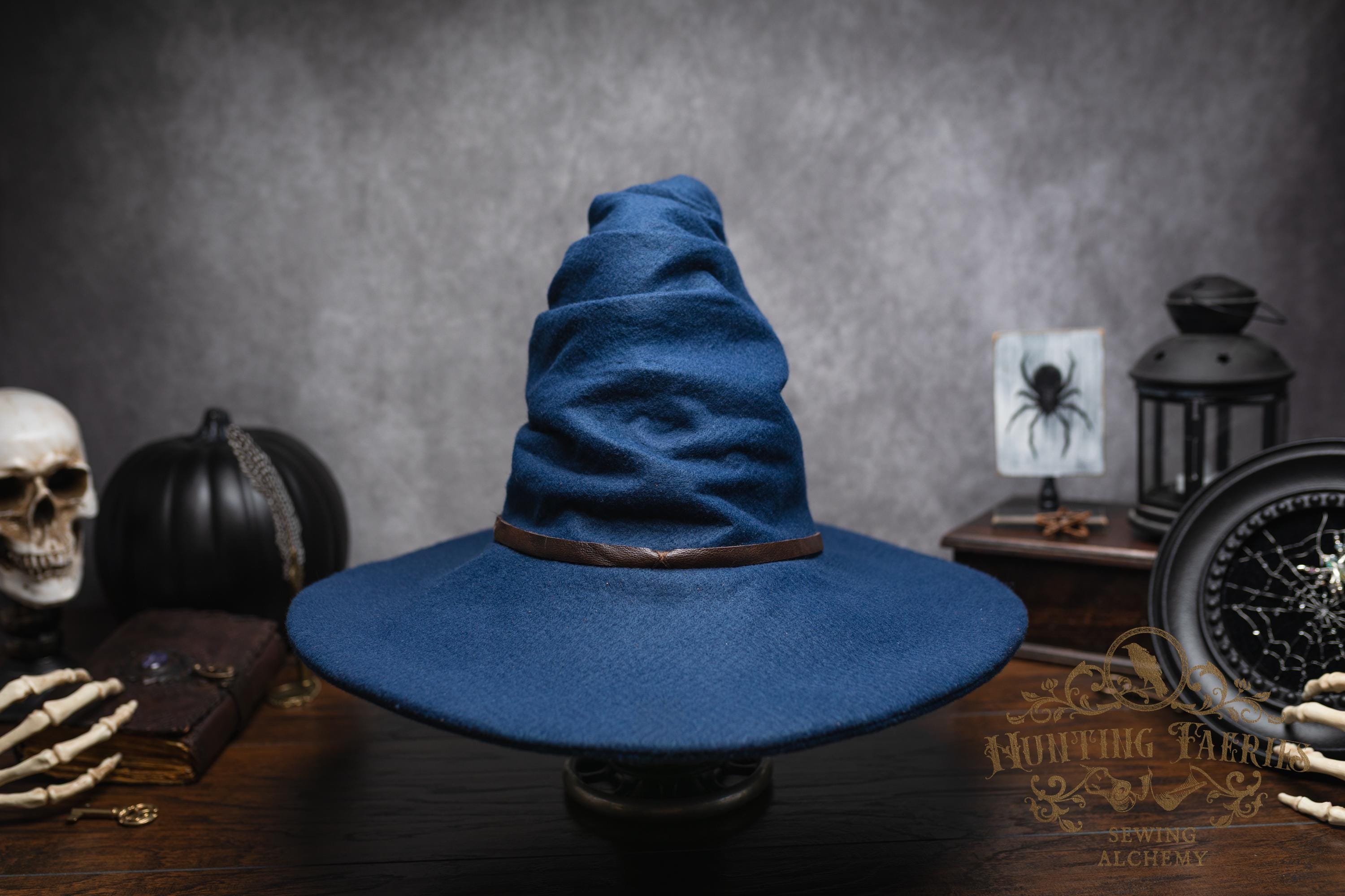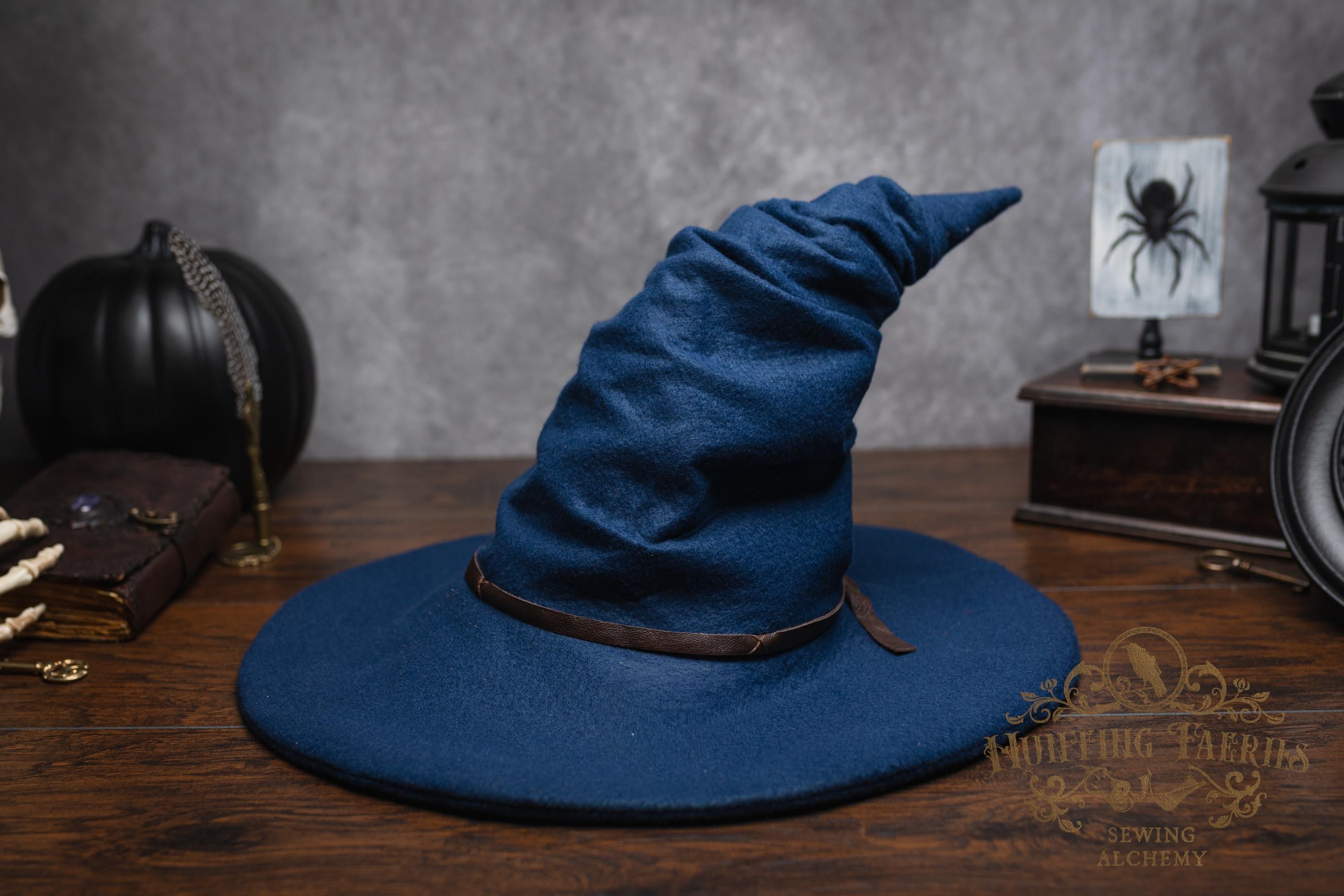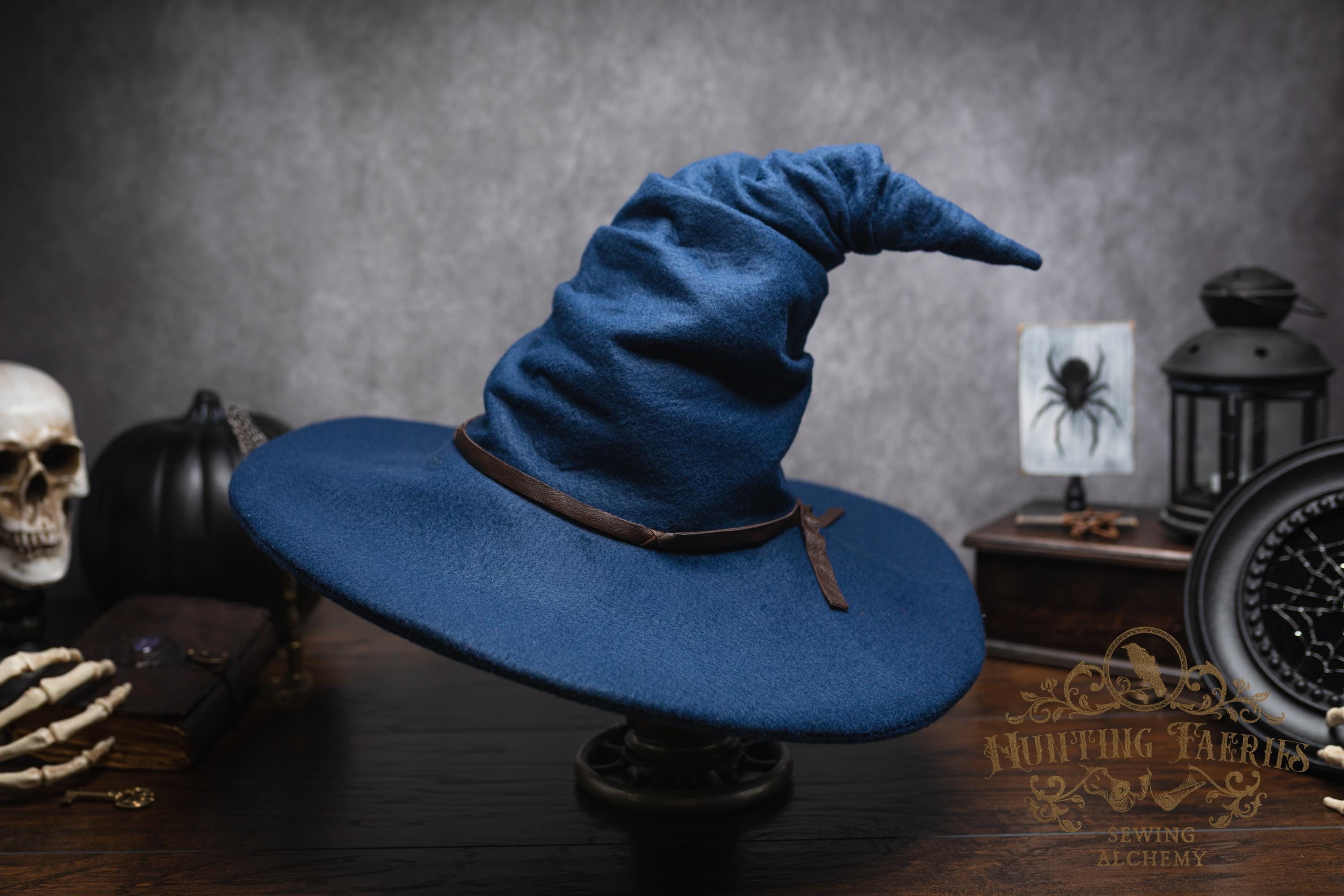 This witch hat is made of navy blue felt, (eco friendly) it offers a dar wizarding look with a ruched curled cone perfect for either a dressed up or down witch look. Its wide-sloped brim has layers of magic stitched together and wired for a ridgid-looking brim and soft feel from the cone. It has a thin strip of leather that crosses in the back offering a natural strong, powerful woodland look. It would be great for a wizard or mage cosplay, ren faire costume, or everyday wear! This hat screams for a powerful wearer, no frills here, it's all business. The possibilities are only limited by your imagination!