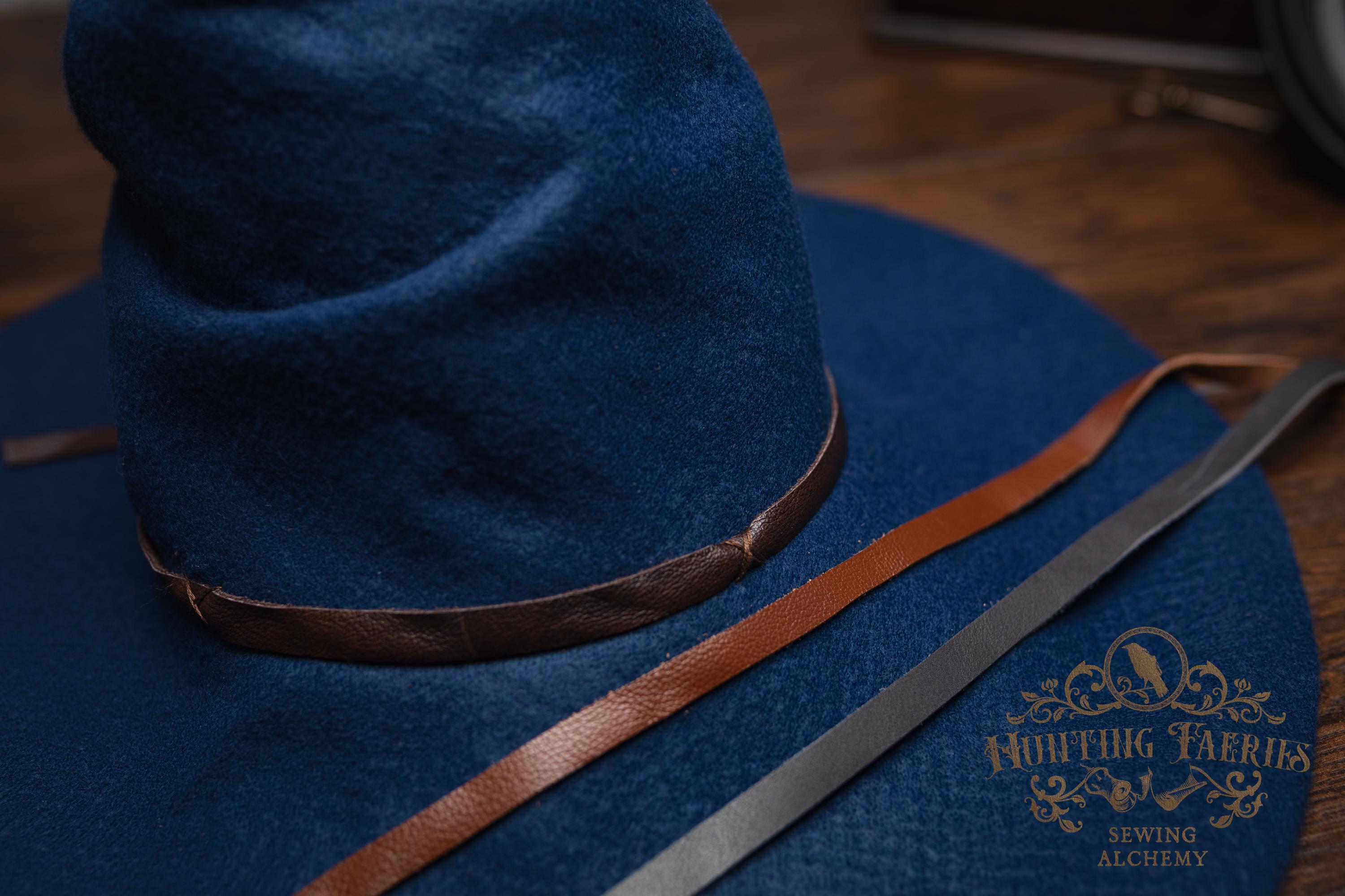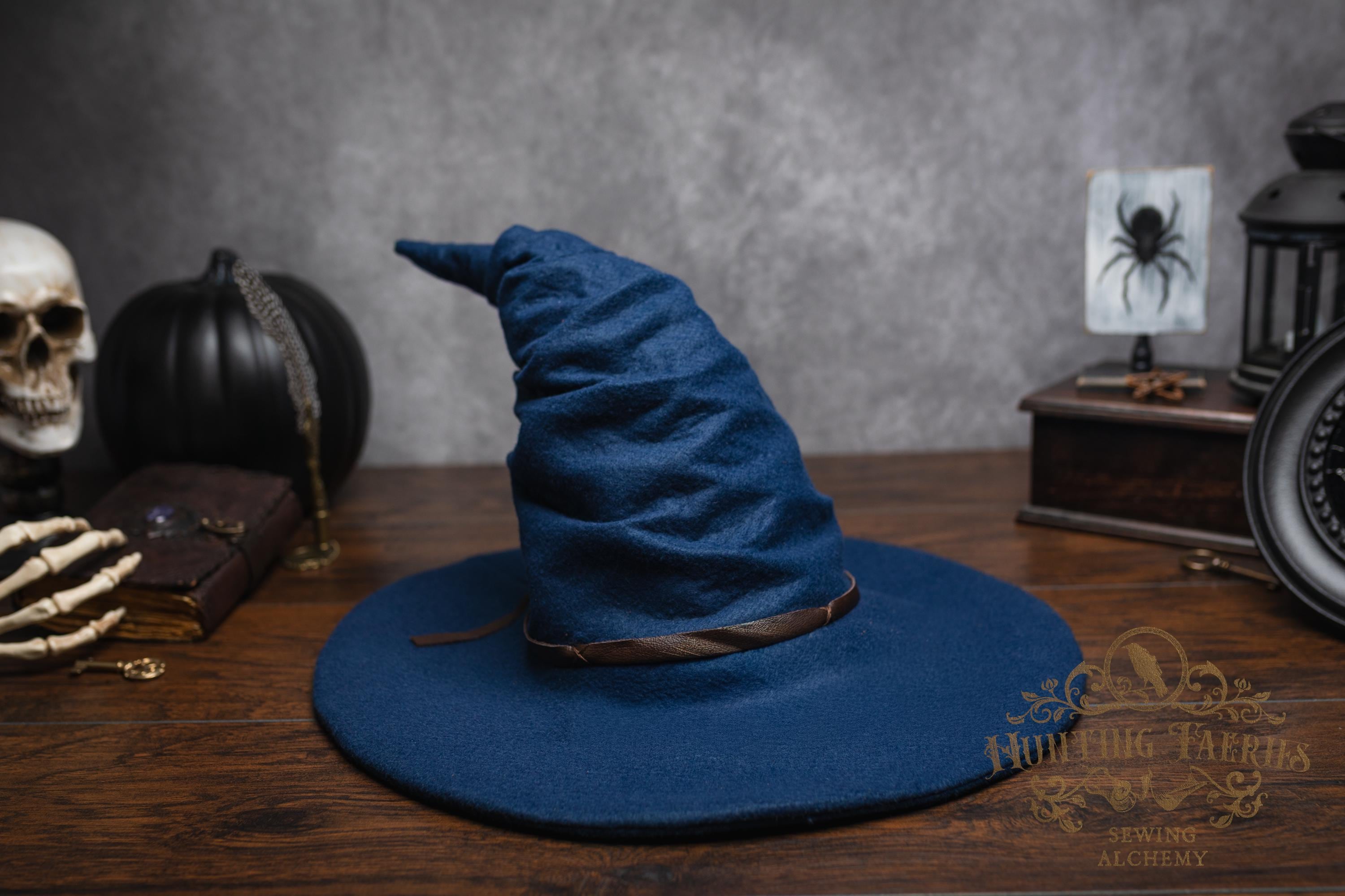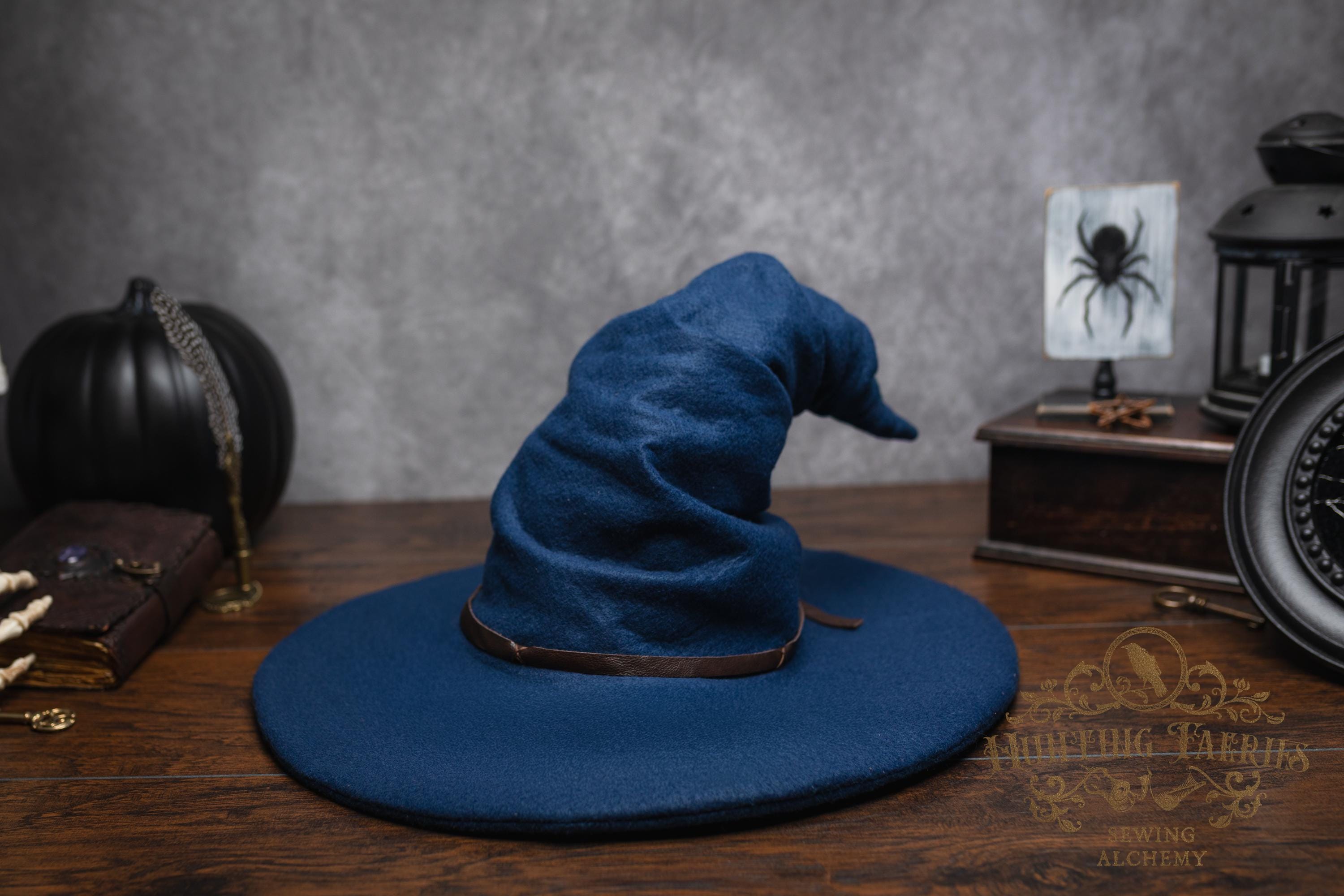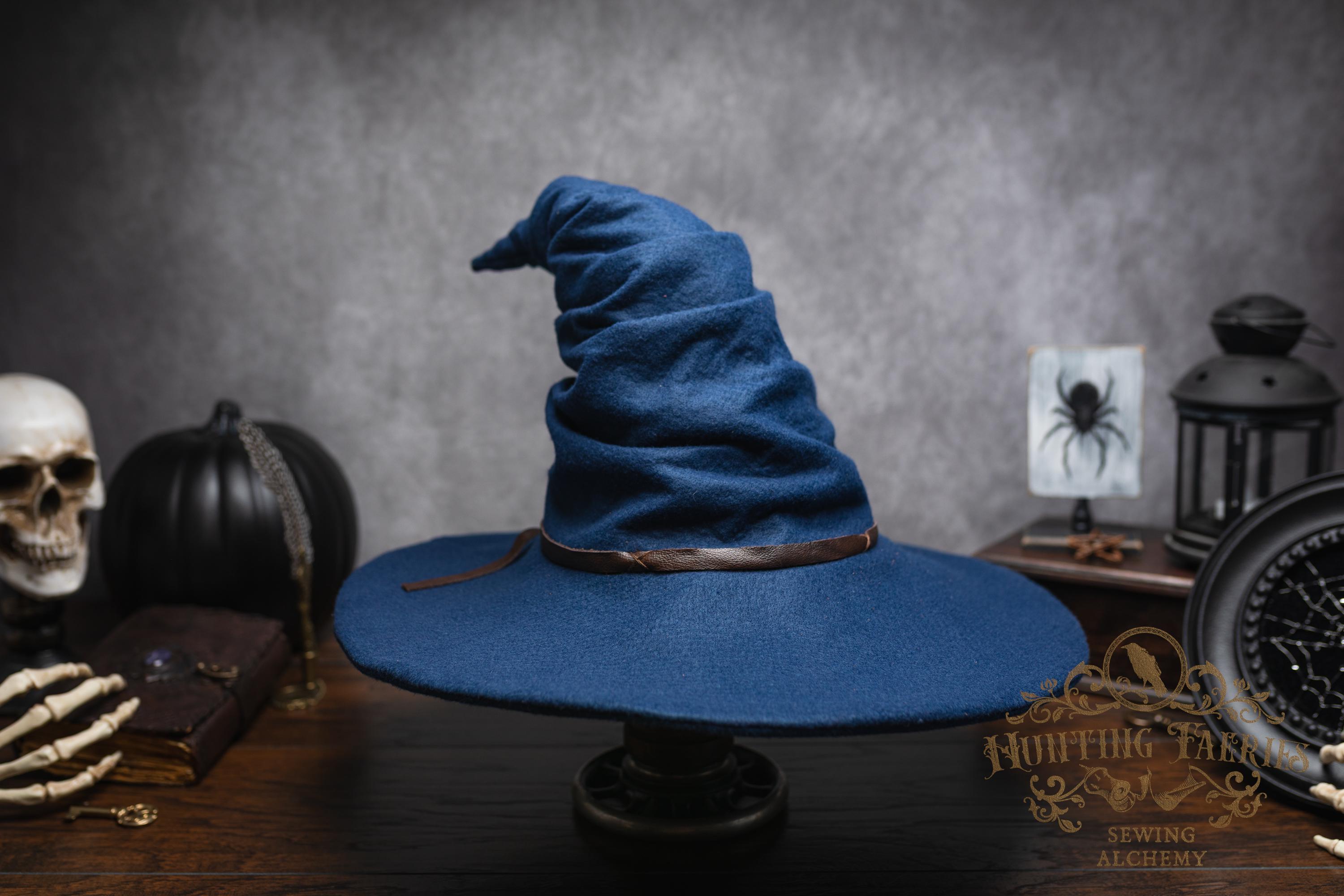 This witch hat is made of navy blue felt, (eco friendly) it offers a dar wizarding look with a ruched curled cone perfect for either a dressed up or down witch look. Its wide-sloped brim has layers of magic stitched together and wired for a ridgid-looking brim and soft feel from the cone. It has a thin strip of leather that crosses in the back offering a natural strong, powerful woodland look. It would be great for a wizard or mage cosplay, ren faire costume, or everyday wear! This hat screams for a powerful wearer, no frills here, it's all business. The possibilities are only limited by your imagination!