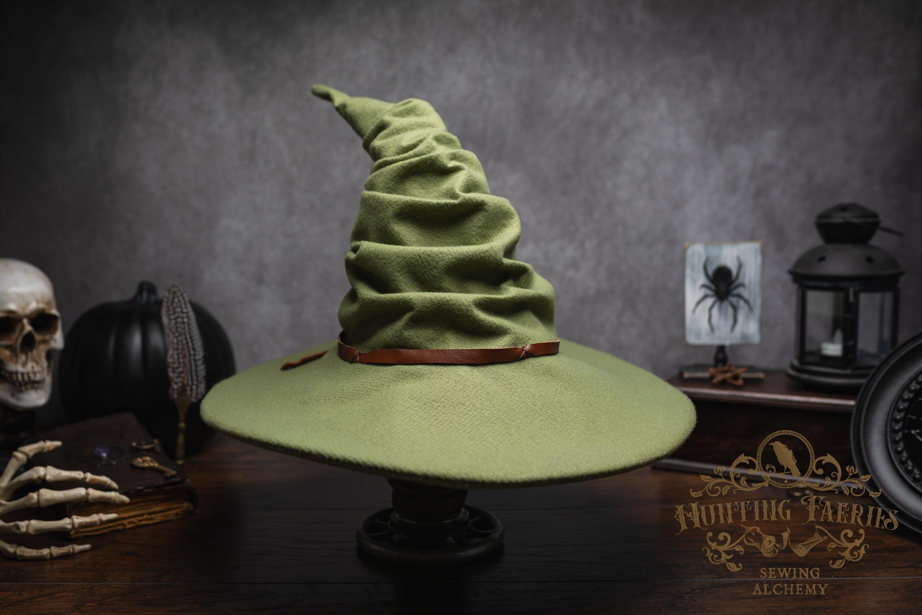 This witch hat is made of moss green felt (vegan friendly). It offers a wizarding dark look with a ruched curled cone perfect for a dressed-up or down witch look. Its wide-sloped brim has layers of magic stitched together and wired for a rigid-looking brim and soft feel from the cone. It has a thin strip of leather around the cone that crosses in the back, offering a natural strong, powerful woodland look. It would be great for a wizard or mage cosplay, Ren faire costume, or everyday wear! This hat screams for a powerful wearer; no frills here, it's all business. The possibilities are only limited by your imagination!