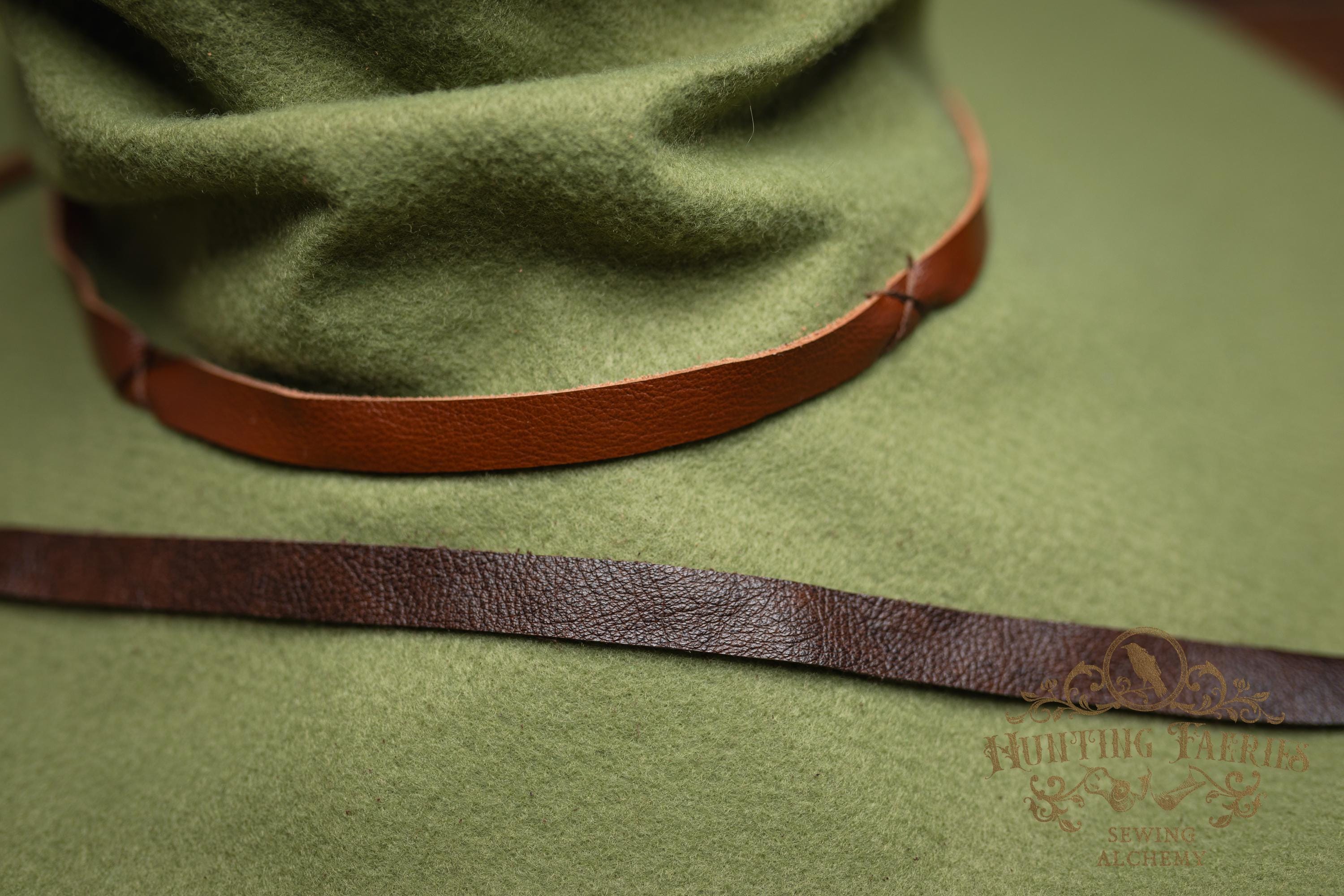 The Freya hat offers a larger brim made of stitched layers of felt and wired to keep out the bugs as you circle above and its shape. The cone is also lined in another layer of felt to help keep its crooked shape and yet be a comfortable, soft fit. The crook is ruched and can be positioned at any angle by moving it with your hands. Put it to the right...to the back...make it swoop to the left! It's exaggerated and awesome! The leather strip is brown. Simply bewitching.