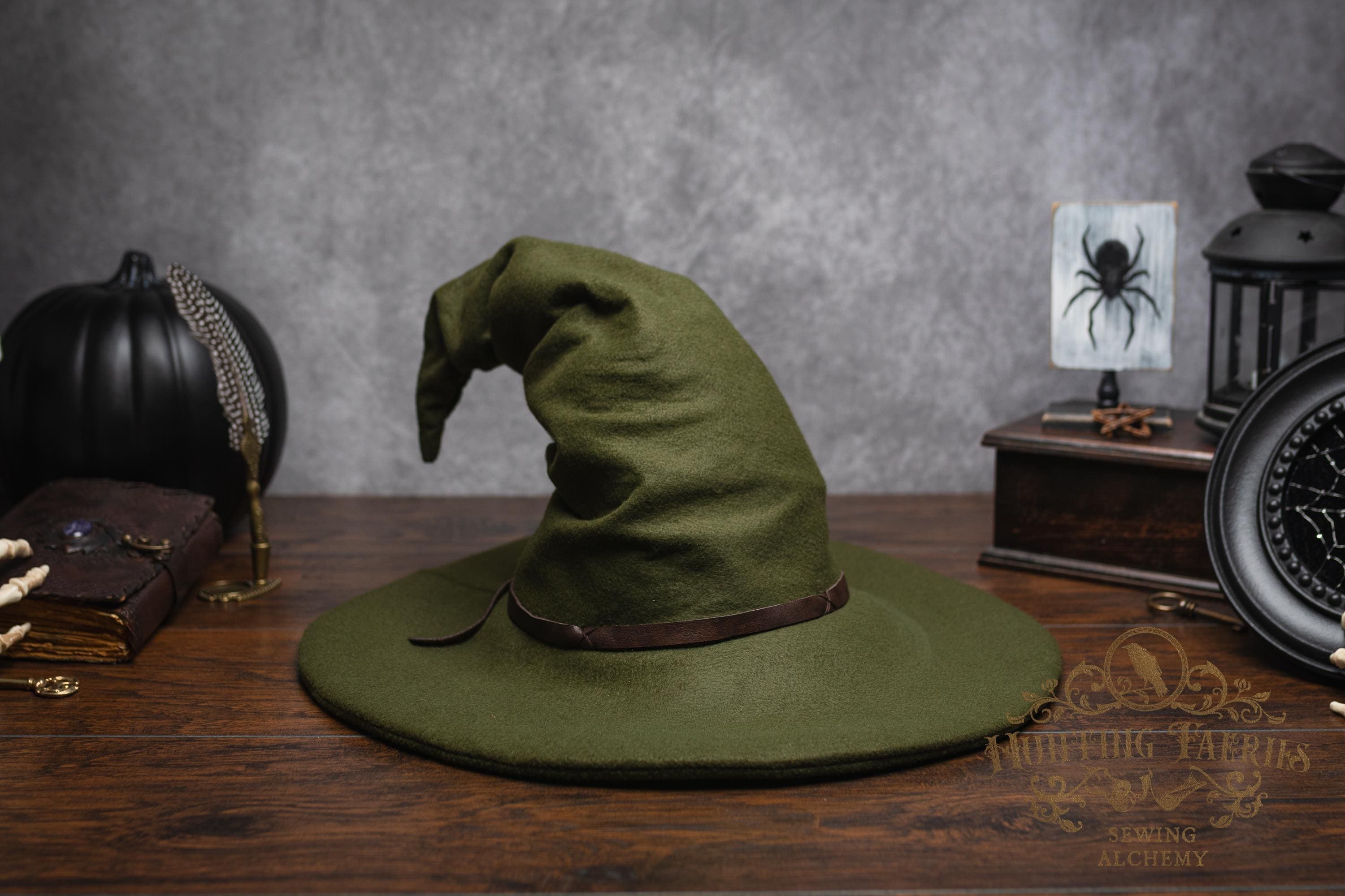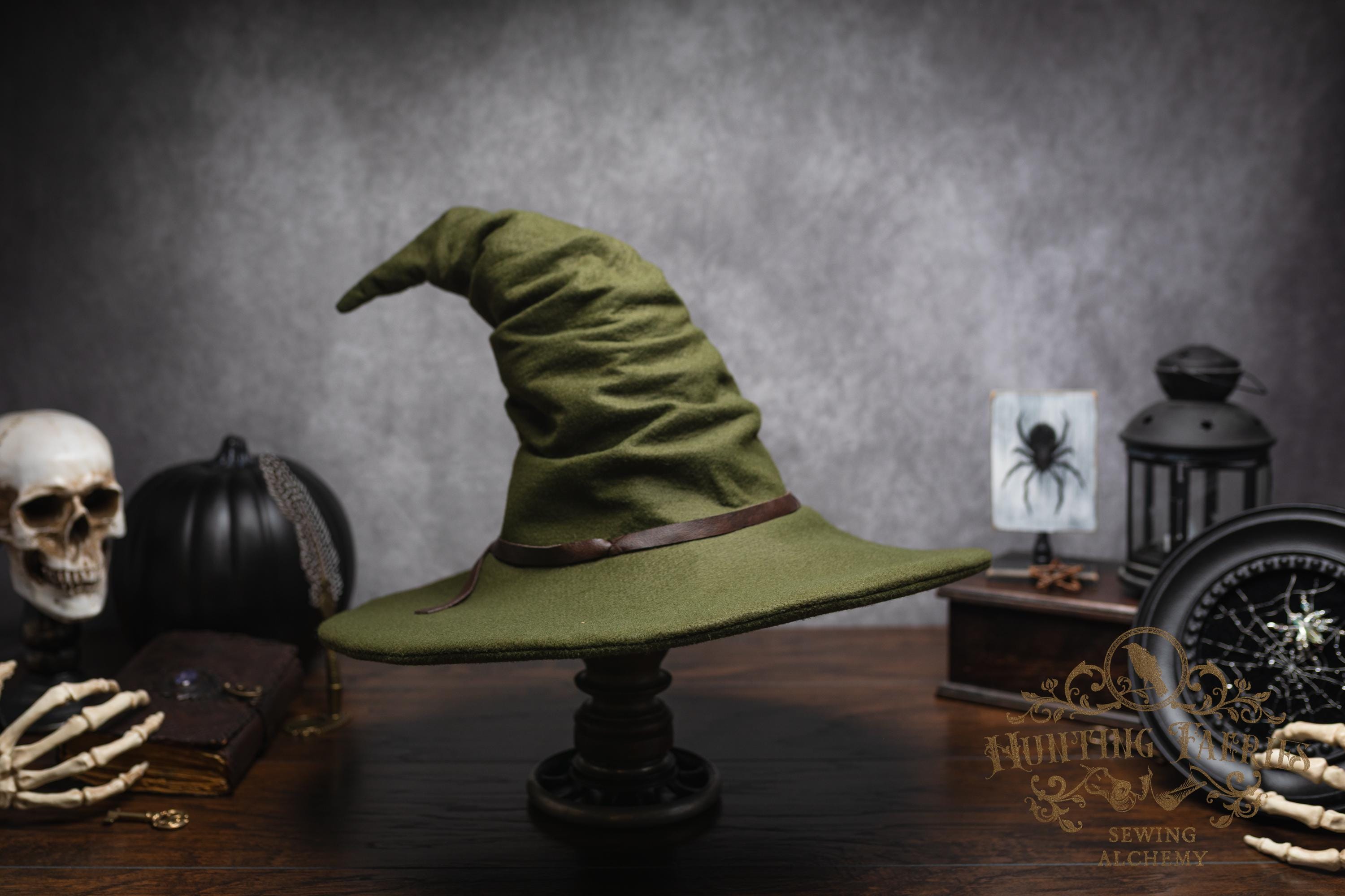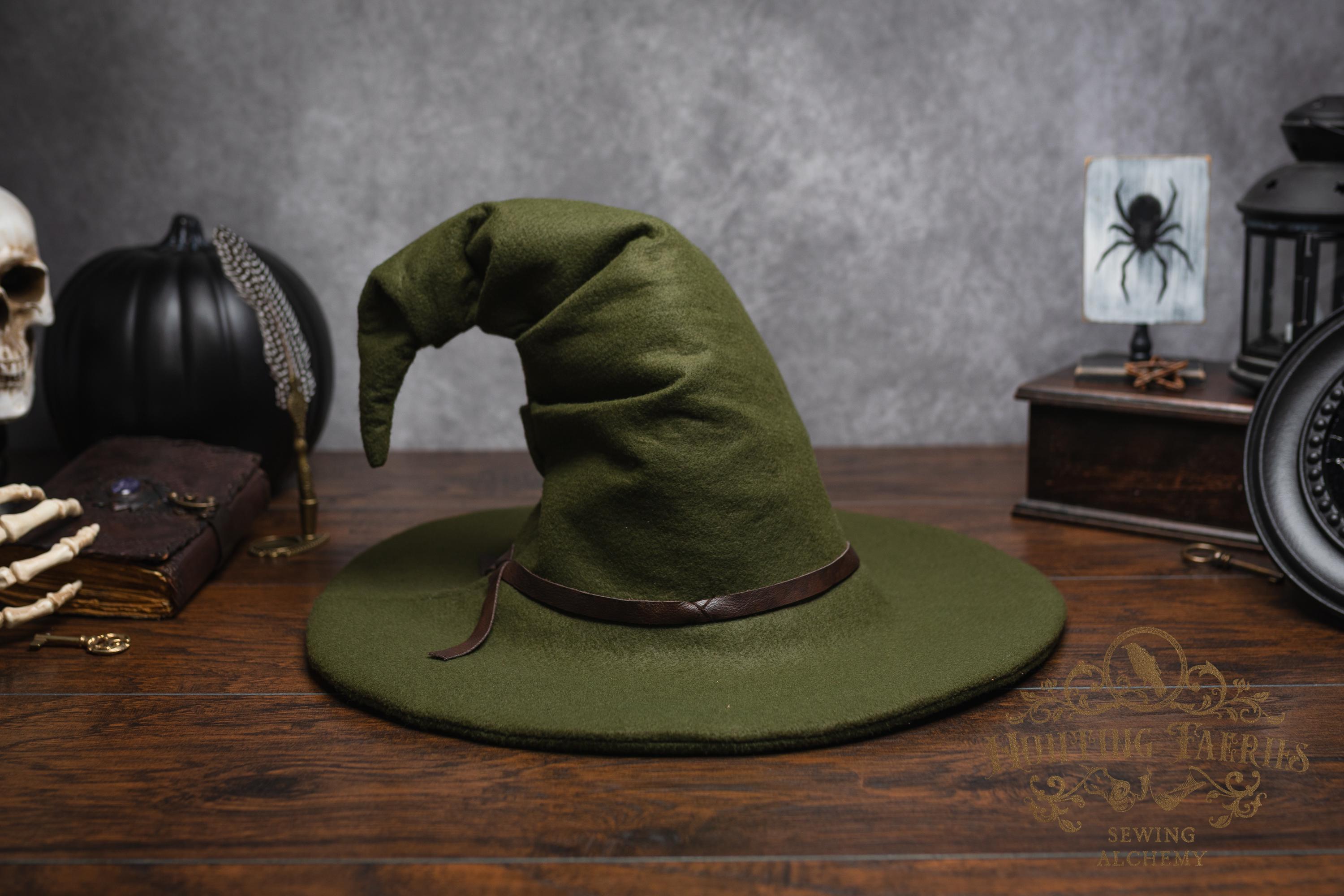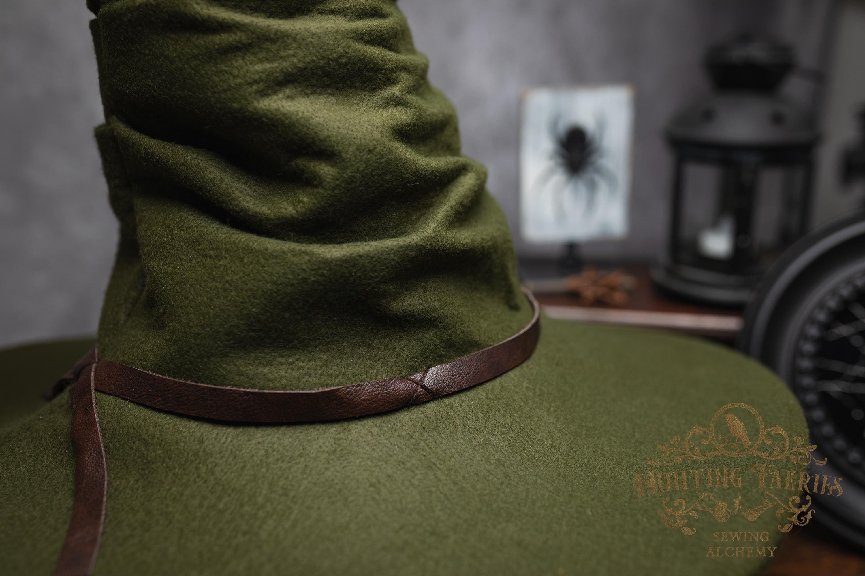 This witch hat is made of olive green felt (vegan-friendly). It offers a wizarding dark look with a ruched curled cone perfect for a dressed-up or down witch look. Its wide-sloped brim has layers of magic stitched together and wired for a rigid-looking brim and soft feel from the cone. It has a thin strip of leather around the cone that crosses in the back, offering a natural, strong, powerful woodland look. It would be great for a wizard or mage cosplay, Ren faire costume, or everyday wear! This hat screams for a powerful wearer; no frills here, it's all business. The possibilities are only limited by your imagination!