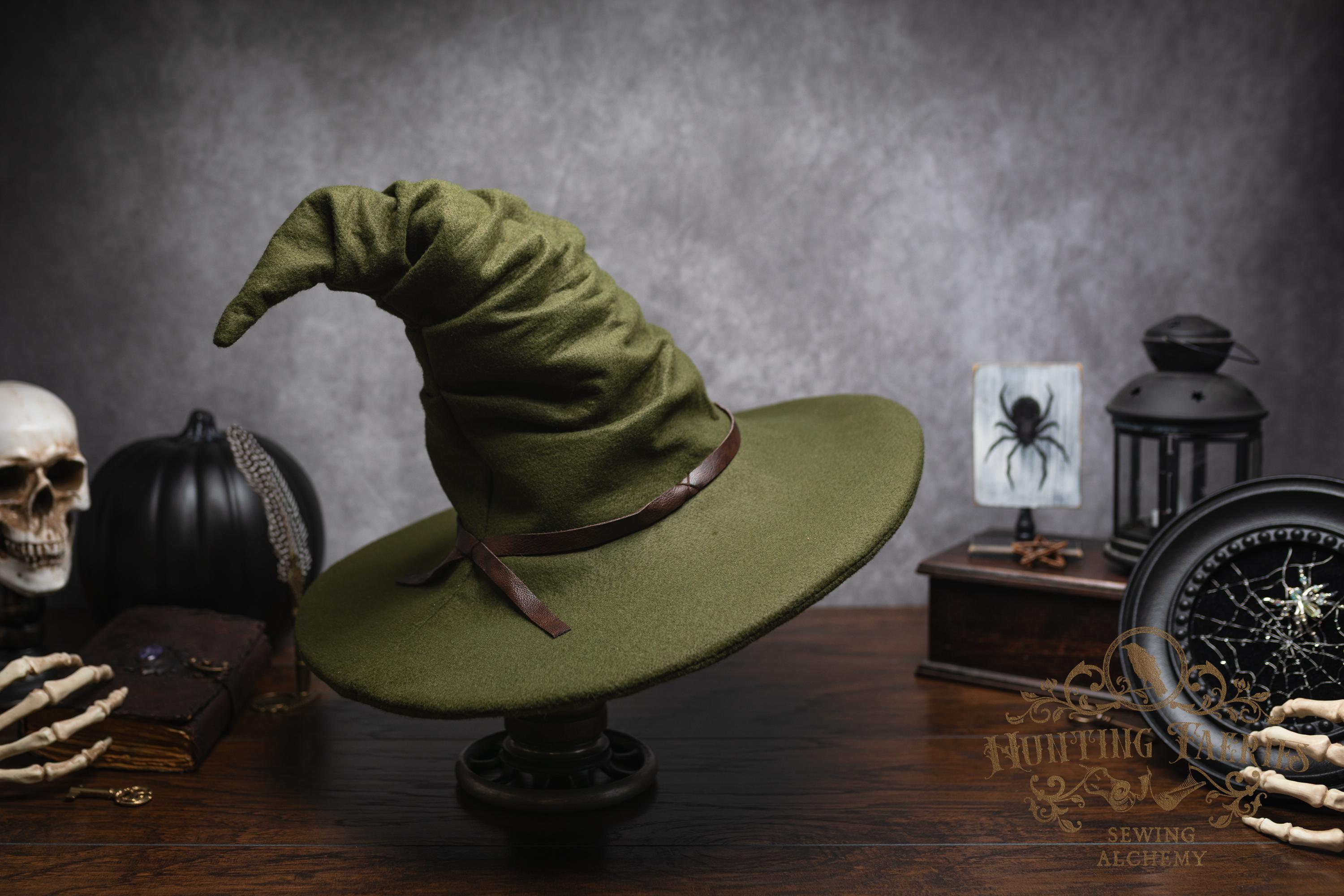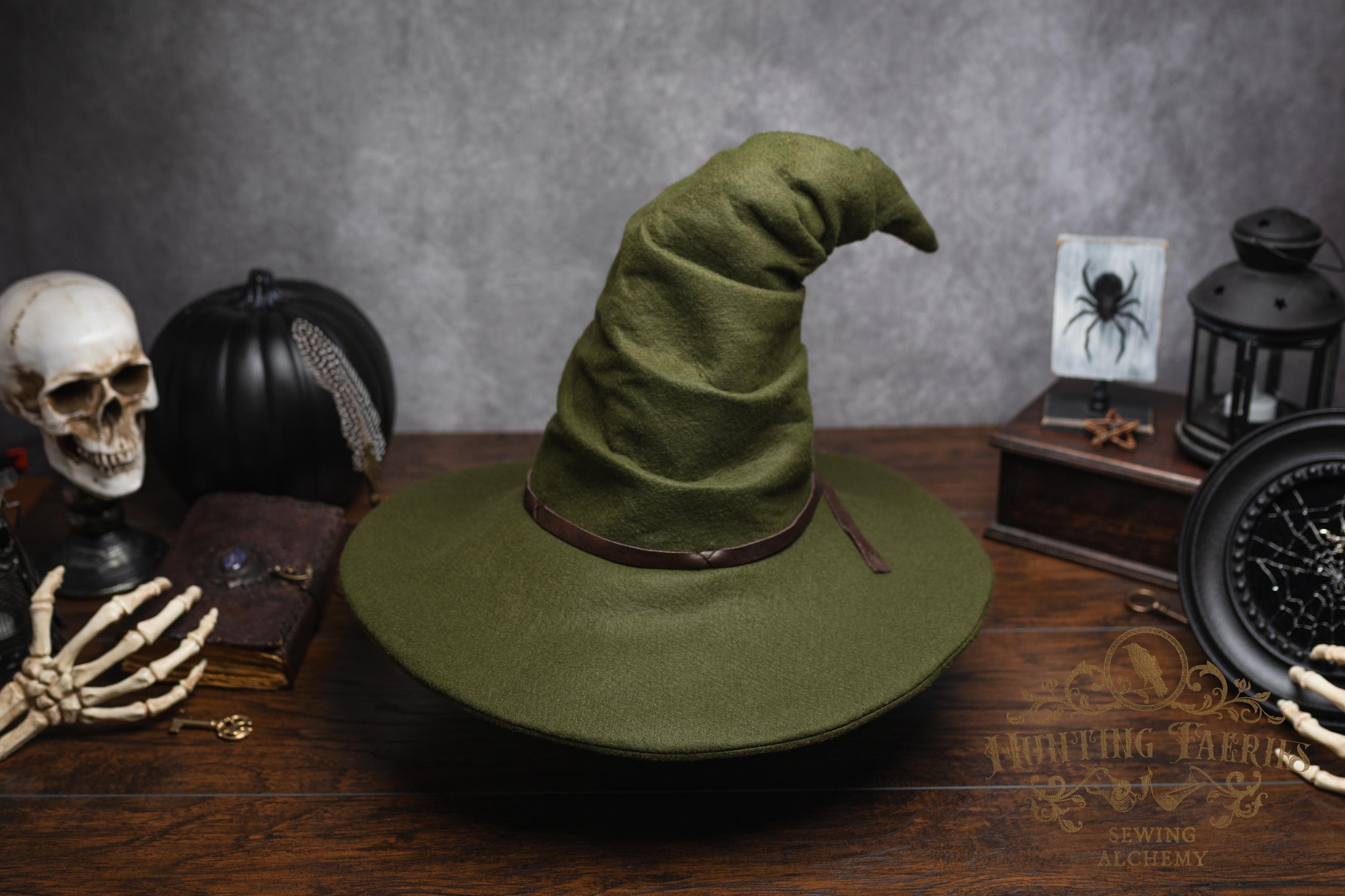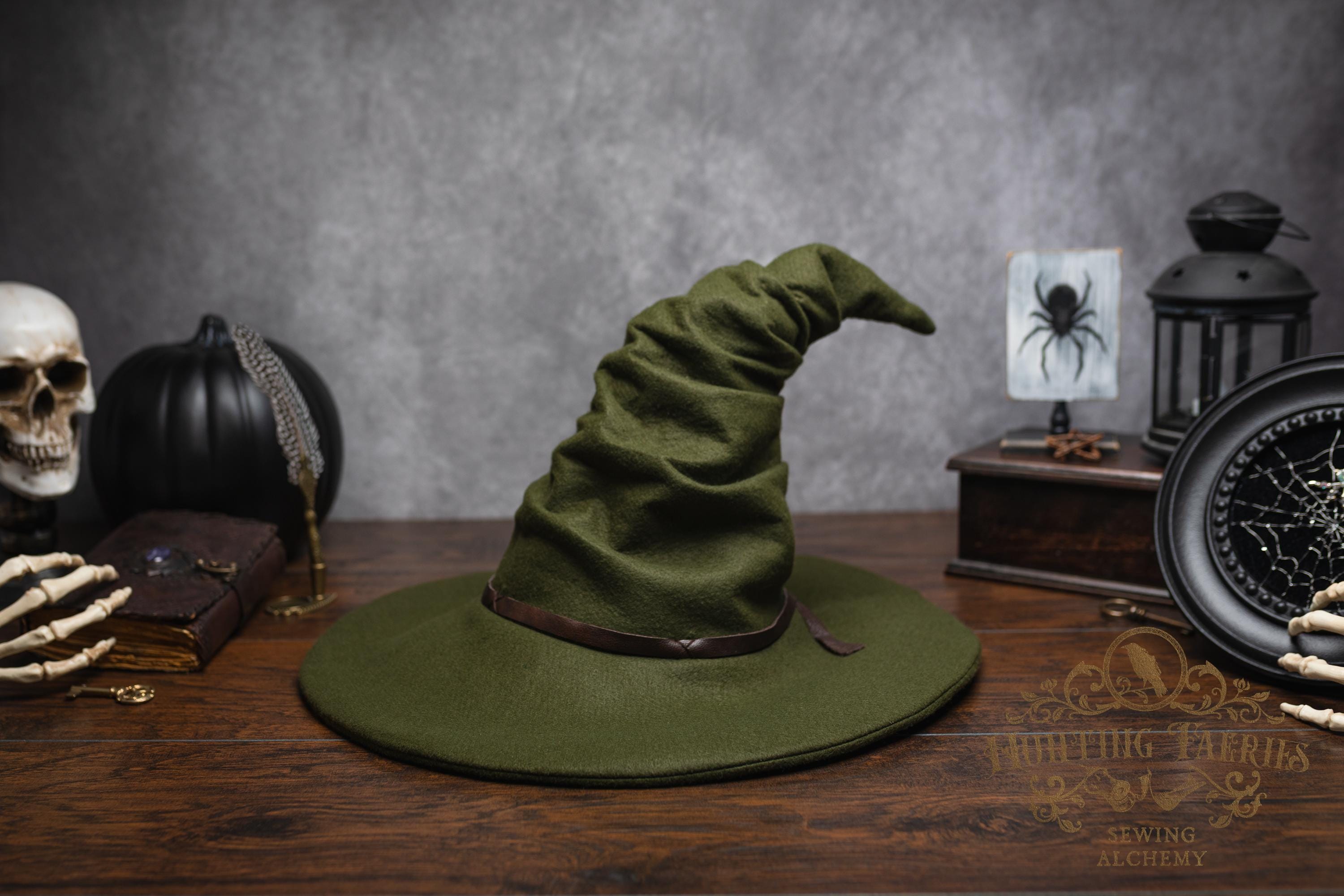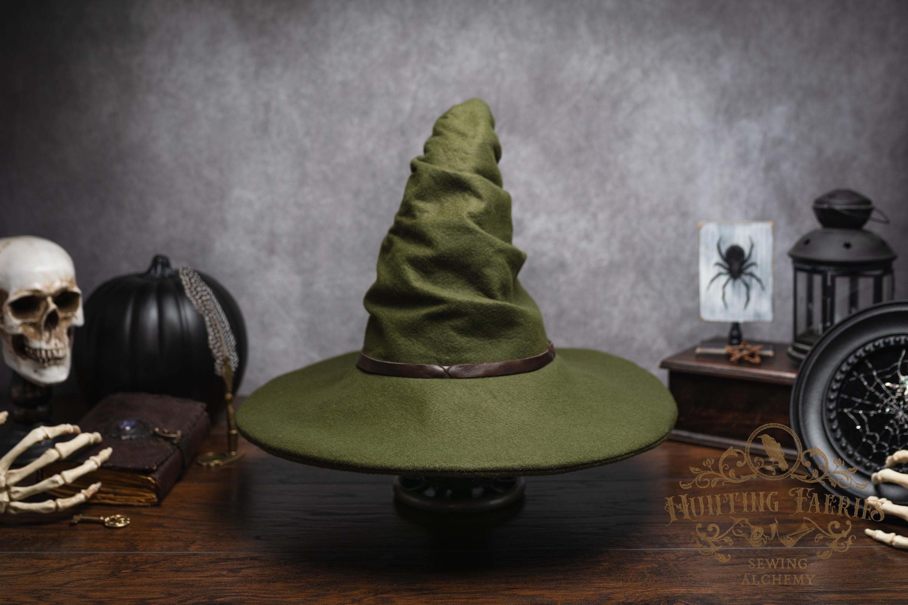 This witch hat is made of olive green felt (vegan-friendly). It offers a wizarding dark look with a ruched curled cone perfect for a dressed-up or down witch look. Its wide-sloped brim has layers of magic stitched together and wired for a rigid-looking brim and soft feel from the cone. It has a thin strip of leather around the cone that crosses in the back, offering a natural, strong, powerful woodland look. It would be great for a wizard or mage cosplay, Ren faire costume, or everyday wear! This hat screams for a powerful wearer; no frills here, it's all business. The possibilities are only limited by your imagination!