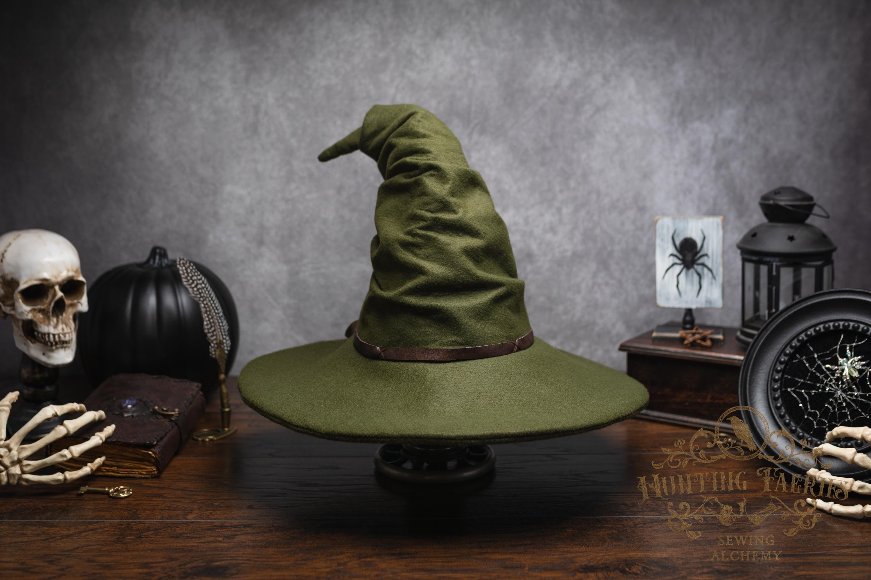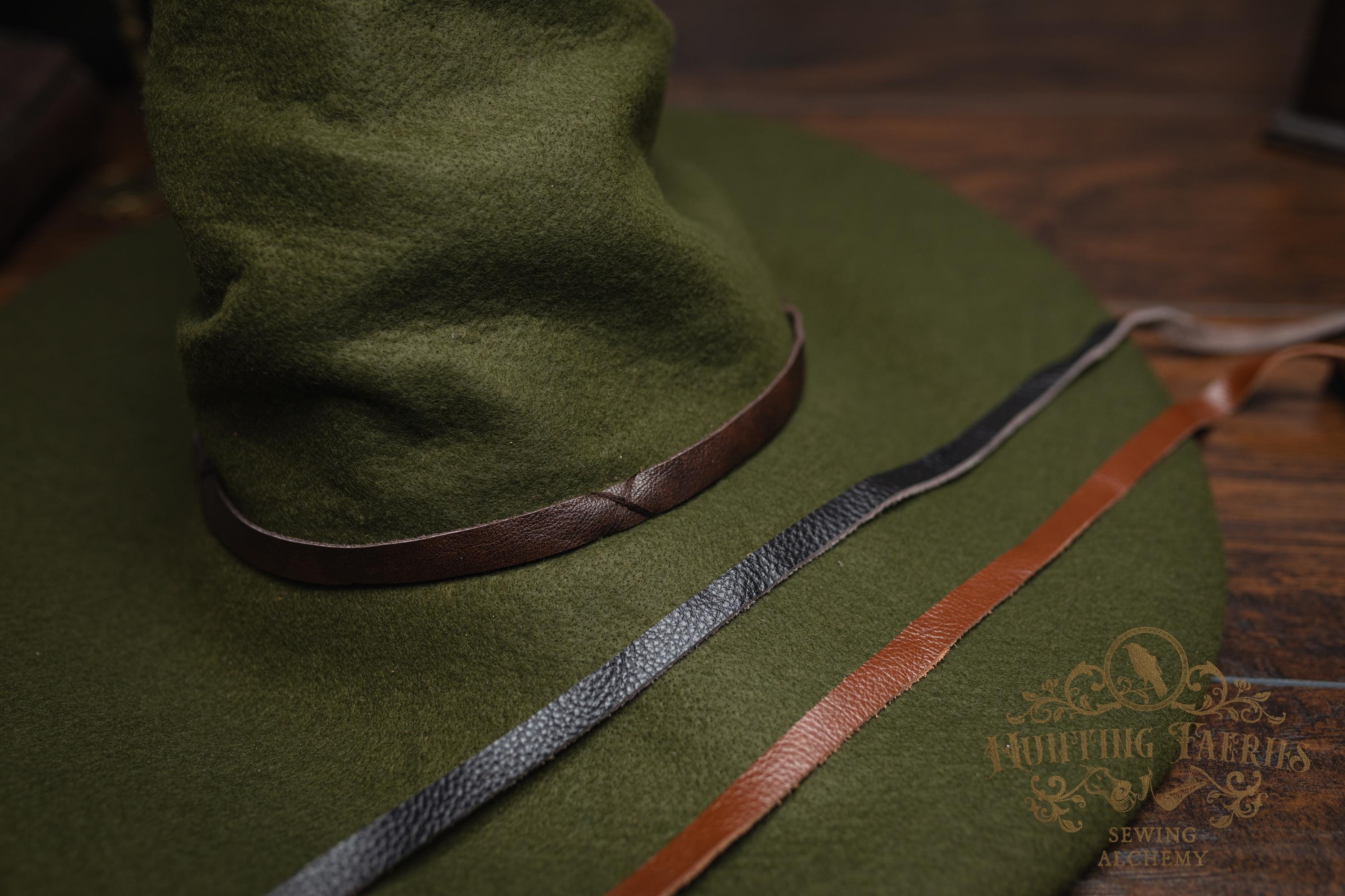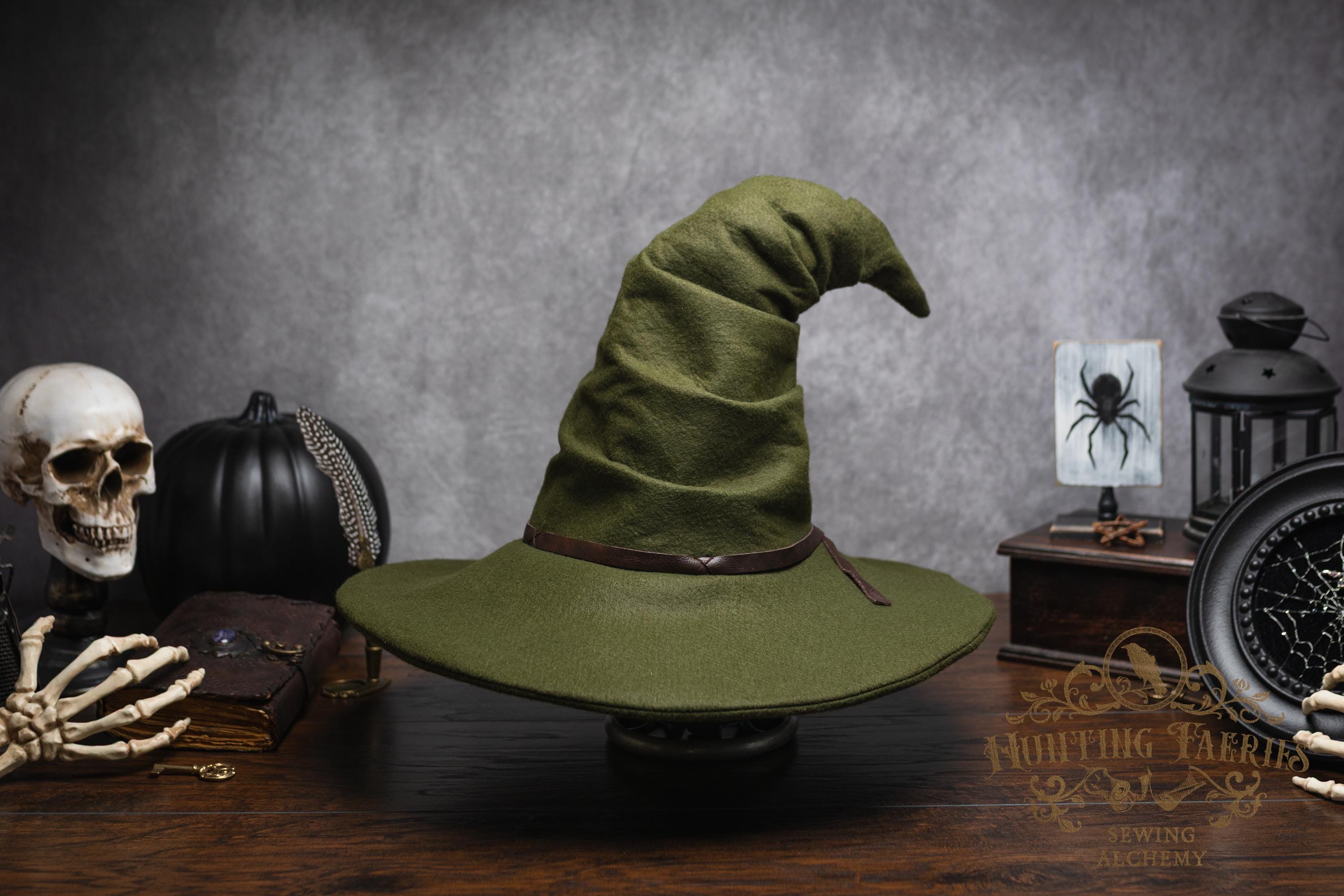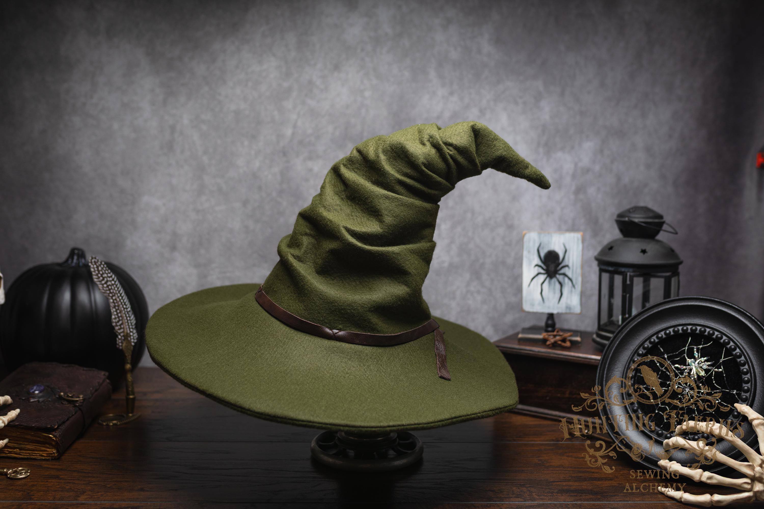 This witch hat is made of olive green felt (vegan-friendly). It offers a wizarding dark look with a ruched curled cone perfect for a dressed-up or down witch look. Its wide-sloped brim has layers of magic stitched together and wired for a rigid-looking brim and soft feel from the cone. It has a thin strip of leather around the cone that crosses in the back, offering a natural, strong, powerful woodland look. It would be great for a wizard or mage cosplay, Ren faire costume, or everyday wear! This hat screams for a powerful wearer; no frills here, it's all business. The possibilities are only limited by your imagination!