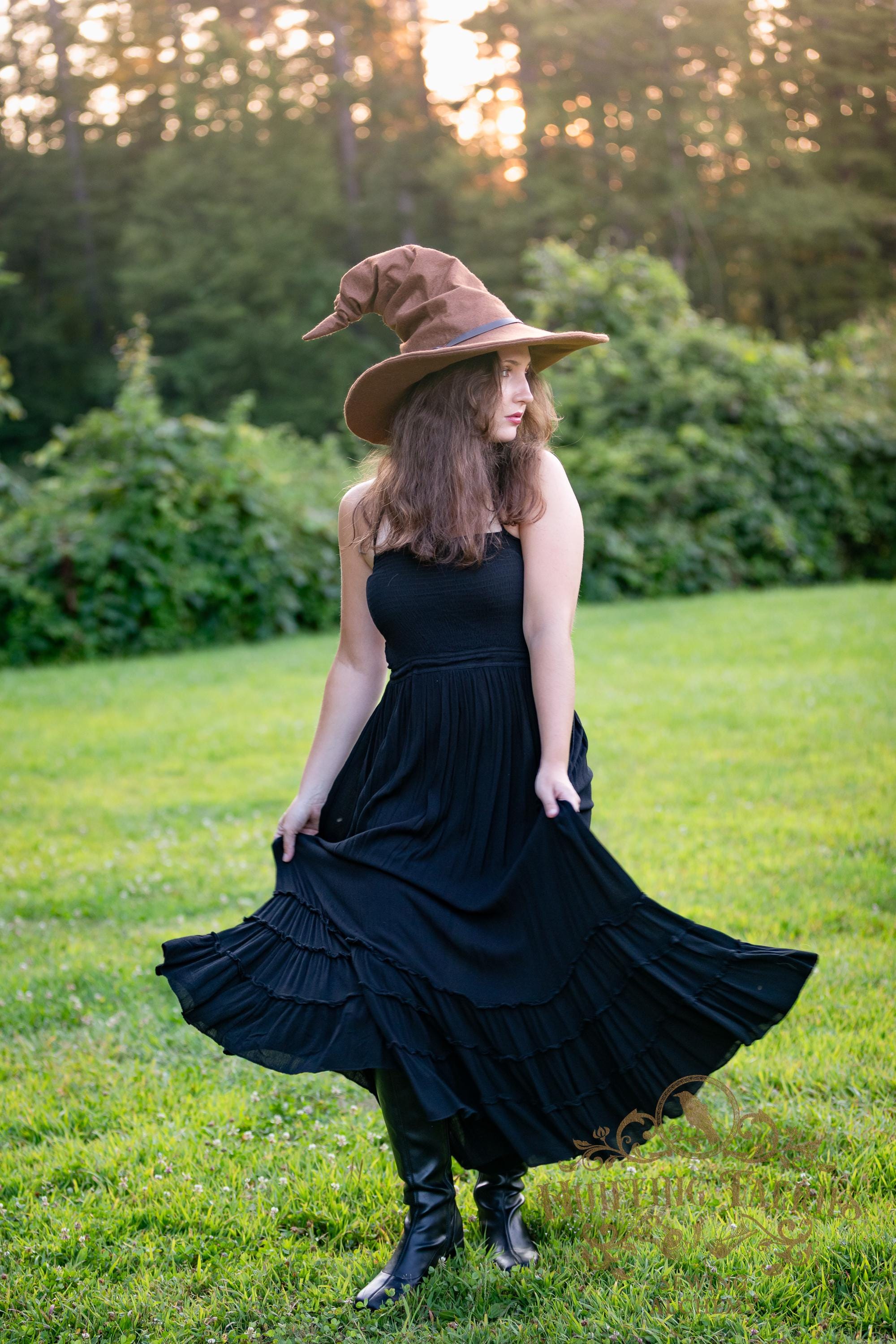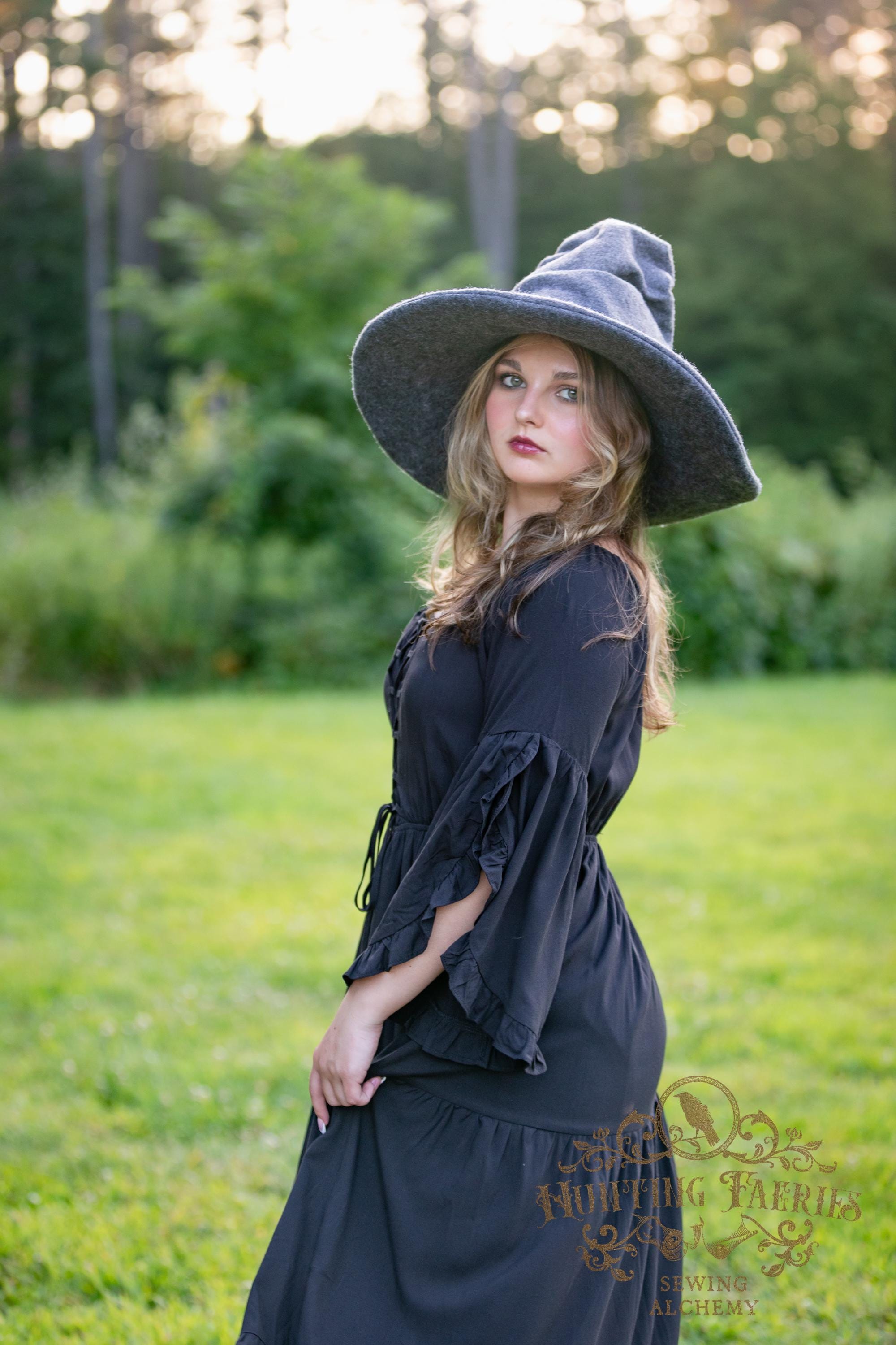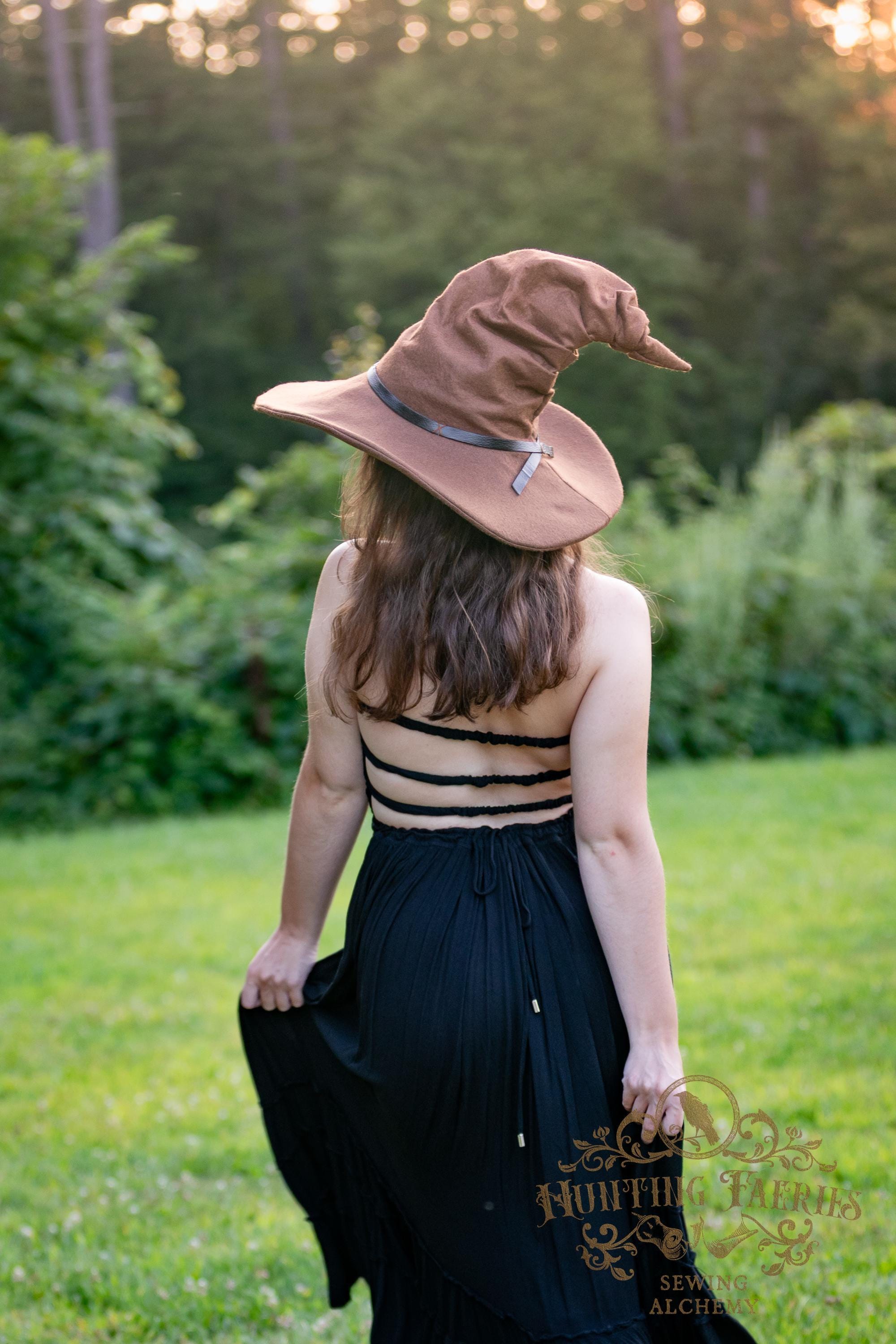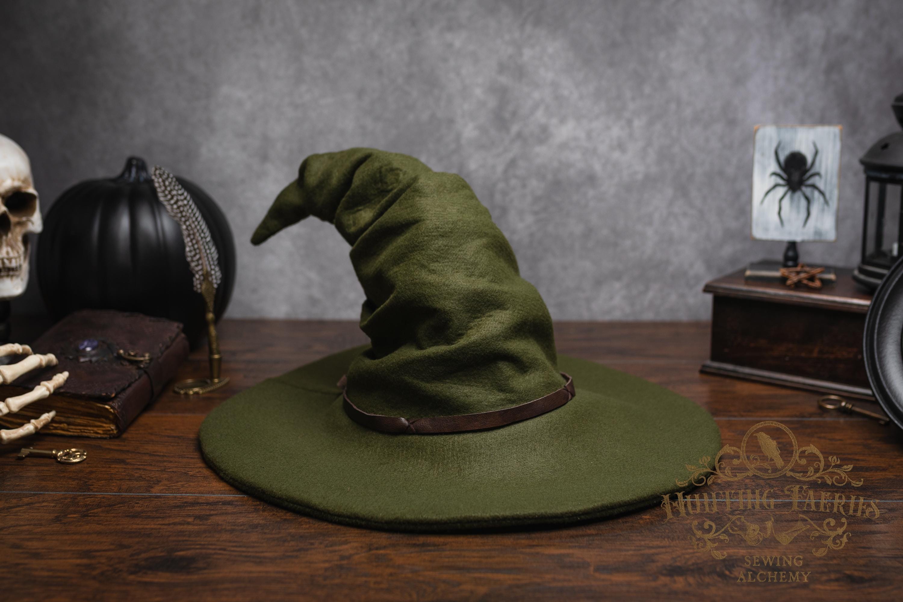 This witch hat is made of olive green felt (vegan-friendly). It offers a wizarding dark look with a ruched curled cone perfect for a dressed-up or down witch look. Its wide-sloped brim has layers of magic stitched together and wired for a rigid-looking brim and soft feel from the cone. It has a thin strip of leather around the cone that crosses in the back, offering a natural, strong, powerful woodland look. It would be great for a wizard or mage cosplay, Ren faire costume, or everyday wear! This hat screams for a powerful wearer; no frills here, it's all business. The possibilities are only limited by your imagination!