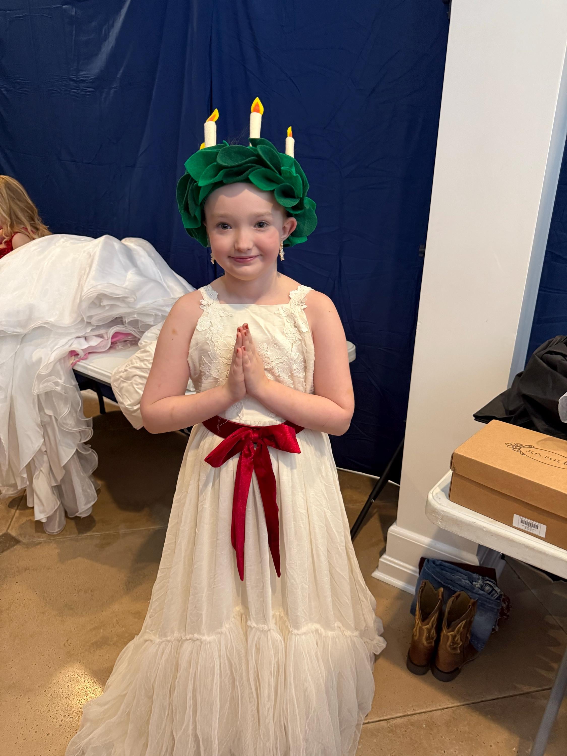 This crown is the perfect headpiece for the little St. Lucia helper who needs both hands free to bring food and other items to those in need. (As the story goes St. Lucia wore the candles to light the way under the catacombs of Rome as she delivered necessities to persecuted Christians in hiding there.) Let St. Lucia's holiday spirit of giving take over and help to spread the joy and light of the season.